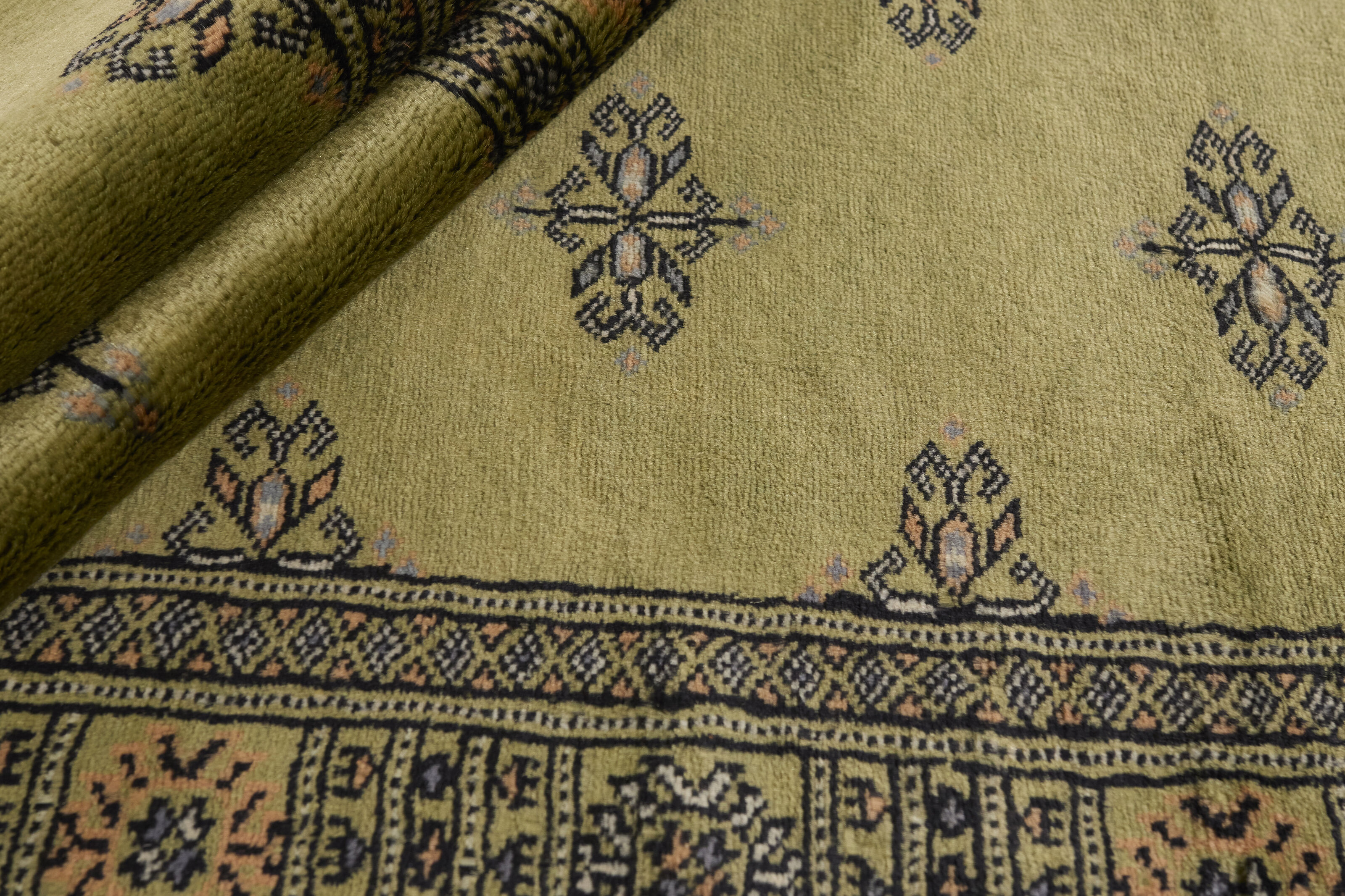The 2-Ply rugs are produced in Lahore, Pakistan’s second largest city, which is also is the centre of the country’s hand knotted rug production. The rugs most often have the Tekke and Bokara patterns, which were originally inspired by patterns from Turkmenistan. The people of the Tekke Tribe, which was the largest nomadic tribe in Turkmenistan, were known as very industrious rug producers. The term Ply indicates the number of threads wound together to produce the yarn itself; 2-Ply thus guarantees that two threads were wound together during the knotting to make the yarn. The quality of wool is particularly soft and shining, and the warm-coloured patterns are simple and harmonious.