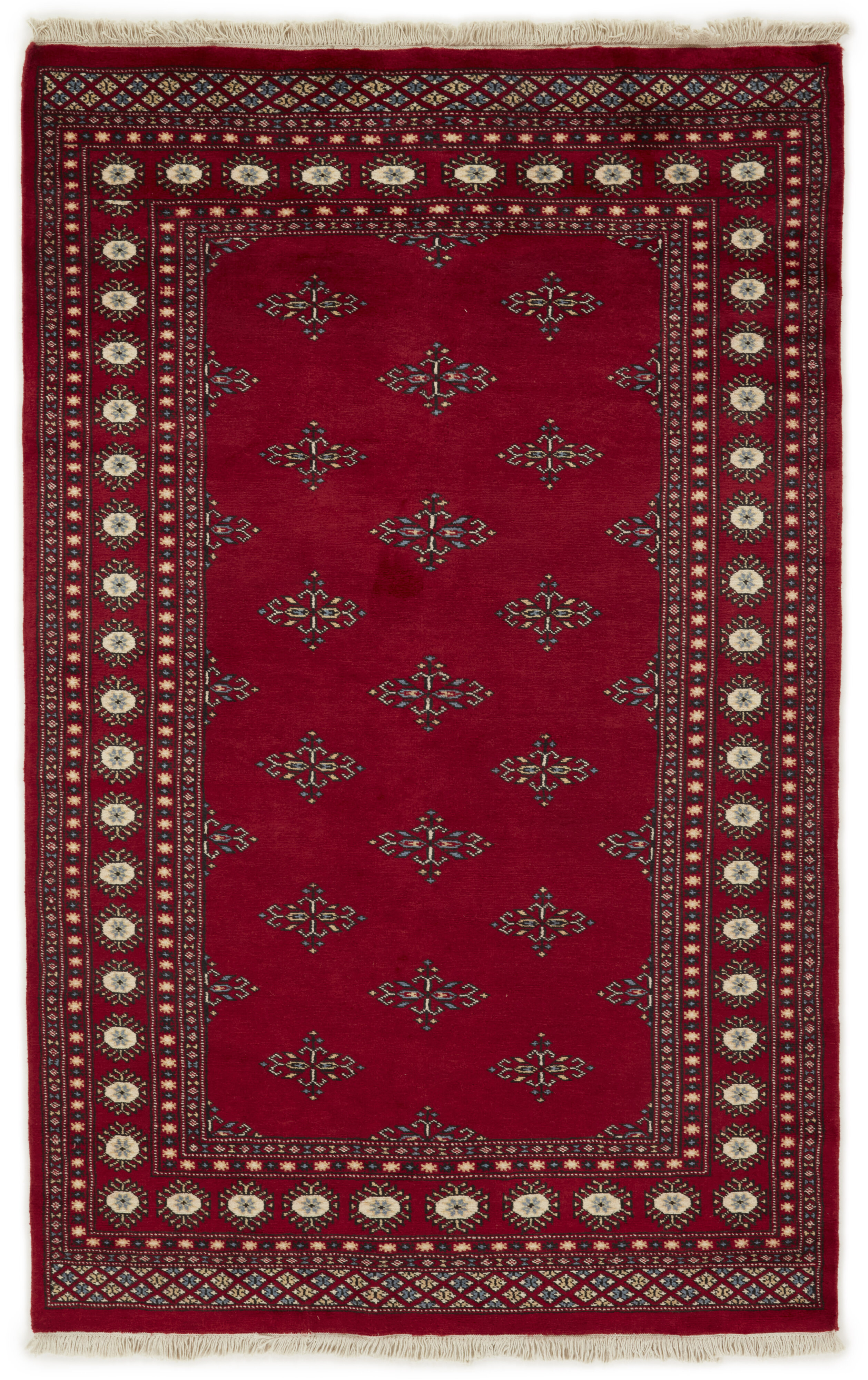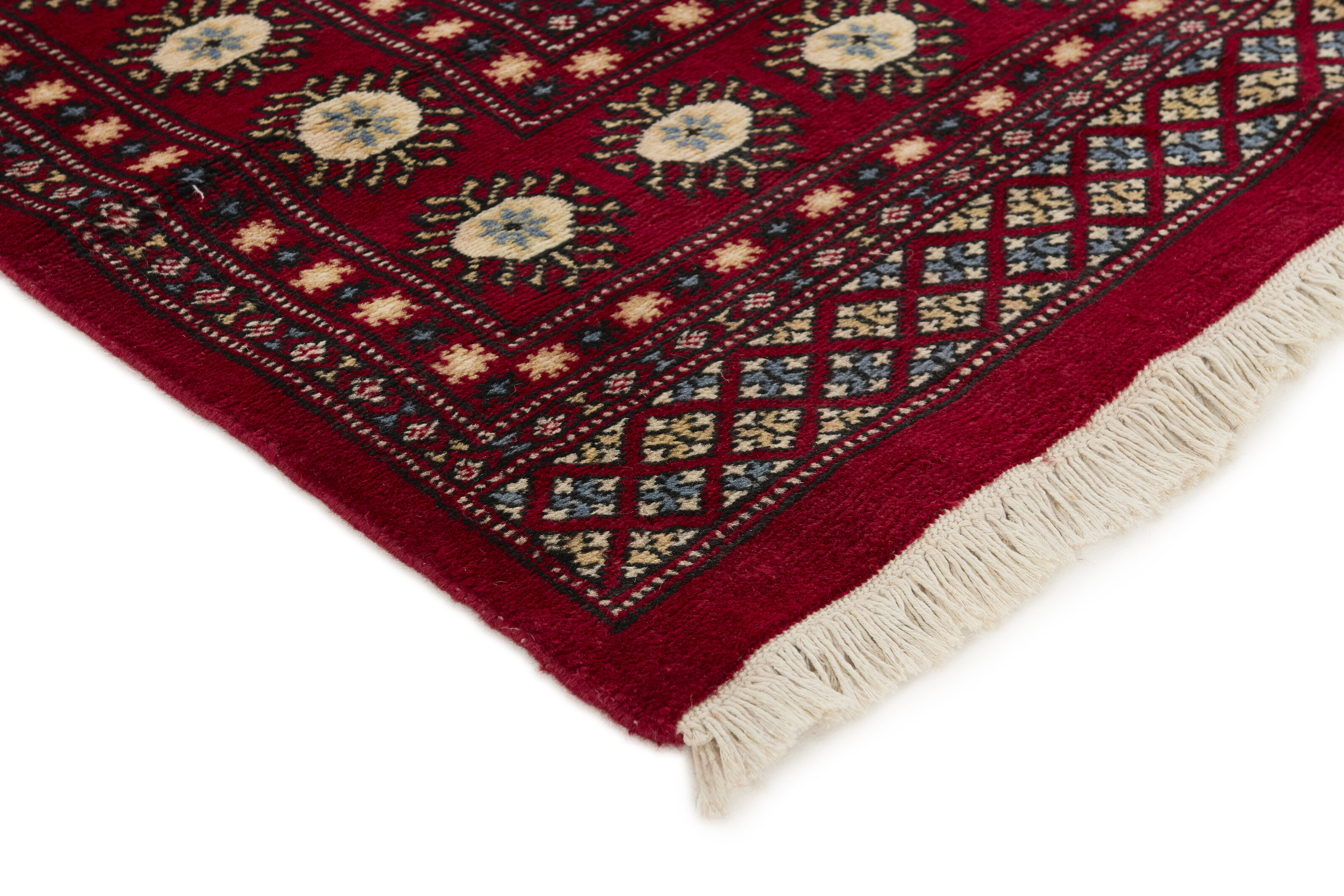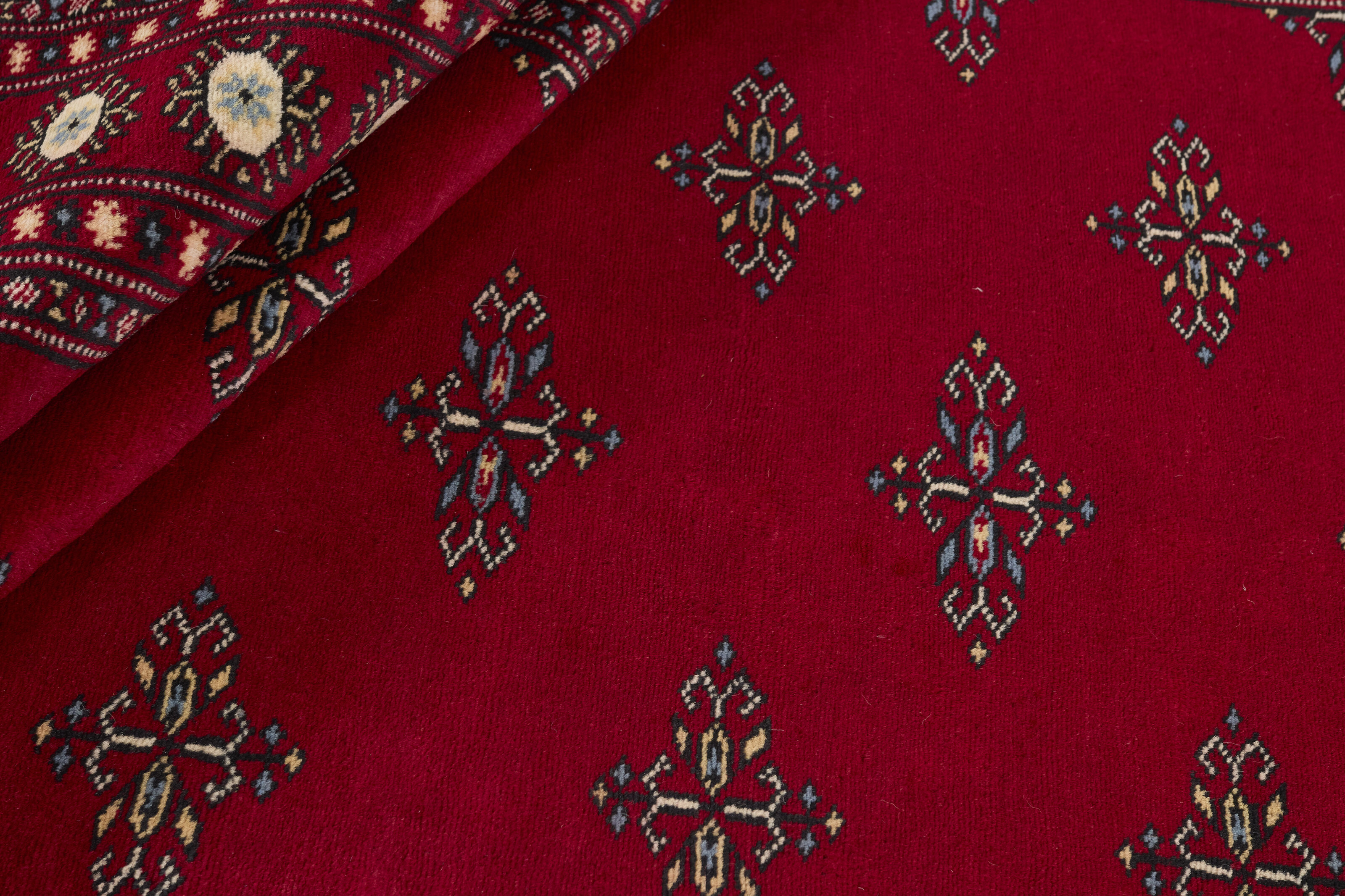 The 2-Ply rugs are produced in Lahore, Pakistan’s second largest city, which is also is the centre of the country’s hand knotted rug production. The rugs most often have the Tekke and Bokara patterns, which were originally inspired by patterns from Turkmenistan. The people of the Tekke Tribe, which was the largest nomadic tribe in Turkmenistan, were known as very industrious rug producers. The term Ply indicates the number of threads wound together to produce the yarn itself; 2-Ply thus guarantees that two threads were wound together during the knotting to make the yarn. The quality of wool is particularly soft and shining, and the warm-coloured patterns are simple and harmonious.
