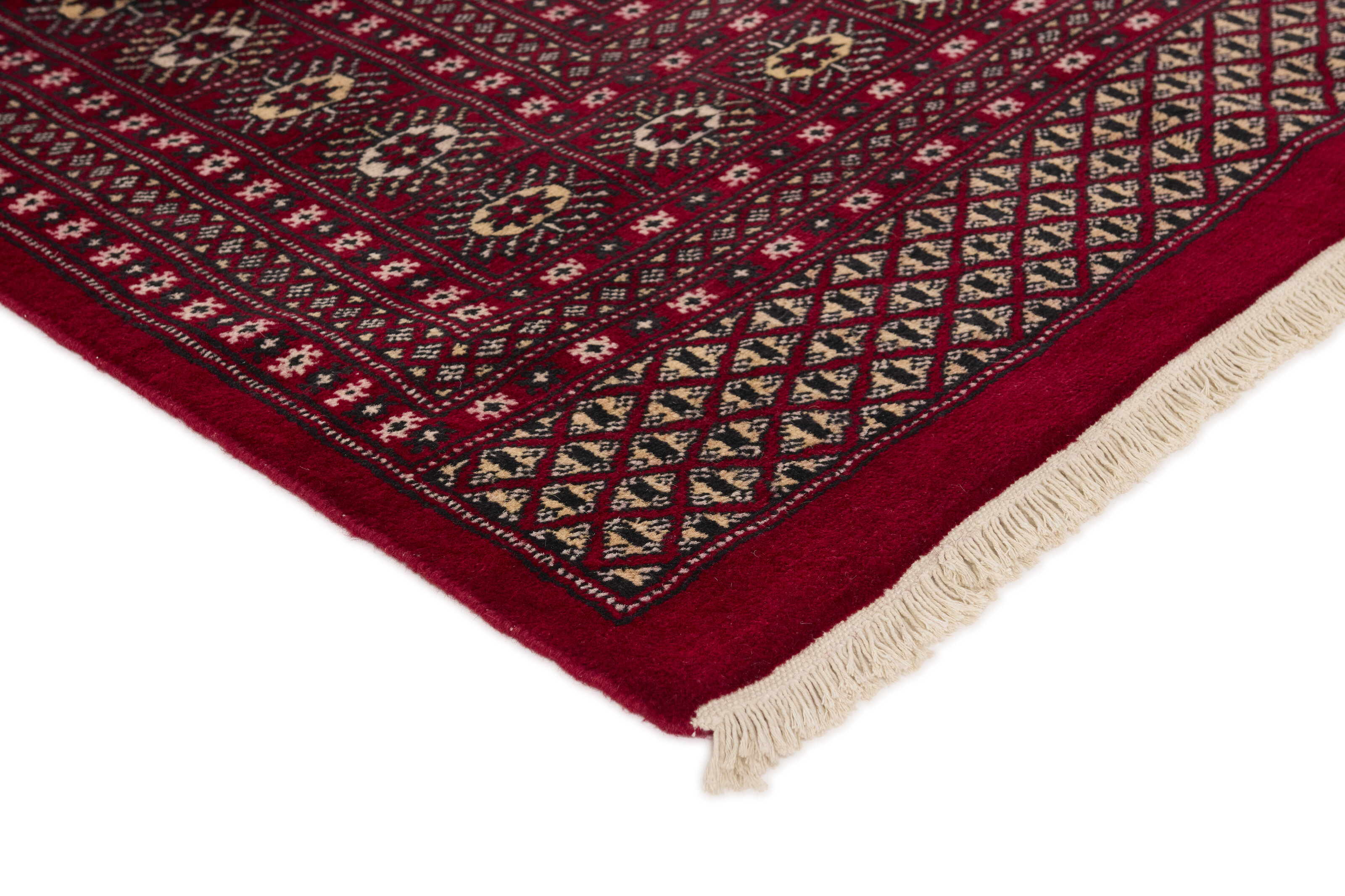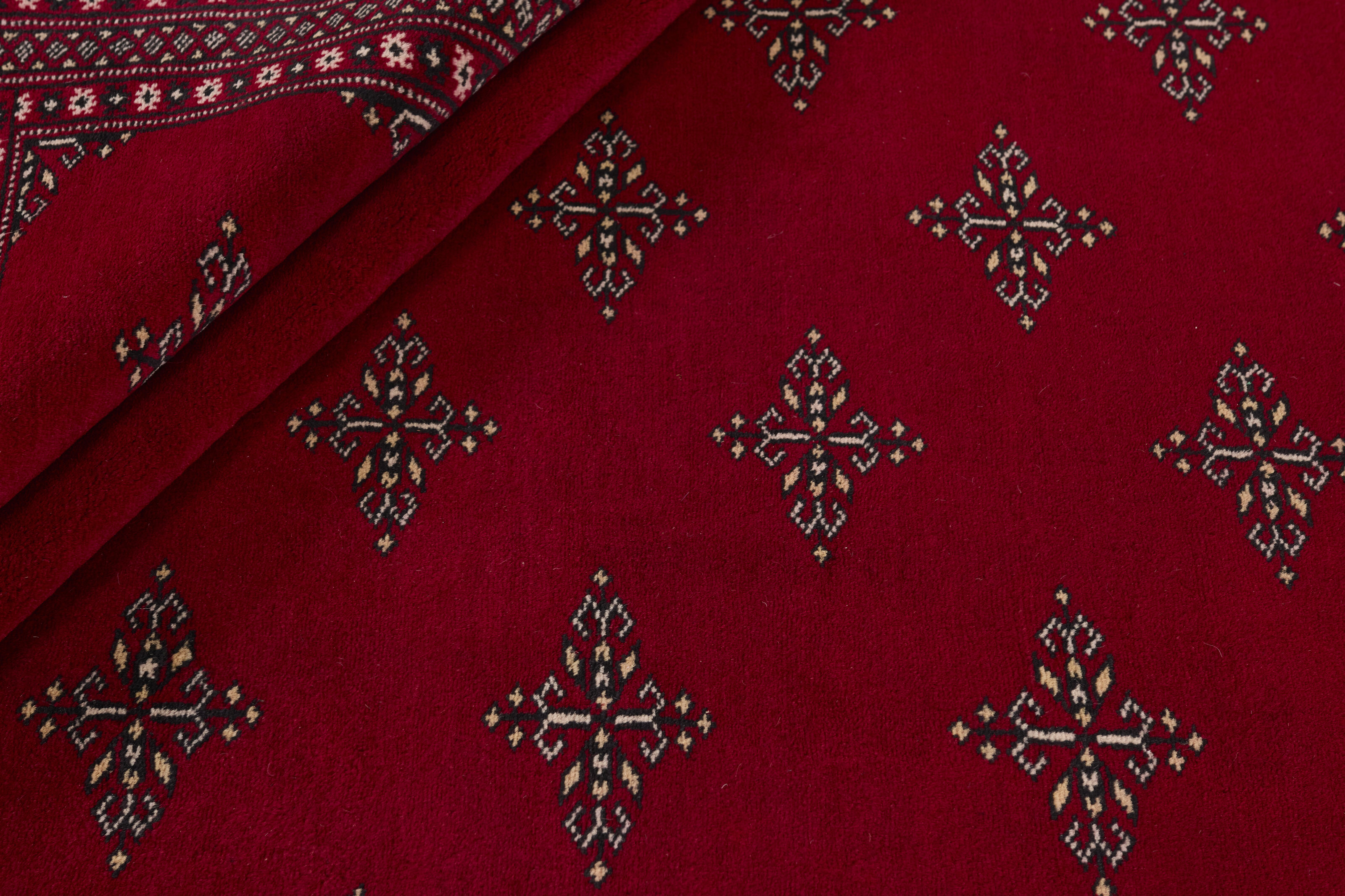 The 2-Ply rugs are produced in Lahore, Pakistan’s second largest city, which is also is the centre of the country’s hand knotted rug production. The rugs most often have the Tekke and Bokara patterns, which were originally inspired by patterns from Turkmenistan. The people of the Tekke Tribe, which was the largest nomadic tribe in Turkmenistan, were known as very industrious rug producers. The term Ply indicates the number of threads wound together to produce the yarn itself; 2-Ply thus guarantees that two threads were wound together during the knotting to make the yarn. The quality of wool is particularly soft and shining, and the warm-coloured patterns are simple and harmonious.