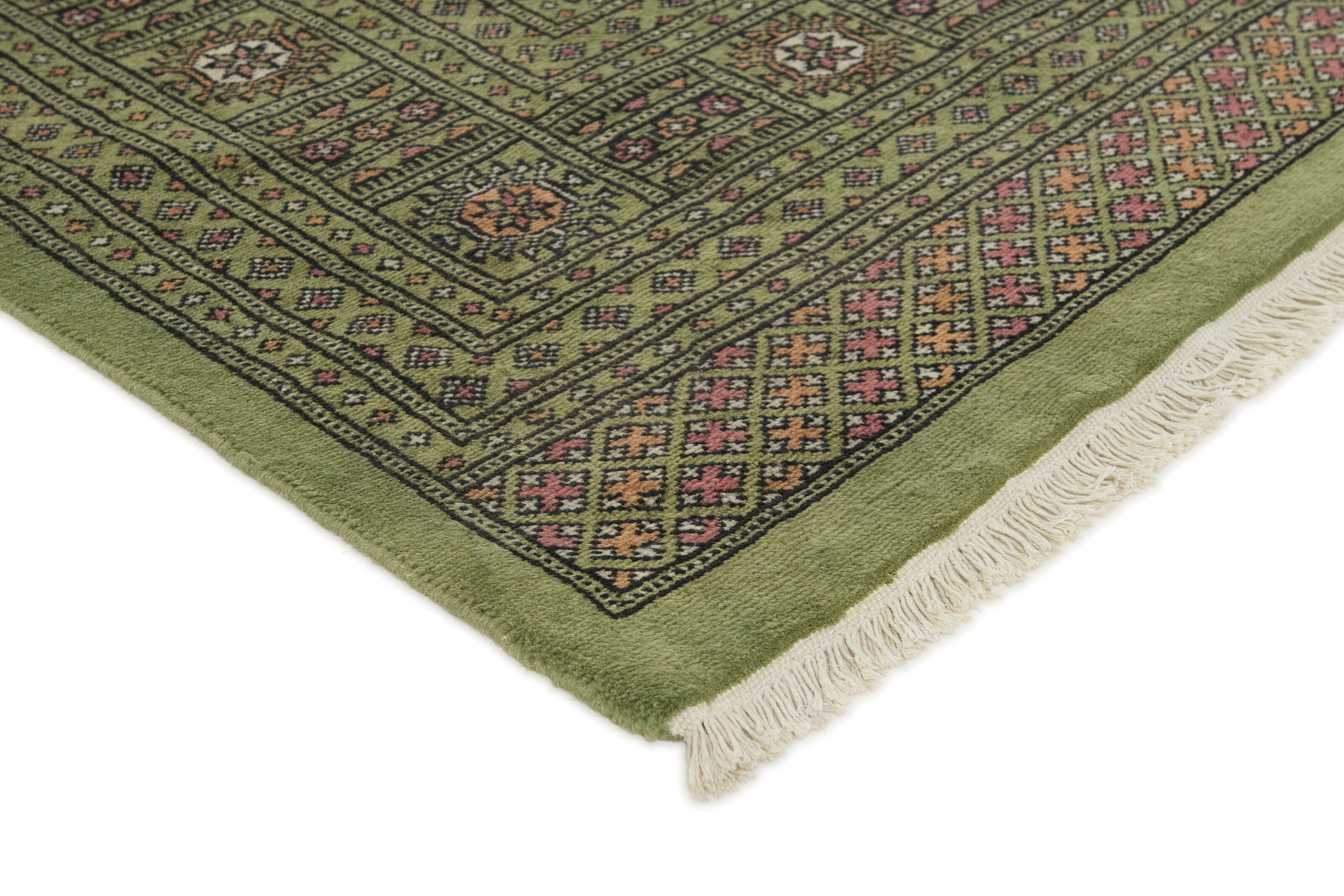 The 2-Ply rugs are produced in Lahore, Pakistan’s second largest city, which is also is the centre of the country’s hand knotted rug production. The rugs most often have the Tekke and Bokara patterns, which were originally inspired by patterns from Turkmenistan. The people of the Tekke Tribe, which was the largest nomadic tribe in Turkmenistan, were known as very industrious rug producers. The term Ply indicates the number of threads wound together to produce the yarn itself; 2-Ply thus guarantees that two threads were wound together during the knotting to make the yarn. The quality of wool is particularly soft and shining, and the warm-coloured patterns are simple and harmonious.
