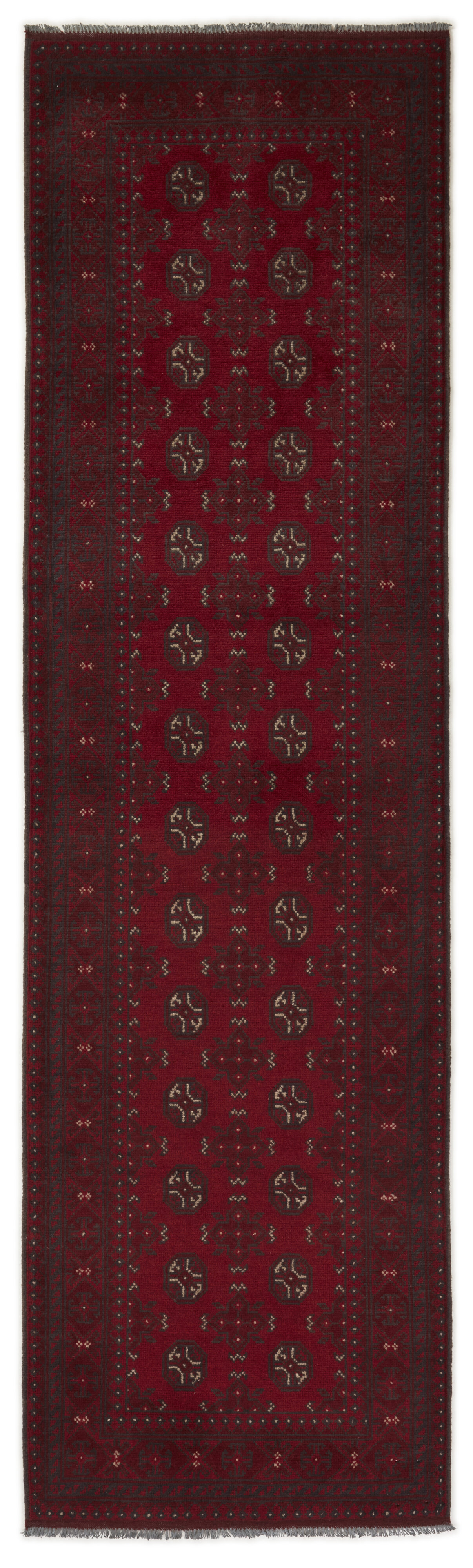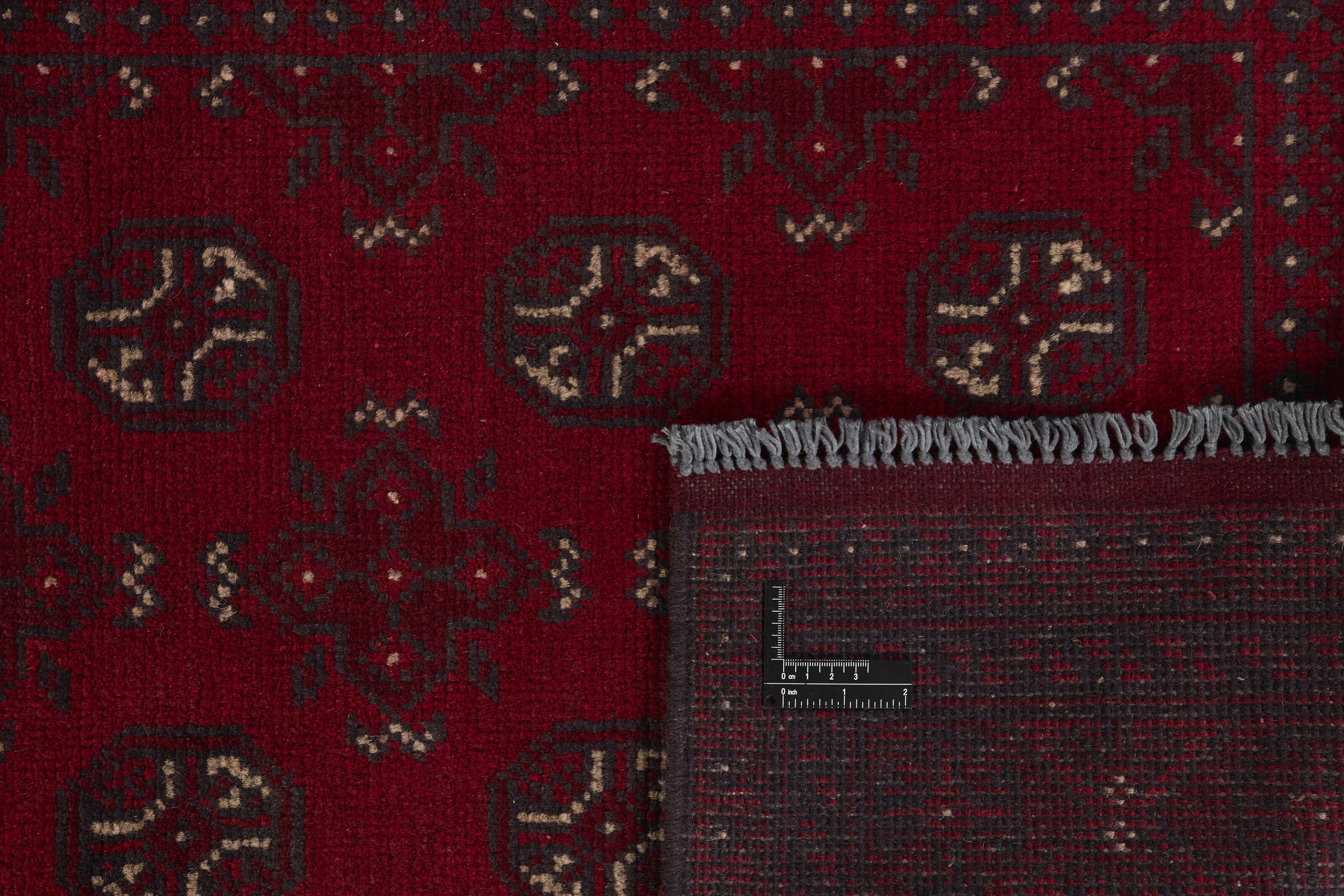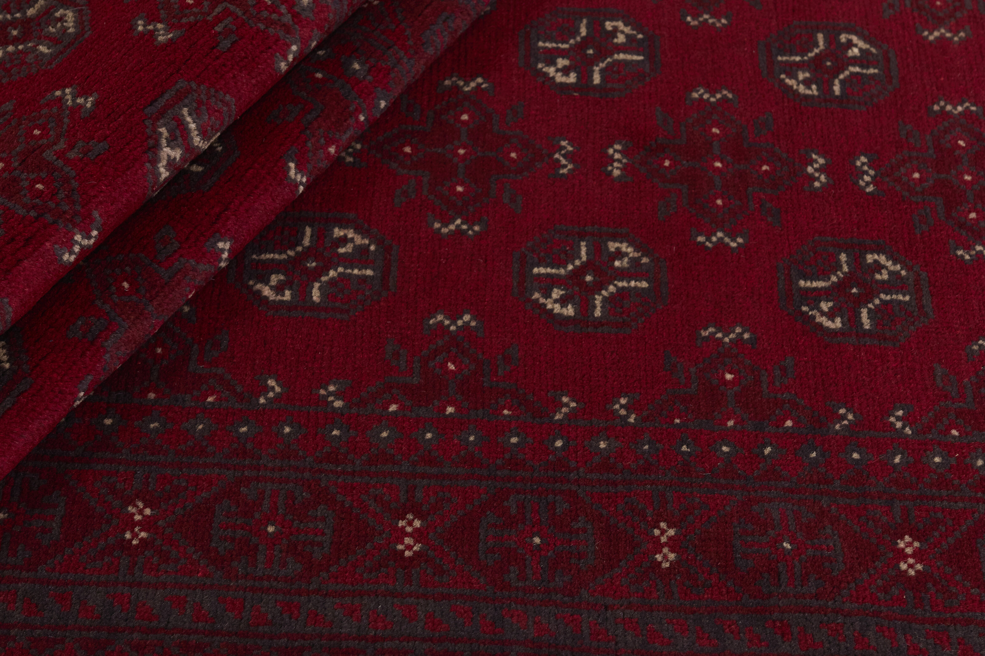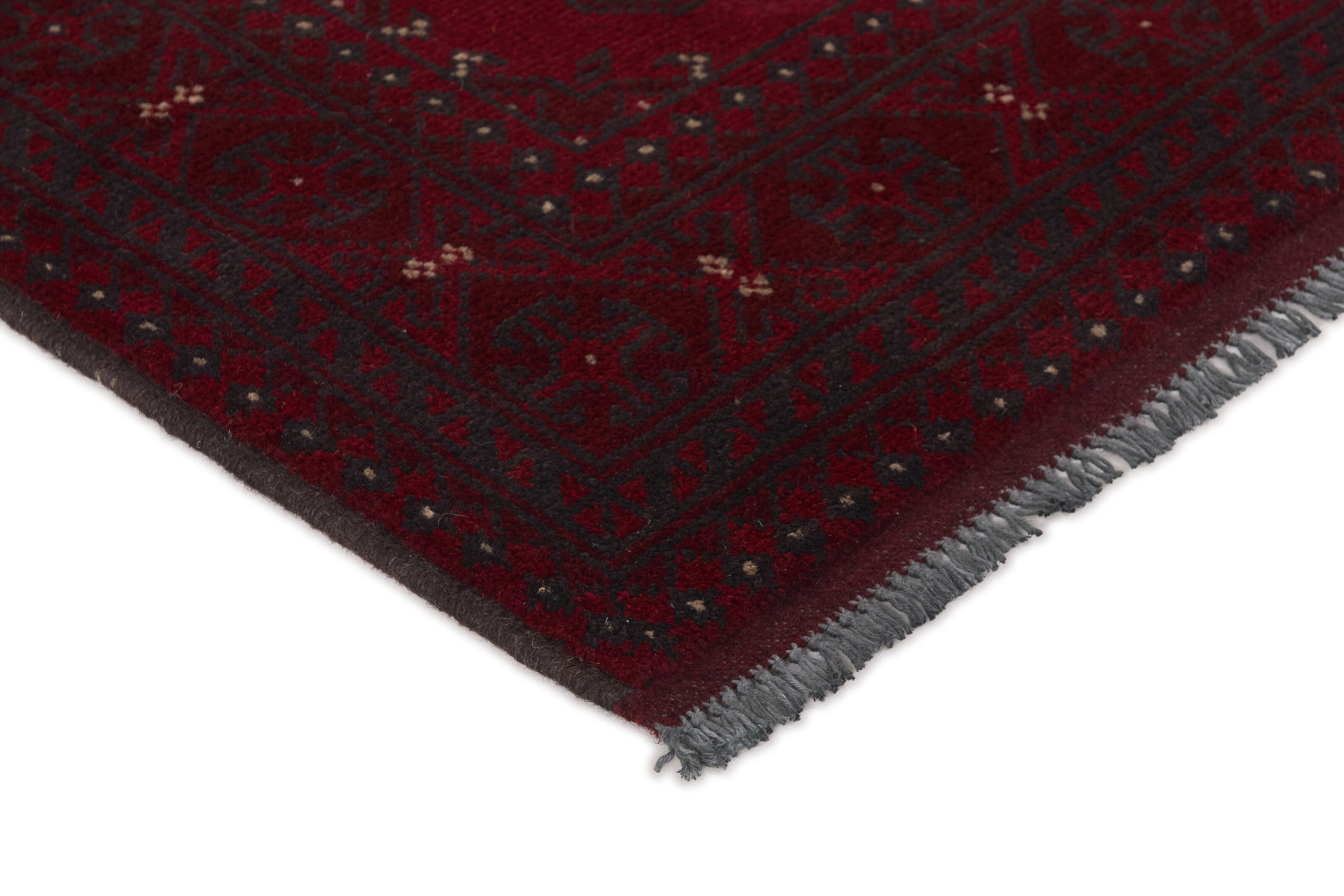 Aktscha rugs are knotted by Turkmens in the Aktscha (Acqcha) district, which is situated in the central part of the Jowzjan Province of northern Afghanistan. The Aktscha rugs are very similar to the Old Afghan (Khal Mohammadi) rugs, but are of a lower quality, as the knot density is lower. The rugs have the same characteristics, with the deep, warm, and fiery red base colour, the relatively high and sturdy pile, the wool base weave, and the use of goat’s and horse’s hair. The Gül (Elephant’s Foot) pattern is the primary pattern of the Aktscha rugs.