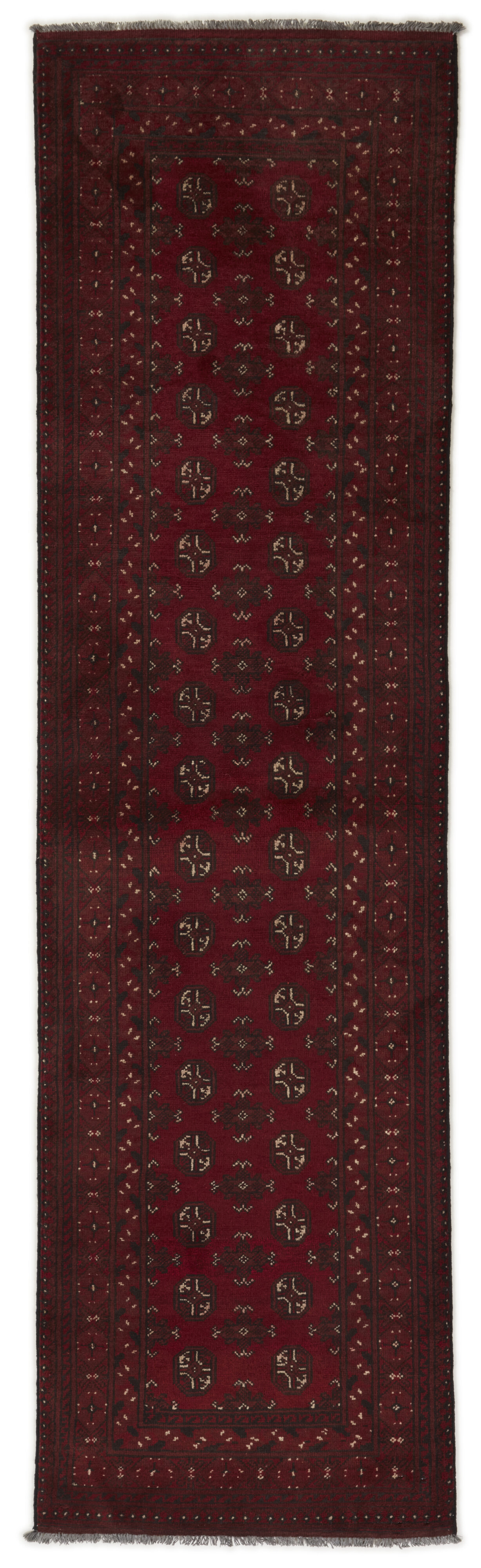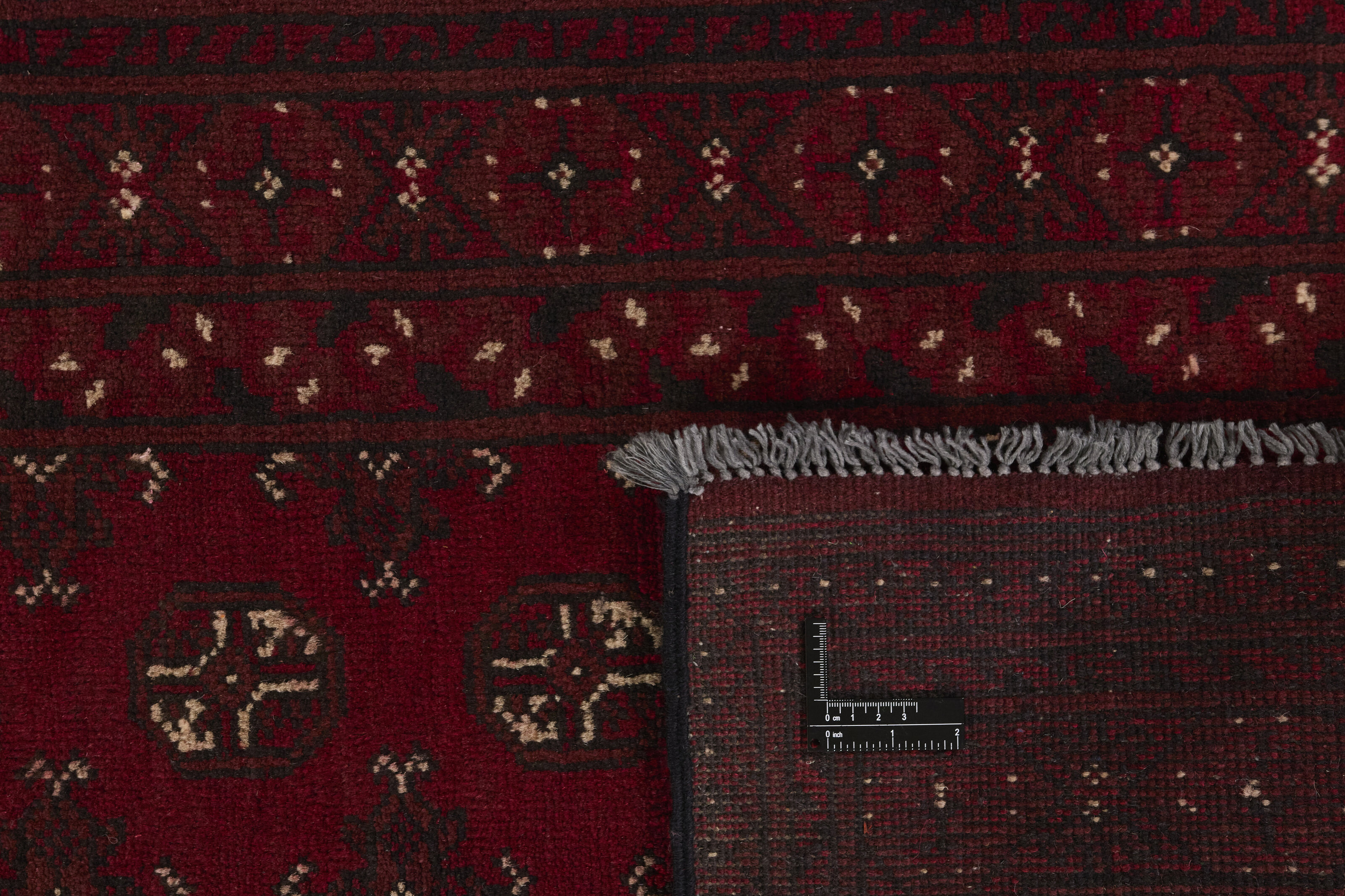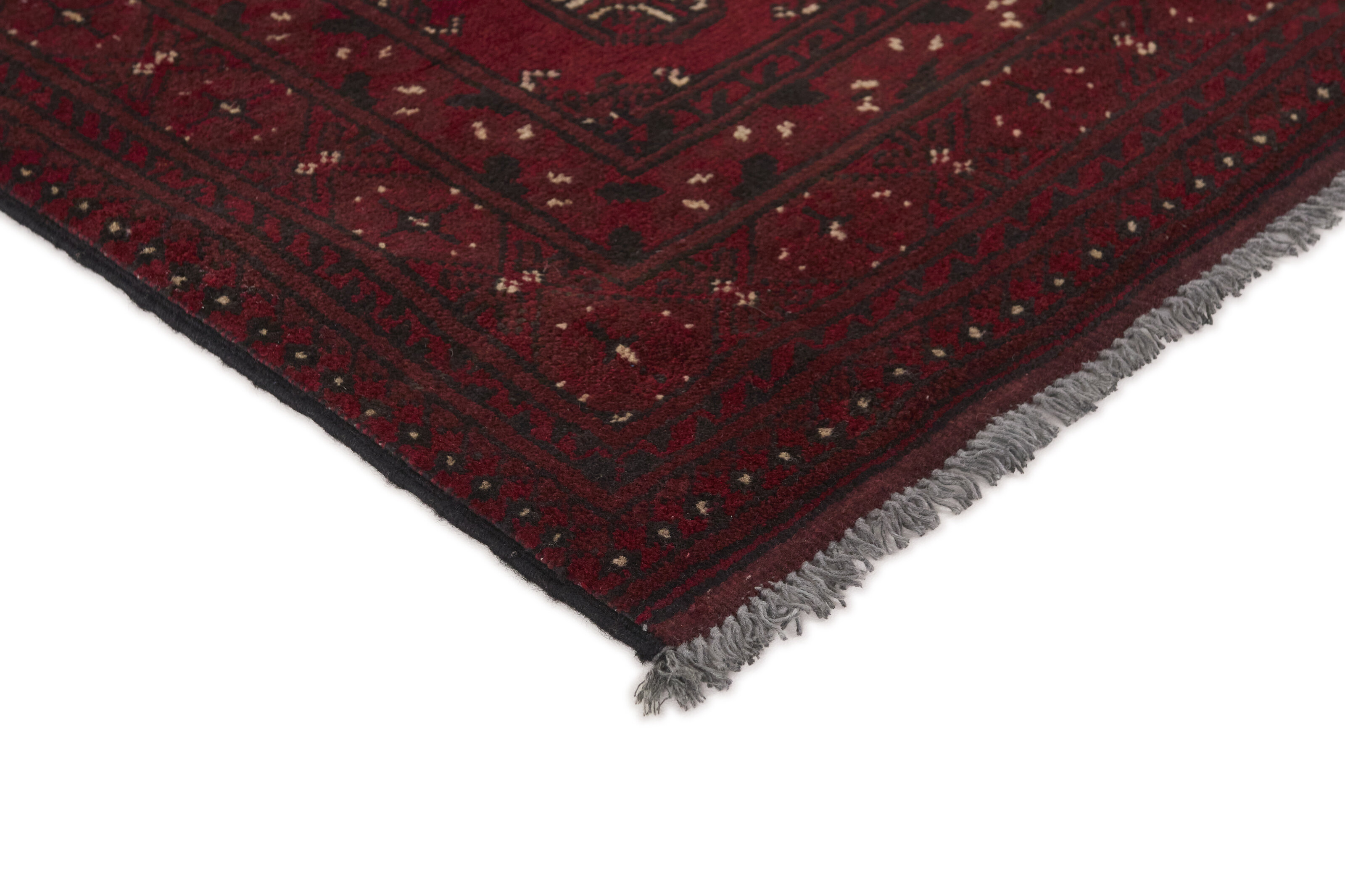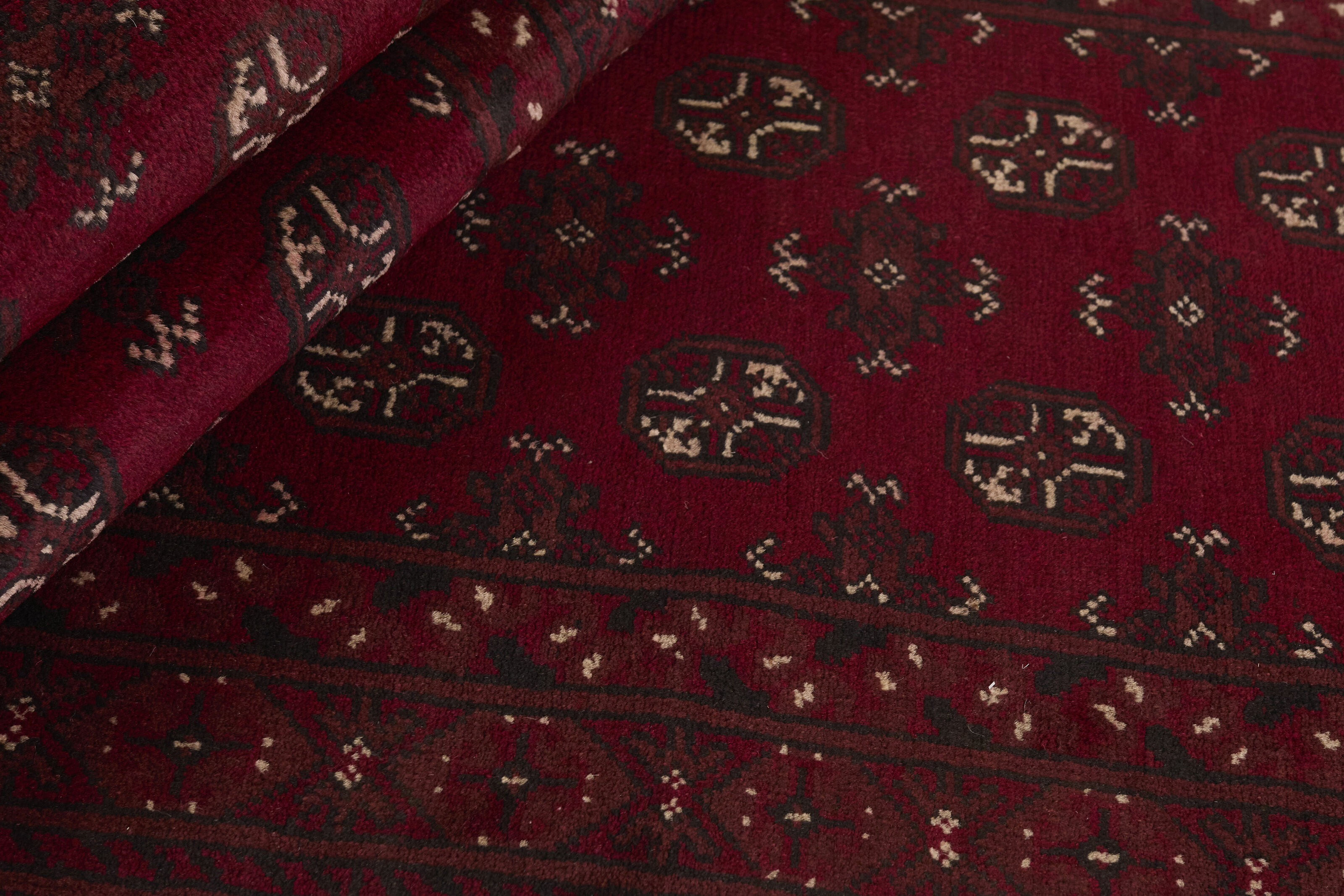 Aktscha rugs are knotted by Turkmens in the Aktscha (Acqcha) district, which is situated in the central part of the Jowzjan Province of northern Afghanistan. The Aktscha rugs are very similar to the Old Afghan (Khal Mohammadi) rugs, but are of a lower quality, as the knot density is lower. The rugs have the same characteristics, with the deep, warm, and fiery red base colour, the relatively high and sturdy pile, the wool base weave, and the use of goat’s and horse’s hair. The Gül (Elephant’s Foot) pattern is the primary pattern of the Aktscha rugs.