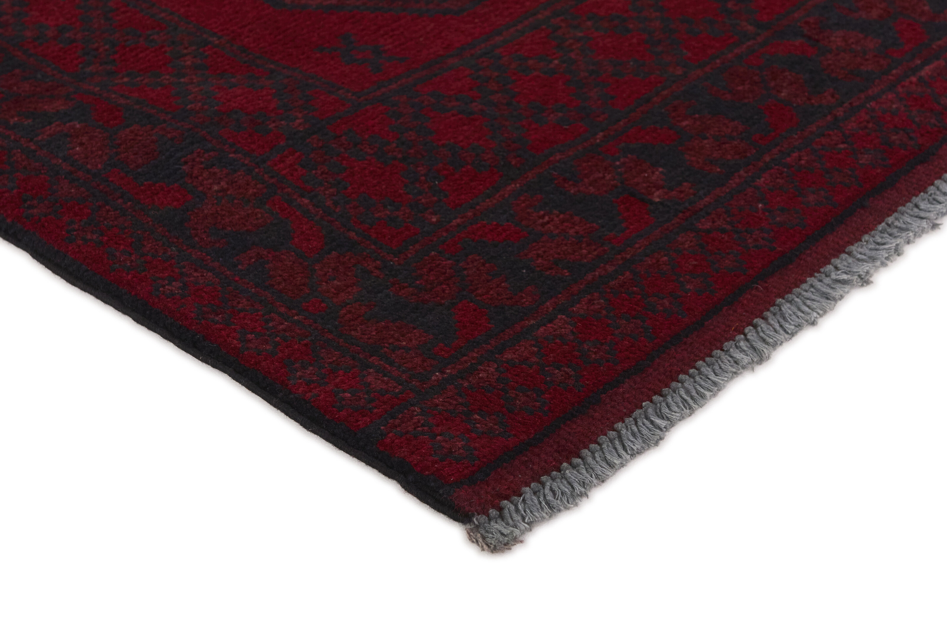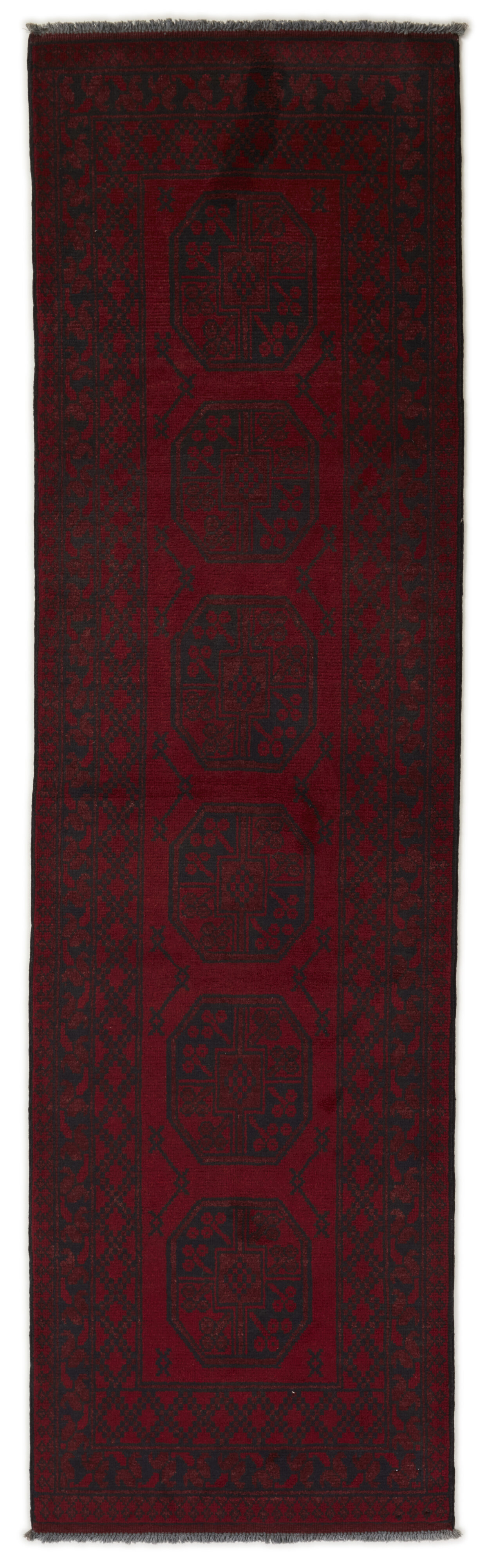 Aktscha rugs are knotted by Turkmens in the Aktscha (Acqcha) district, which is situated in the central part of the Jowzjan Province of northern Afghanistan. The Aktscha rugs are very similar to the Old Afghan (Khal Mohammadi) rugs, but are of a lower quality, as the knot density is lower. The rugs have the same characteristics, with the deep, warm, and fiery red base colour, the relatively high and sturdy pile, the wool base weave, and the use of goat’s and horse’s hair. The Gül (Elephant’s Foot) pattern is the primary pattern of the Aktscha rugs.
