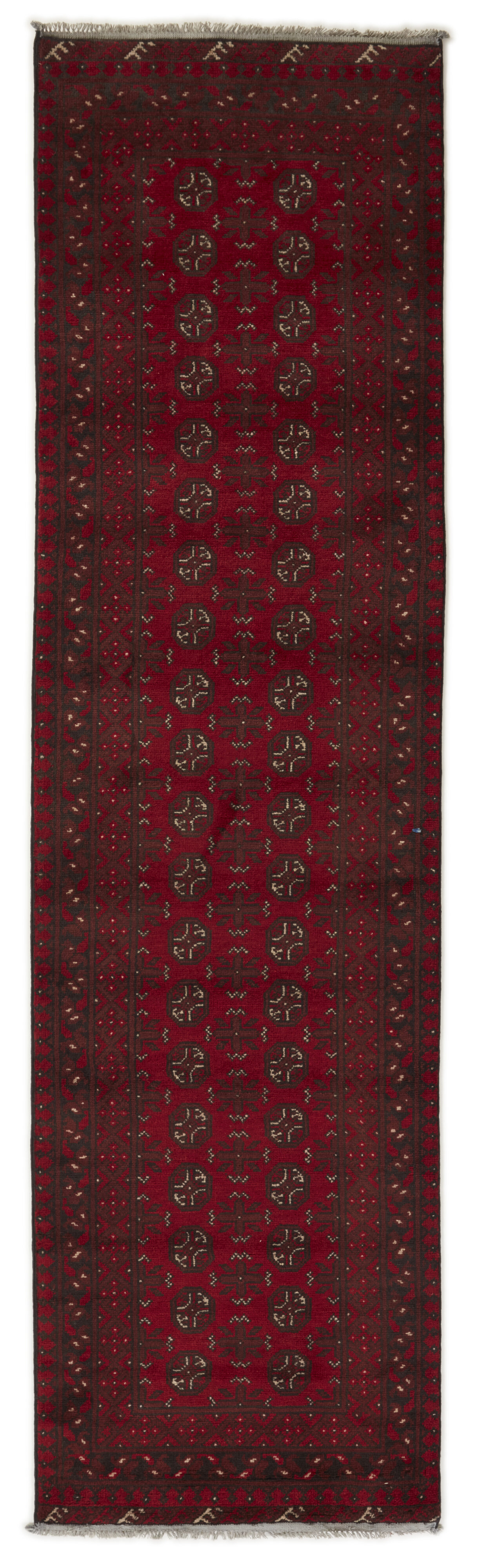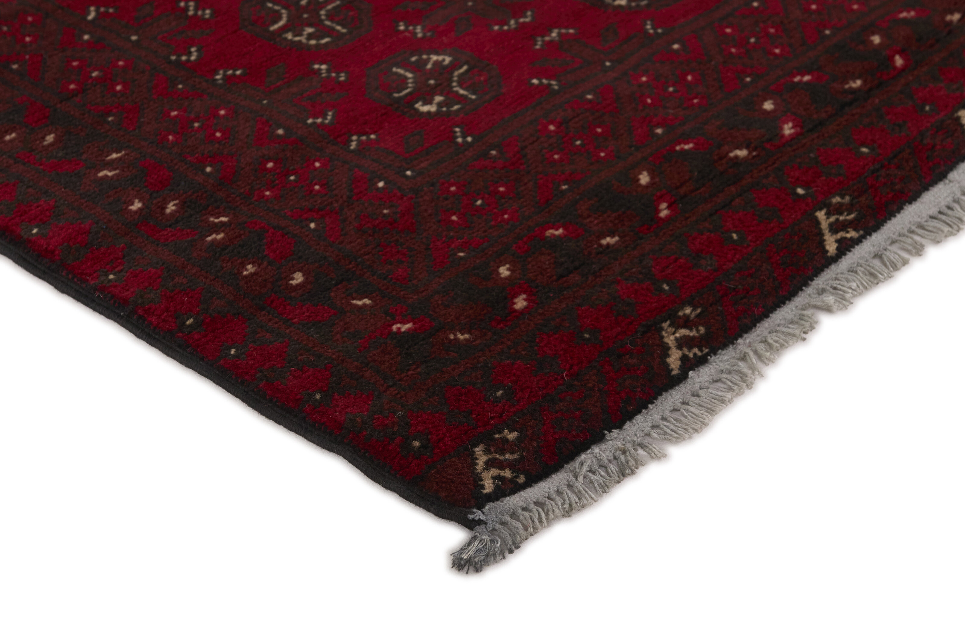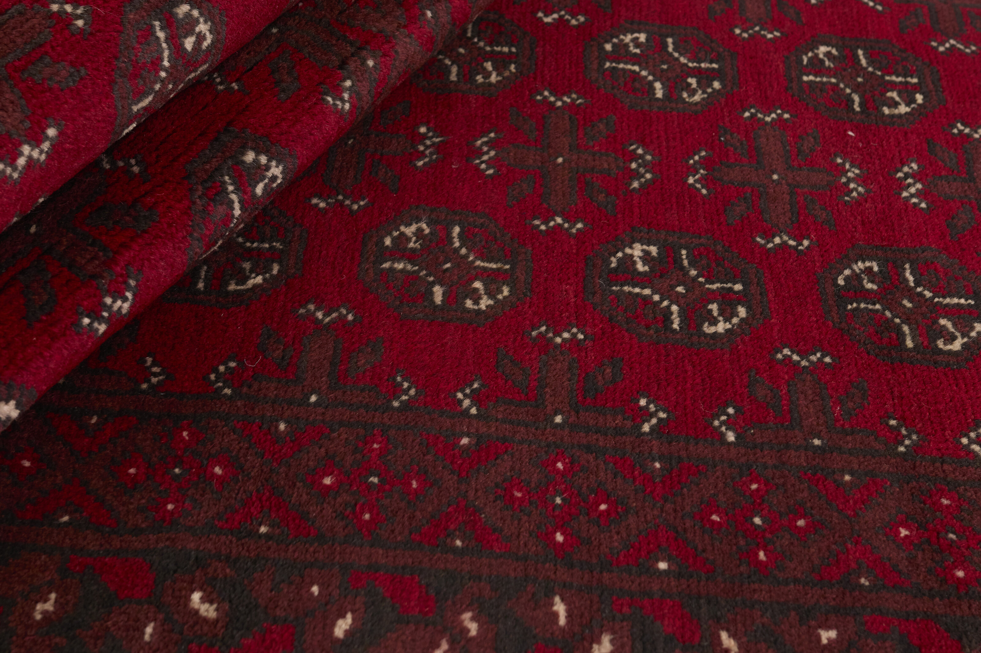 Aktscha rugs are knotted by Turkmens in the Aktscha (Acqcha) district, which is situated in the central part of the Jowzjan Province of northern Afghanistan. The Aktscha rugs are very similar to the Old Afghan (Khal Mohammadi) rugs, but are of a lower quality, as the knot density is lower. The rugs have the same characteristics, with the deep, warm, and fiery red base colour, the relatively high and sturdy pile, the wool base weave, and the use of goat’s and horse’s hair. The Gül (Elephant’s Foot) pattern is the primary pattern of the Aktscha rugs.