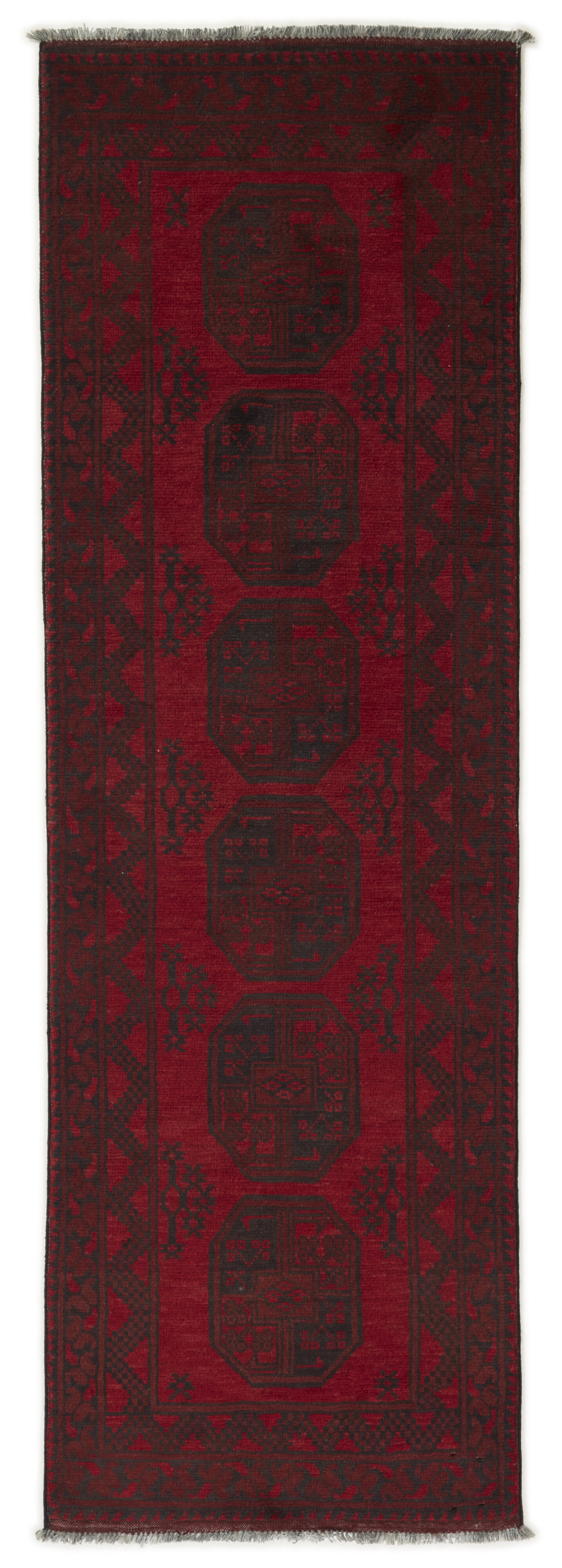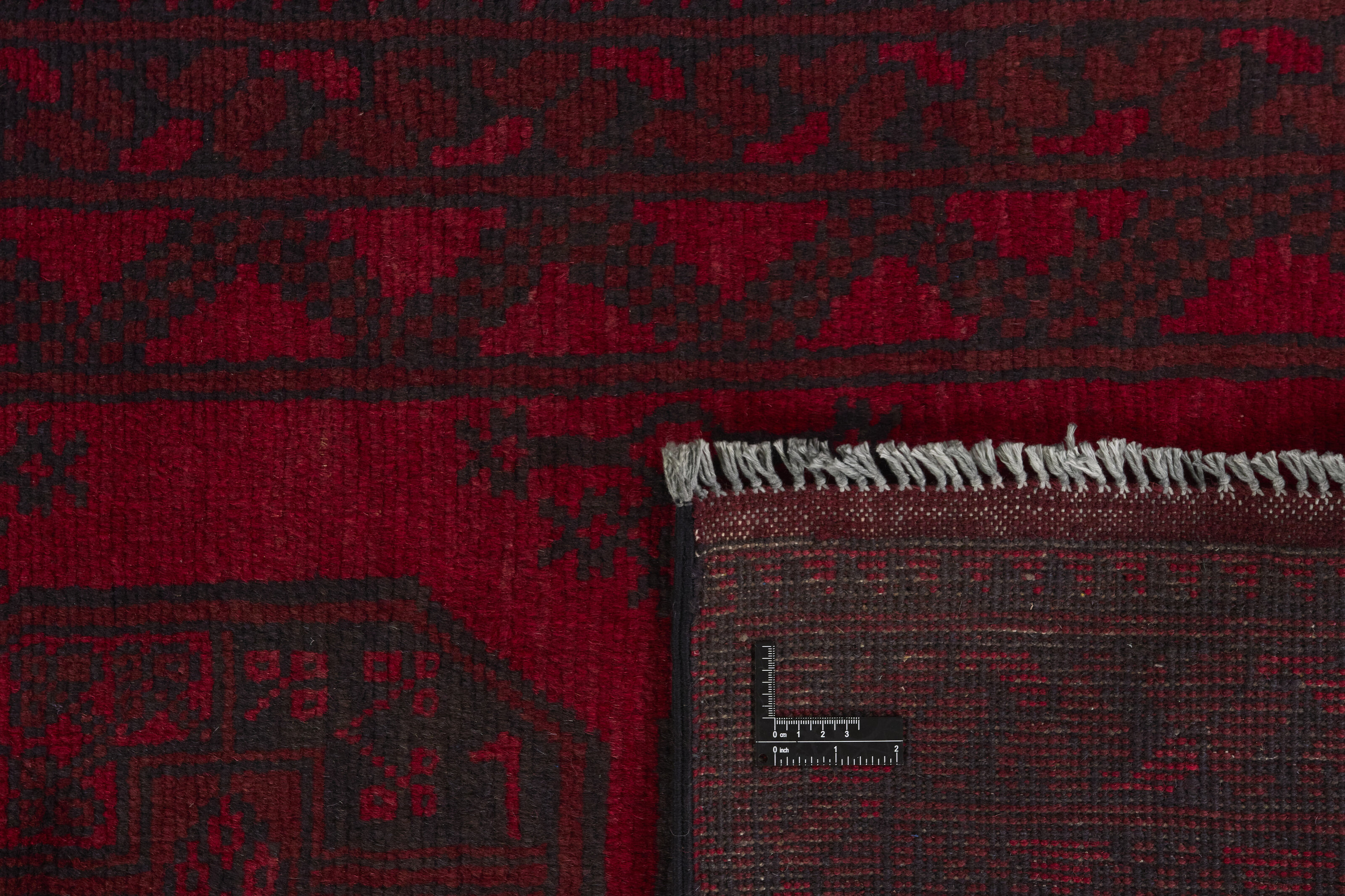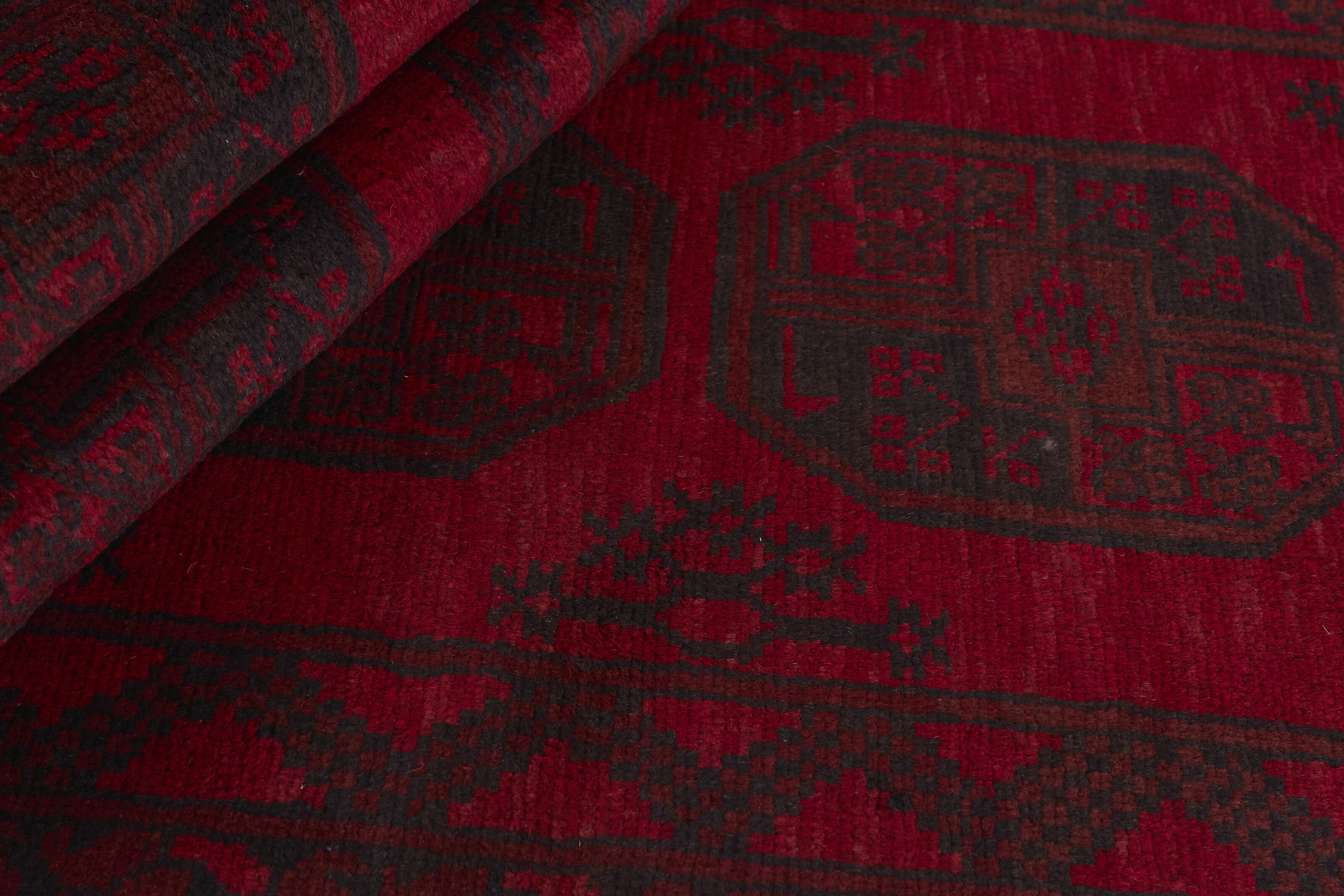 Aktscha rugs are knotted by Turkmens in the Aktscha (Acqcha) district, which is situated in the central part of the Jowzjan Province of northern Afghanistan. The Aktscha rugs are very similar to the Old Afghan (Khal Mohammadi) rugs, but are of a lower quality, as the knot density is lower. The rugs have the same characteristics, with the deep, warm, and fiery red base colour, the relatively high and sturdy pile, the wool base weave, and the use of goat’s and horse’s hair. The Gül (Elephant’s Foot) pattern is the primary pattern of the Aktscha rugs.