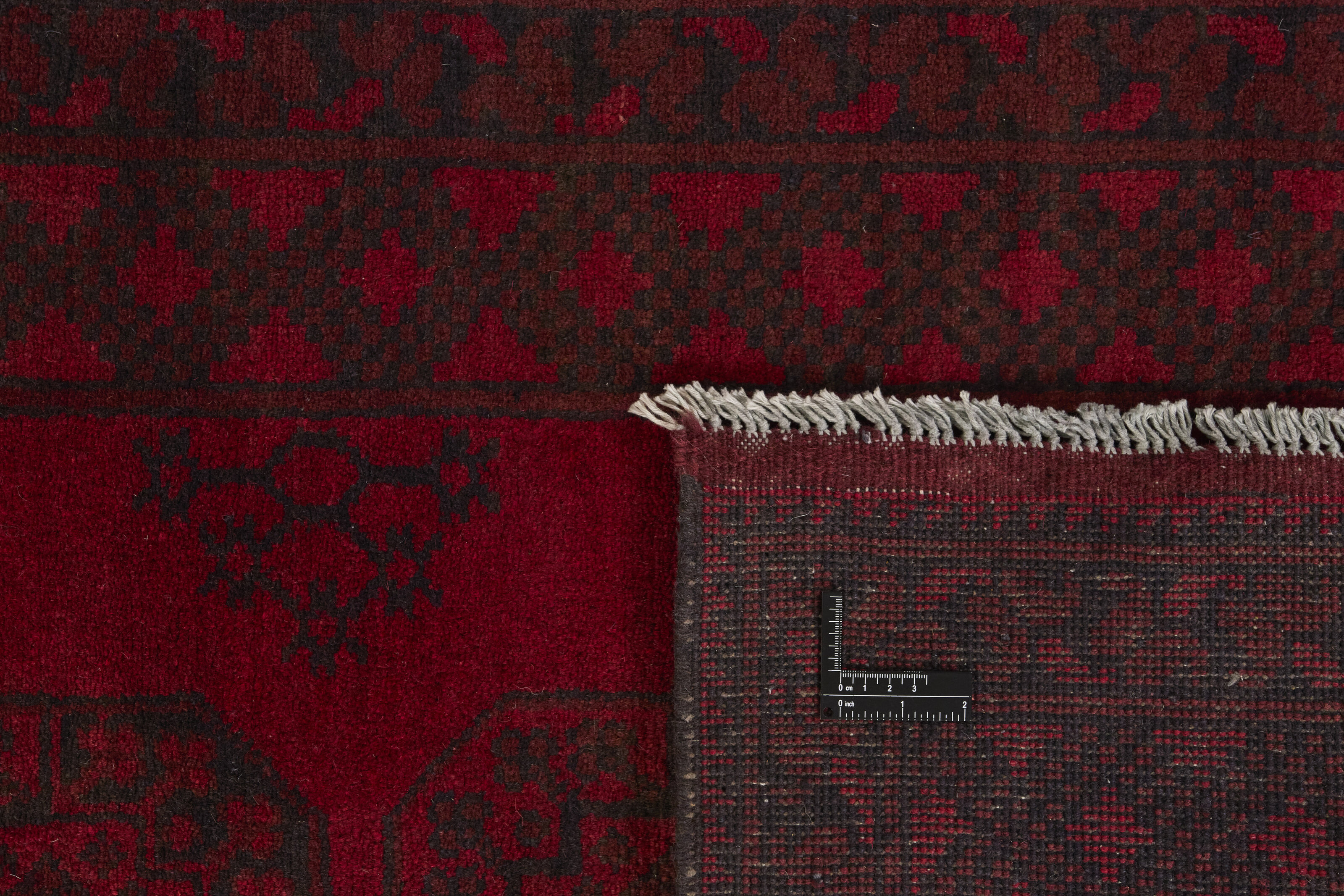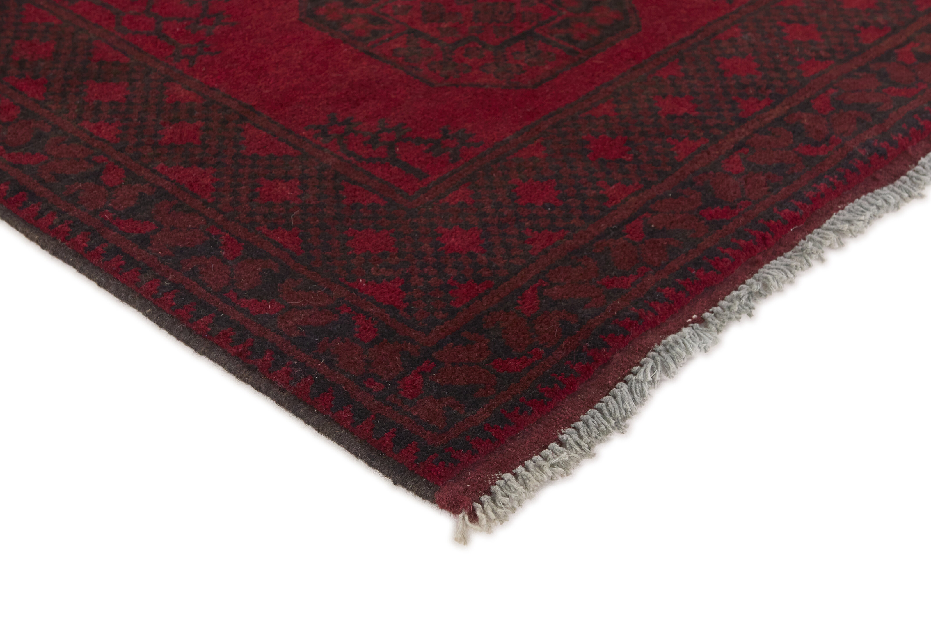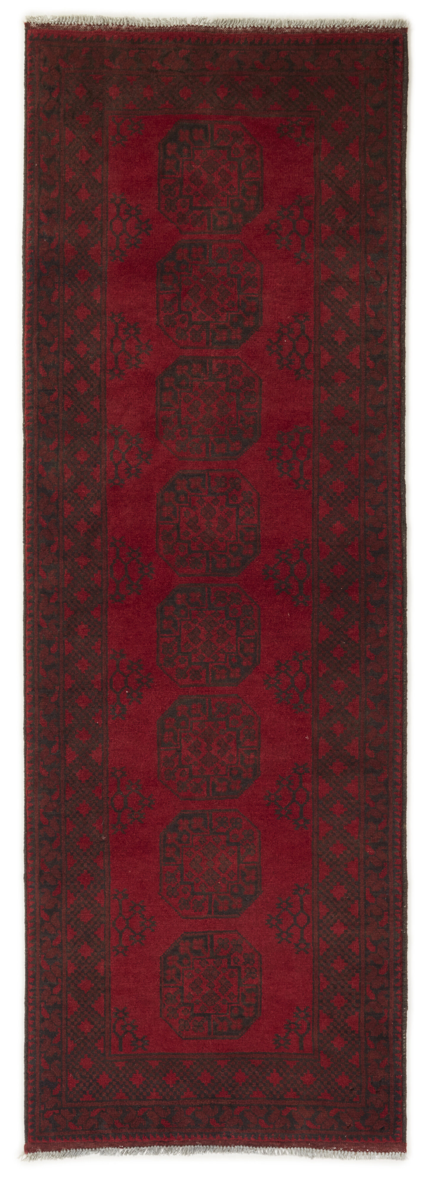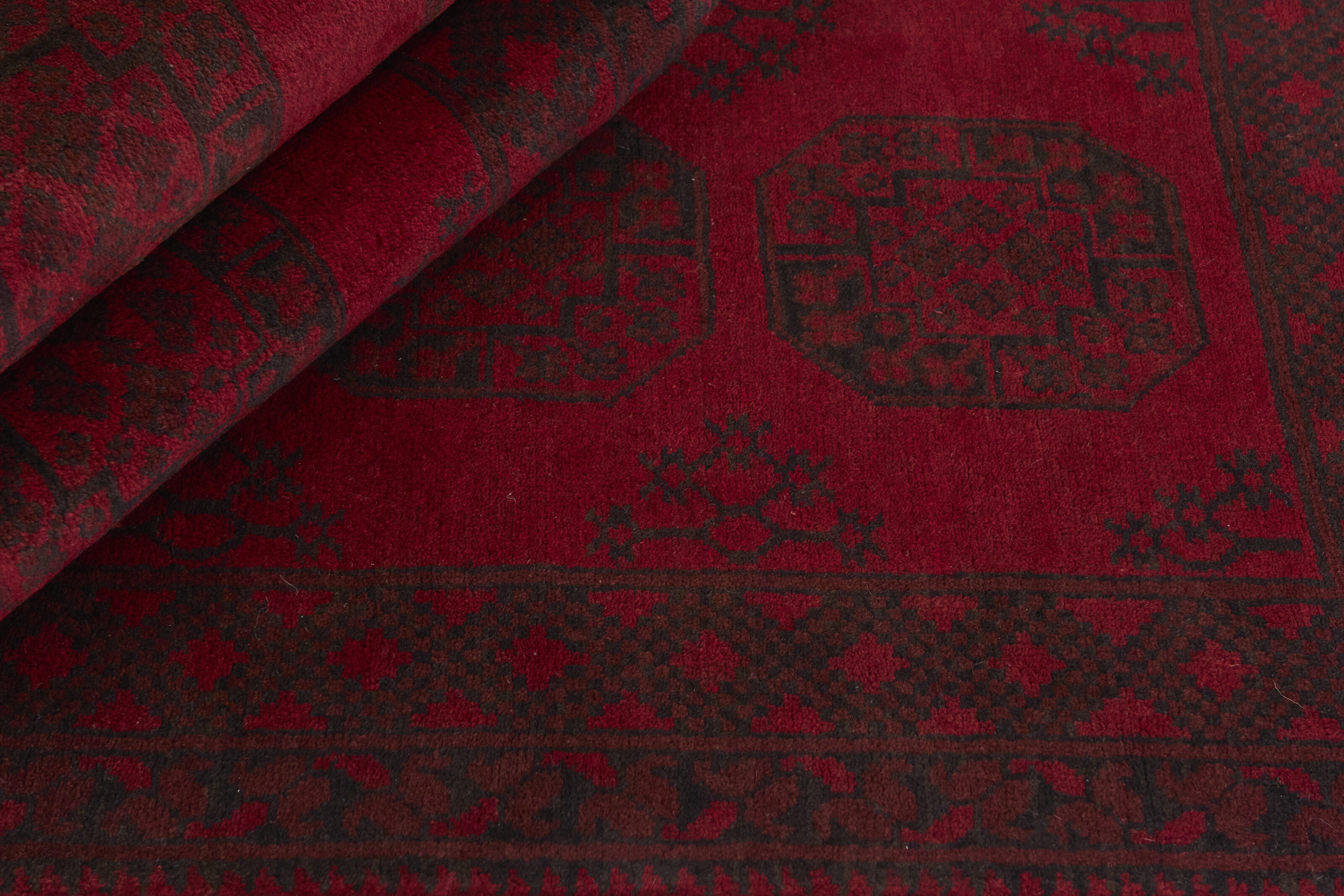 Aktscha rugs are knotted by Turkmens in the Aktscha (Acqcha) district, which is situated in the central part of the Jowzjan Province of northern Afghanistan. The Aktscha rugs are very similar to the Old Afghan (Khal Mohammadi) rugs, but are of a lower quality, as the knot density is lower. The rugs have the same characteristics, with the deep, warm, and fiery red base colour, the relatively high and sturdy pile, the wool base weave, and the use of goat’s and horse’s hair. The Gül (Elephant’s Foot) pattern is the primary pattern of the Aktscha rugs.