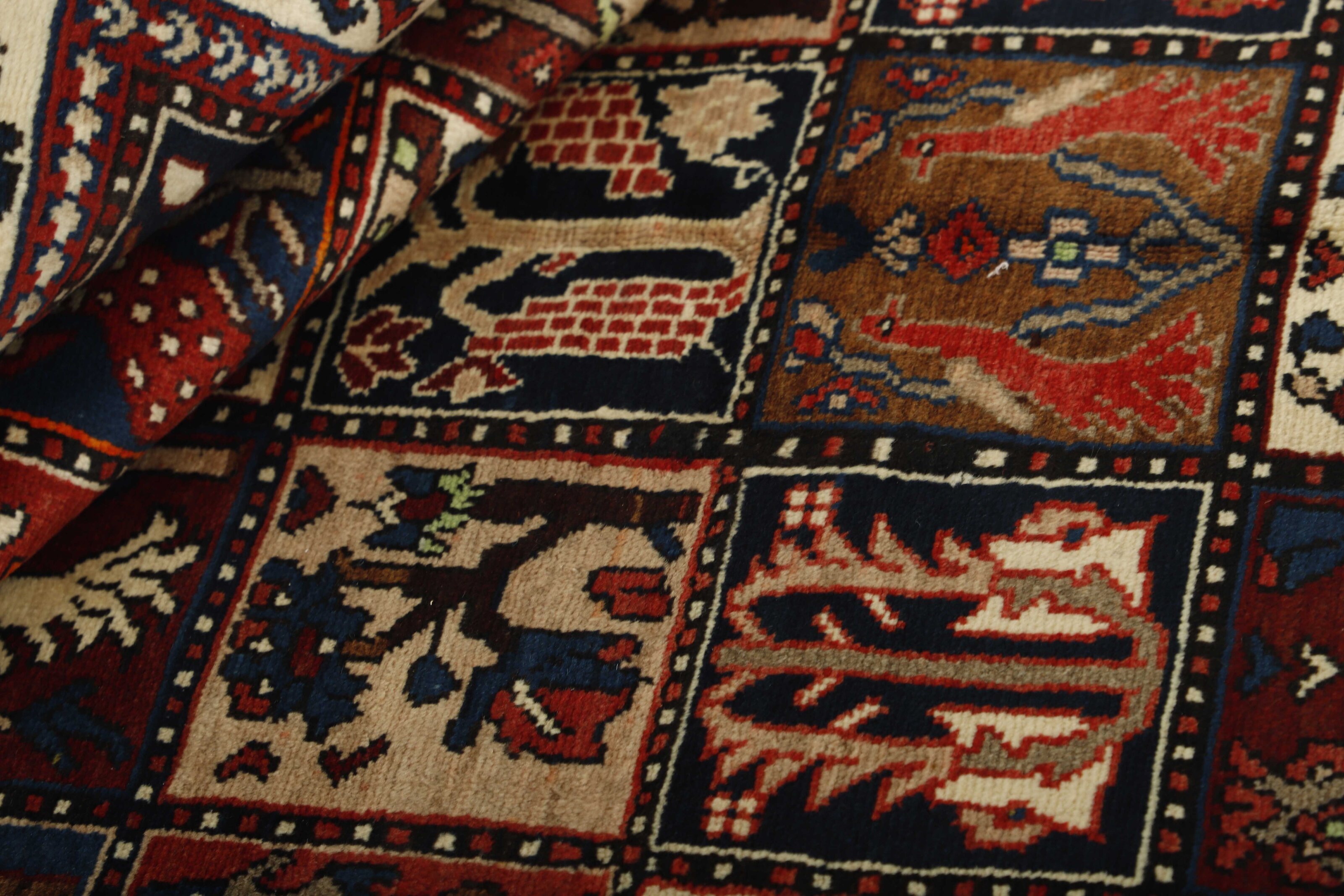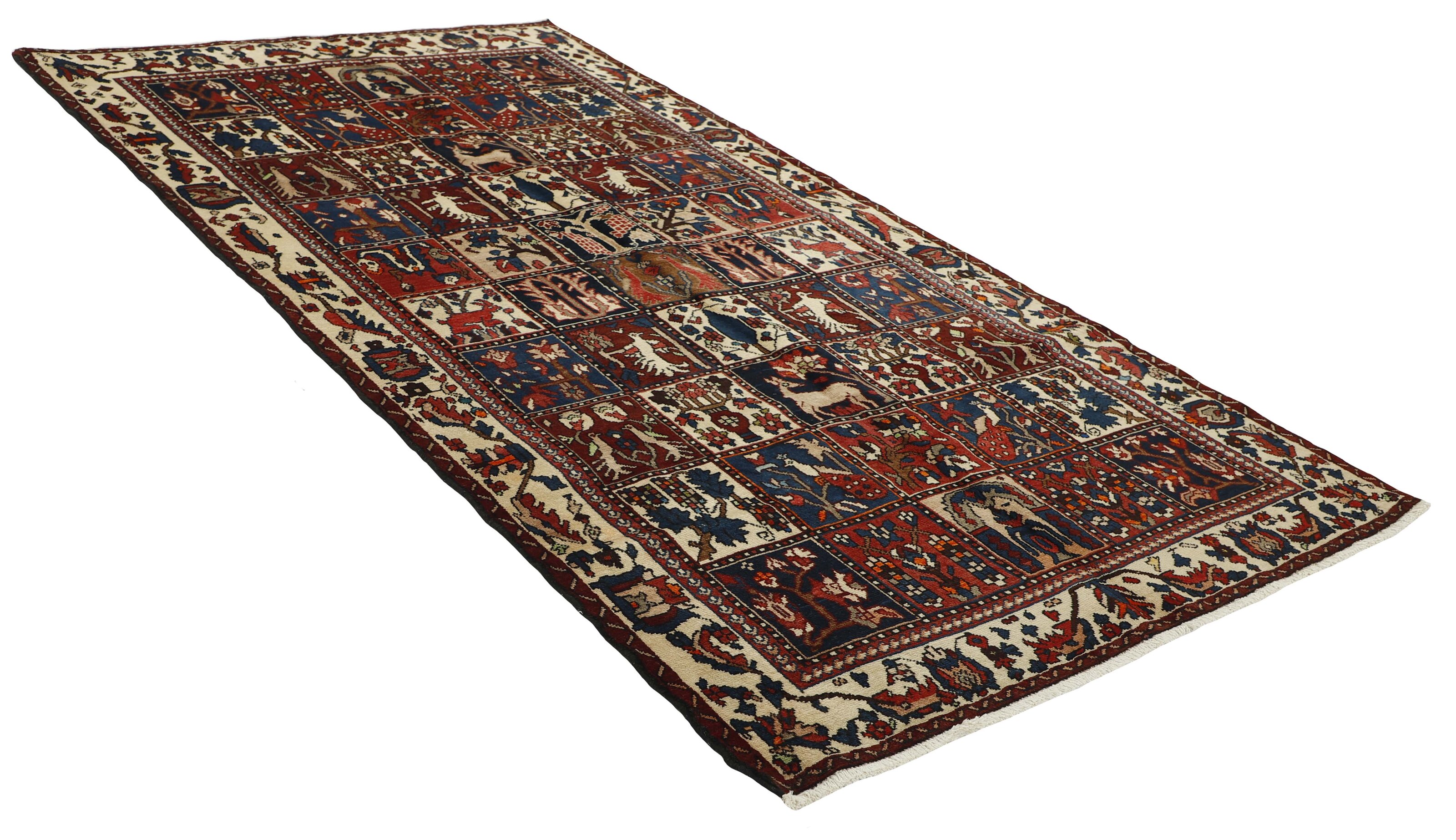 BakhtiyarItem no.: 1487956 Size: 162 cm x 292 cmBakhtiyar is the name of two types of rugs: one is produced by nomads in the Zagros Mountains west of Isfahan in central Iran, and the other more important rug is produced by permanent residents of the villages in the area. Only few Bakhtiyar nomad rugs reach the market – the most common are probably bag rugs that combine pile and Kelim work. Rugs from the villages are more common, and they are produced in numerous mountain villages, whose inhabitants are of Turkish, Persian or Armenian descent. They are most often sold in the bazaars of Isfahan. The most common patterns are medallions and the so-called garden patterns, which are divided into squares of different flower patterns. The pattern has ancient roots, and is often rustic, as large blocks of colour with heavy contours are used. Most colours are made from locally produced plant pigments, giving a harmonious effect to the rugs.