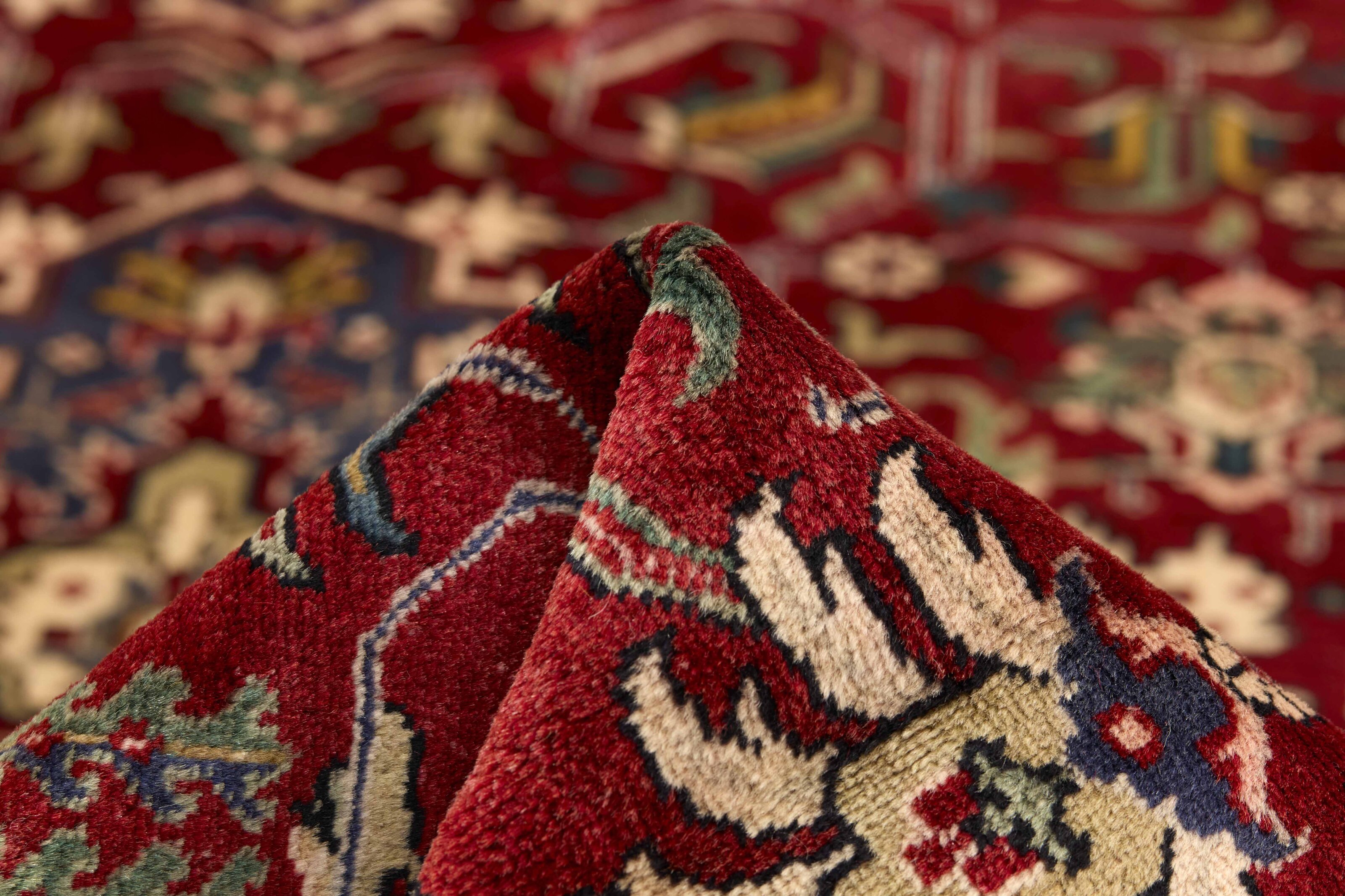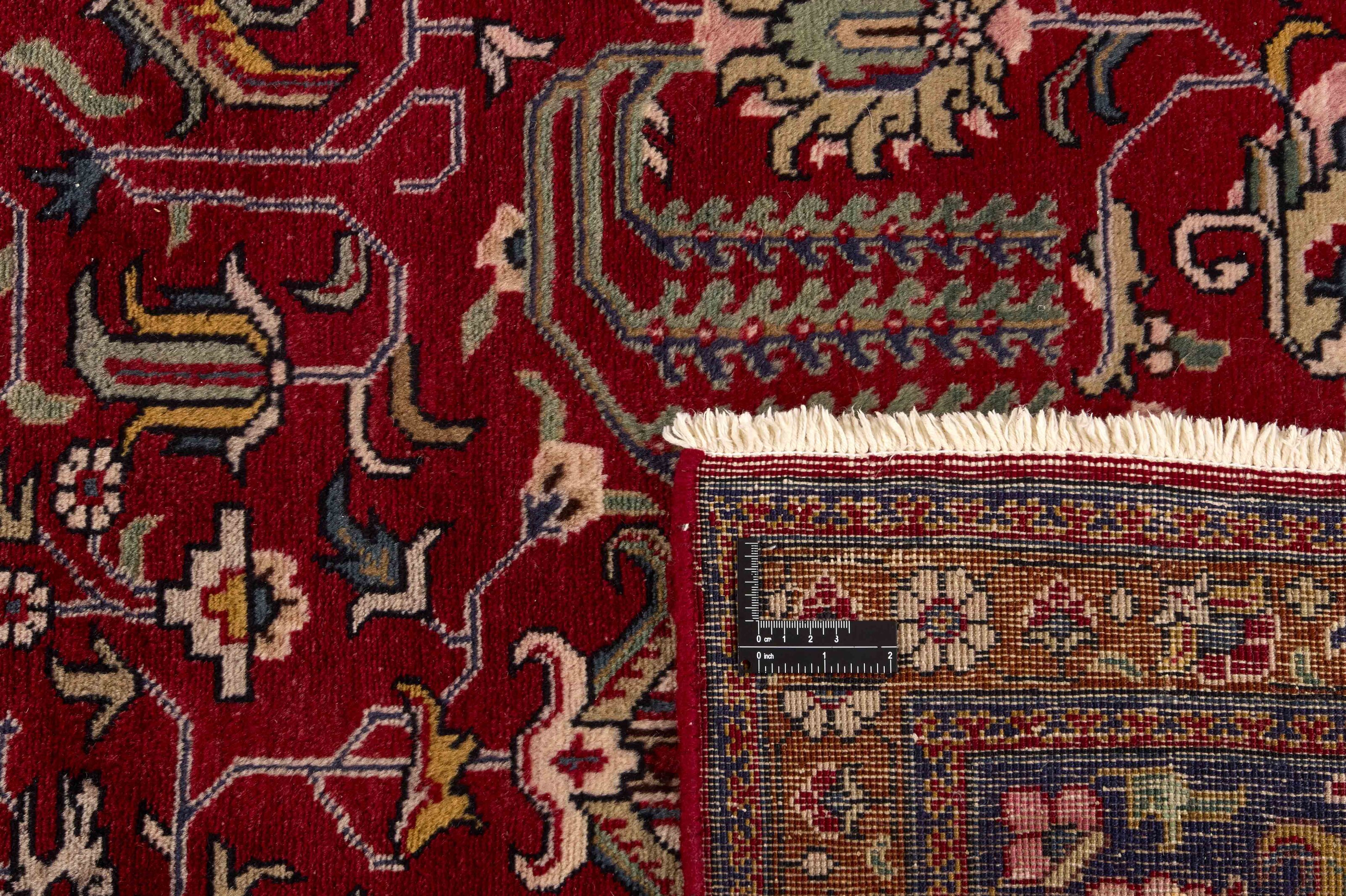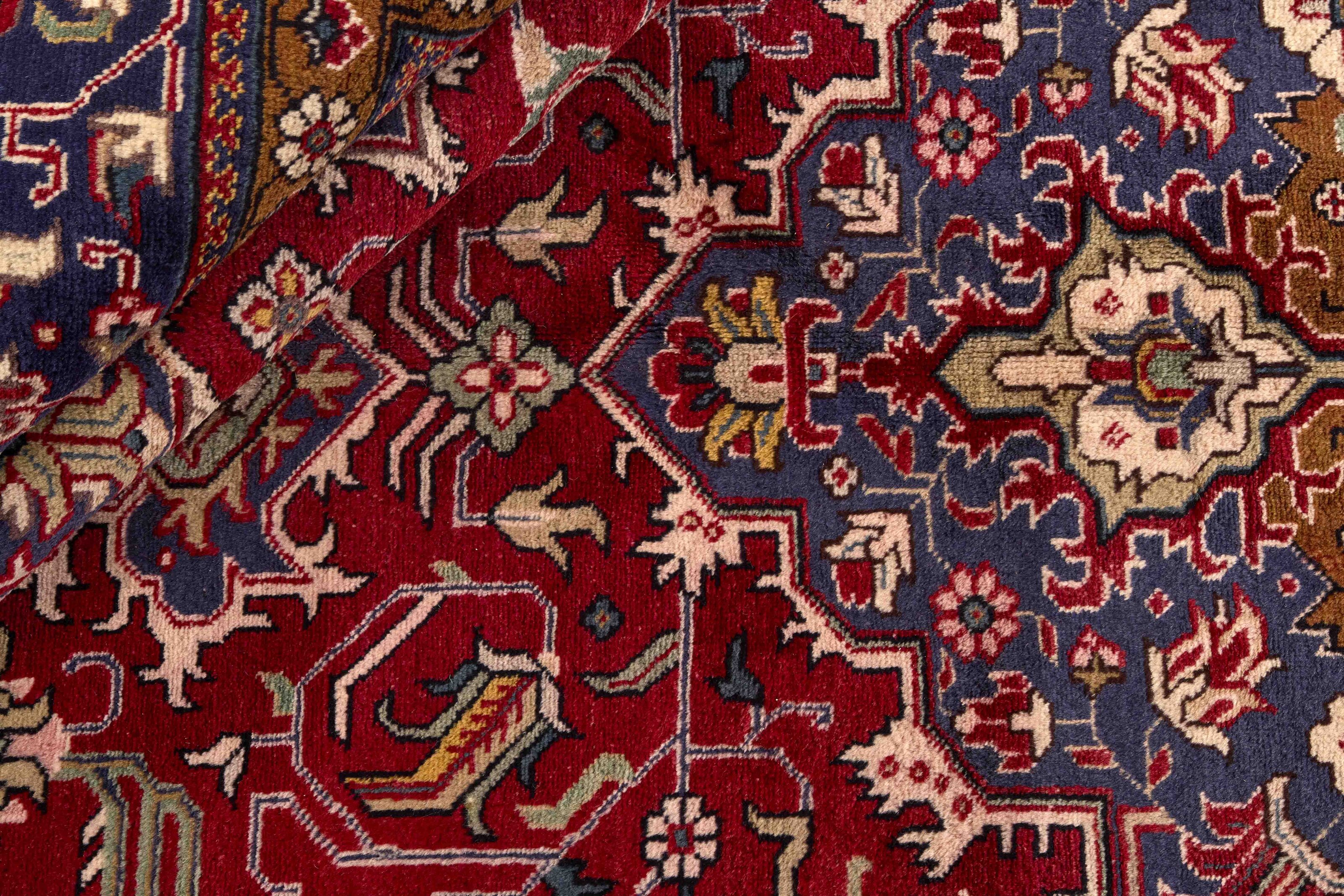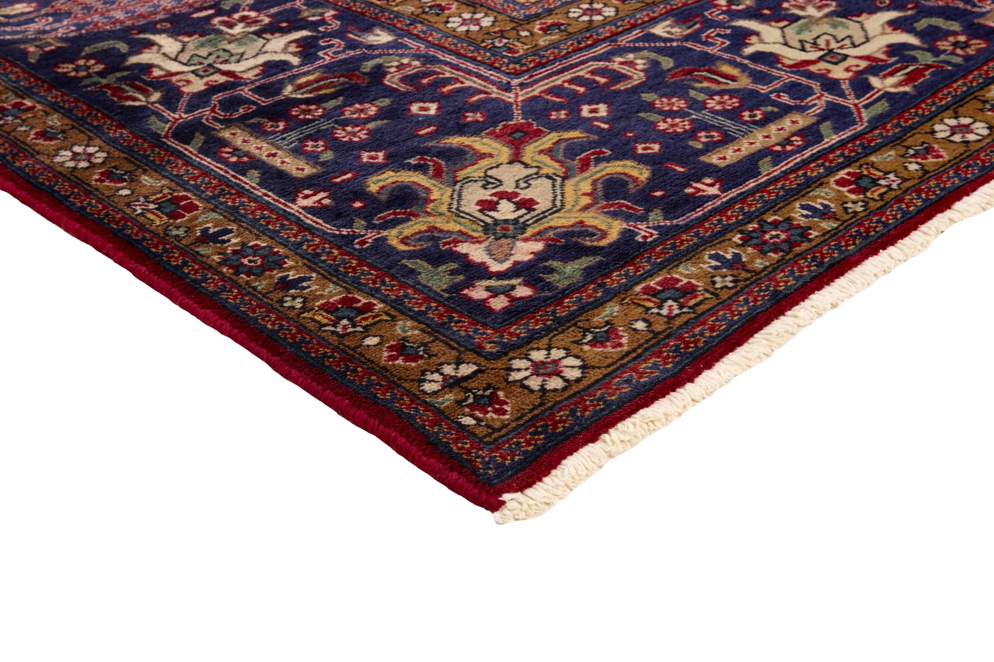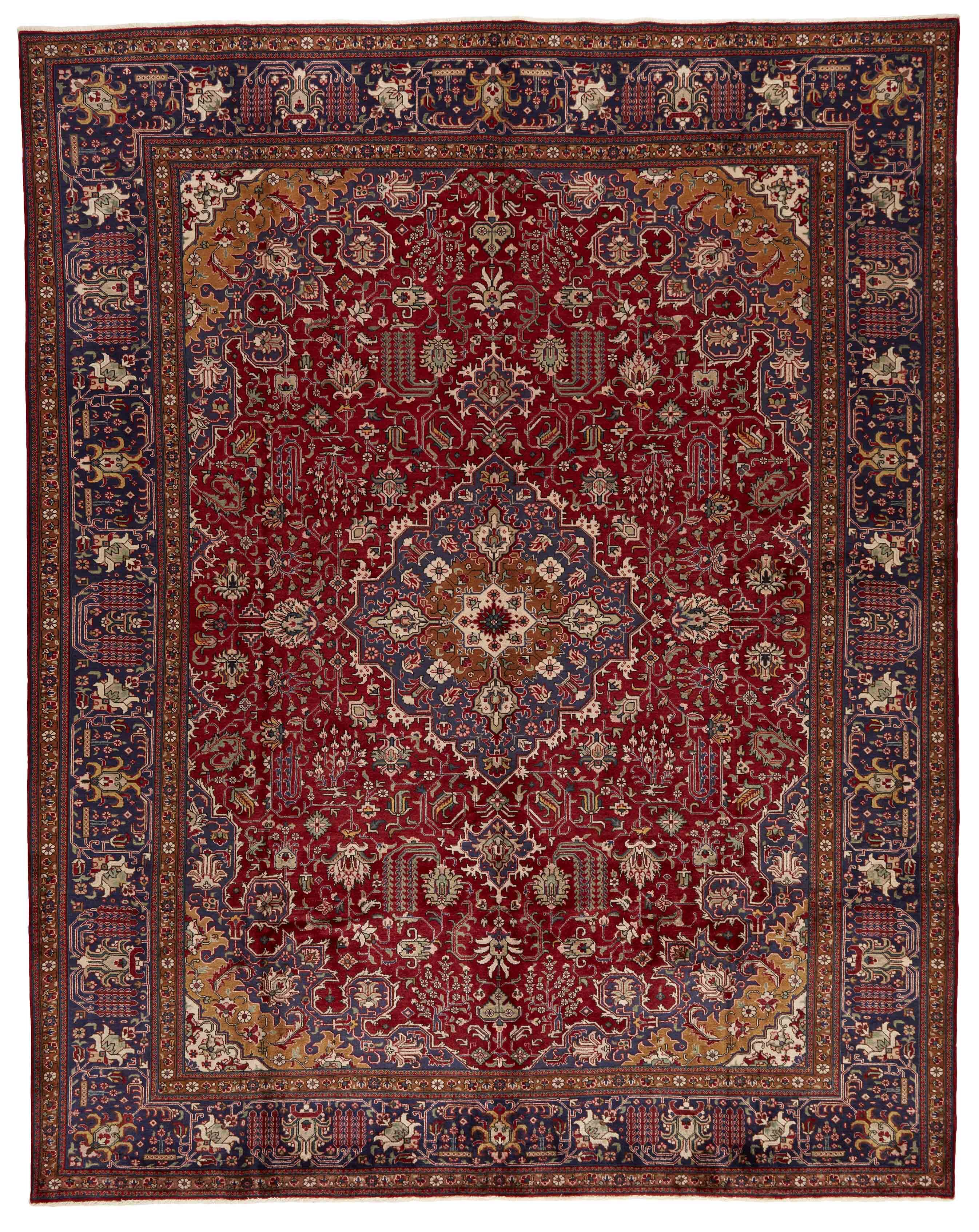 TabrizItem no.: 1195220 Size: 312 cm x 387 cmTabriz is one of the most important cities in Iran. It has a population of 1,5 million people, and is the capitol of the East Azerbaijan province. As one of Persia’s biggest rug producing regions, Tabriz rugs are exported in all qualities, from the more simple to the most luxurious. The best qualities are divided into two main categories; the Tabriz Mahi, also known as “Tabriz fish pattern” (the rug’s leaf-shaped pattern is called Mahi, meaning “fish”), and the Tabriz Nagsheh, which means pattern. In this context, it refers to the figurative patterns and symbols from Keshan and Isfahan, which inspire the Tabriz Nagsheh rug. The knotters are incredibly skilled, and they have invented a special type of hook, which they can use instead of their fingers for knotting the knots. Warp and weft are cotton, and the pile is wool, often with silk woven into it in the finer qualities. The colours in the better rugs are fine and refined. The roughest qualities have bright colours and are rarely exported. Tabriz rugs are often given a number, such as Tabriz 50, which is an indication of quality. Tabriz 50 has 500.000 knots per m2. Rugs from Tabriz are regarded as being of a durable, very high quality.