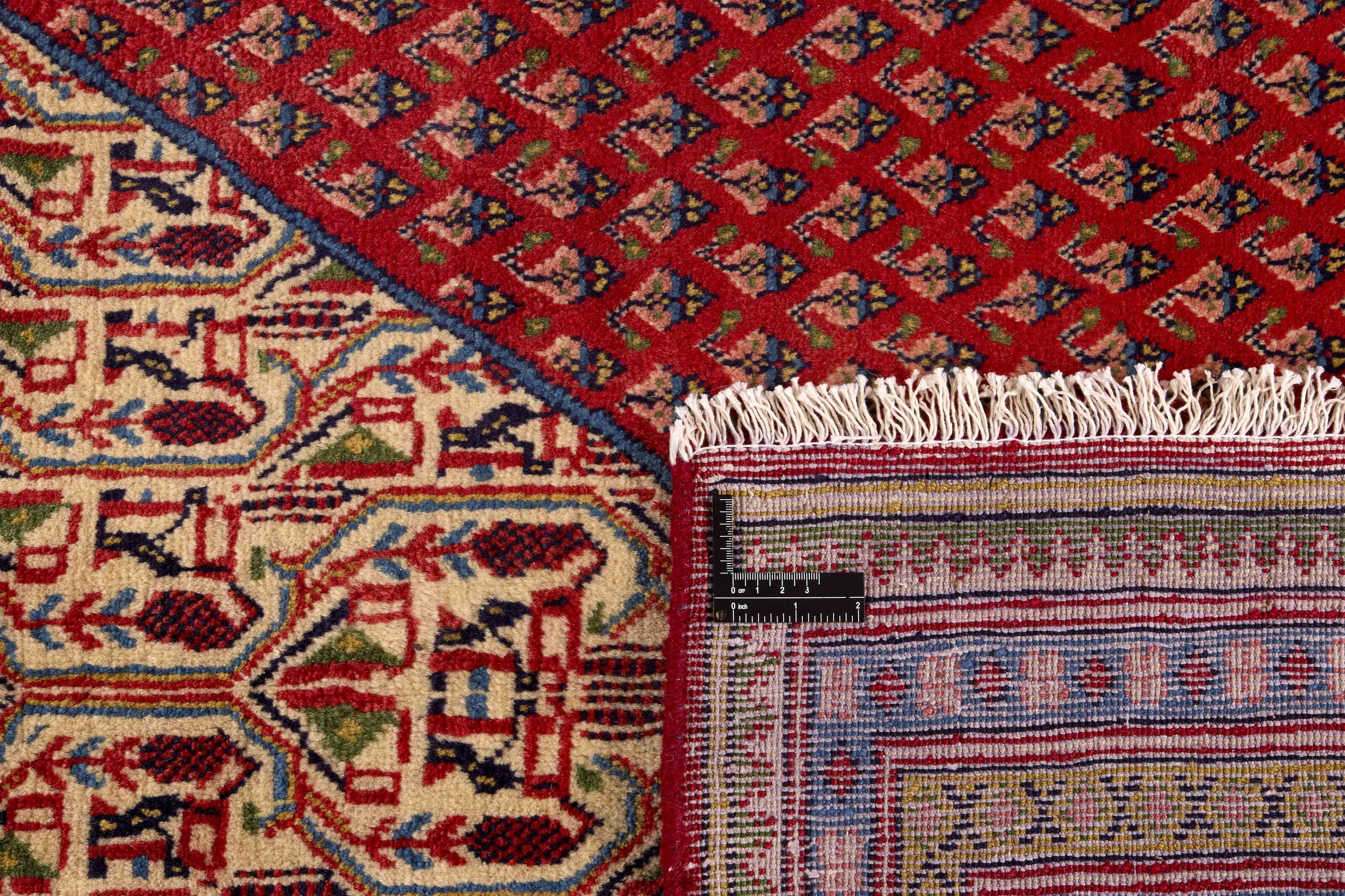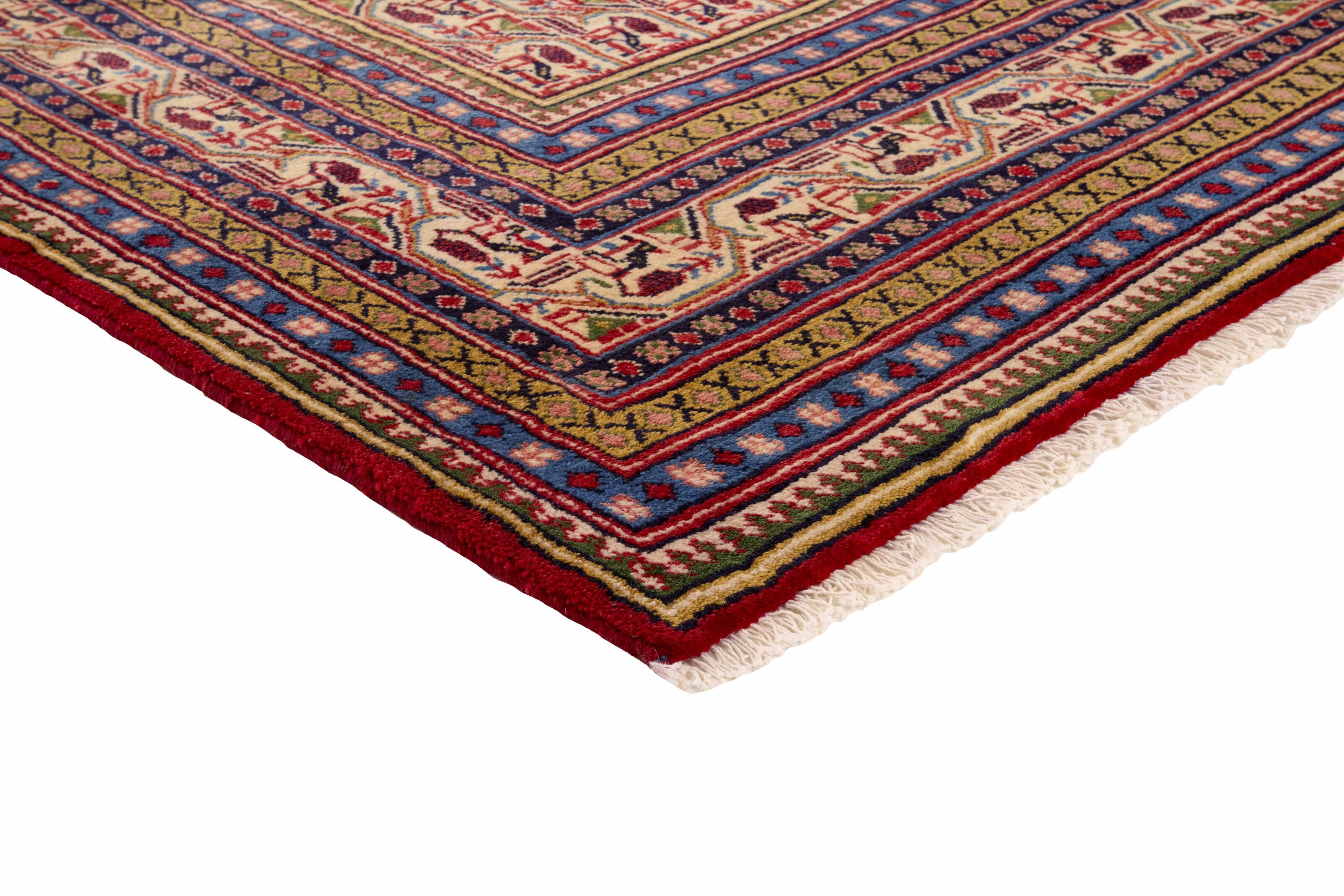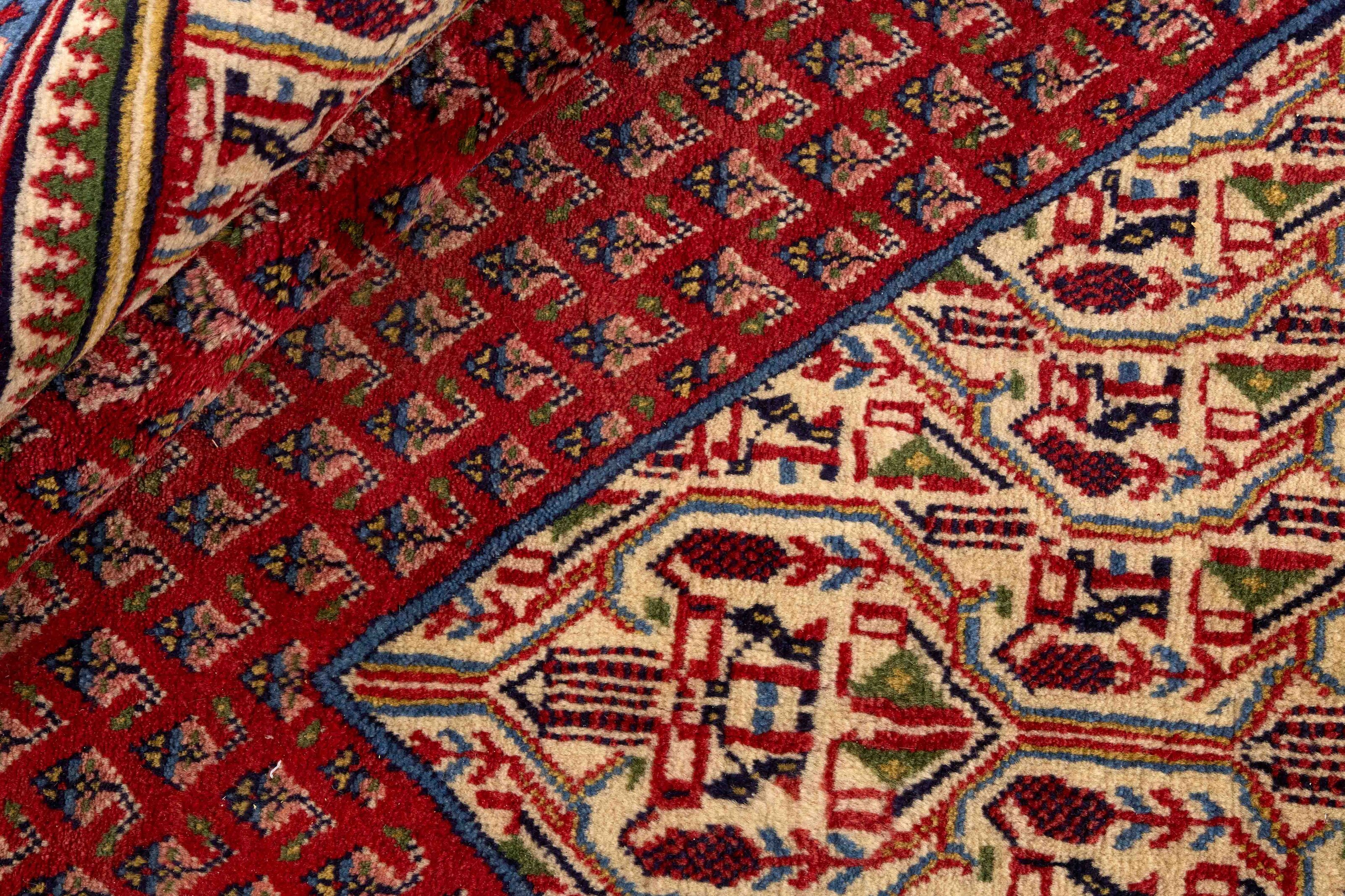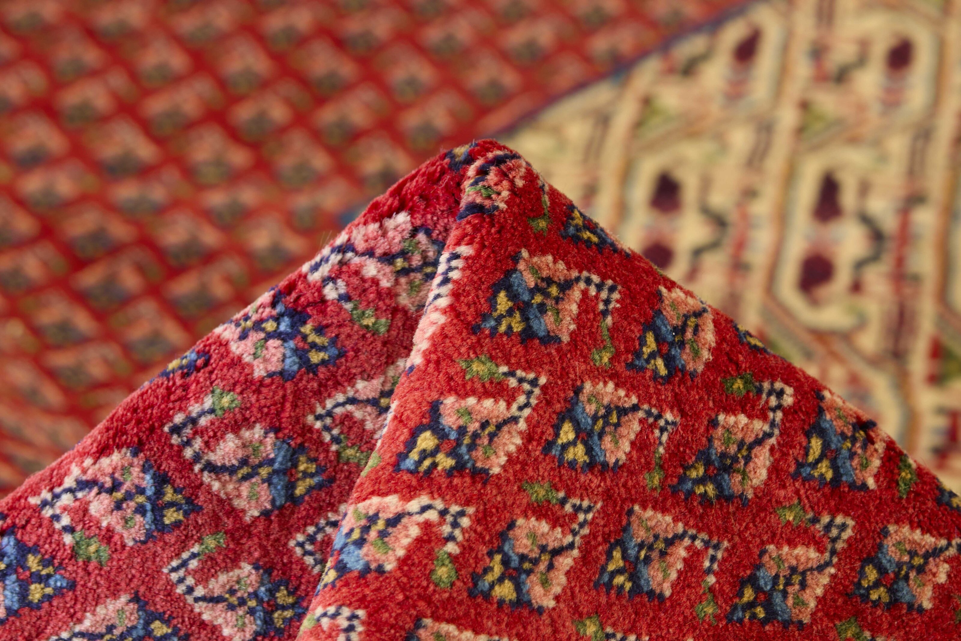 Mir BotehItem no.: 1252830 Size: 297 cm x 395 cmPersian Mir Boteh are hand knotted rugs, produced primarily in the Sarough area of Iran. They are easily recognisable by their special pattern, consisting of smaller mir-e Butha. The pattern has a characteristic pear-like shape, and the pattern is regarded by many as being a flame that symbolises warmth and life. The flame motif is often seen in the ground pattern of Persian rugs.