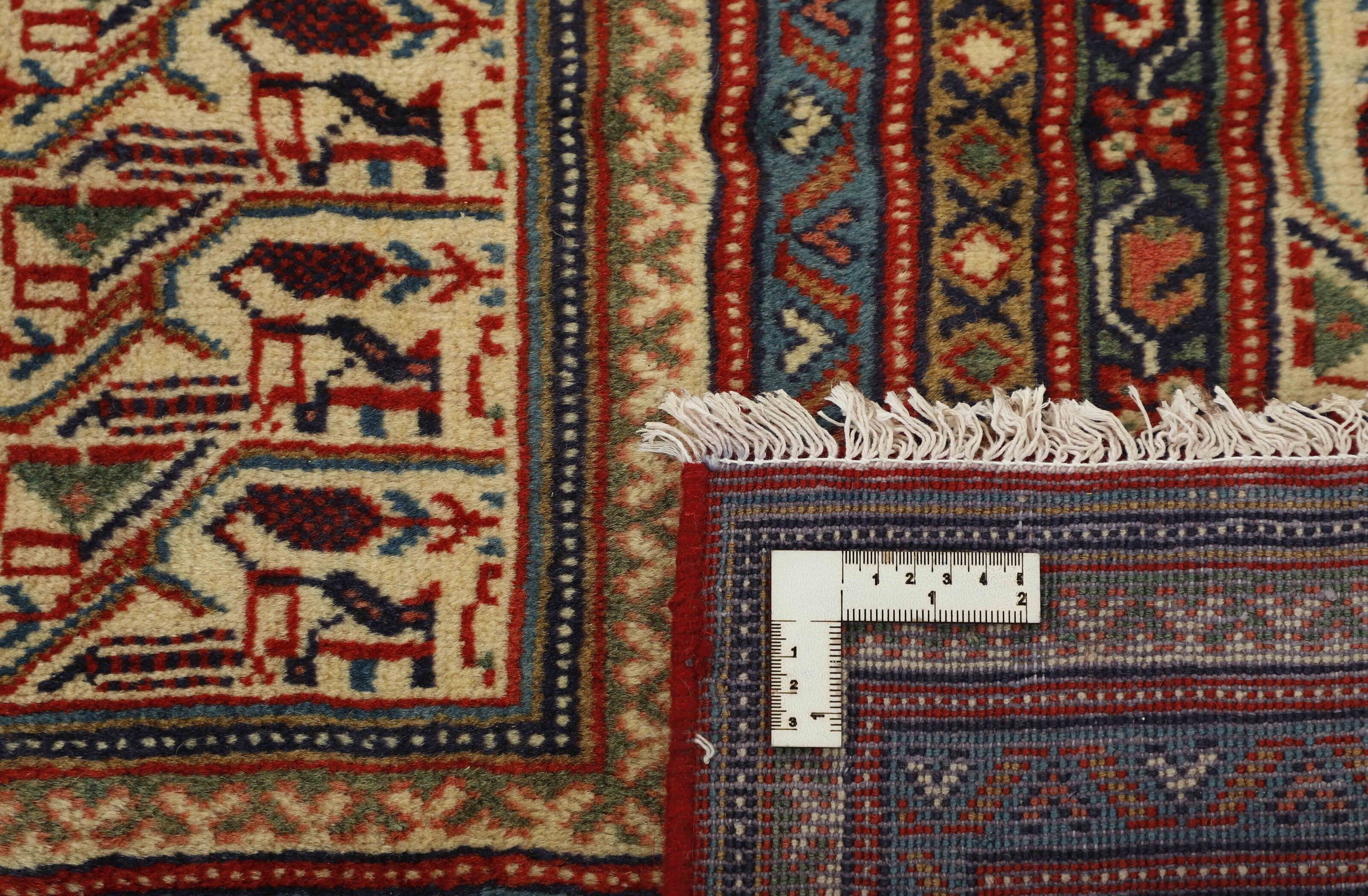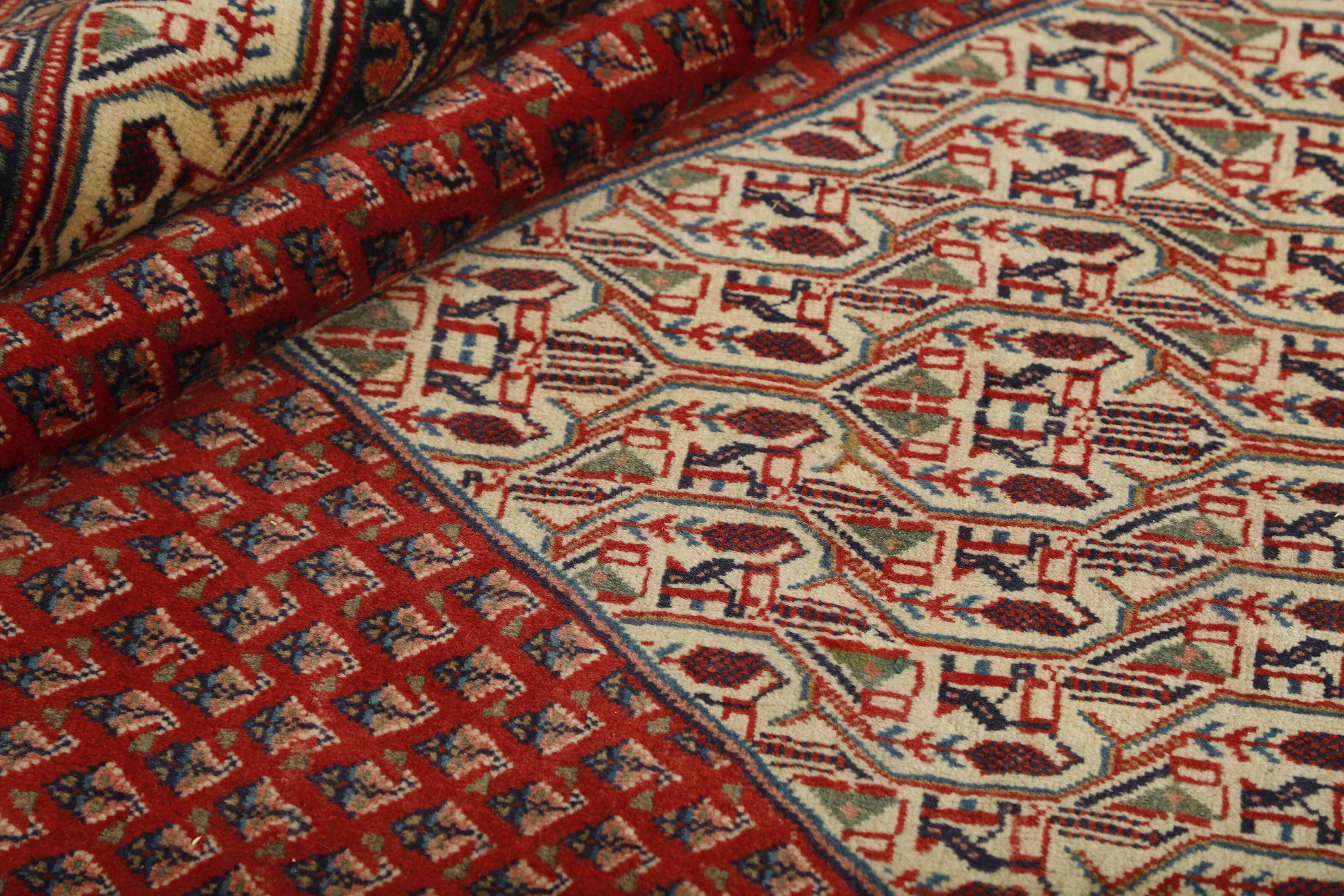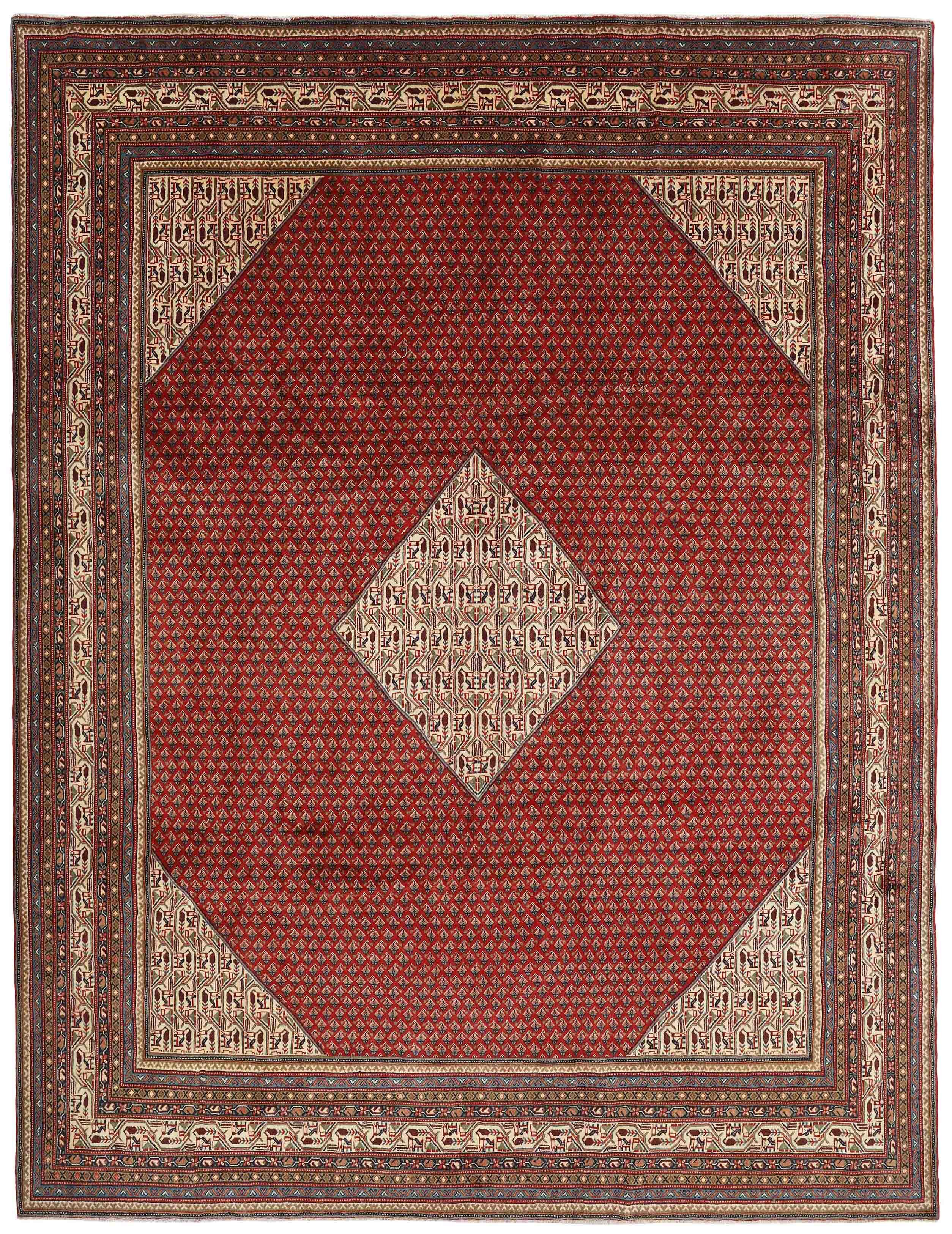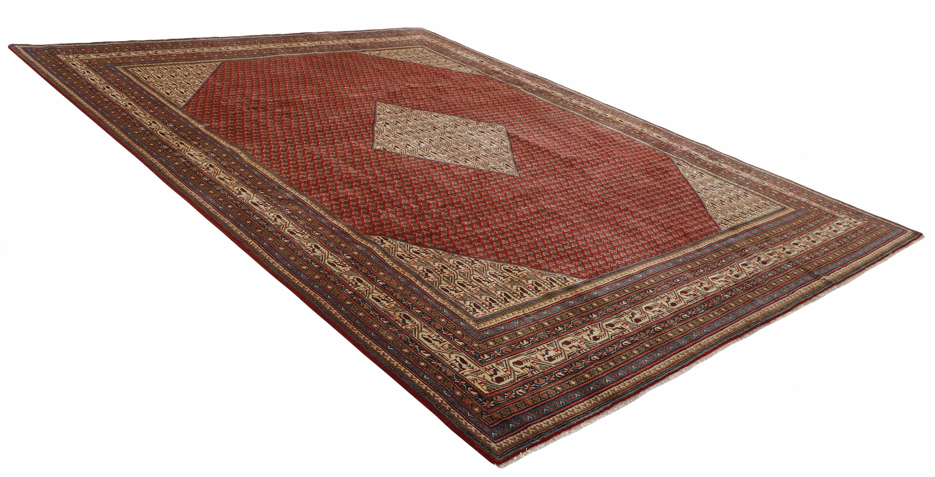 Mir BotehItem no.: 1460145 Size: 293 cm x 384 cmPersian Mir Boteh are hand knotted rugs, produced primarily in the Sarough area of Iran. They are easily recognisable by their special pattern, consisting of smaller mir-e Butha. The pattern has a characteristic pear-like shape, and the pattern is regarded by many as being a flame that symbolises warmth and life. The flame motif is often seen in the ground pattern of Persian rugs.