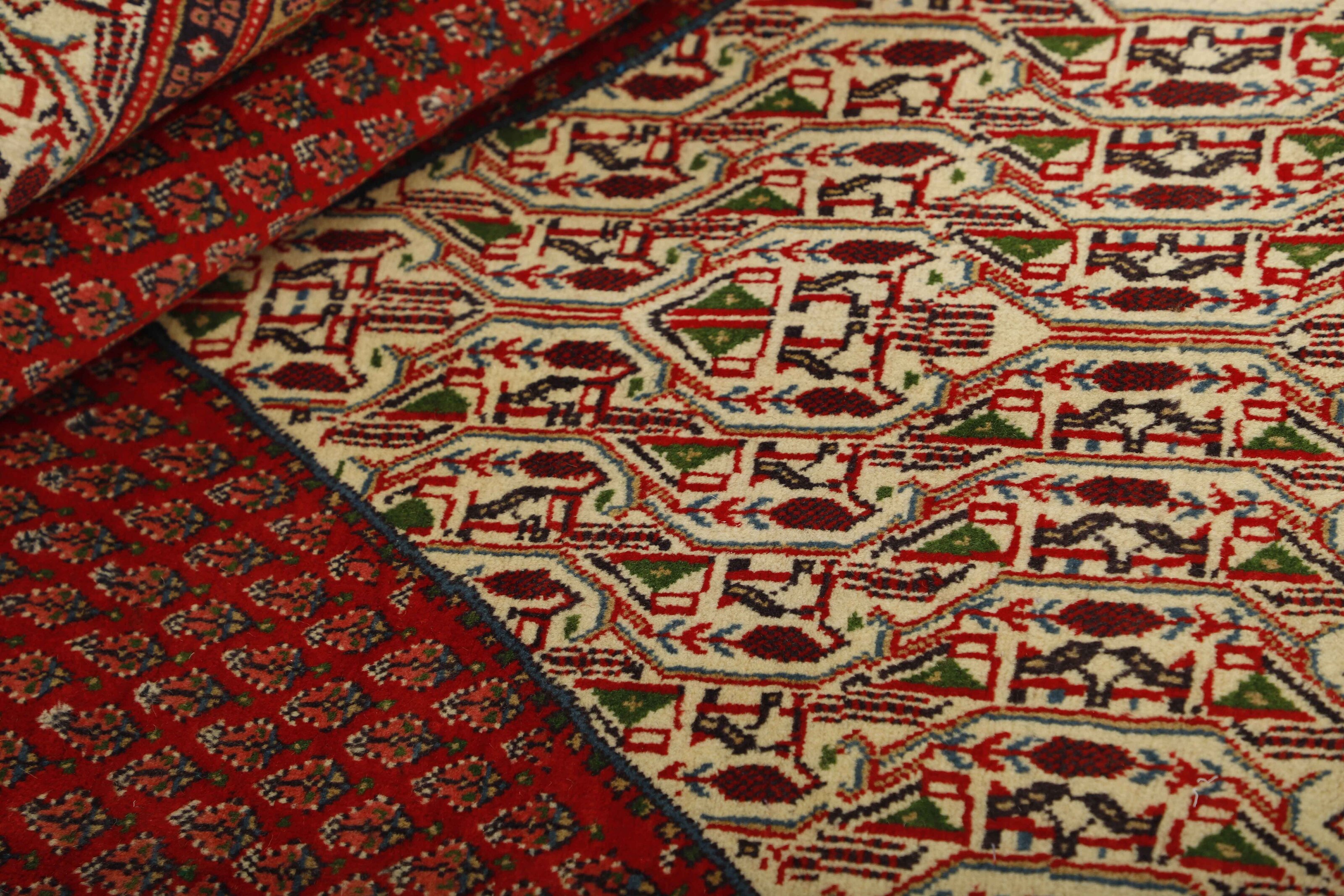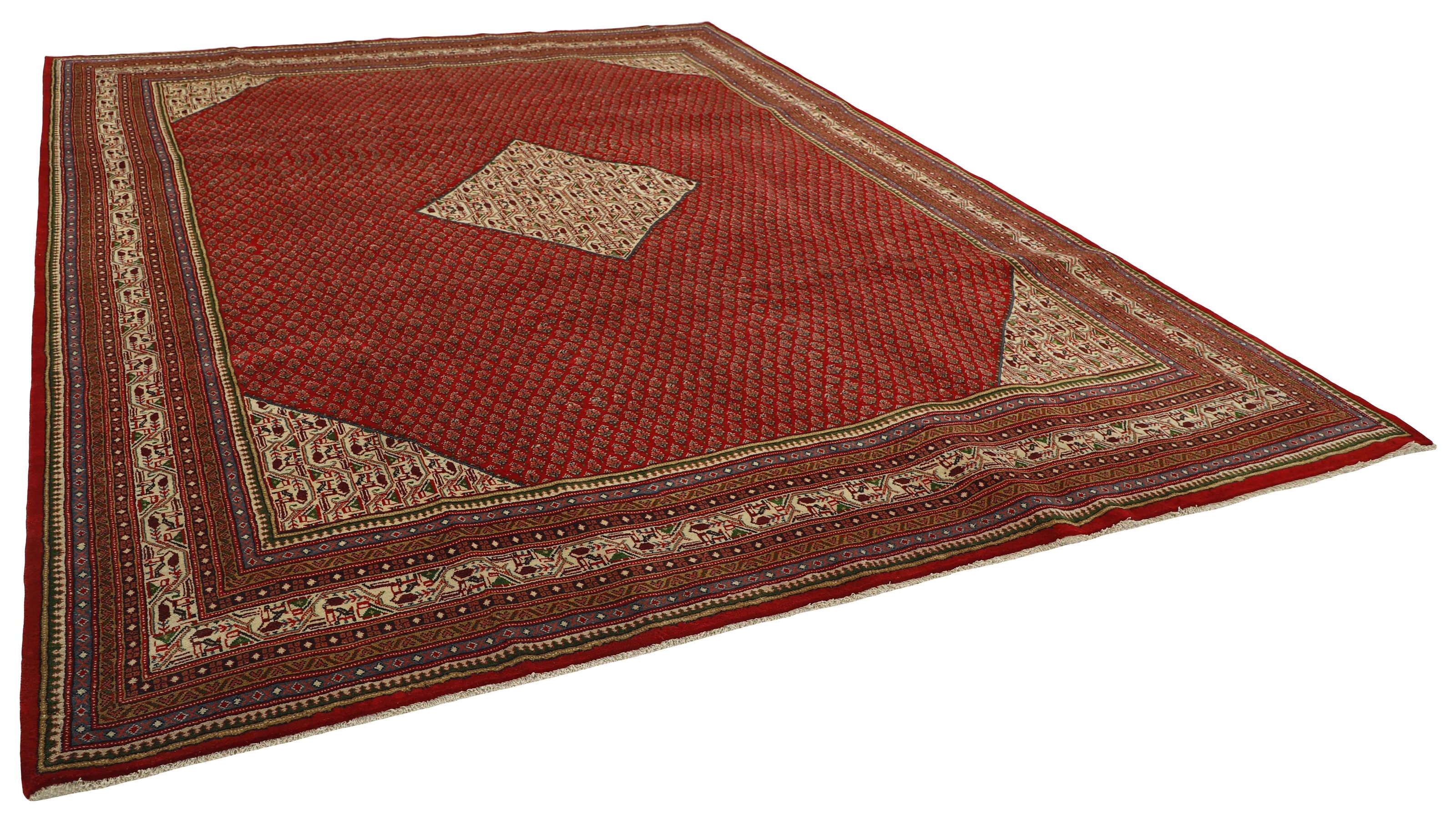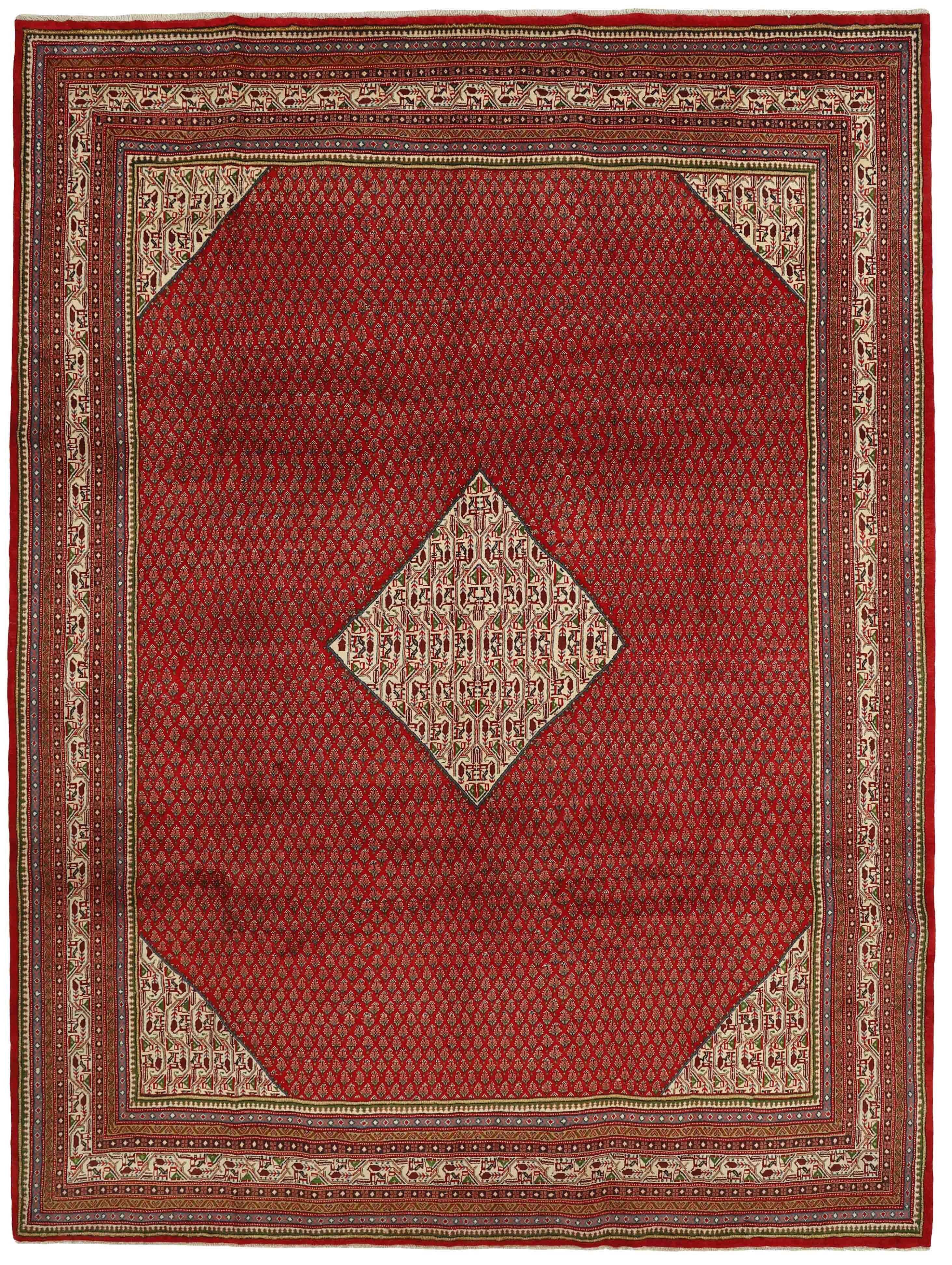 Mir BotehItem no.: 1471376 Size: 288 cm x 386 cmPersian Mir Boteh are hand knotted rugs, produced primarily in the Sarough area of Iran. They are easily recognisable by their special pattern, consisting of smaller mir-e Butha. The pattern has a characteristic pear-like shape, and the pattern is regarded by many as being a flame that symbolises warmth and life. The flame motif is often seen in the ground pattern of Persian rugs.
