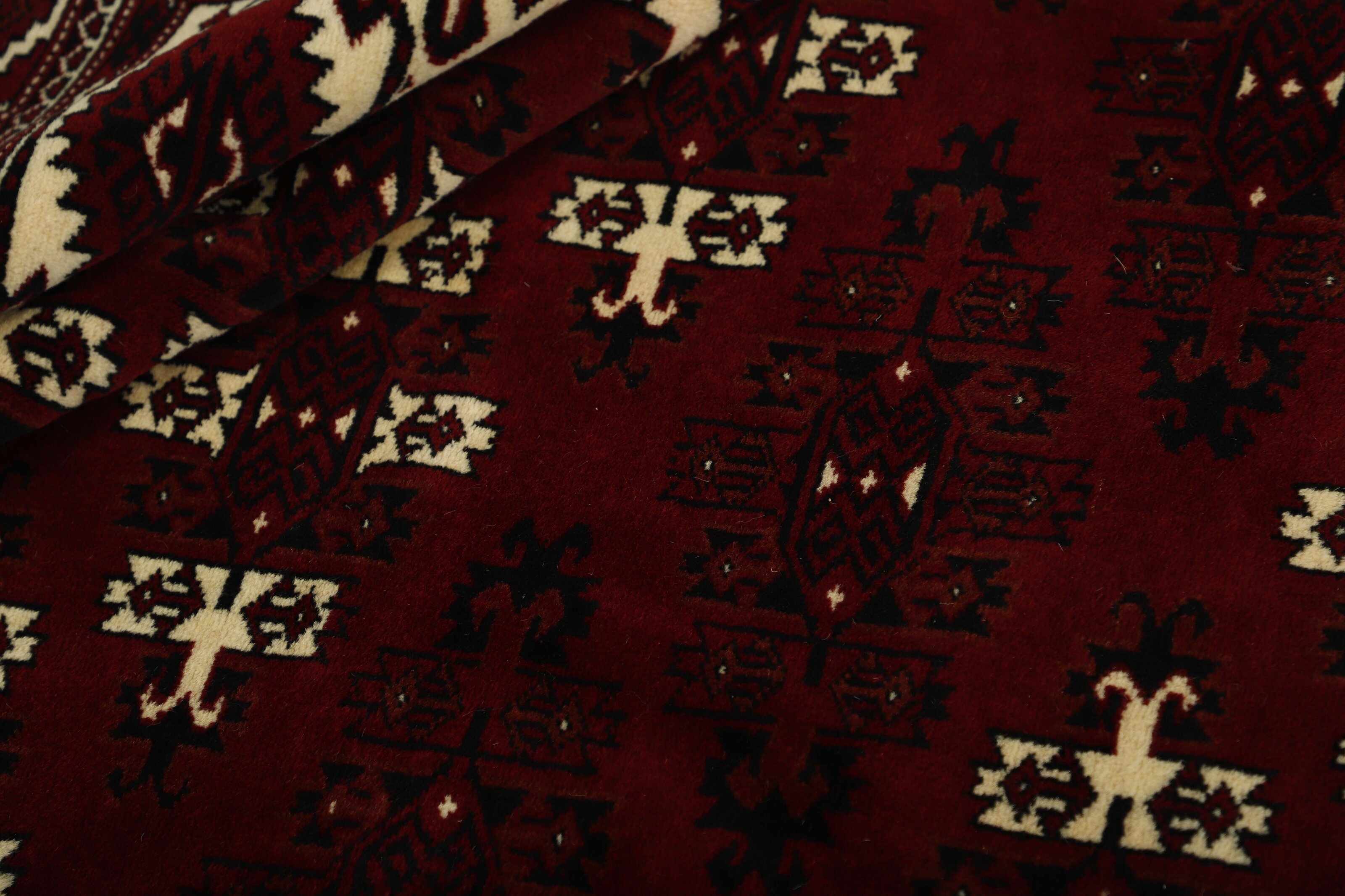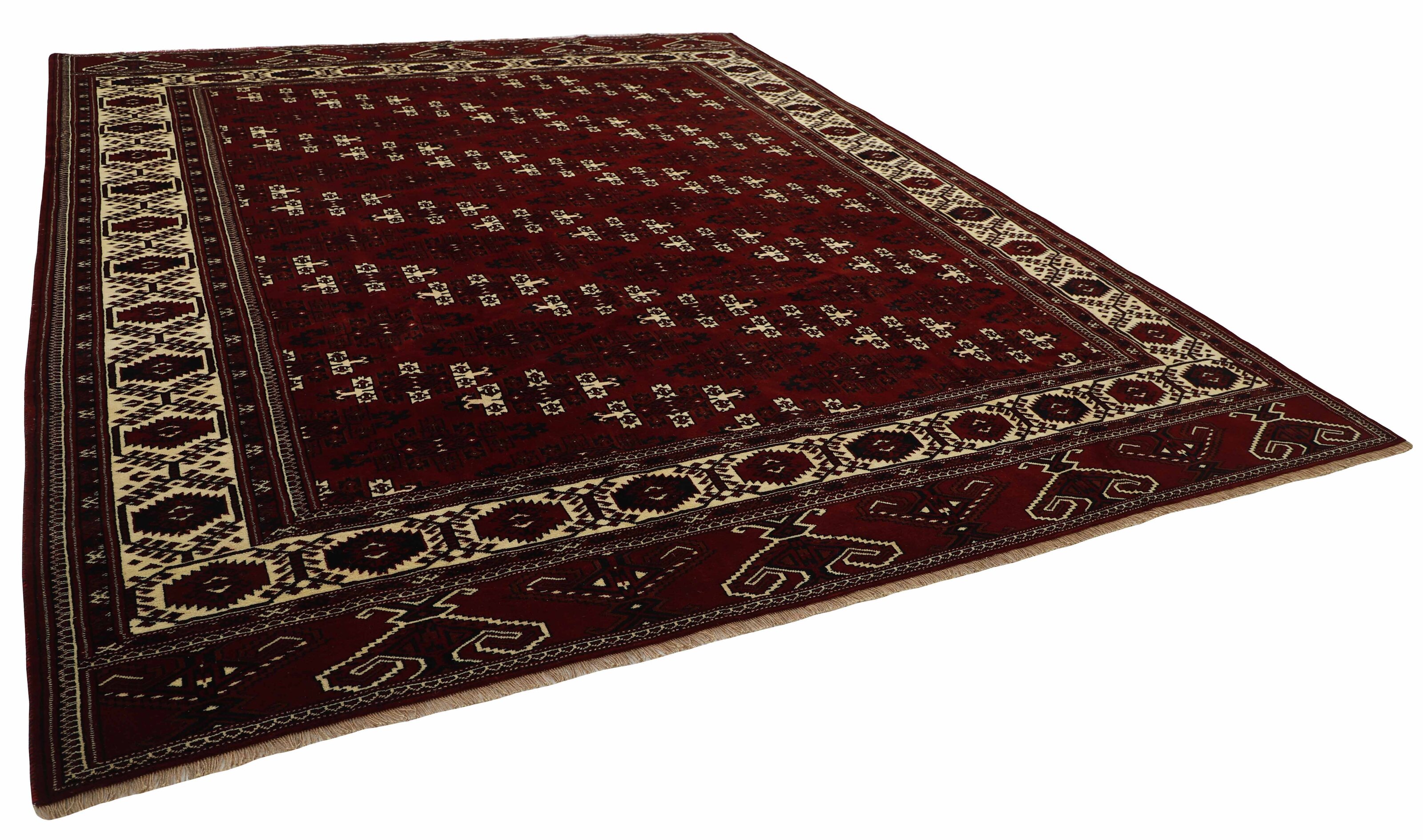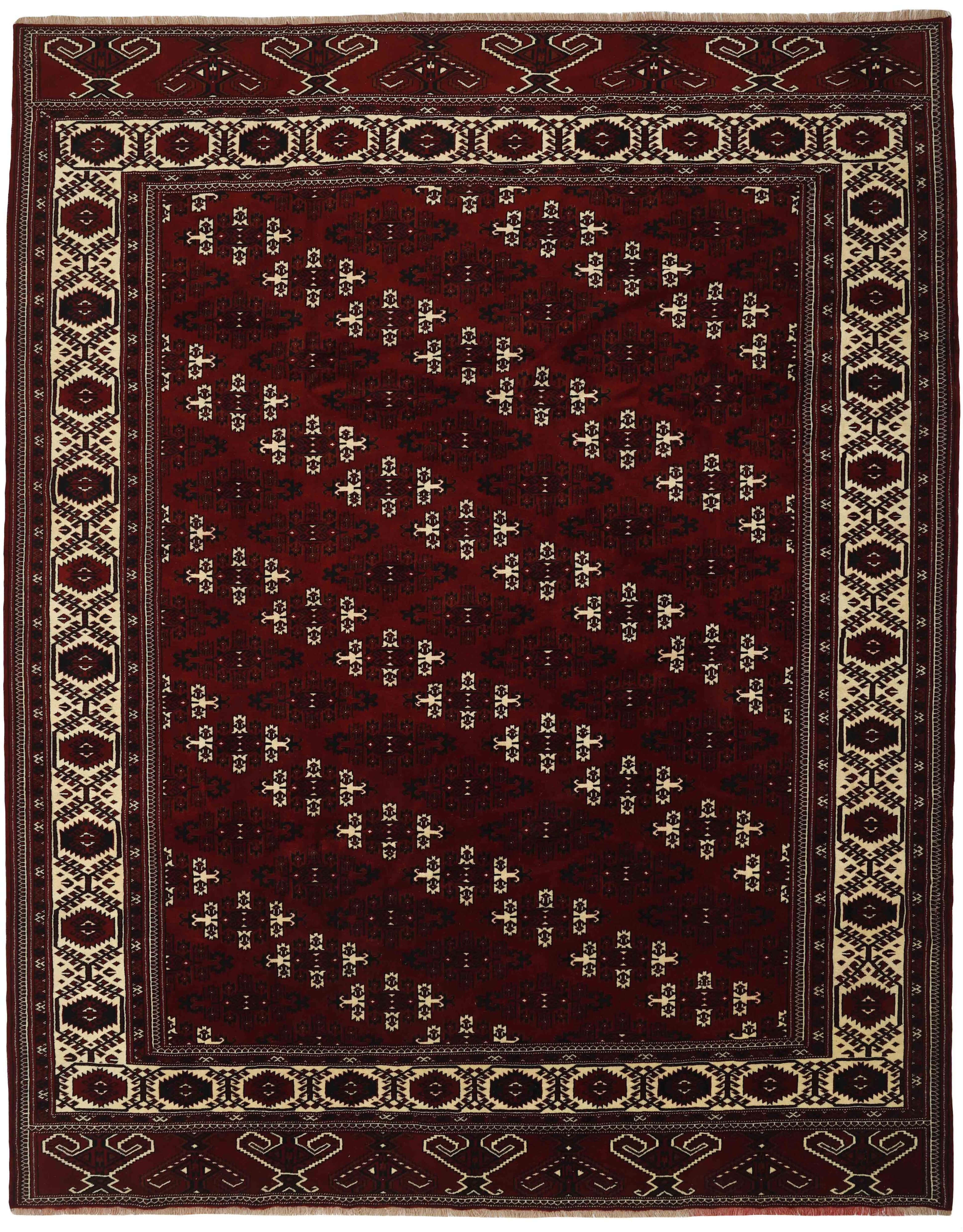 The Turkmen are a very significant tribe, mostly inhabiting Afghanistan and the former Soviet Republic of Turkmenistan. The Iranian population is limited to an area around Gonbad-e- Kavus (500.000 inhabitants) in the Mazandran Province. The Iranian Turkmens belong to three tribes; the Yomut, the Tekke, and the Atabat. The first two are most famous for their rugs. They were originally nomadic tribes, but most Iranian Turkmens are now settled, although they often have a traditional round tent in a square near their modern brick houses. Turkmen rugs are traditionally made of wool and have a limited range of colours; red, black, and ivory, sometimes mixed with other colours and silk. The typical patterns are geometrical flowers (güls), and octagonal patterns with variations according to tribe. According to tradition, the rugs are made in several sizes, depending on where in the tent they are to be used; as door curtains, bag covers, etc. Very large rugs are sometimes made to order for tribal chiefs.