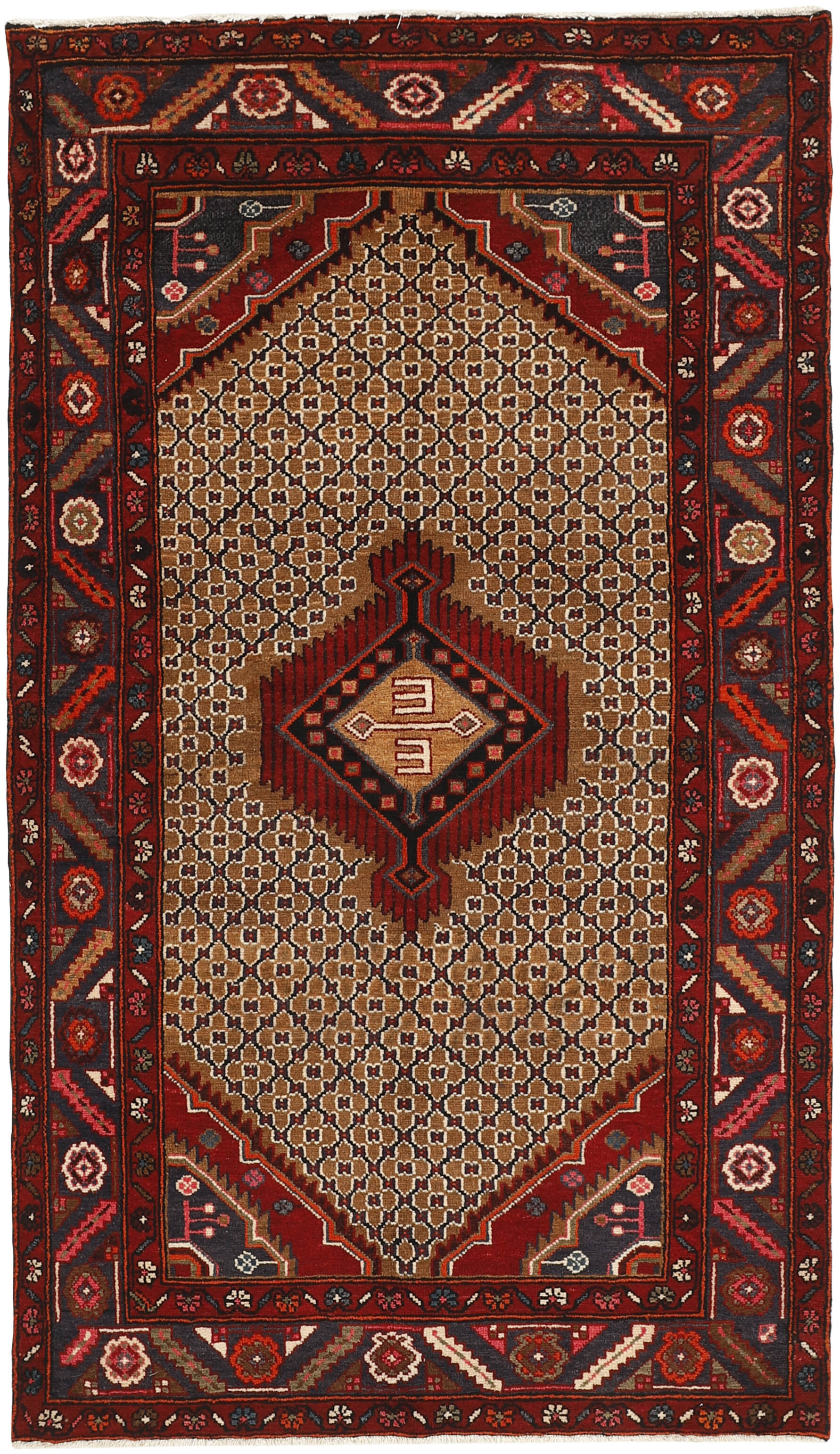 KoliaieItem no.: 1487953 Size: 138 cm x 238 cmThis rug is from the district of Hamadan which is an important centre for the rug trade, as well as the most productive rug production area of Iran. Hamadan is a major city with hundreds of thousands of people. Like Ekbatan, it was a main city of the Achemenian kings. It has an indigenous Jewish population and numerous monuments, of which the most important are the tombs of Esther and Mordicai (central to Jewish pilgrims), and the tomb at Avicenna. Hamadan is a provincial capitol. Two types of rugs are knotted. One is the so-called “city rug”, also known as the Shahrbaff. The production is modern and largely state controlled. The village production, however, is much more important; Hamadan is a market city for many rug producing villages that each has its own pattern. Most prominent are Borchalu, Tuserkman, Memraban, Khamseh, Begardeh, Enjilas, Hosseinabad, and Zandjan. There is a wide range of patterns but the quality is very consistent. The colours are strong, and often plant colours. The patterns are daring, although random, and Hosseinabad and Enjilas in particular are known for through going patterns. The rugs are usually not much bigger than 3 by 2 metres.