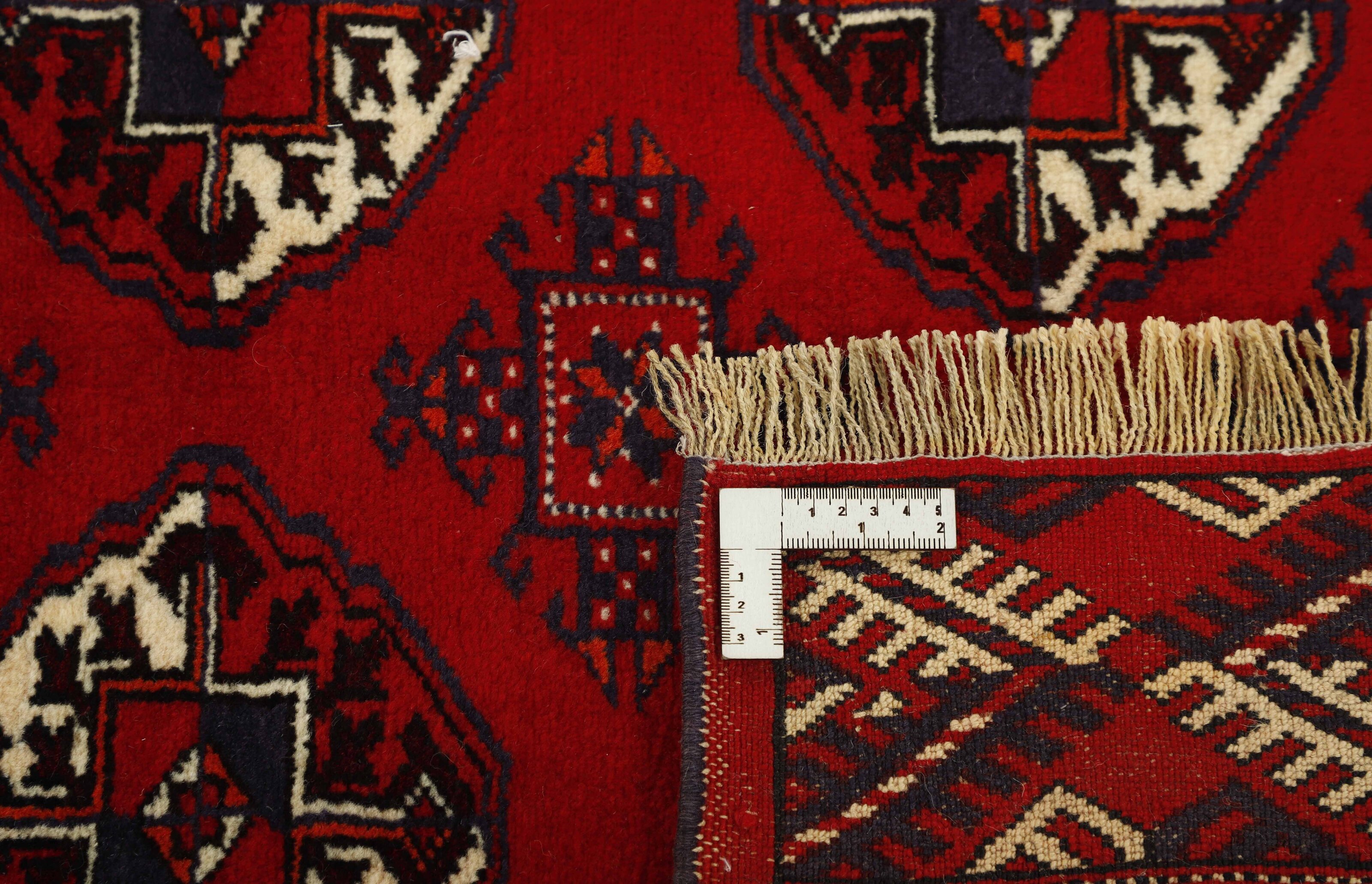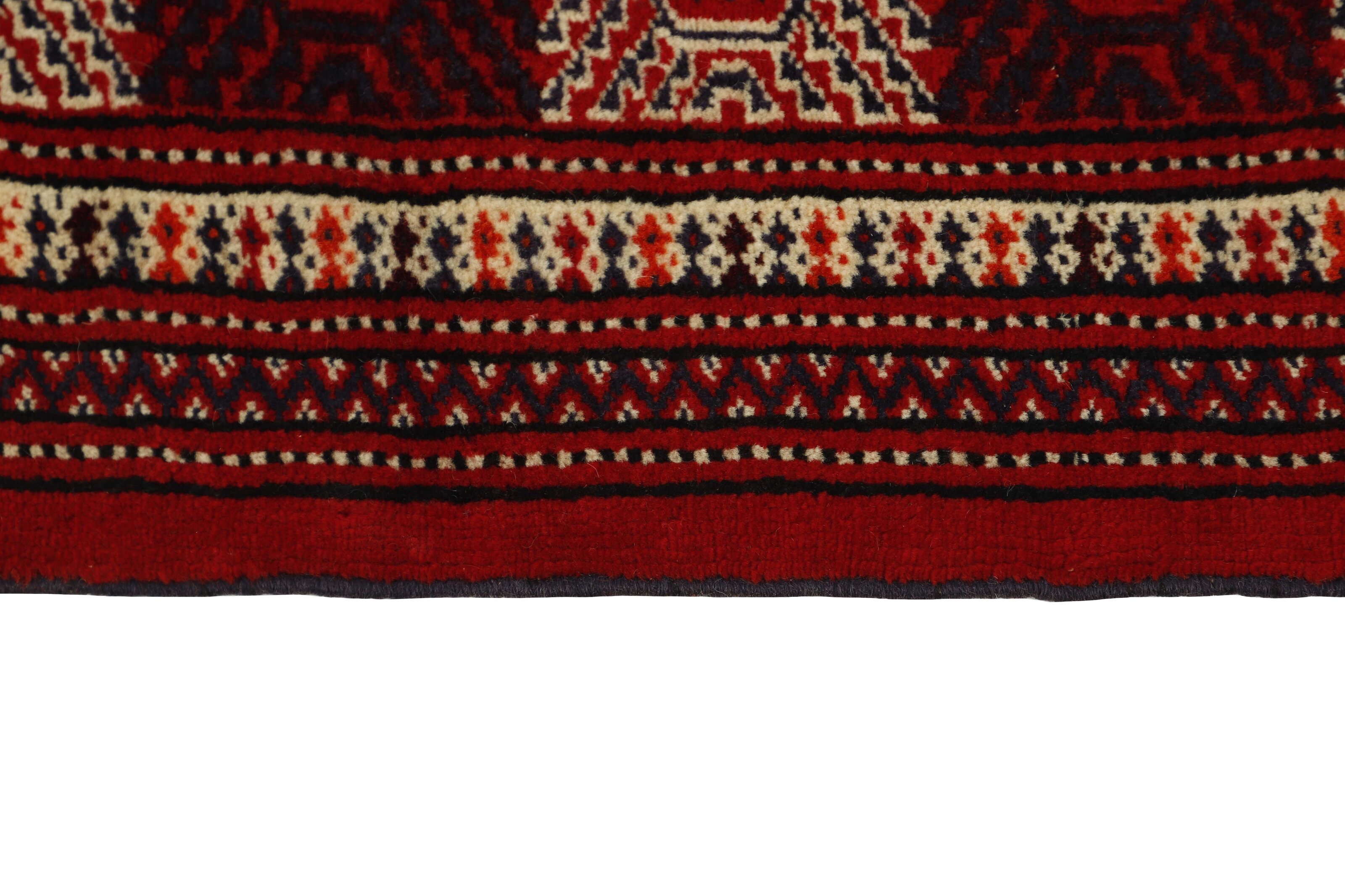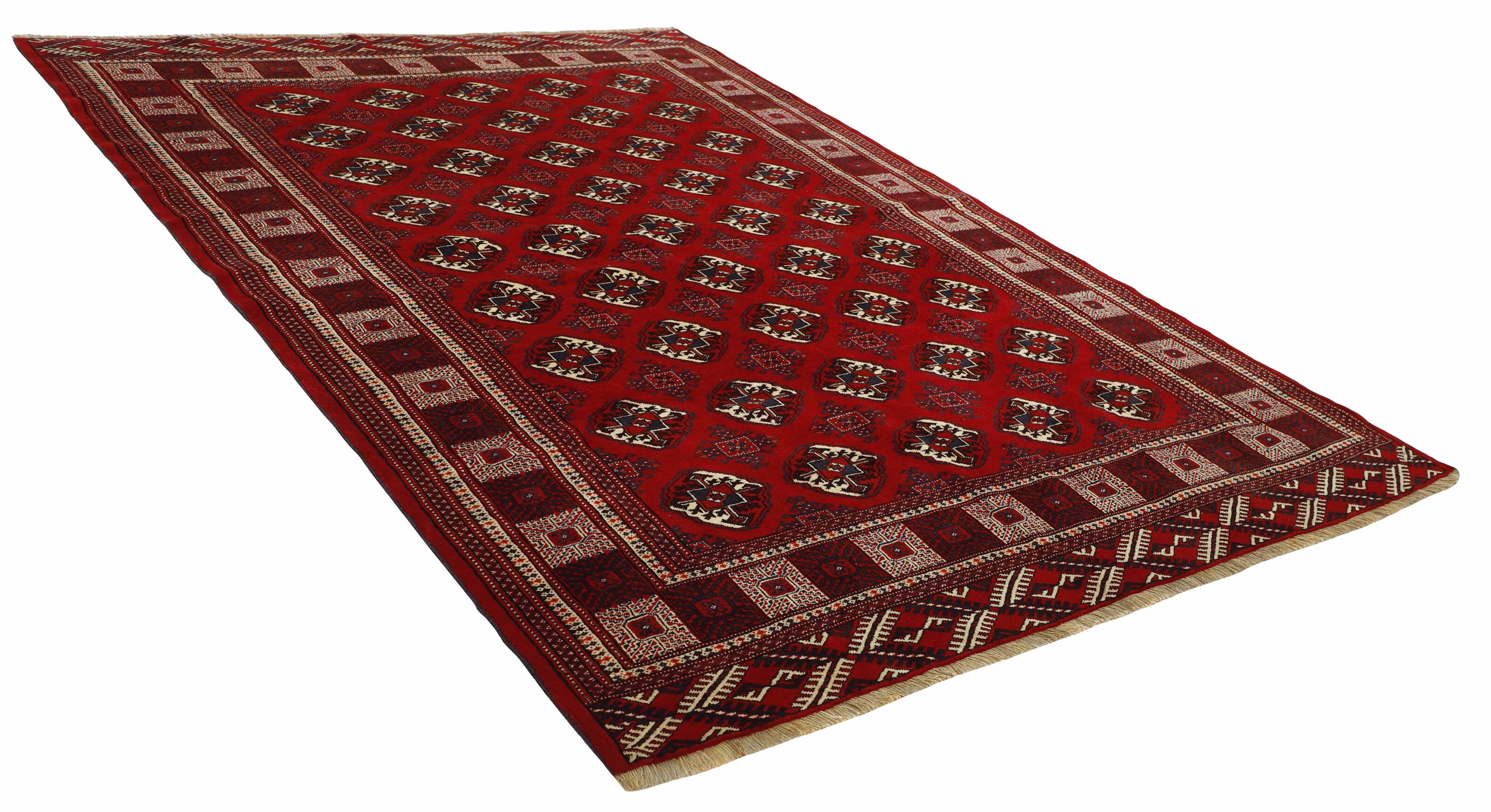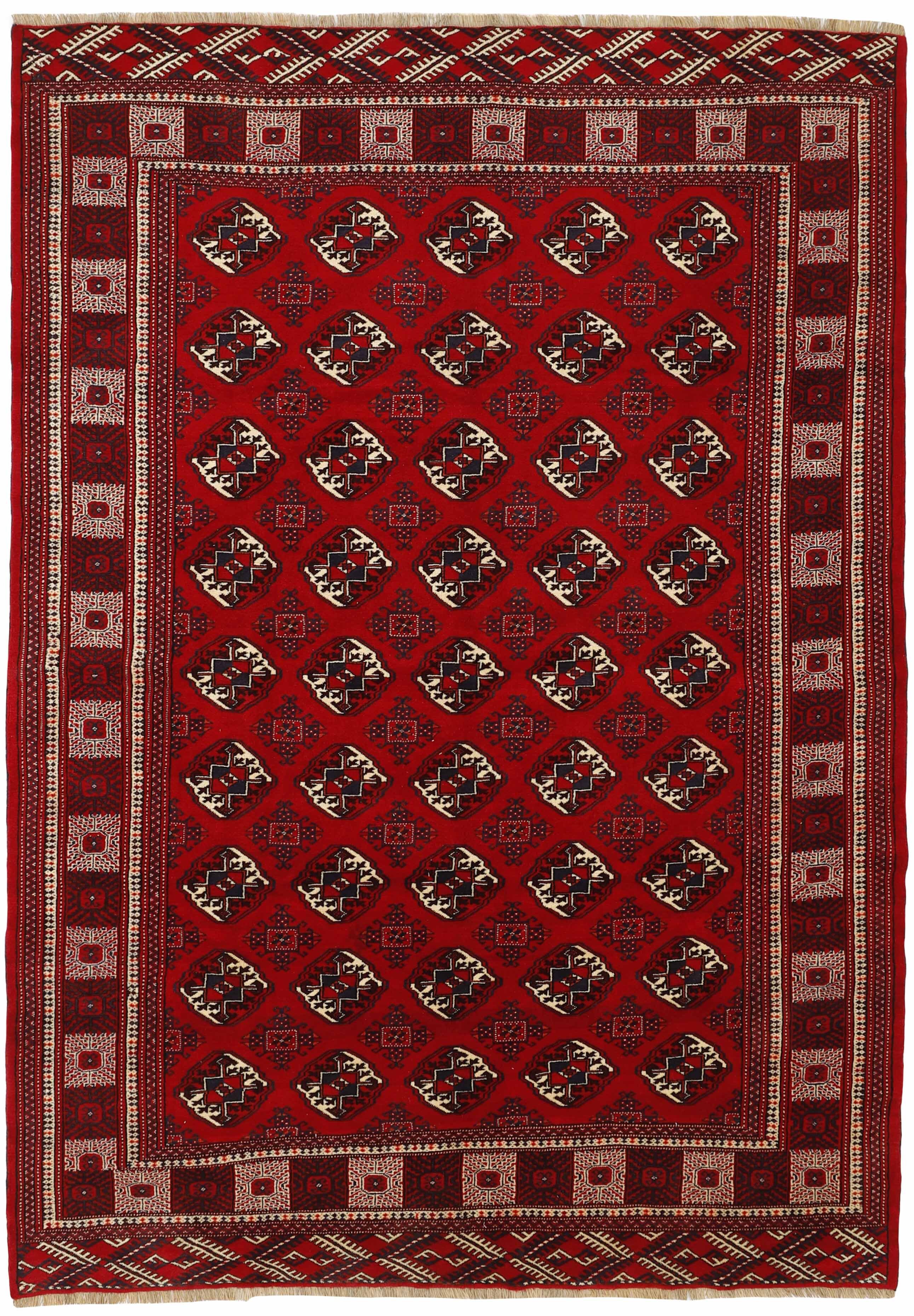 The Turkmen are a very significant tribe, mostly inhabiting Afghanistan and the former Soviet Republic of Turkmenistan. The Iranian population is limited to an area around Gonbad-e- Kavus (500.000 inhabitants) in the Mazandran Province. The Iranian Turkmens belong to three tribes; the Yomut, the Tekke, and the Atabat. The first two are most famous for their rugs. They were originally nomadic tribes, but most Iranian Turkmens are now settled, although they often have a traditional round tent in a square near their modern brick houses. Turkmen rugs are traditionally made of wool and have a limited range of colours; red, black, and ivory, sometimes mixed with other colours and silk. The typical patterns are geometrical flowers (güls), and octagonal patterns with variations according to tribe. According to tradition, the rugs are made in several sizes, depending on where in the tent they are to be used; as door curtains, bag covers, etc. Very large rugs are sometimes made to order for tribal chiefs.