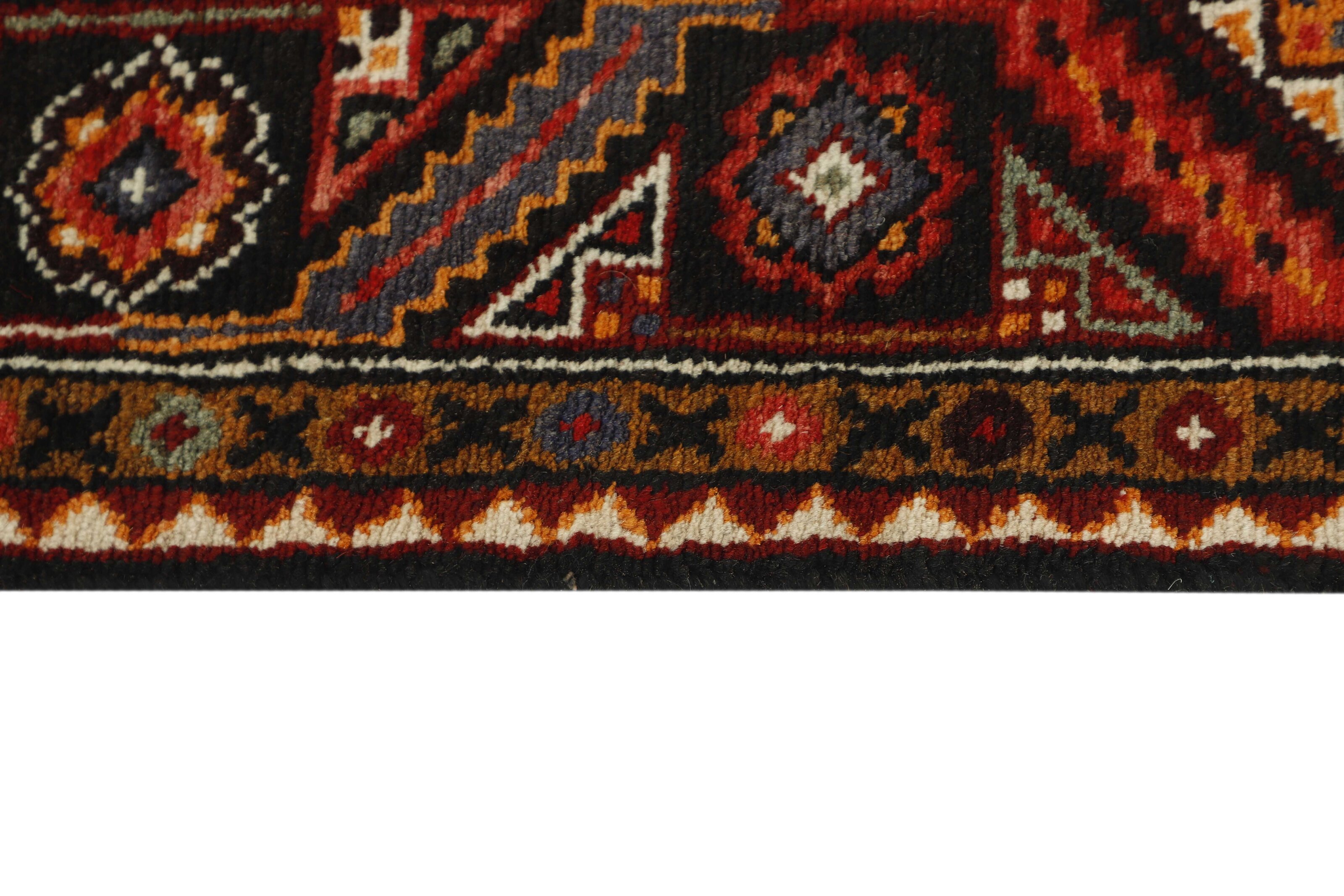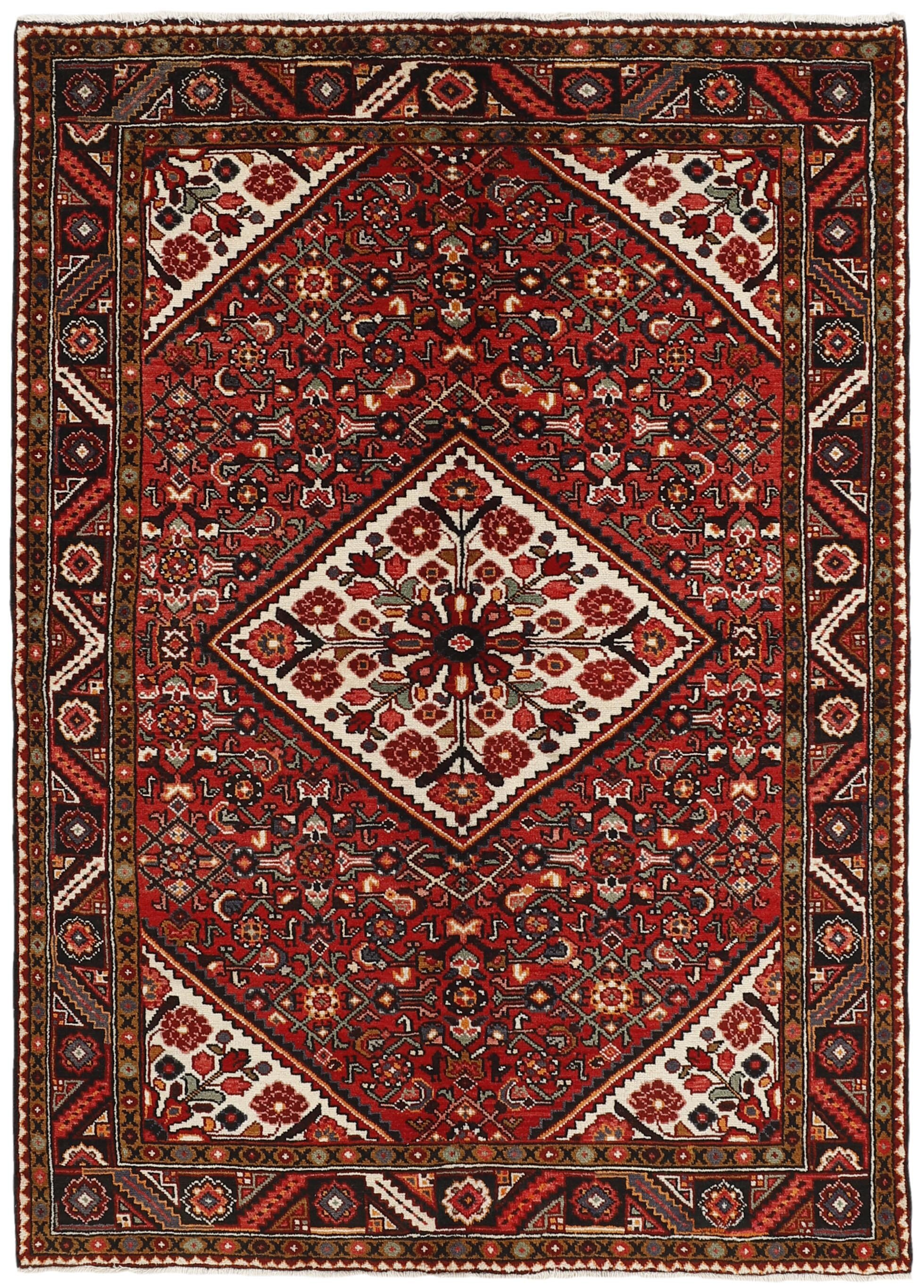The city and the district of Hamadan is an important centre for the rug trade, as well as the most productive rug production area of Iran. Hamadan is a major city with hundreds of thousands of people. Like Ekbatan, it was a main city of the Achemenian kings. It has an indigenous Jewish population and numerous monuments, of which the most important are the tombs of Esther and Mordicai (central to Jewish pilgrims), and the tomb at Avicenna. Hamadan is a provincial capitol. Two types of rugs are knotted. One is the so-called “city rug”, also known as the Shahrbaff. The production is modern and largely state controlled. The village production, however, is much more important; Hamadan is a market city for many rug producing villages that each has its own pattern. Most prominent are Borchalu, Tuserkman, Memraban, Khamseh, Begardeh, Enjilas, Hosseinabad, and Zandjan. There is a wide range of patterns but the quality is very consistent. The colours are strong, and often plant colours. The patterns are daring, although random, and Hosseinabad and Enjilas in particular are known for through going patterns. The rugs are usually not much bigger than 3 by 2 metres.