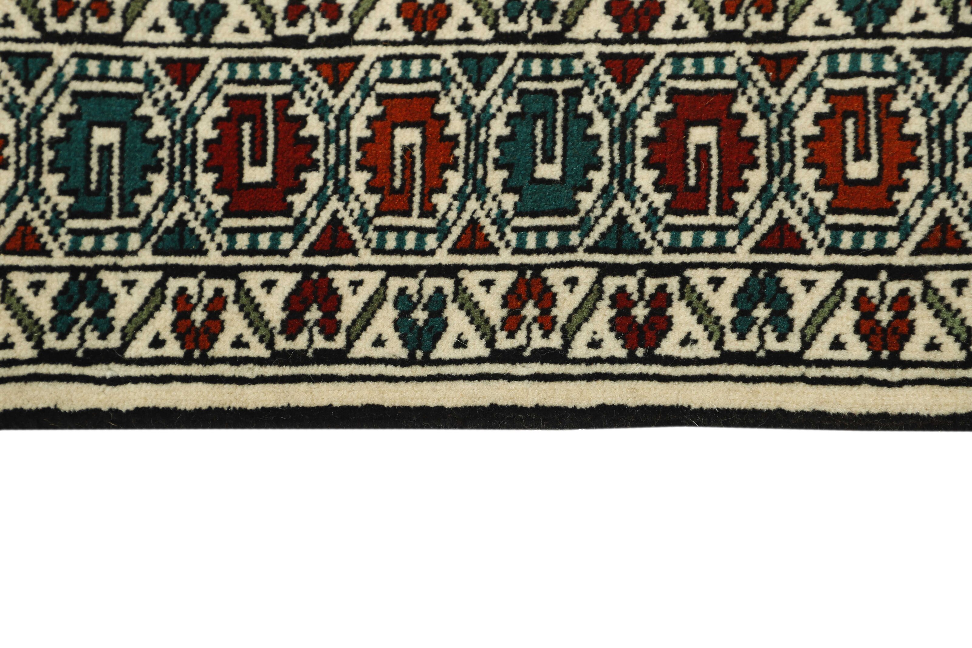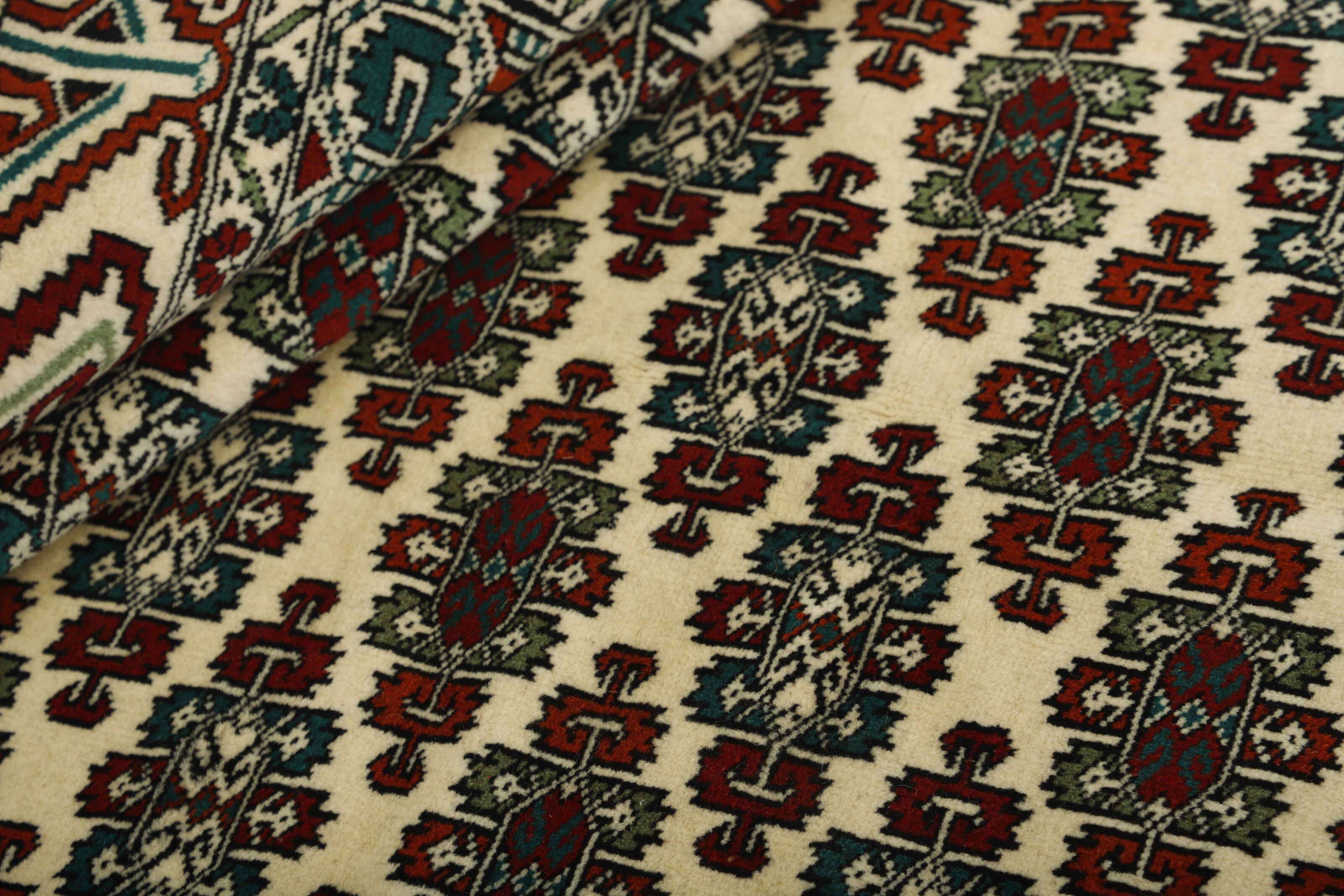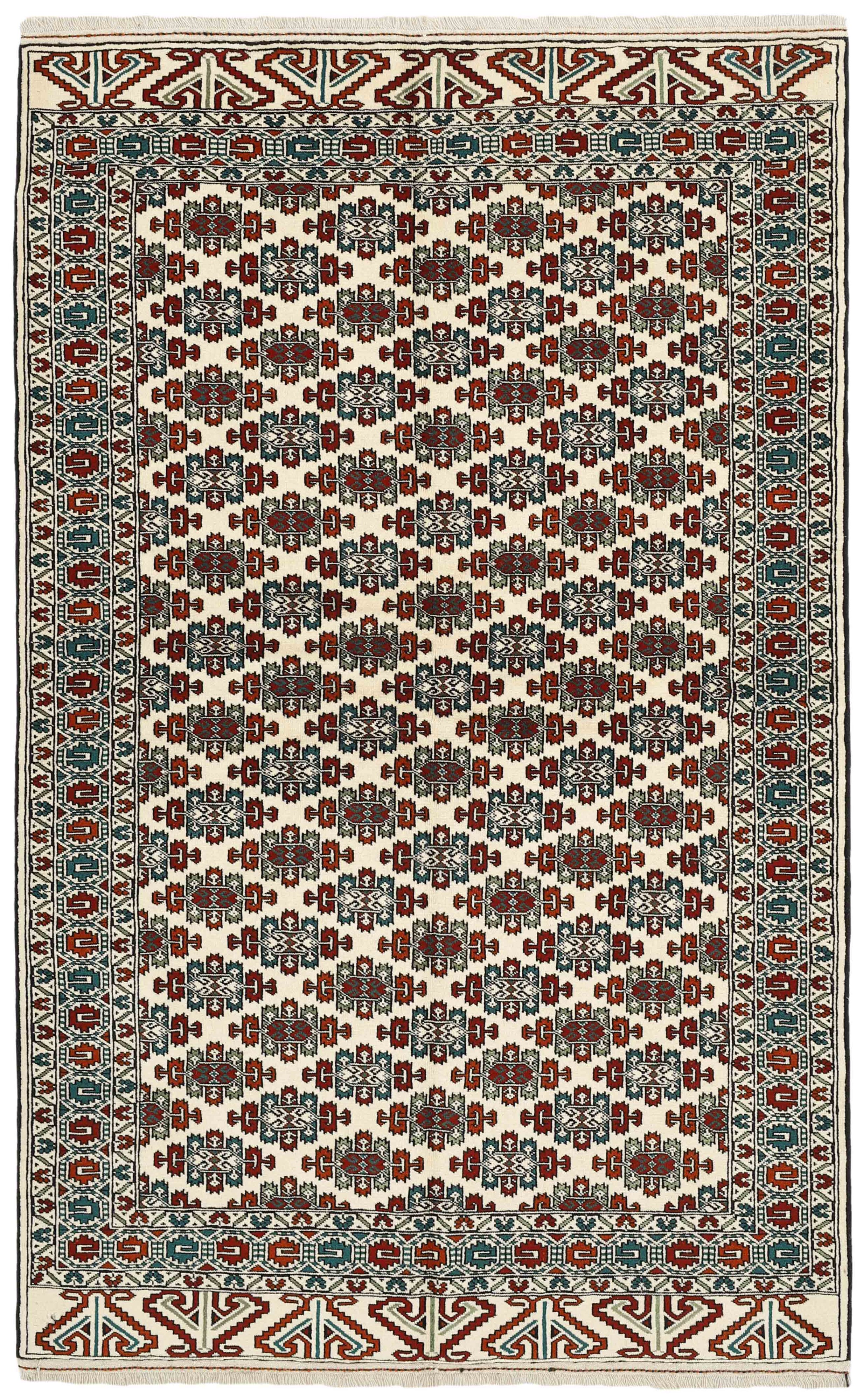 The Turkmen are a very significant tribe, mostly inhabiting Afghanistan and the former Soviet Republic of Turkmenistan. The Iranian population is limited to an area around Gonbad-e- Kavus (500.000 inhabitants) in the Mazandran Province. The Iranian Turkmens belong to three tribes; the Yomut, the Tekke, and the Atabat. The first two are most famous for their rugs. They were originally nomadic tribes, but most Iranian Turkmens are now settled, although they often have a traditional round tent in a square near their modern brick houses. Turkmen rugs are traditionally made of wool and have a limited range of colours; red, black, and ivory, sometimes mixed with other colours and silk. The typical patterns are geometrical flowers (güls), and octagonal patterns with variations according to tribe. According to tradition, the rugs are made in several sizes, depending on where in the tent they are to be used; as door curtains, bag covers, etc. Very large rugs are sometimes made to order for tribal chiefs.