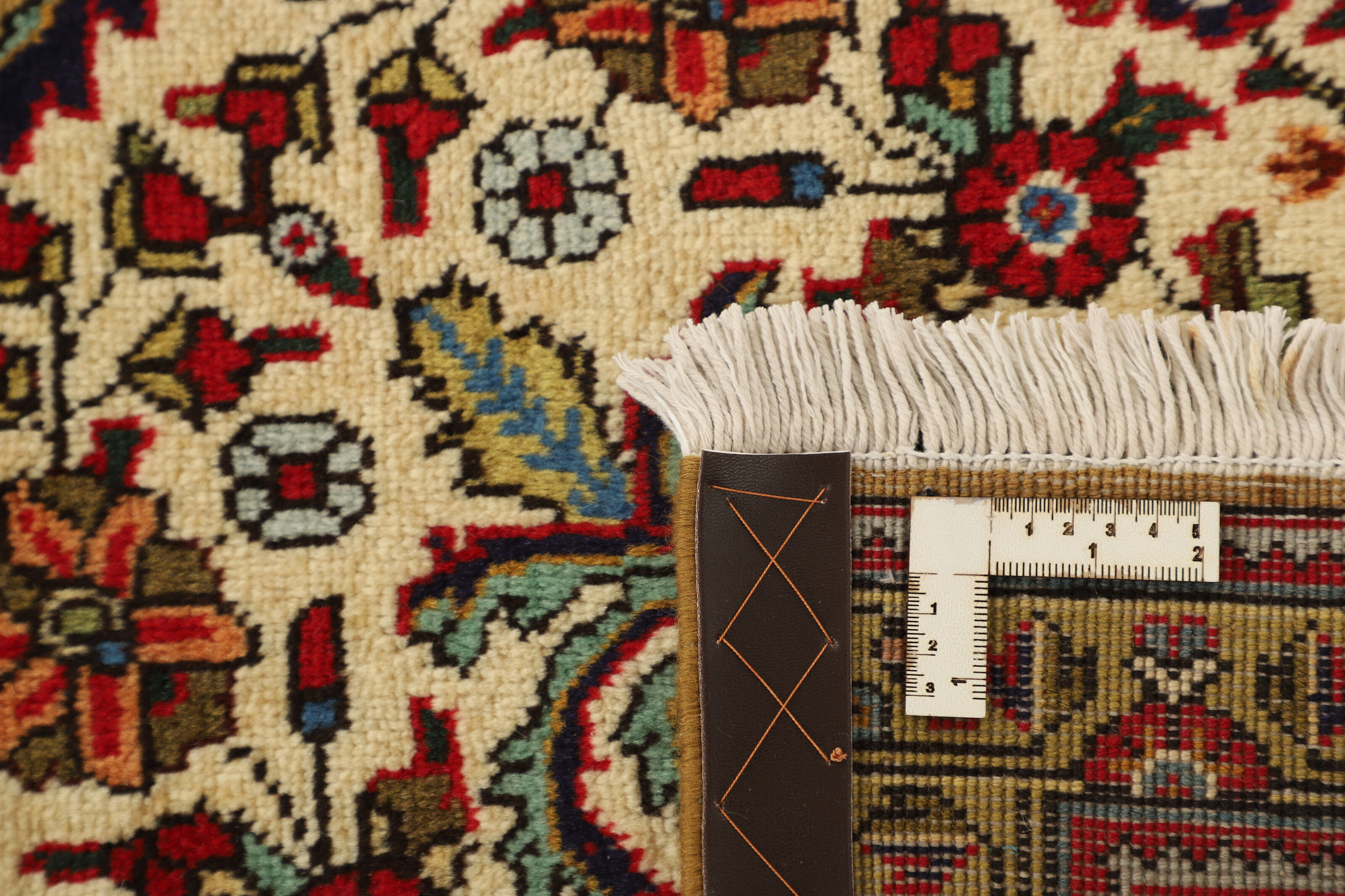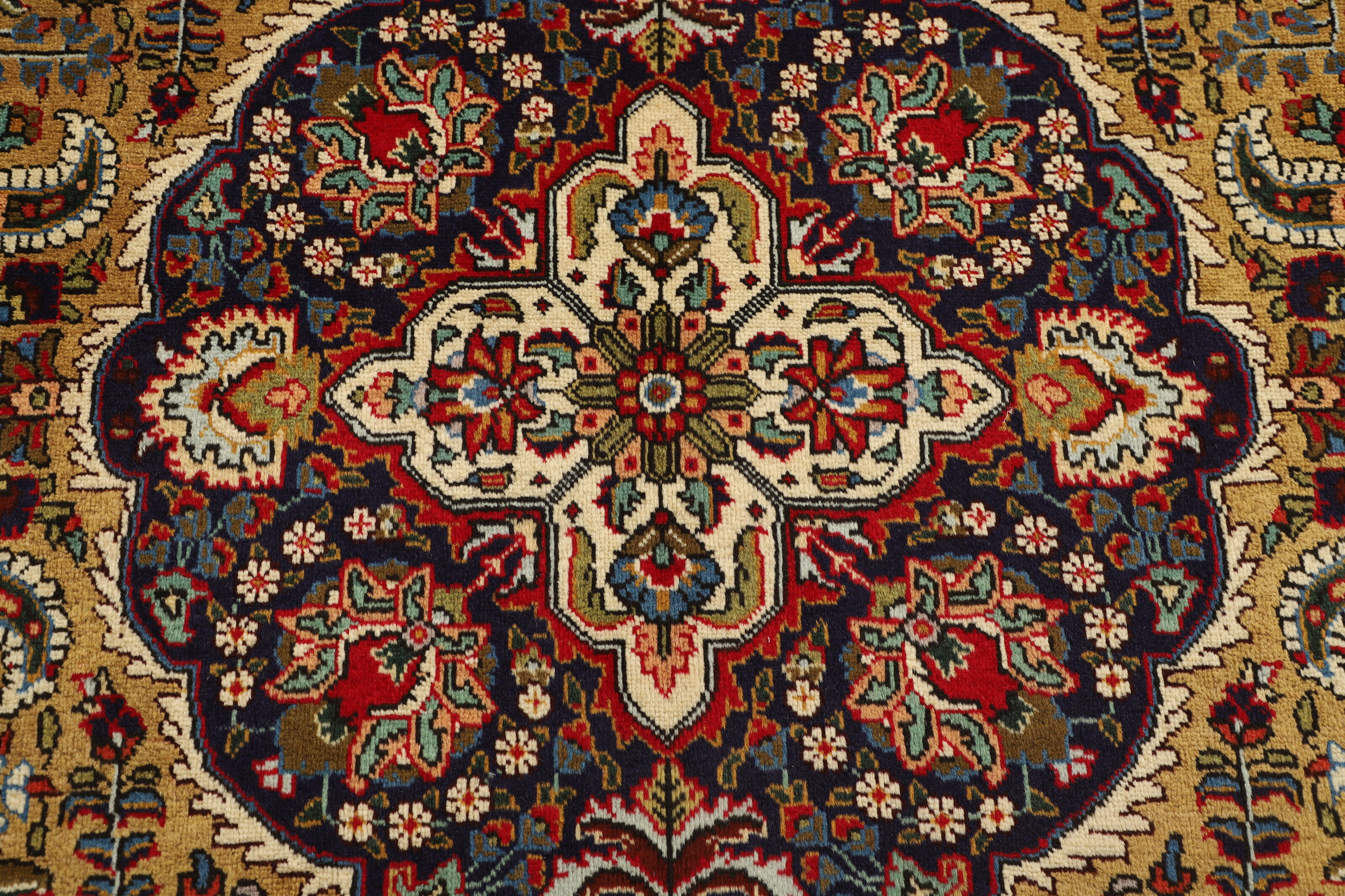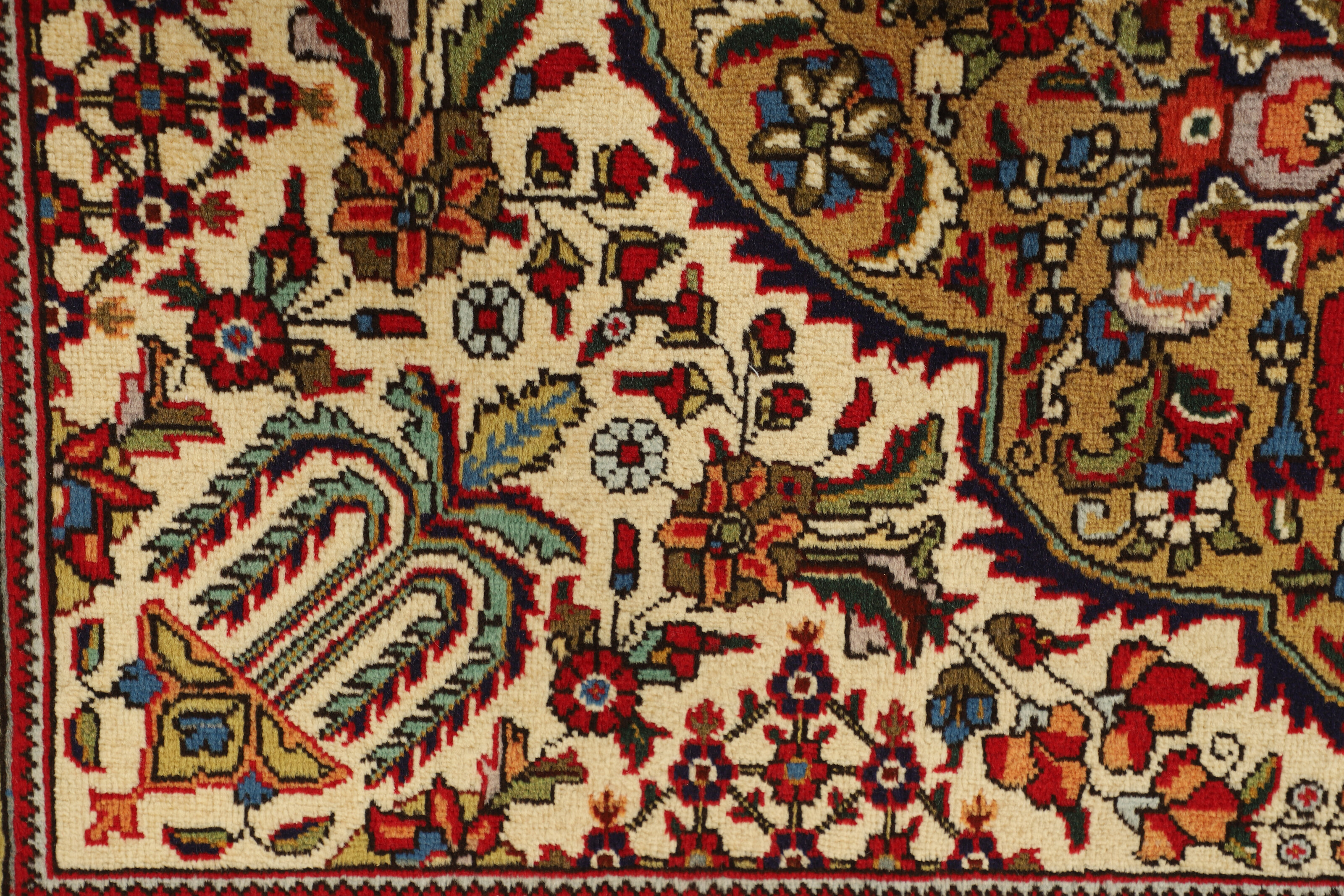 TabrizItem no.: 1519861 Size: 251 cm x 356 cmTabriz is one of the most important cities in Iran. It has a population of 1,5 million people, and is the capitol of the East Azerbaijan province. As one of Persia’s biggest rug producing regions, Tabriz rugs are exported in all qualities, from the more simple to the most luxurious. The best qualities are divided into two main categories; the Tabriz Mahi, also known as “Tabriz fish pattern” (the rug’s leaf-shaped pattern is called Mahi, meaning “fish”), and the Tabriz Nagsheh, which means pattern. In this context, it refers to the figurative patterns and symbols from Keshan and Isfahan, which inspire the Tabriz Nagsheh rug. The knotters are incredibly skilled, and they have invented a special type of hook, which they can use instead of their fingers for knotting the knots. Warp and weft are cotton, and the pile is wool, often with silk woven into it in the finer qualities. The colours in the better rugs are fine and refined. The roughest qualities have bright colours and are rarely exported. Tabriz rugs are often given a number, such as Tabriz 50, which is an indication of quality. Tabriz 50 has 500.000 knots per m2. Rugs from Tabriz are regarded as being of a durable, very high quality.
