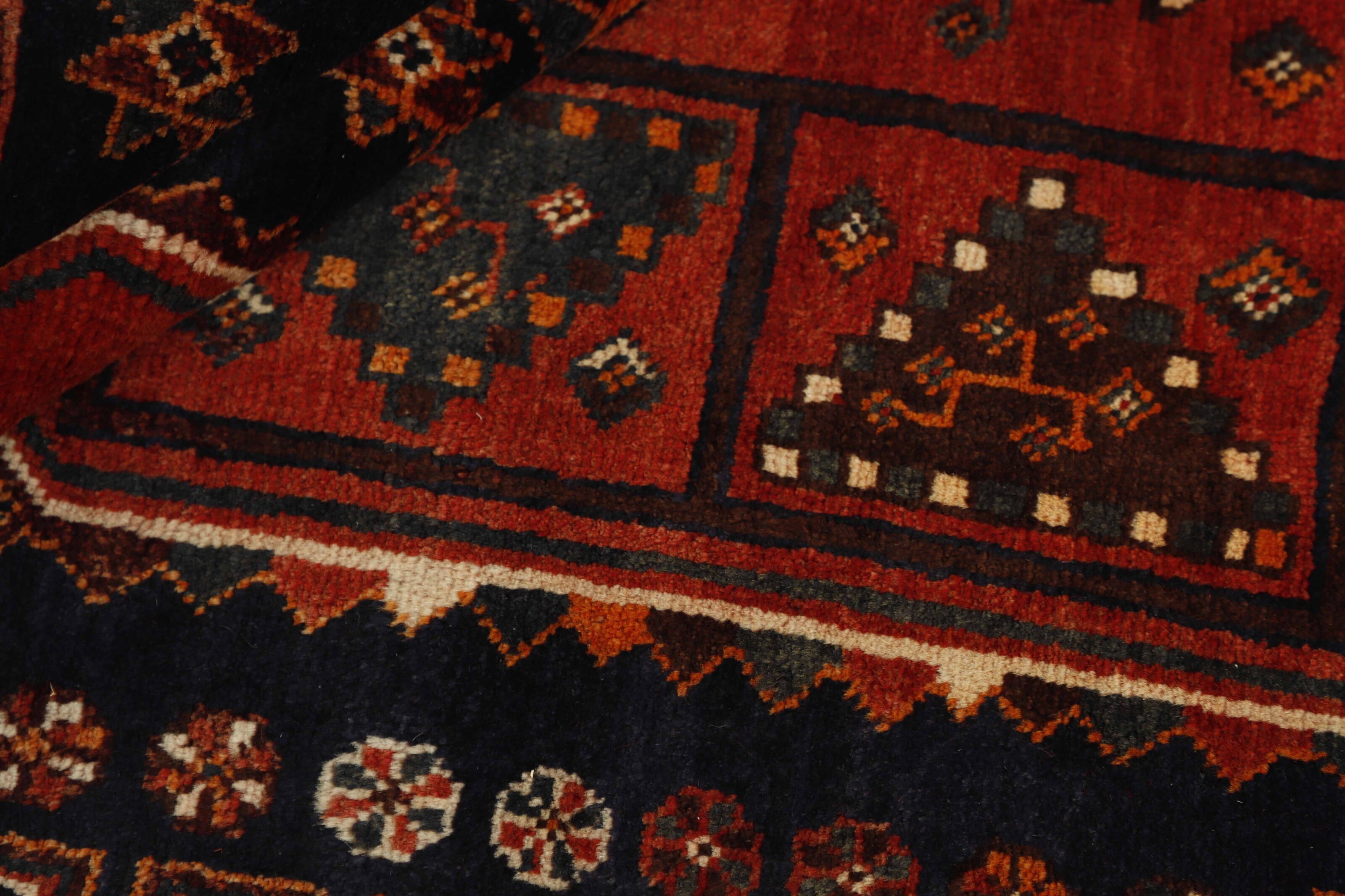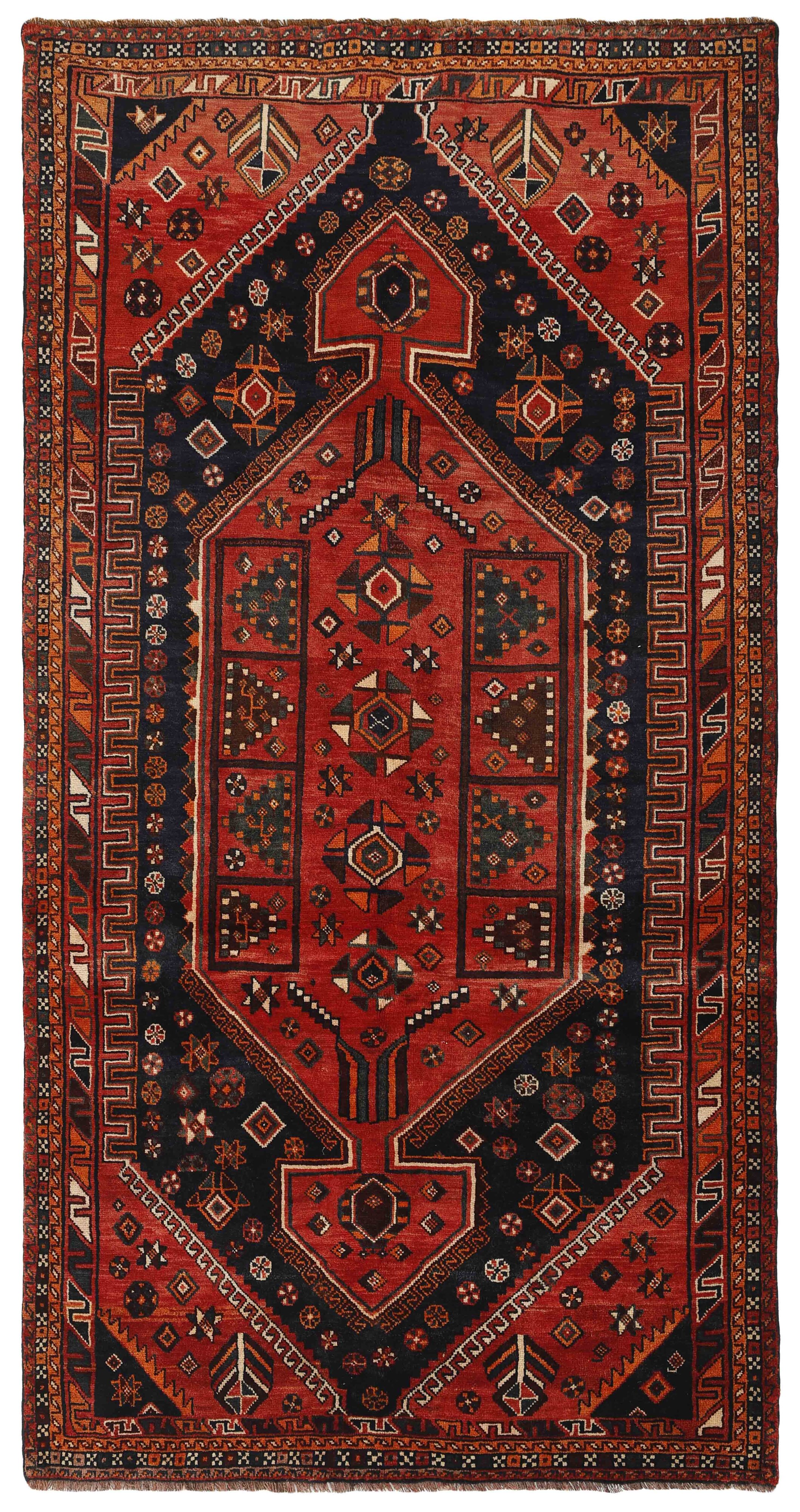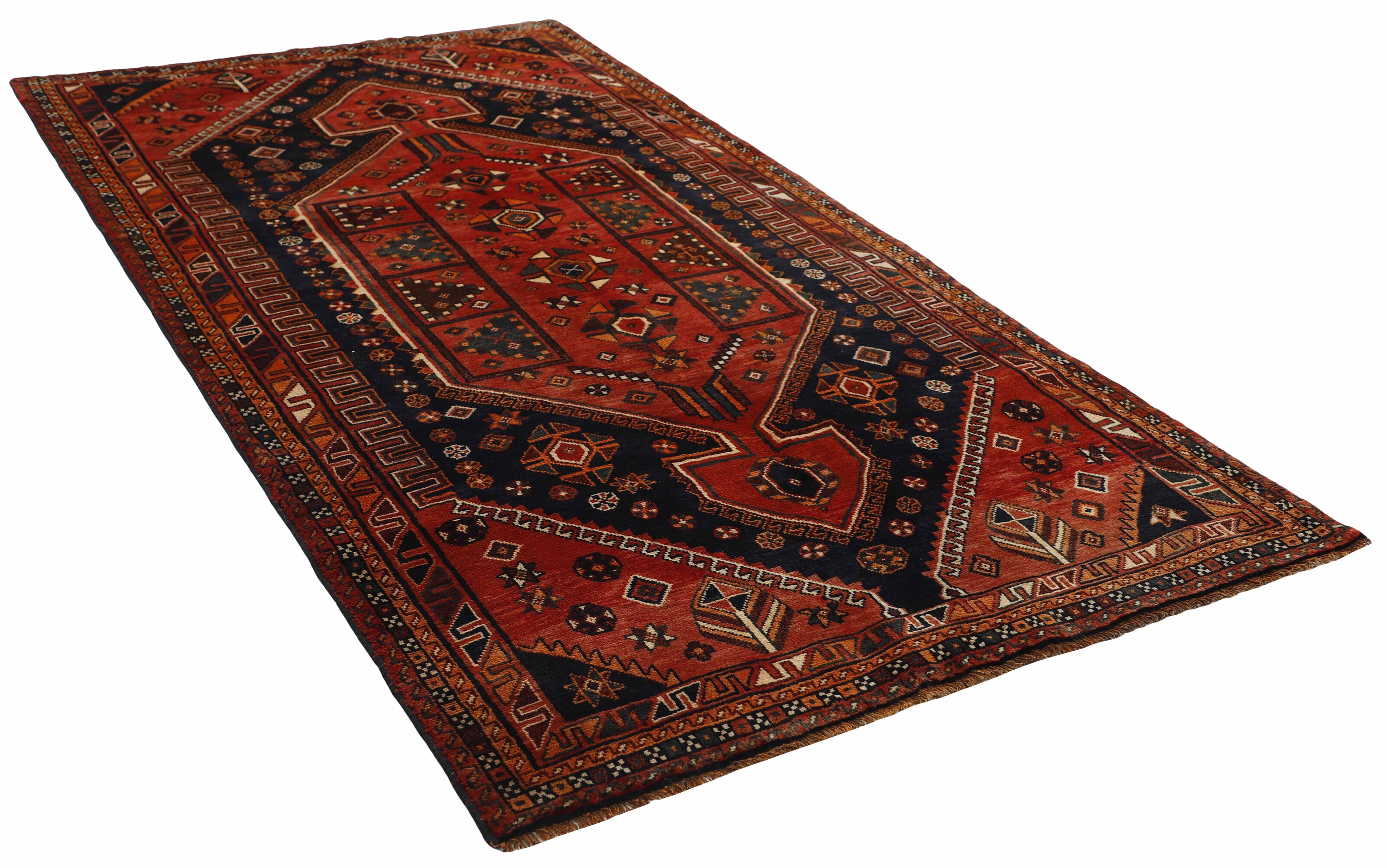 KashghaiItem no.: 1457853 Size: 145 cm x 281 cmThe Kashghai are Iran’s largest and most well known tribe. They speak a Turkish dialect, and are believed to have come from the Caucasus in the 18th century to their current areas, around Shiraz in the Fars Province of southern Iran. Their belligerent attitude has lead to conflicts with changing governments, as well as other tribes in the area. Both their rugs and the women’s clothing clearly show their skills and love of colours. Many subtribes exist, the most important ones being the Bilvedi, the Shishbouki, the Darashuri, and the Kashkuli. The Kashghai knot numerous types of rugs, but a characteristic product can be distinguished by its wool construction, the sturdy ridges on the back, its strong, deep colours (especially the red), as well as by the use of traditional motifs such as Harshang or the crab. The patterns are geometrical, typically with three or five medallions along the centre of the rug or in the middle and corners. The entire field is usually covered in small geometrical motifs. Persepolis motifs can often be found in the rugs. The Kashghai are also famous for their older crafts, such as horse blankets, saddlebags, and rope. The products of other tribes, such as the Kamseh and the Lori, are often mistaken for those of the Kashghai.