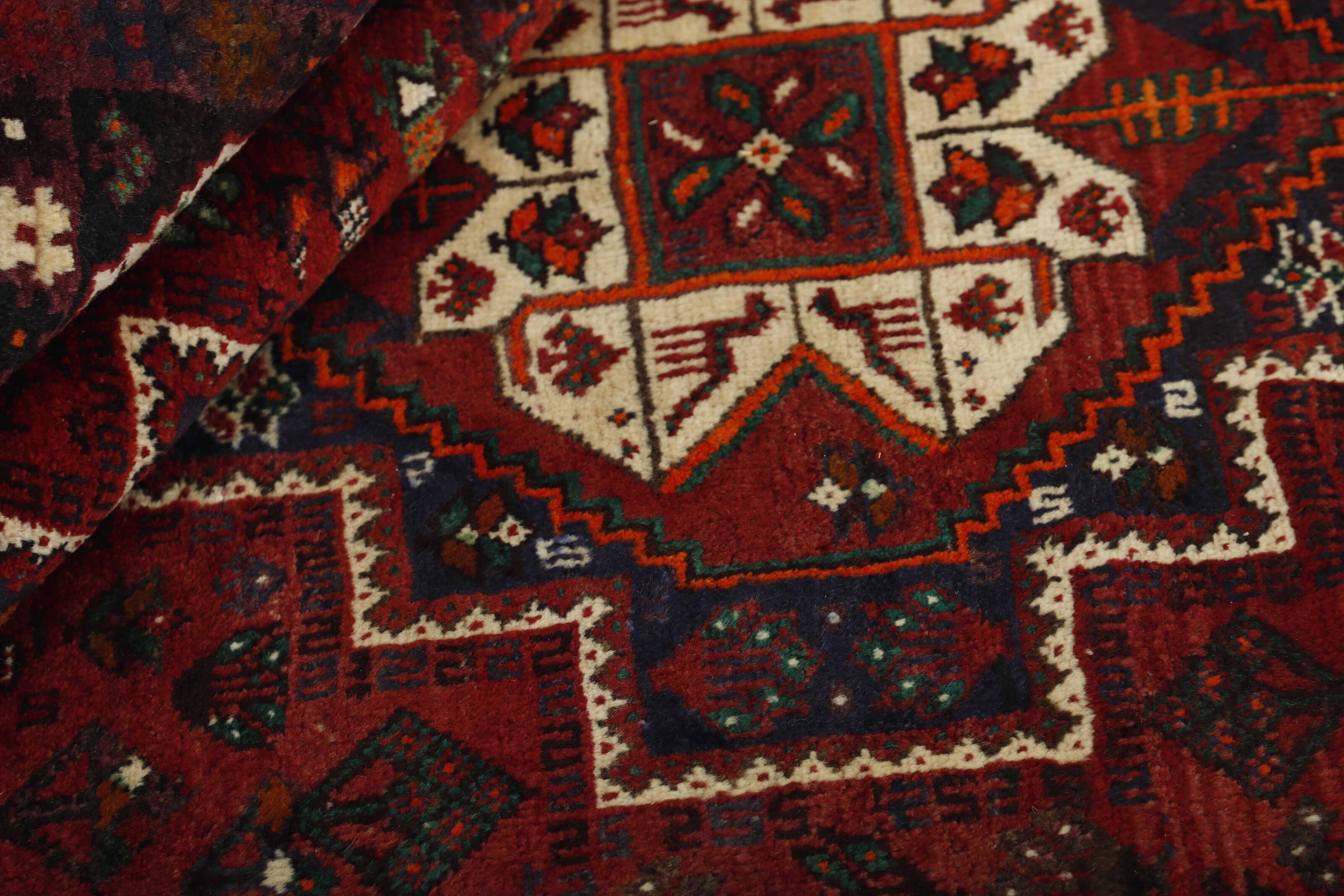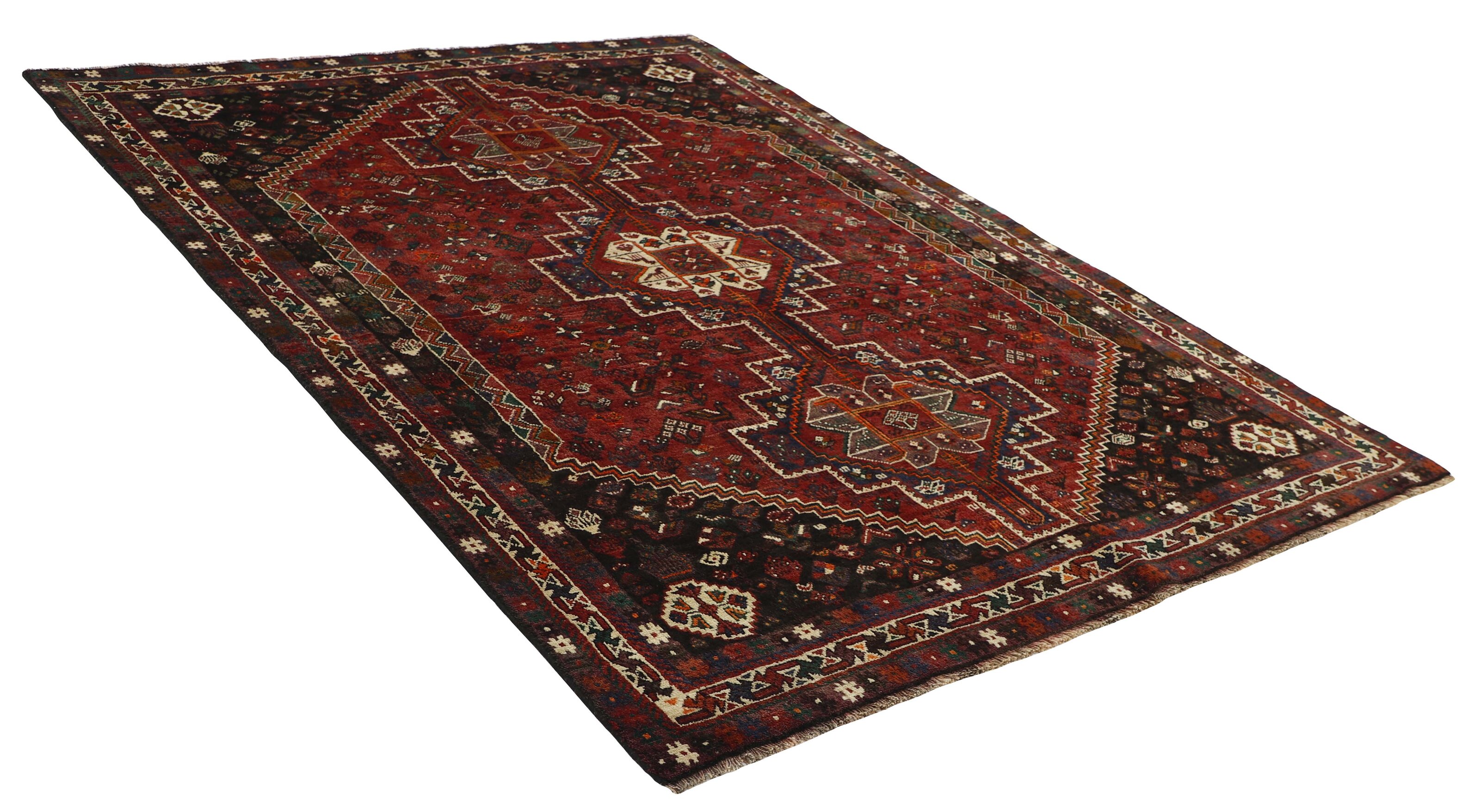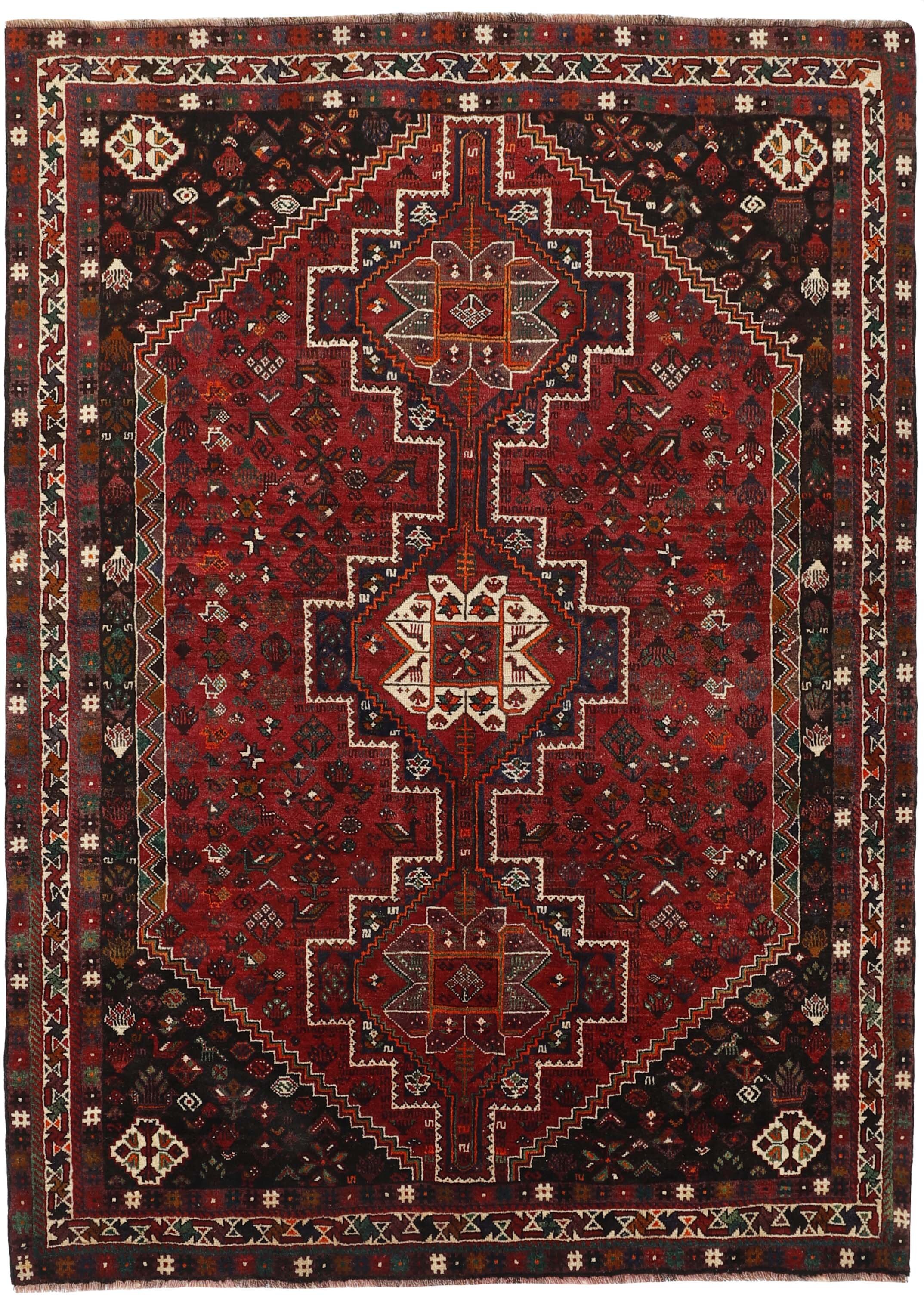 KashghaiItem no.: 1489126 Size: 185 cm x 258 cmThe Kashghai are Iran’s largest and most well known tribe. They speak a Turkish dialect, and are believed to have come from the Caucasus in the 18th century to their current areas, around Shiraz in the Fars Province of southern Iran. Their belligerent attitude has lead to conflicts with changing governments, as well as other tribes in the area. Both their rugs and the women’s clothing clearly show their skills and love of colours. Many subtribes exist, the most important ones being the Bilvedi, the Shishbouki, the Darashuri, and the Kashkuli. The Kashghai knot numerous types of rugs, but a characteristic product can be distinguished by its wool construction, the sturdy ridges on the back, its strong, deep colours (especially the red), as well as by the use of traditional motifs such as Harshang or the crab. The patterns are geometrical, typically with three or five medallions along the centre of the rug or in the middle and corners. The entire field is usually covered in small geometrical motifs. Persepolis motifs can often be found in the rugs. The Kashghai are also famous for their older crafts, such as horse blankets, saddlebags, and rope. The products of other tribes, such as the Kamseh and the Lori, are often mistaken for those of the Kashghai.