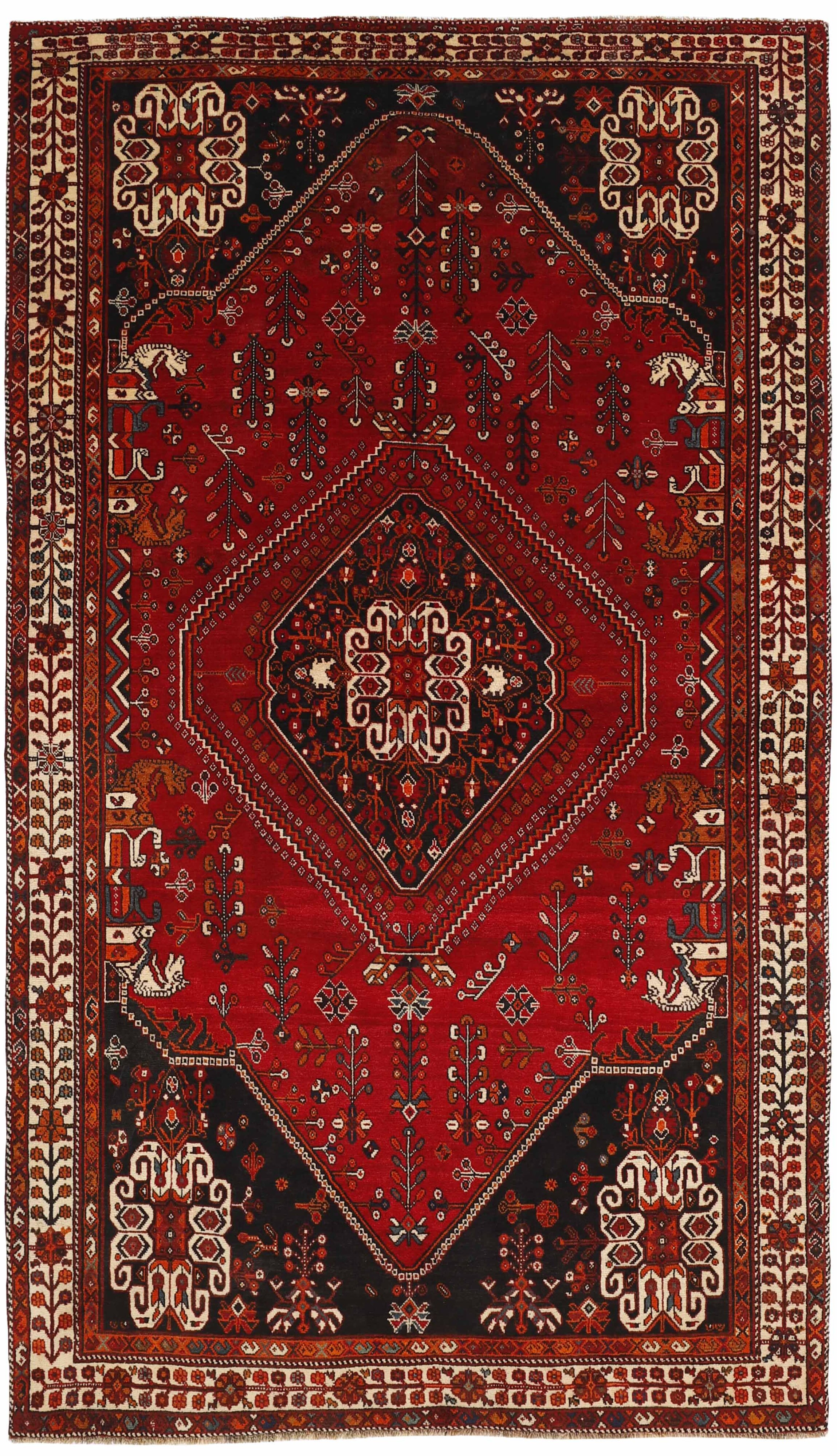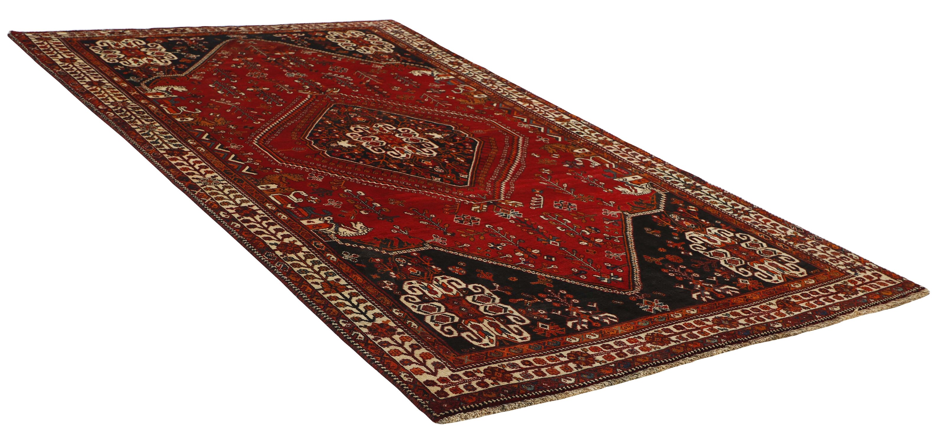 KashghaiItem no.: 1489133 Size: 175 cm x 298 cmThe Kashghai are Iran’s largest and most well known tribe. They speak a Turkish dialect, and are believed to have come from the Caucasus in the 18th century to their current areas, around Shiraz in the Fars Province of southern Iran. Their belligerent attitude has lead to conflicts with changing governments, as well as other tribes in the area. Both their rugs and the women’s clothing clearly show their skills and love of colours. Many subtribes exist, the most important ones being the Bilvedi, the Shishbouki, the Darashuri, and the Kashkuli. The Kashghai knot numerous types of rugs, but a characteristic product can be distinguished by its wool construction, the sturdy ridges on the back, its strong, deep colours (especially the red), as well as by the use of traditional motifs such as Harshang or the crab. The patterns are geometrical, typically with three or five medallions along the centre of the rug or in the middle and corners. The entire field is usually covered in small geometrical motifs. Persepolis motifs can often be found in the rugs. The Kashghai are also famous for their older crafts, such as horse blankets, saddlebags, and rope. The products of other tribes, such as the Kamseh and the Lori, are often mistaken for those of the Kashghai.