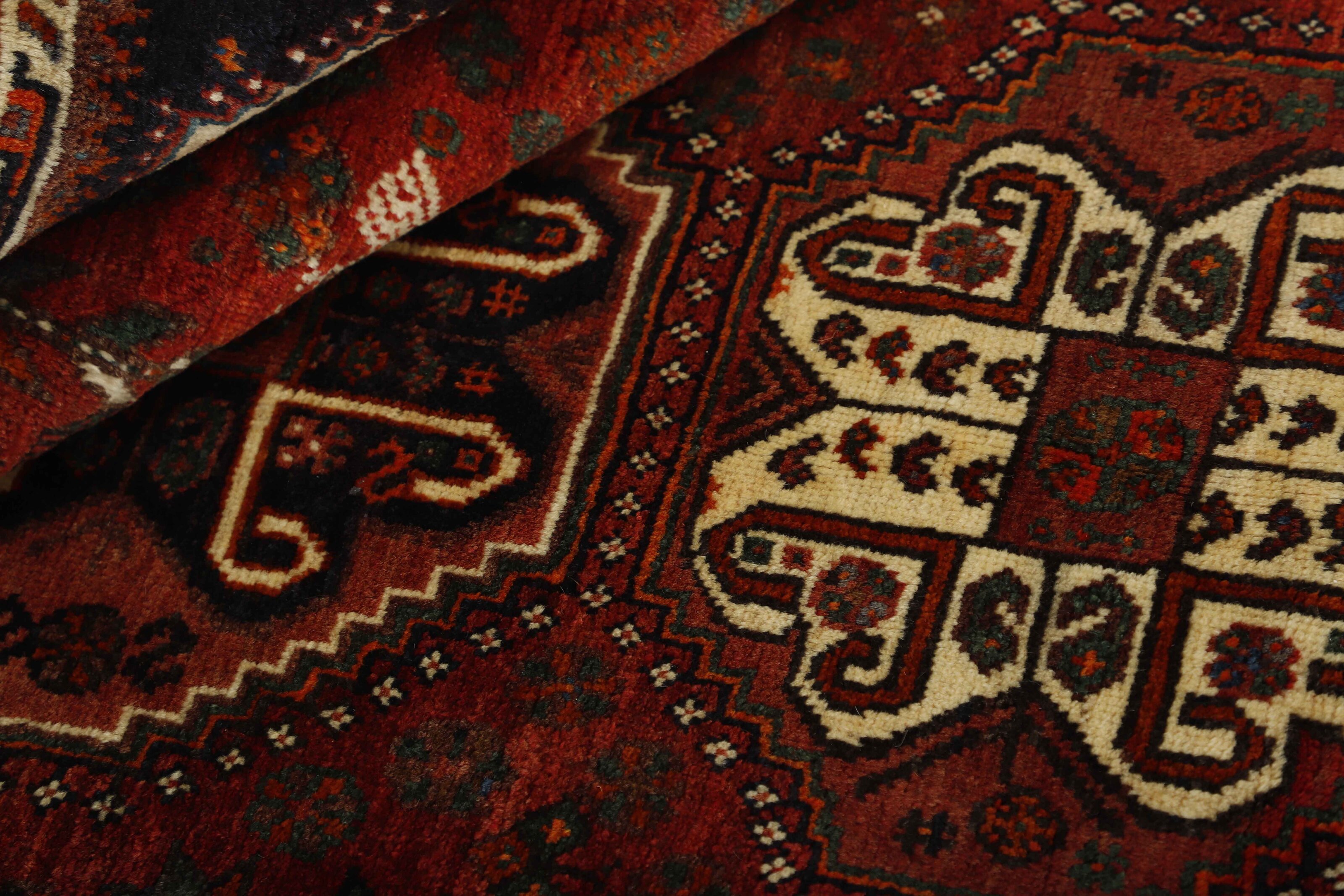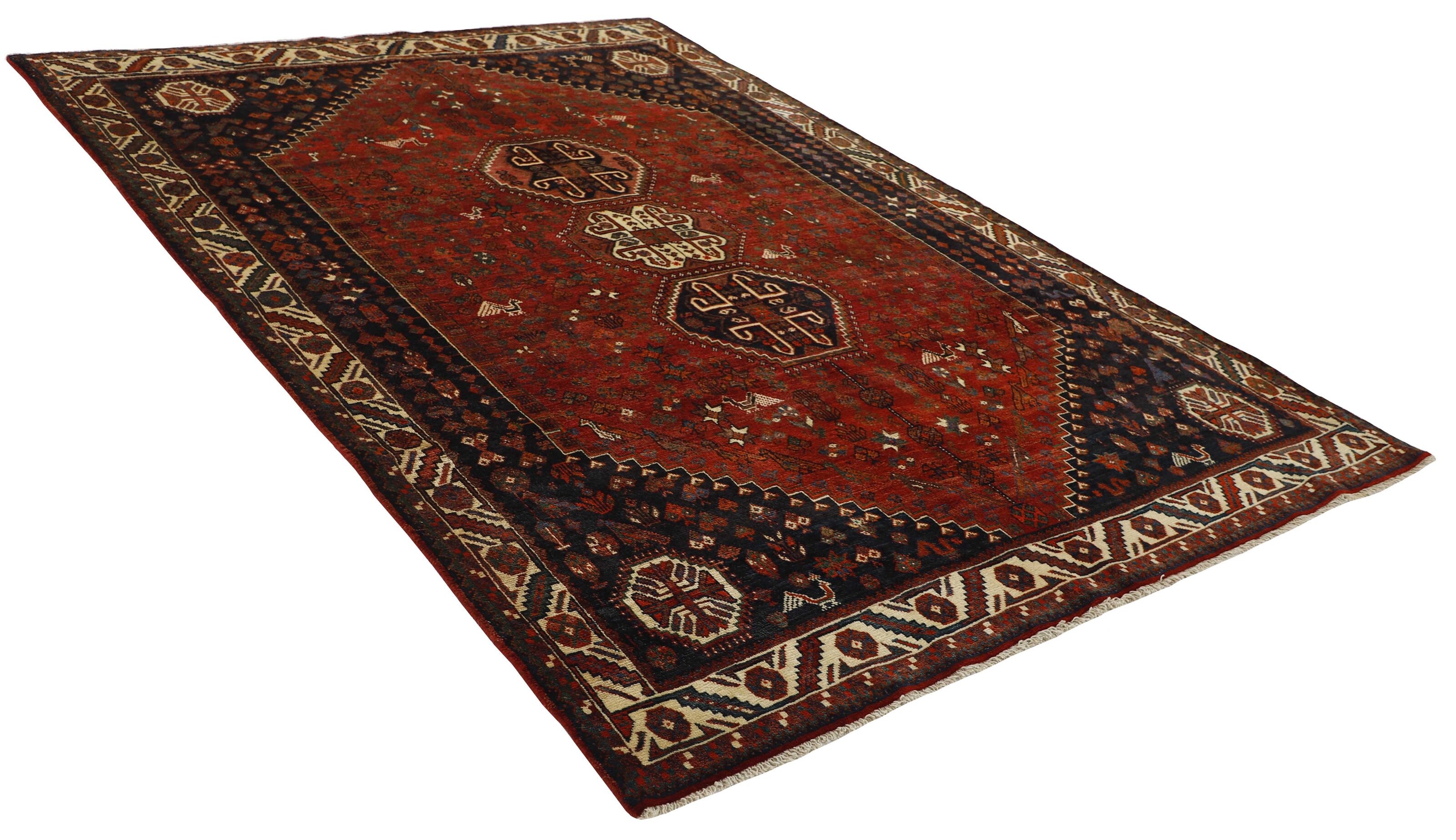 KashghaiItem no.: 1489146 Size: 200 cm x 286 cmThe Kashghai are Iran’s largest and most well known tribe. They speak a Turkish dialect, and are believed to have come from the Caucasus in the 18th century to their current areas, around Shiraz in the Fars Province of southern Iran. Their belligerent attitude has lead to conflicts with changing governments, as well as other tribes in the area. Both their rugs and the women’s clothing clearly show their skills and love of colours. Many subtribes exist, the most important ones being the Bilvedi, the Shishbouki, the Darashuri, and the Kashkuli. The Kashghai knot numerous types of rugs, but a characteristic product can be distinguished by its wool construction, the sturdy ridges on the back, its strong, deep colours (especially the red), as well as by the use of traditional motifs such as Harshang or the crab. The patterns are geometrical, typically with three or five medallions along the centre of the rug or in the middle and corners. The entire field is usually covered in small geometrical motifs. Persepolis motifs can often be found in the rugs. The Kashghai are also famous for their older crafts, such as horse blankets, saddlebags, and rope. The products of other tribes, such as the Kamseh and the Lori, are often mistaken for those of the Kashghai.