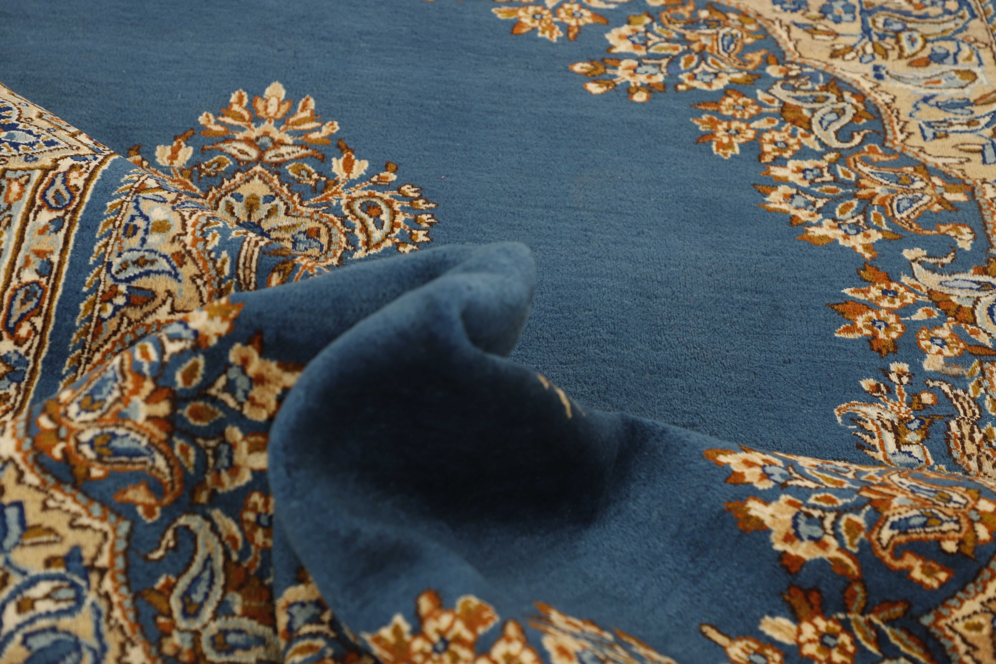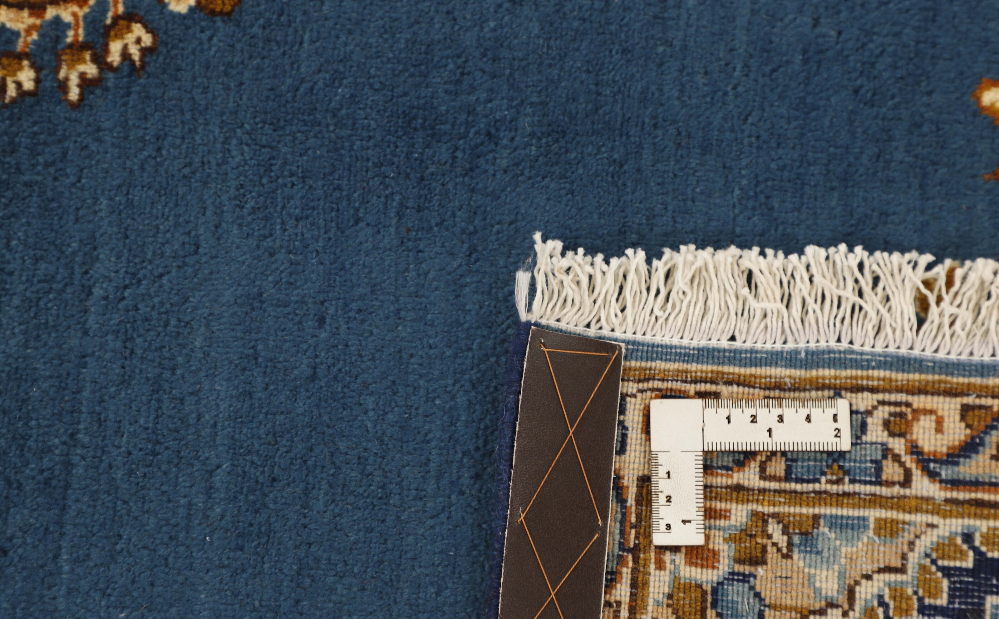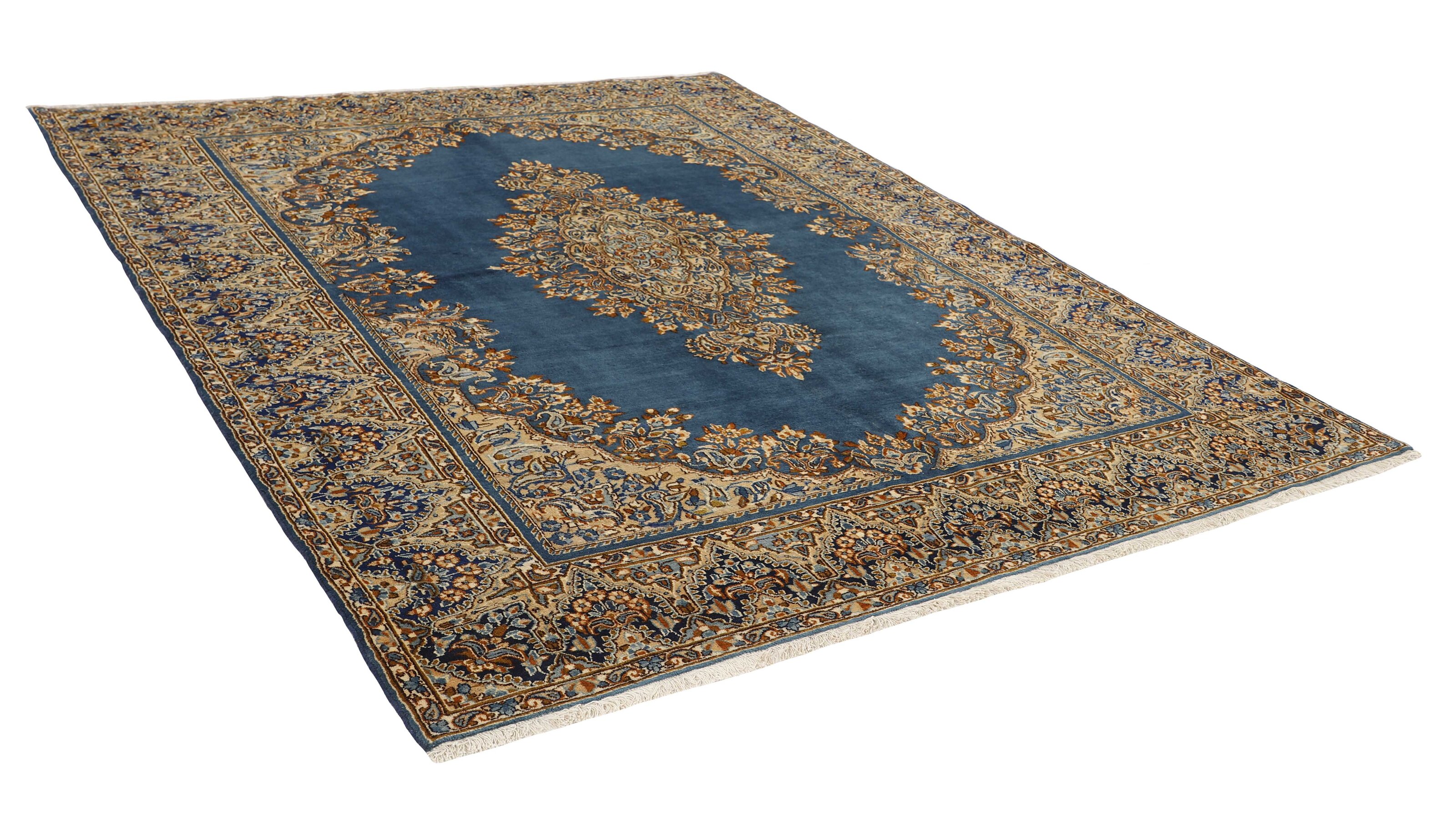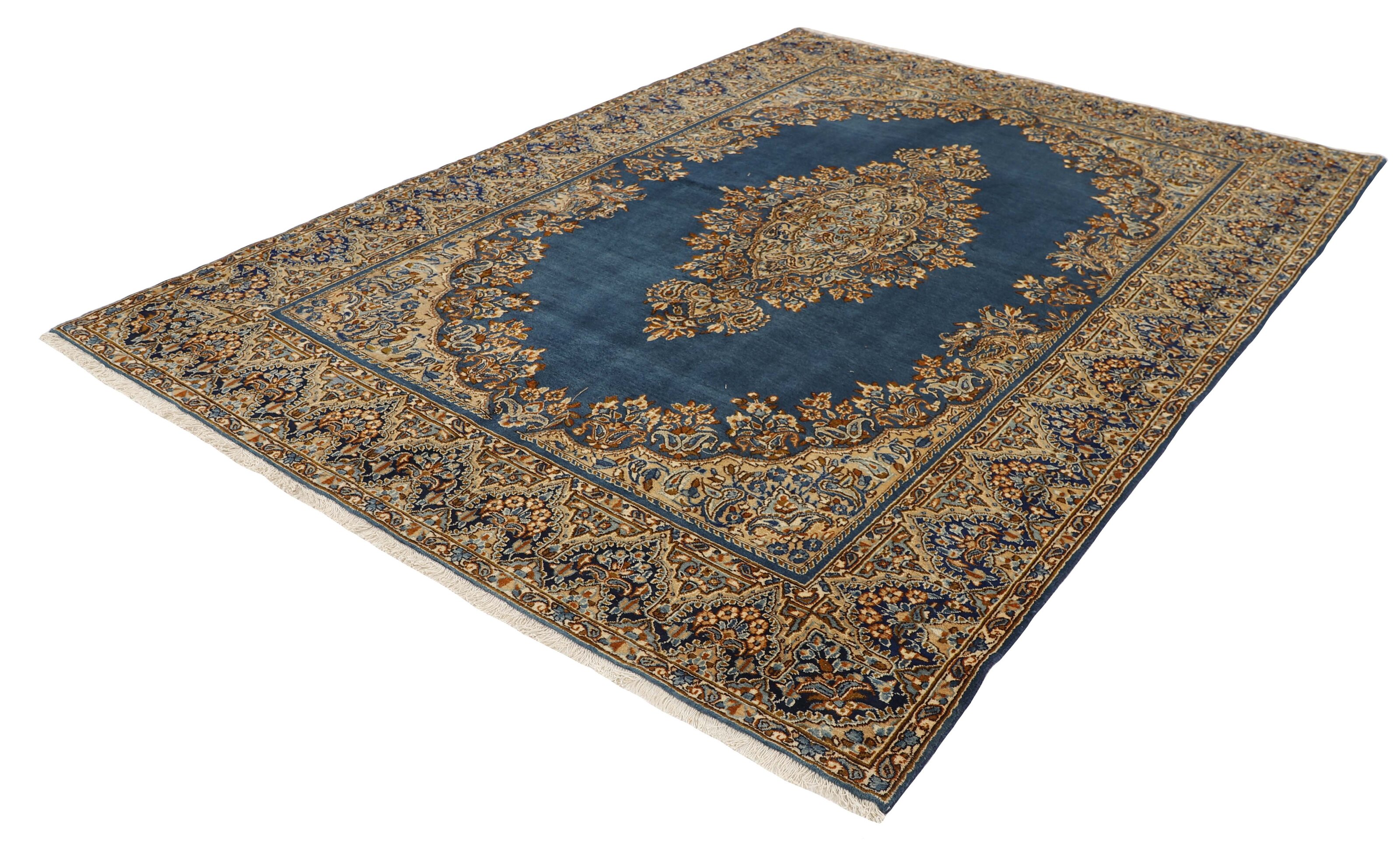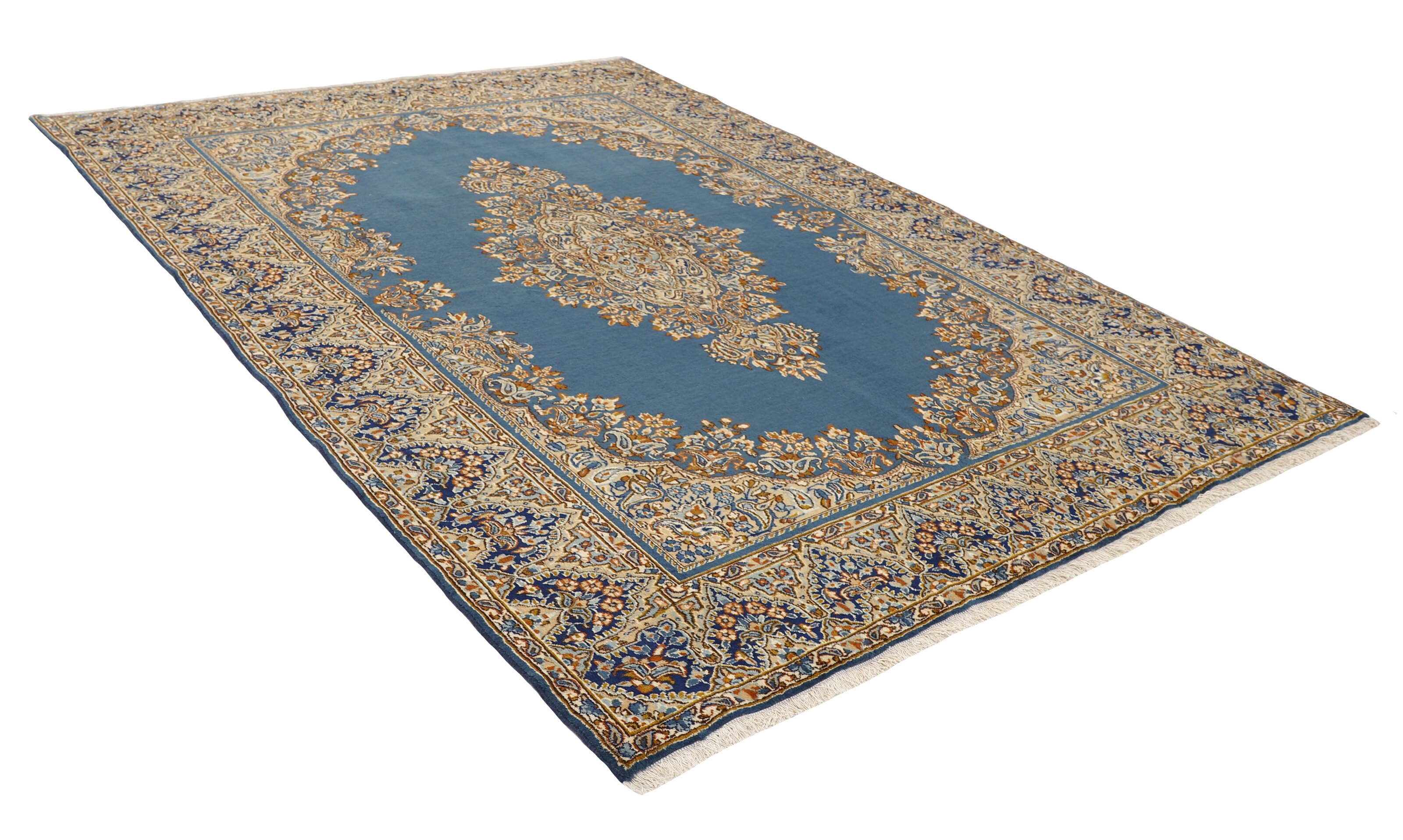 KermanItem no.: 1519719 Size: 204 cm x 295 cmThe city of Kerman lies in south-eastern Iran, on the edge of the Kavir-e-Lut Desert, and is the capitol of the Kerman province, which has about half a million inhabitants. Its geographical isolation has ensured the preservation of many monuments – there is said to be 90 mosques – and a 15th century mausoleum in nearby Mahan is said to be the most beautiful building in Iran. Like Yazd to the northwest, Kerman has a large population of Zoroastrians, who adhere to Iran’s ancient religion, which in other places has been replaced by Islam. The silhouette of Kerman is characterised by its wind towers – chimney like constructions used to catch every breeze and lead them down to the inner parts of the house. Kerman has an ancient textile tradition, and shawls were woven through large parts of the 19th century. When the demand for shawls fell, the weavers changed their looms for rug production. Initially, they used the same patterns they had used in the shawls, but they adapted them as fashion changed, although the Kerman rugs kept their delicate colours and patterns. All sizes are made. The largest rugs have unique colours and patterns, and are often knotted in the northern towns of Lavar or Ravar. Apart from the shawl patterns, Kerman often has adaptations of the Boteh- motif with natural bouquets of flowers, or adaptations of classical rug patterns. A wide range of delicate colours is used. The pile is normally soft, velvet like wool, while warp and weft are always cotton.