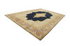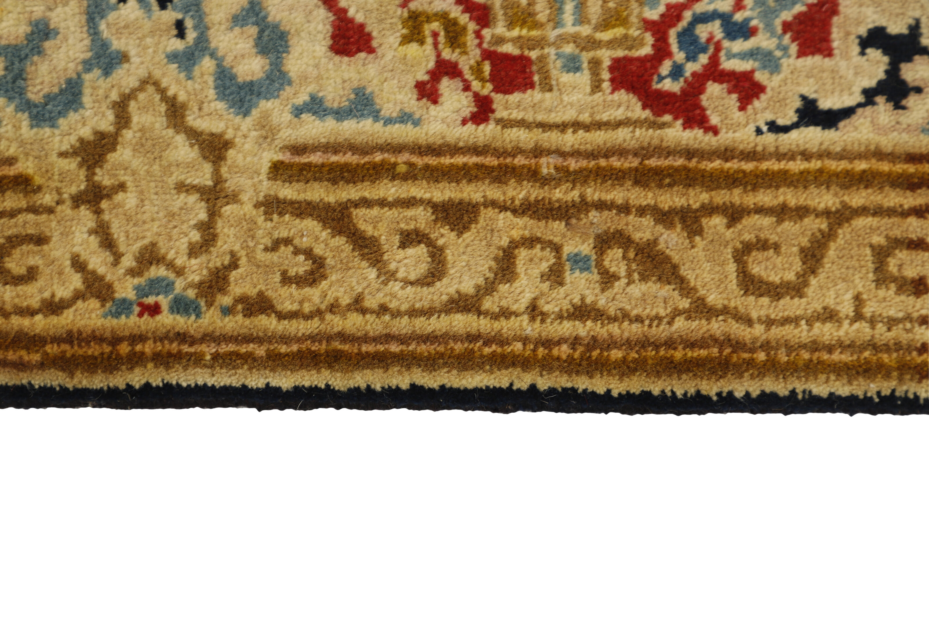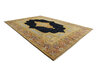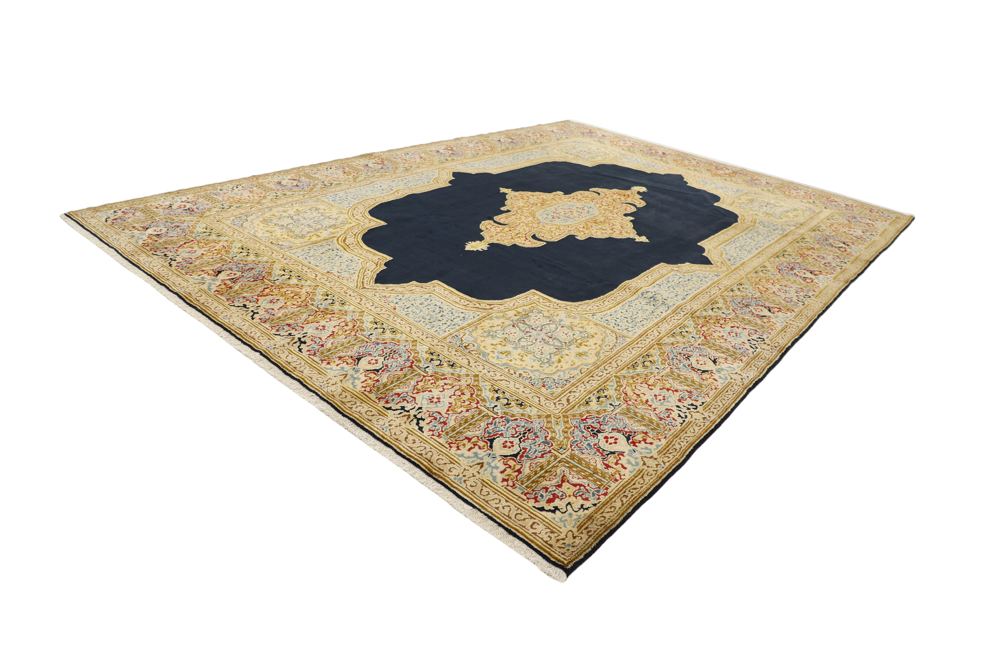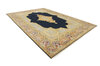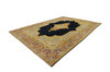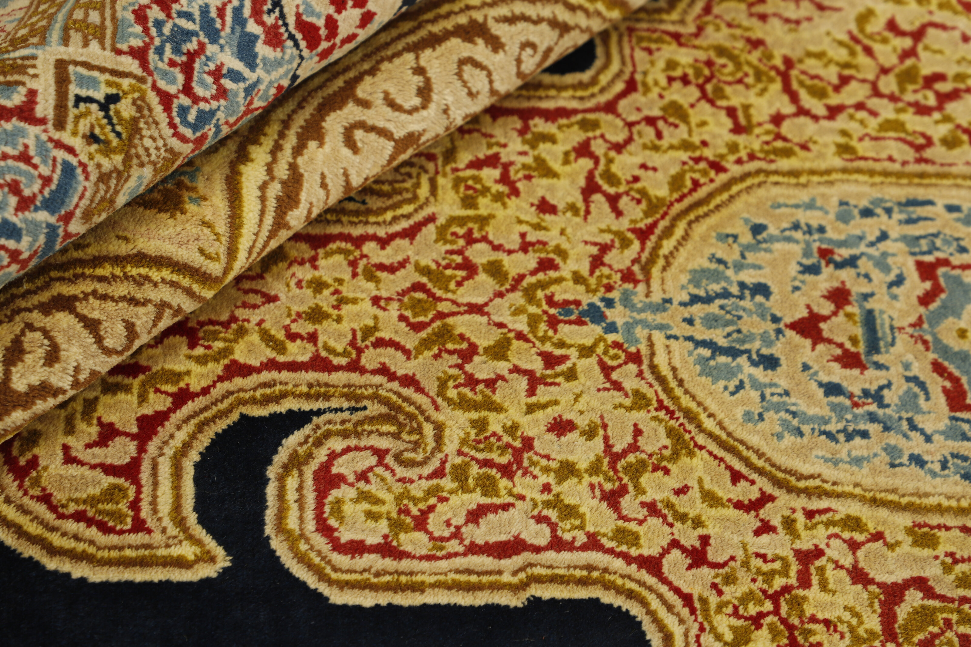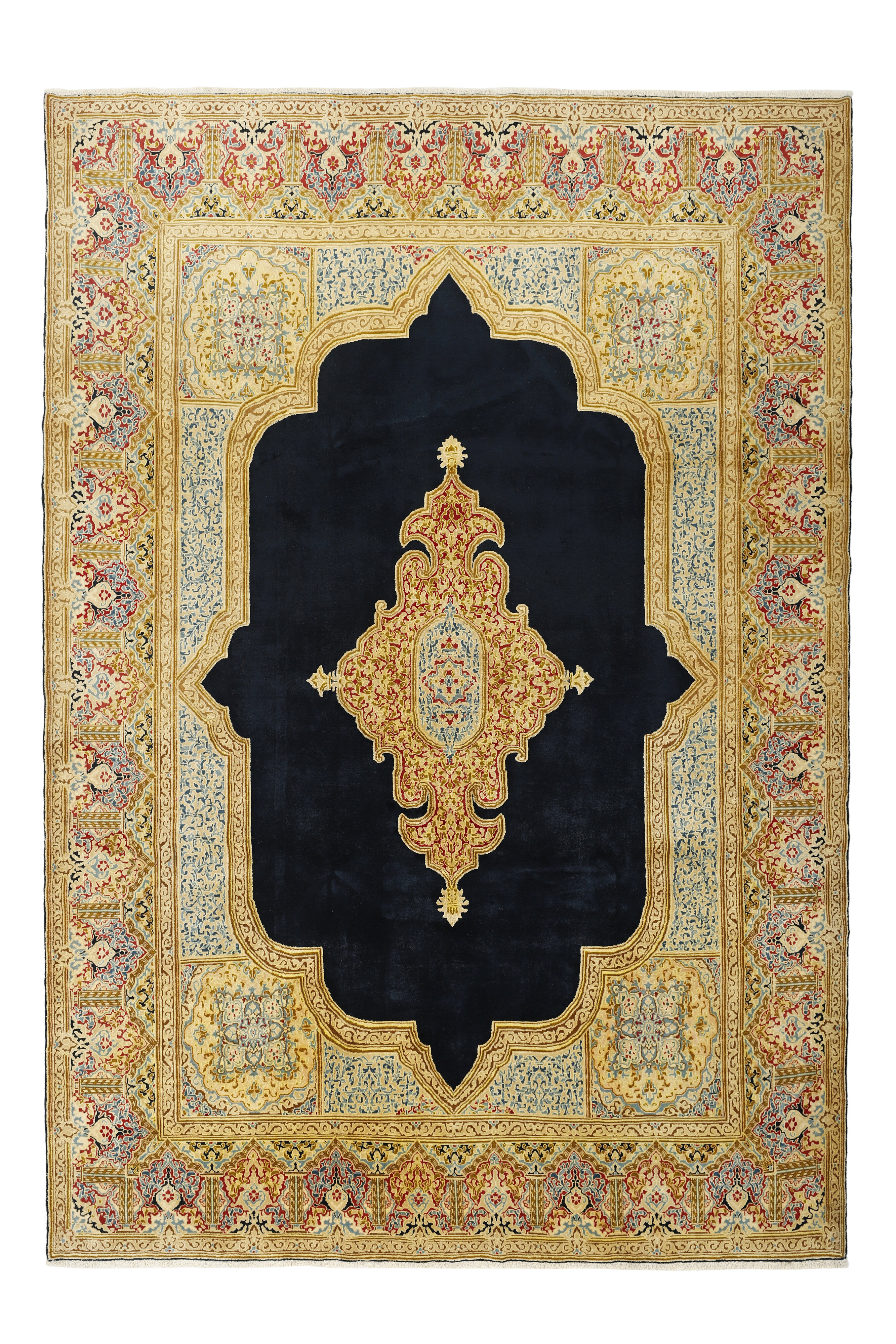 KermanItem no.: 1519851 Size: 298 cm x 430 cmThe city of Kerman lies in south-eastern Iran, on the edge of the Kavir-e-Lut Desert, and is the capitol of the Kerman province, which has about half a million inhabitants. Its geographical isolation has ensured the preservation of many monuments – there is said to be 90 mosques – and a 15th century mausoleum in nearby Mahan is said to be the most beautiful building in Iran. Like Yazd to the northwest, Kerman has a large population of Zoroastrians, who adhere to Iran’s ancient religion, which in other places has been replaced by Islam. The silhouette of Kerman is characterised by its wind towers – chimney like constructions used to catch every breeze and lead them down to the inner parts of the house. Kerman has an ancient textile tradition, and shawls were woven through large parts of the 19th century. When the demand for shawls fell, the weavers changed their looms for rug production. Initially, they used the same patterns they had used in the shawls, but they adapted them as fashion changed, although the Kerman rugs kept their delicate colours and patterns. All sizes are made. The largest rugs have unique colours and patterns, and are often knotted in the northern towns of Lavar or Ravar. Apart from the shawl patterns, Kerman often has adaptations of the Boteh- motif with natural bouquets of flowers, or adaptations of classical rug patterns. A wide range of delicate colours is used. The pile is normally soft, velvet like wool, while warp and weft are always cotton.