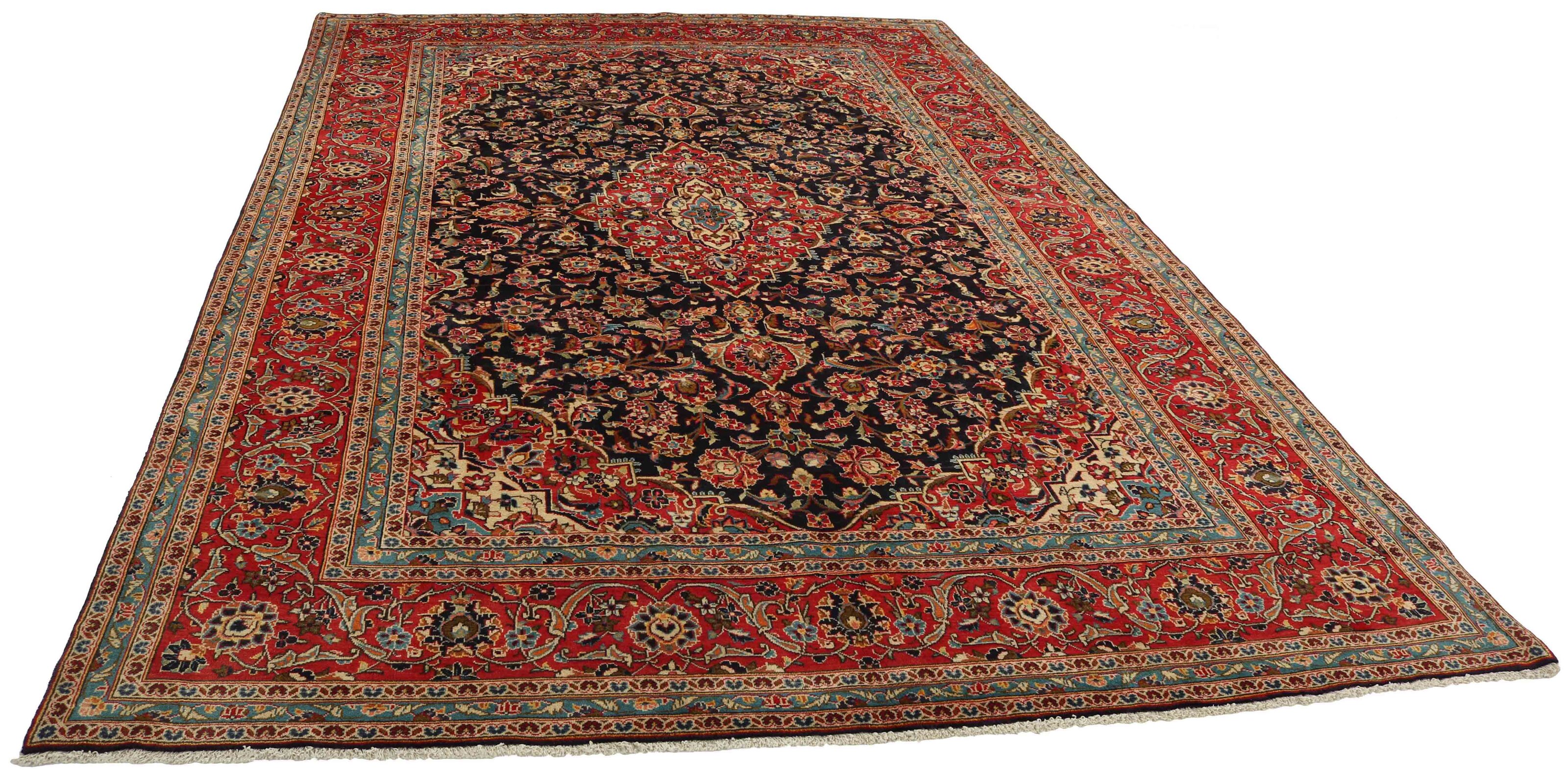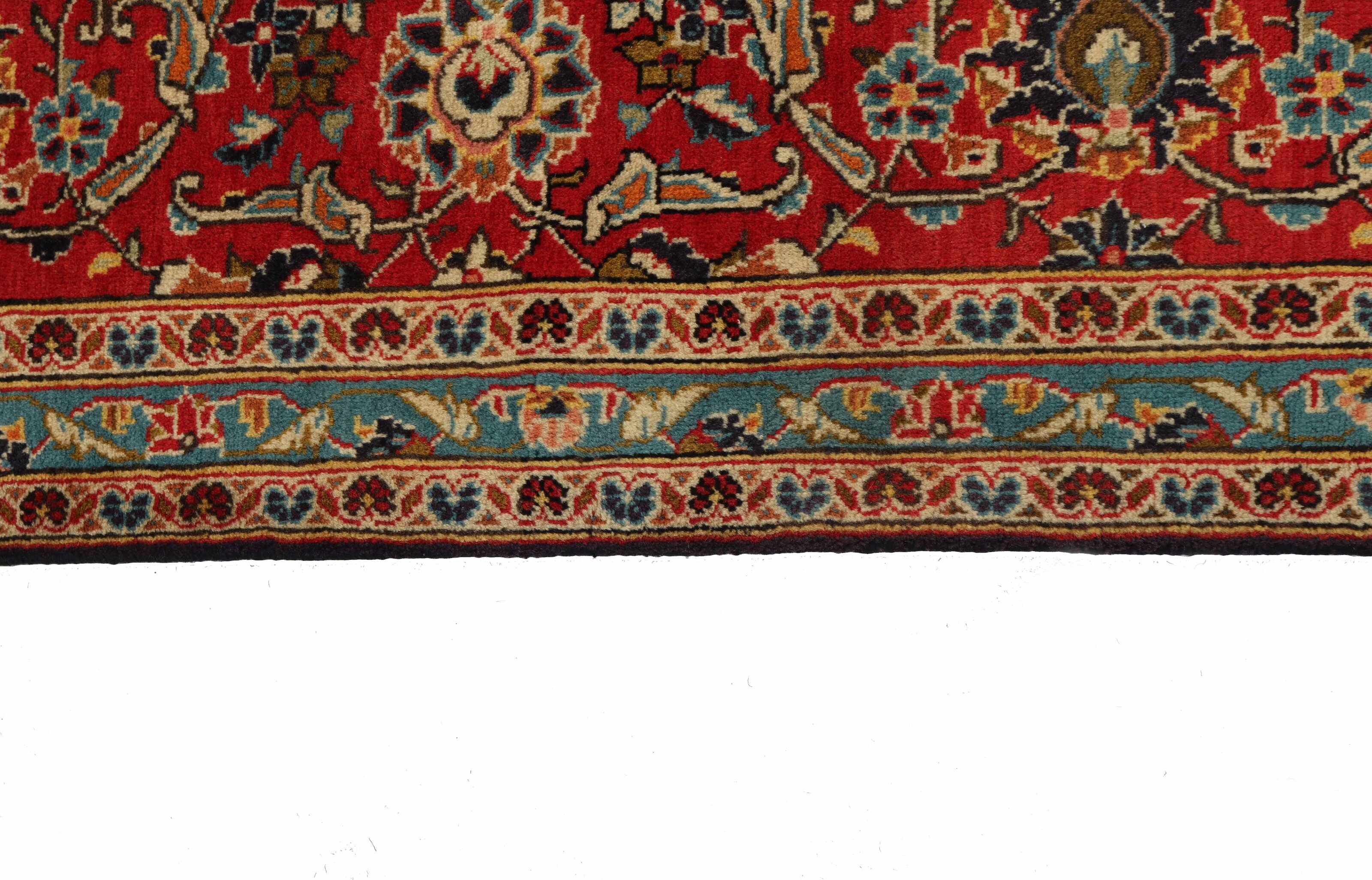 Keshan has always been famed for its handicrafts. The villages lie on the main road between Ghom and Isfahan in central Iran. To the East, the region borders Iran's largest desert. Despite the decline of this particular handicraft during the 20th century, many beautiful Keshan rugs are still being produced in accordance with the traditions of the old masters, e.g. decorated with the beautiful medallion patterns or tapestry featuring human and animal motifs. The patterns are most commonly woven around a medallion in the centre of the rug, some of which are repeated in the corners. The other fields are densely decorated with realistic flowers and vines. The main border often features the "Herati" motif (an arched leaf), while the secondary borders feature rosettes. Brick red and dark blue are the most common base colours. Keshan is a city of about 300.000 people, situated in the Isfahan province in central Iran. It is rather low lying, and it gets very hot in summer. Traditionally, people have sought to alleviate this by building the houses into the ground. Keshan produces both wool and silk rugs. The first have a cotton warp and weft, the weft being blue. Several qualities are produced, but most Keshan rugs are very finely knotted and all covering. The shape of a Keshan medallion is quite special; it is made by alternating curved lines and right angles. The most common colours are a red field and a blue medallion, with secondary details in other colours. The trimmings of a Keshan rug are also special; the main trimming is normally surrounded by stripes that form a geometrical pattern, usually small blue and red triangles. Keshan rugs come in all sizes. The south-eastern city of Natanez has laid name to image rugs done in the same knotting as Keshans.