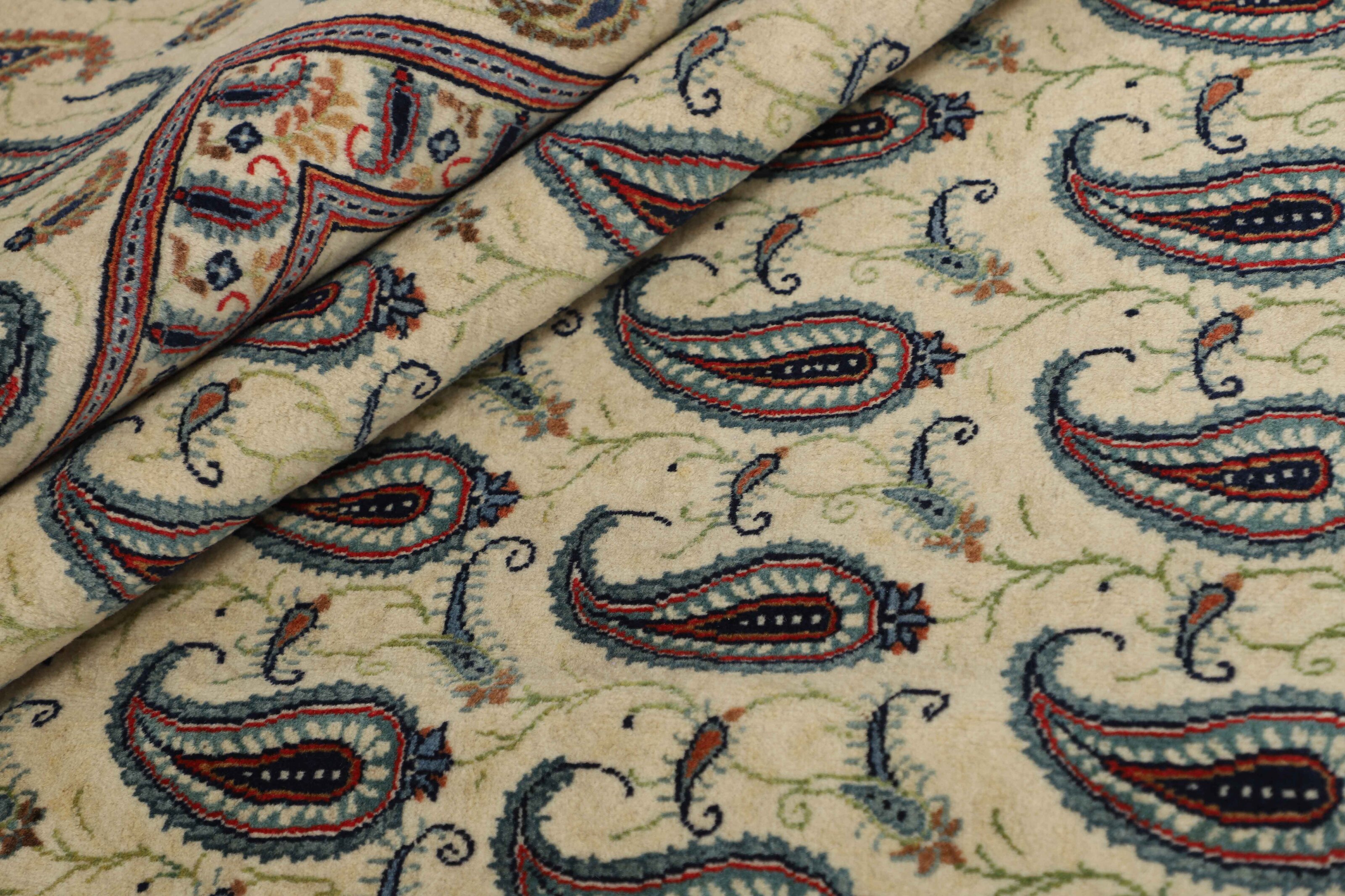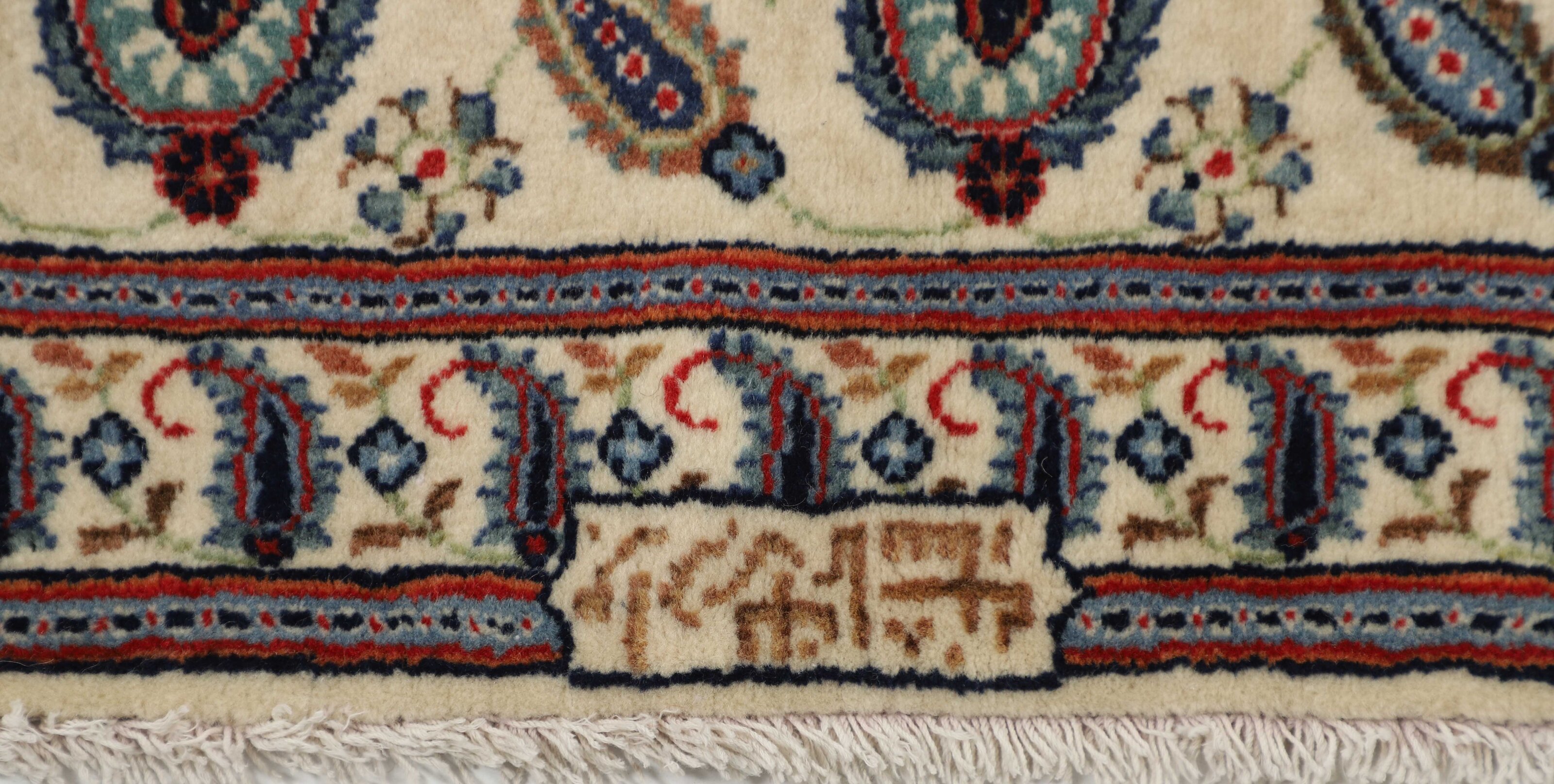 Keshan has always been famed for its handicrafts. The villages lie on the main road between Ghom and Isfahan in central Iran. To the East, the region borders Iran's largest desert. Despite the decline of this particular handicraft during the 20th century, many beautiful Keshan rugs are still being produced in accordance with the traditions of the old masters, e.g. decorated with the beautiful medallion patterns or tapestry featuring human and animal motifs. The patterns are most commonly woven around a medallion in the centre of the rug, some of which are repeated in the corners. The other fields are densely decorated with realistic flowers and vines. The main border often features the "Herati" motif (an arched leaf), while the secondary borders feature rosettes. Brick red and dark blue are the most common base colours. Keshan is a city of about 300.000 people, situated in the Isfahan province in central Iran. It is rather low lying, and it gets very hot in summer. Traditionally, people have sought to alleviate this by building the houses into the ground. Keshan produces both wool and silk rugs. The first have a cotton warp and weft, the weft being blue. Several qualities are produced, but most Keshan rugs are very finely knotted and all covering. The shape of a Keshan medallion is quite special; it is made by alternating curved lines and right angles. The most common colours are a red field and a blue medallion, with secondary details in other colours. The trimmings of a Keshan rug are also special; the main trimming is normally surrounded by stripes that form a geometrical pattern, usually small blue and red triangles. Keshan rugs come in all sizes. The south-eastern city of Natanez has laid name to image rugs done in the same knotting as Keshans.