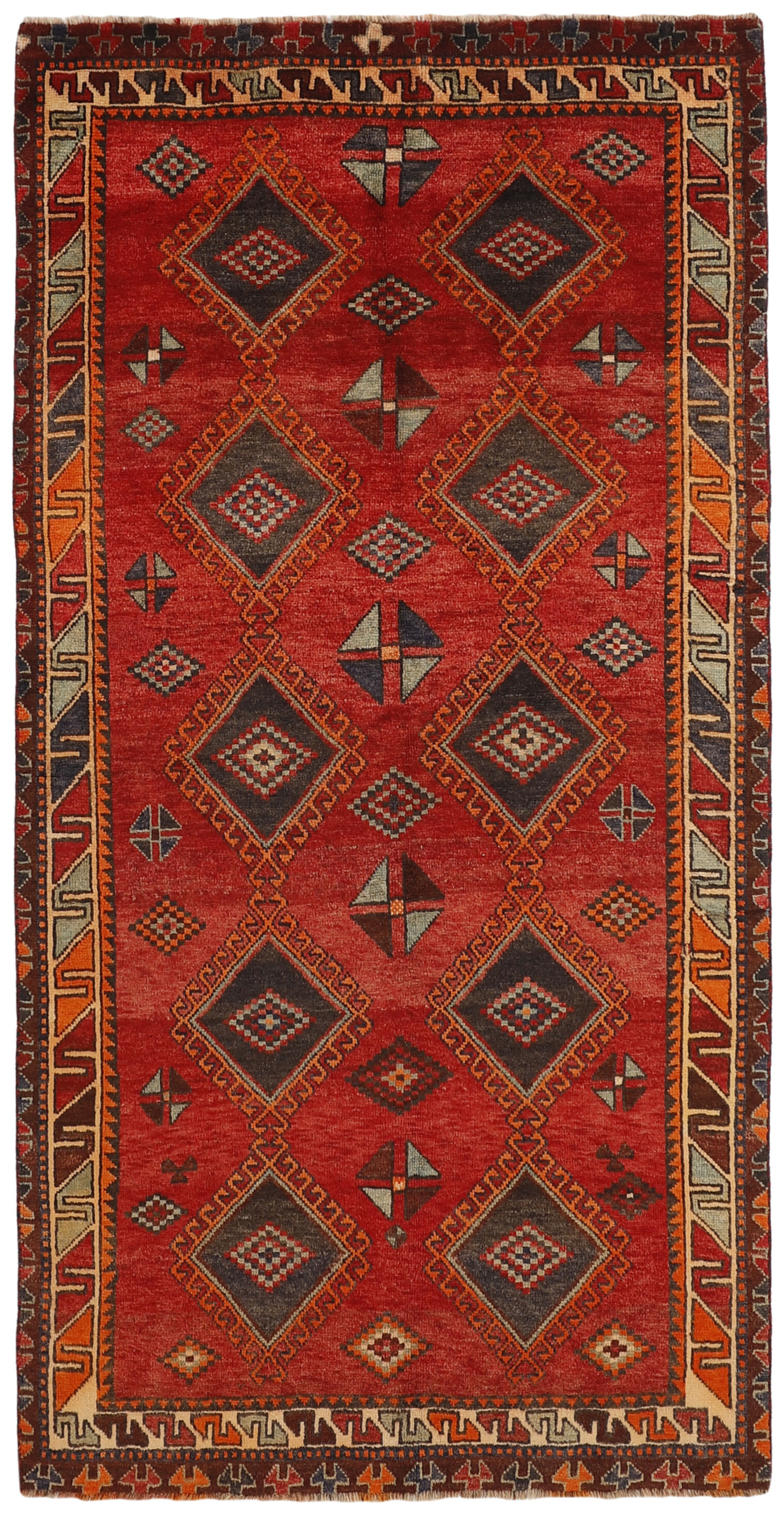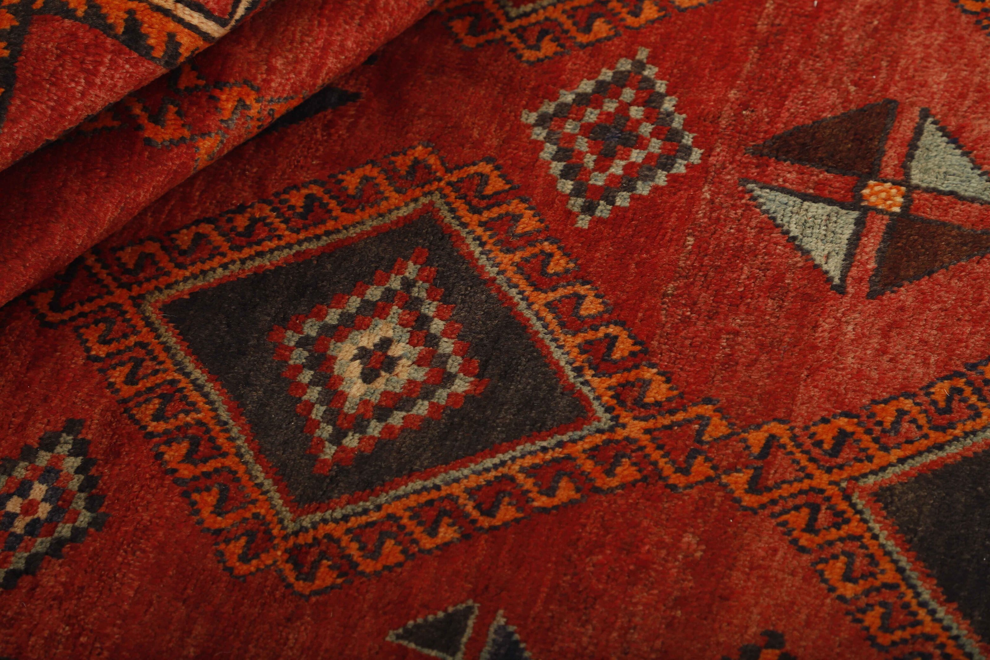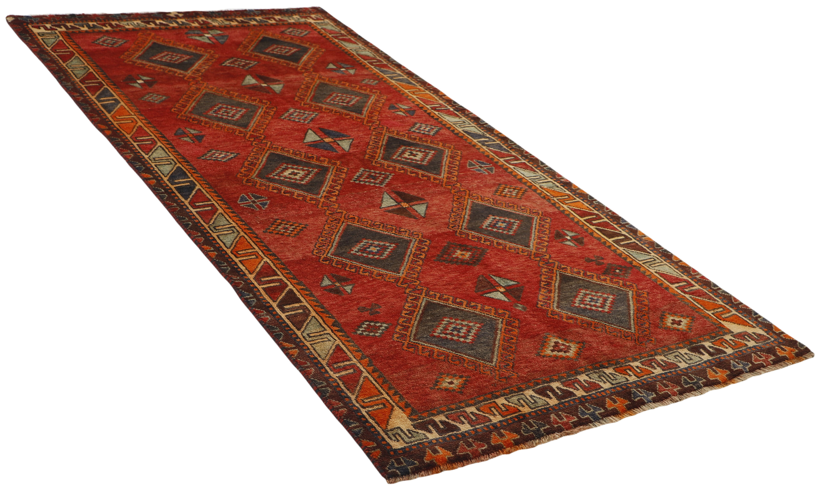 The Lori Tribe is one of the most important nomadic tribes in Iran, and inhabit the southern and western parts of the country. Several of the Lori areas used to belong to the Kashghai. As opposed to the Kashghai, who speak Turkish, the Loris are originally Iranian, and their language is similar to Persian. Pressure from different sides in this century has forced many Loris to give up their nomadic lives and settle in villages. Two main types of Lori rugs are marketed. The nomadic rugs, produced in the southern area, are called “normal Lori Behbehan”. They resemble the Kashghai rugs and are made entirely of wool but they have a different series of motifs, and a generous use of clear, contrasted colours; a strong red is particularly prevalent. The other type of Lori rugs is marketed in the city of Khorramabad. These are squarer and colours are used more cautiously. The patterns show a great deal of variation, with a hole pattern being dominant. The fringes are often beautifully weaved. The city and the district of Hamadan is an important centre for the rug trade, as well as the most productive rug production area of Iran. Hamadan is a major city with hundreds of thousands of people. Like Ekbatan, it was a main city of the Achemenian kings. It has an indigenous Jewish population and numerous monuments, of which the most important are the tombs of Esther and Mordicai (central to Jewish pilgrims), and the tomb at Avicenna. Hamadan is a provincial capitol. Two types of rugs are knotted. One is the so-called “city rug”, also known as the Shahrbaff. The production is modern and largely state controlled. The village production, however, is much more important; Hamadan is a market city for many rug producing villages that each has its own pattern. Most prominent are Borchalu, Tuserkman, Memraban, Khamseh, Begardeh, Enjilas, Hosseinabad, and Zandjan. There is a wide range of patterns but the quality is very consistent. The colours are strong, and often plant colours. The patterns are daring, although random, and Hosseinabad and Enjilas in particular are known for through going patterns. The rugs are usually not much bigger than 3 by 2 metres.