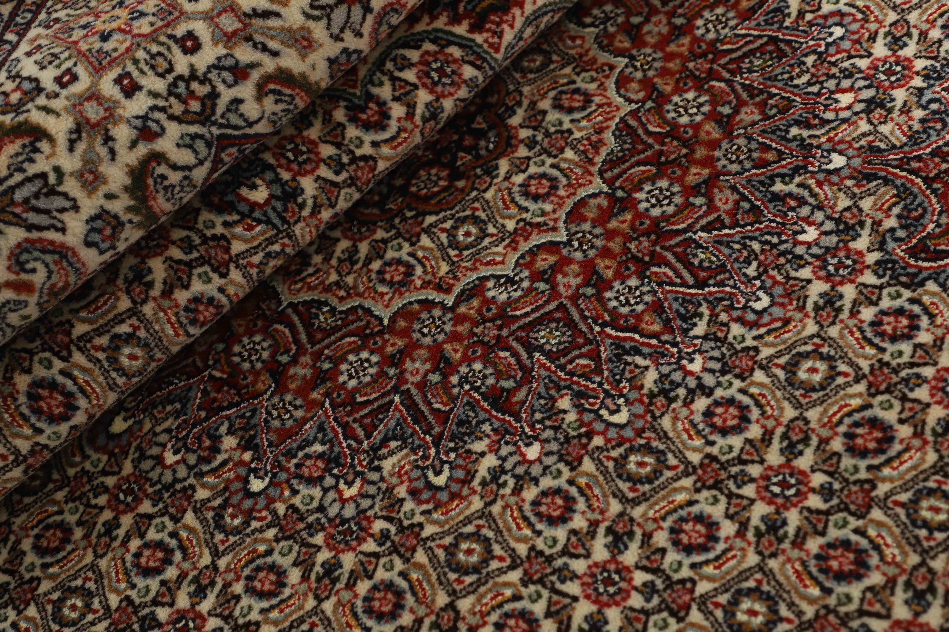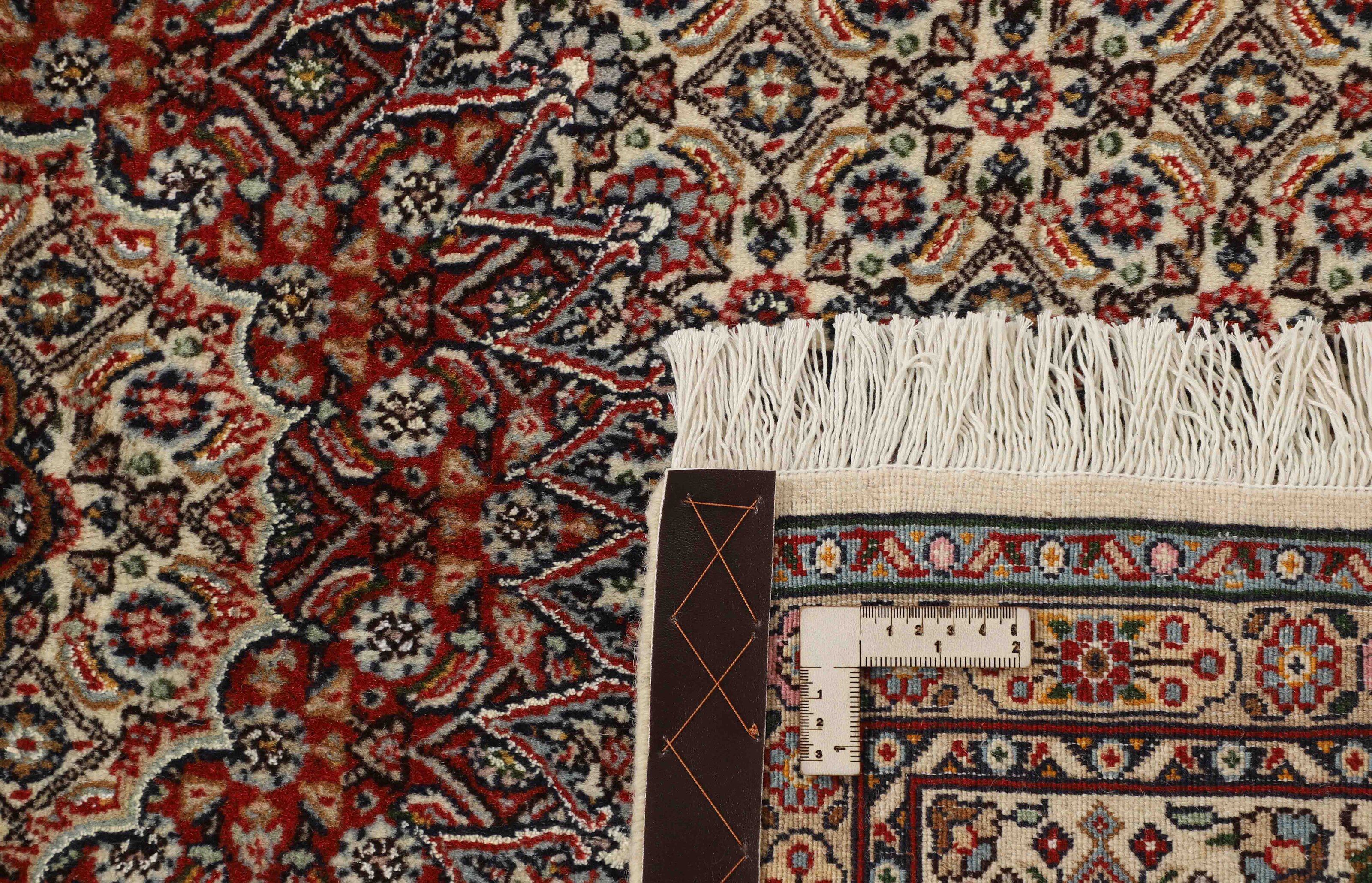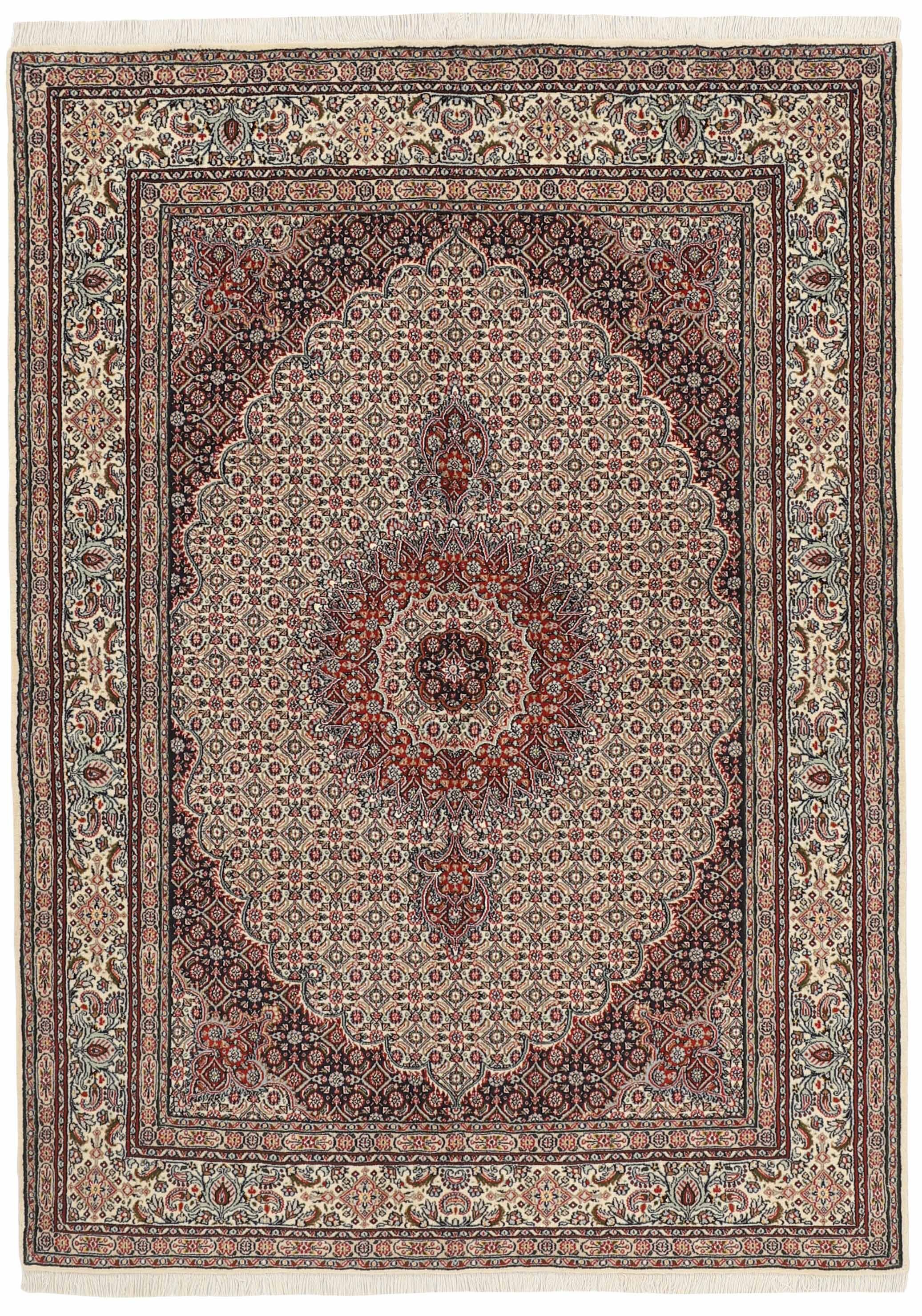 Moud MahiItem no.: 1519684 Size: 167 cm x 235 cmMoud is a small town south of Mashad, in the Khorrasan Province. Rugs from this area are characterised by homogeneity in patterns and quality. Warp and weft are cotton and the pile is wool. The trimmings are a version of the traditional Persian turtle trimming. The rugs are produced in all sizes. Moud rugs are often copied in India, because of their remarkable homogeneity. The characteristic Moud designs are among the most uniform, evenly knotted, and easily recognisable designs of the Khorrasan Province. Moud Mahi are made in a beige, light red, or blue tone, with all-over Mahi patterns or with a star shaped medallion. Mahi means fish, and the Mahi pattern is the most commonly used pattern in genuine Persian rugs. When looking at it closely, you can see a pond encircled by four fish.