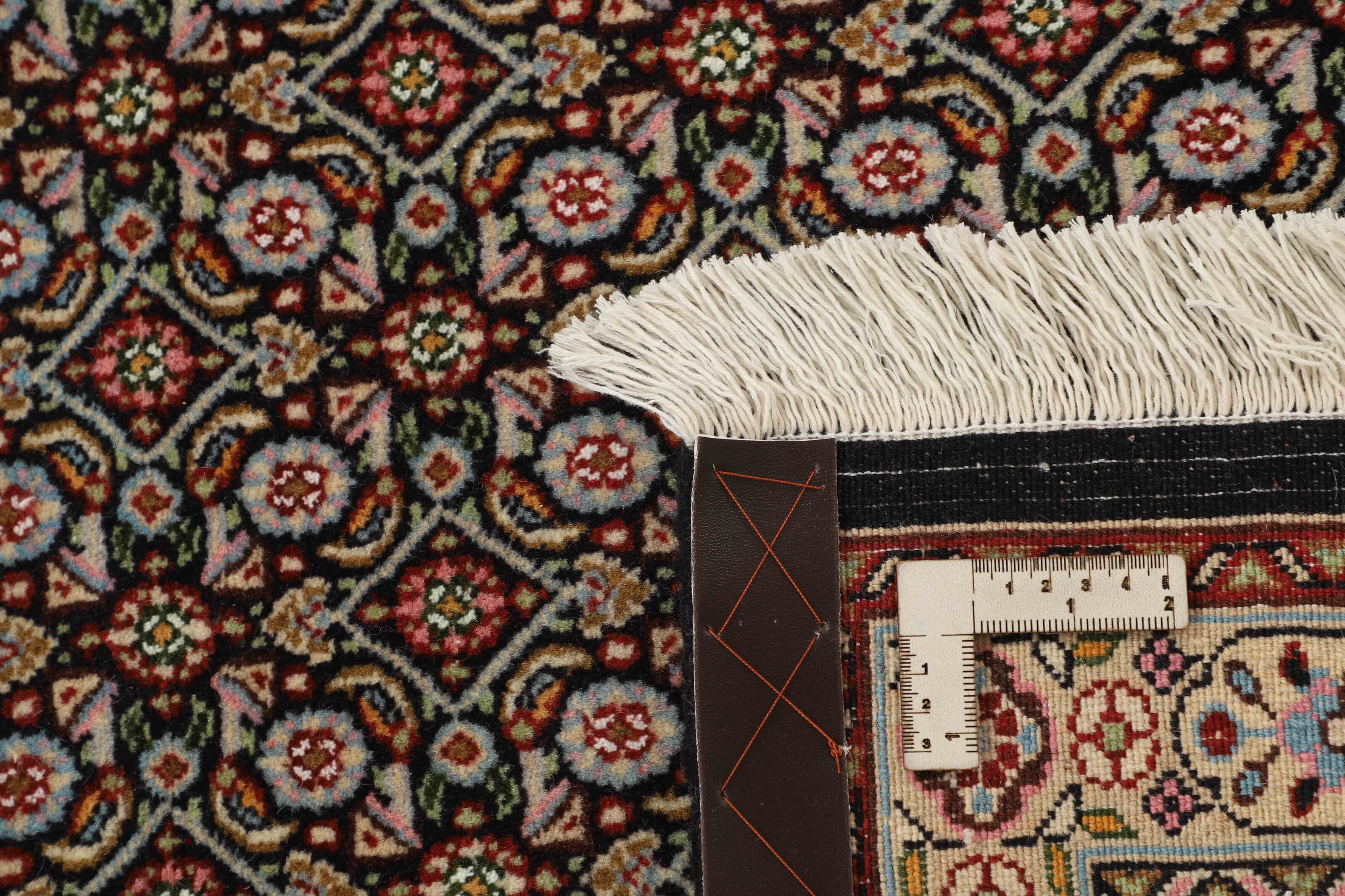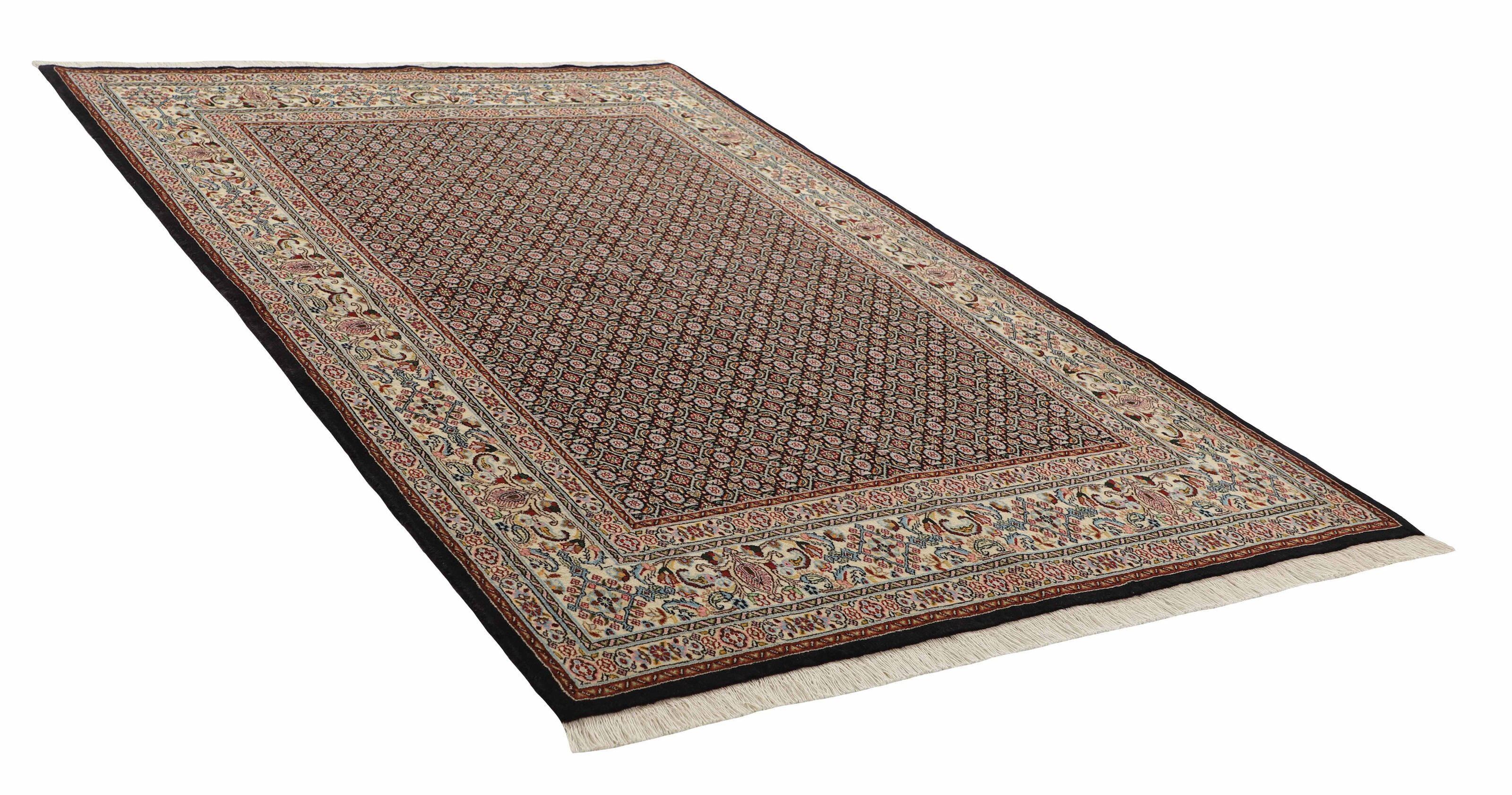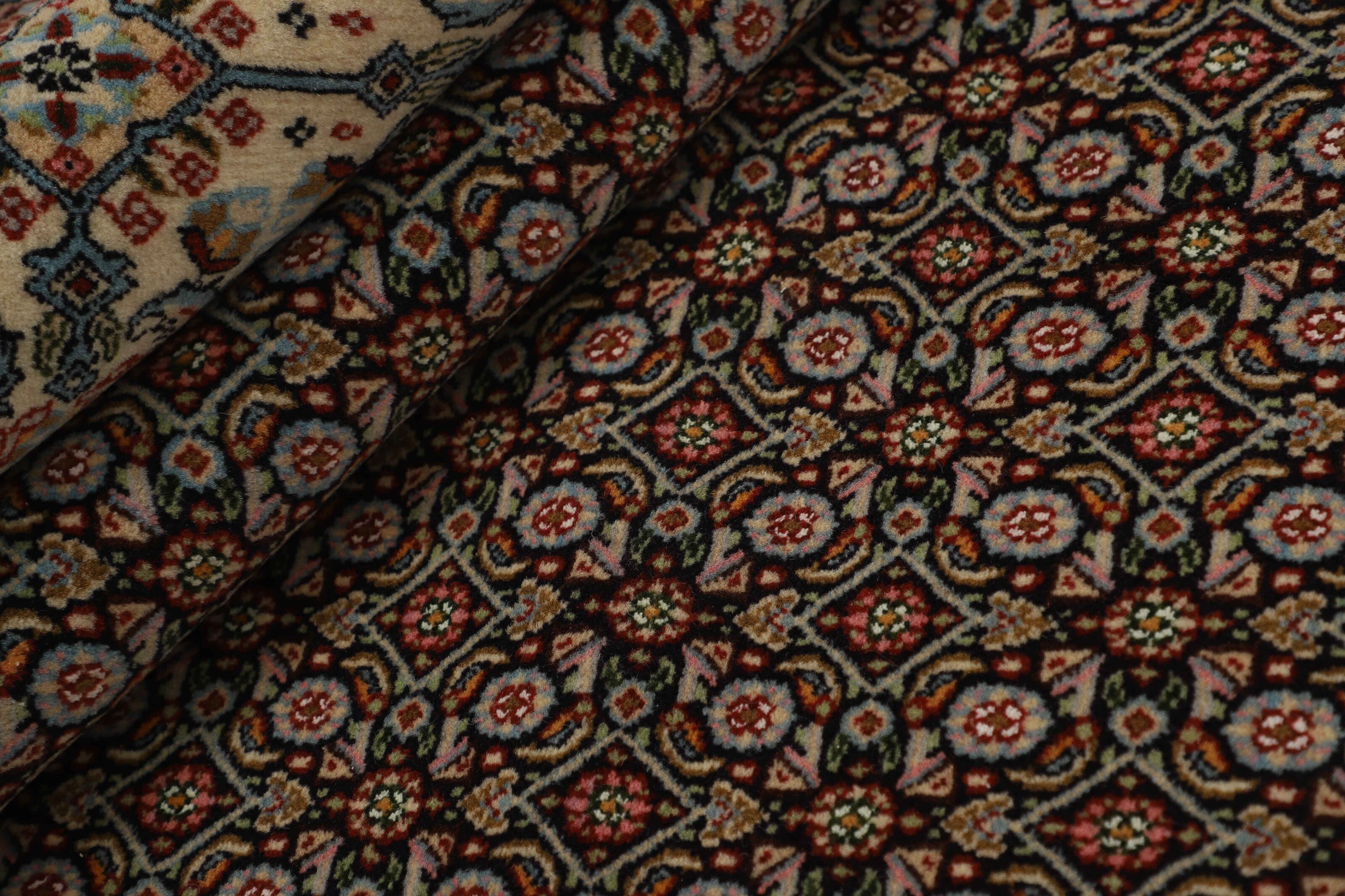 Moud MahiItem no.: 1519696 Size: 168 cm x 237 cmMoud is a small town south of Mashad, in the Khorrasan Province. Rugs from this area are characterised by homogeneity in patterns and quality. Warp and weft are cotton and the pile is wool. The trimmings are a version of the traditional Persian turtle trimming. The rugs are produced in all sizes. Moud rugs are often copied in India, because of their remarkable homogeneity. The characteristic Moud designs are among the most uniform, evenly knotted, and easily recognisable designs of the Khorrasan Province. Moud Mahi are made in a beige, light red, or blue tone, with all-over Mahi patterns or with a star shaped medallion. Mahi means fish, and the Mahi pattern is the most commonly used pattern in genuine Persian rugs. When looking at it closely, you can see a pond encircled by four fish.