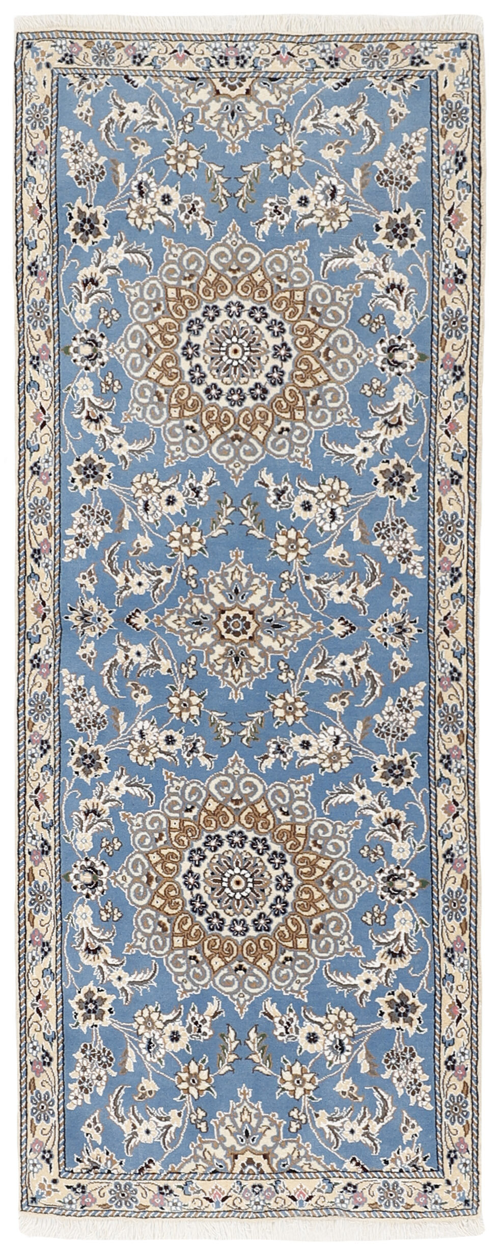 Nain 9 laItem no.: 1510718 Size: 80 cm x 207 cmNain is a city of about 50.000 people, located in the Isfahan Province. It has historic significance, since it was the last stop on caravan routes before Kavir-a-Lut, one of the deserts that stretch through the centre of Iran. The Nain Mosque is one of Iran’s oldest, and is built far better than the later and more famous mosques of Isfahan. The industry in Nain was traditionally focused on the production of wool garments, but the weavers switched to rug production when the demand fell. Their new products soon became famous, as the weavers were skilled and used good quality materials. The warp and weft are cotton, with a wool pile and contours of silk. Sometimes, silk is used more in the base. The colours are refined; nuances of ivory and cream, with small areas of red, green, and blue. As with the rugs from Isfahan, the patterns of the Nain rugs are also classical. The Nain rugs are made in all sizes, including the very large of up to 60m2, and some of these have a pure silk pile. The largest Nain rug produced was 20 by 20 metres.