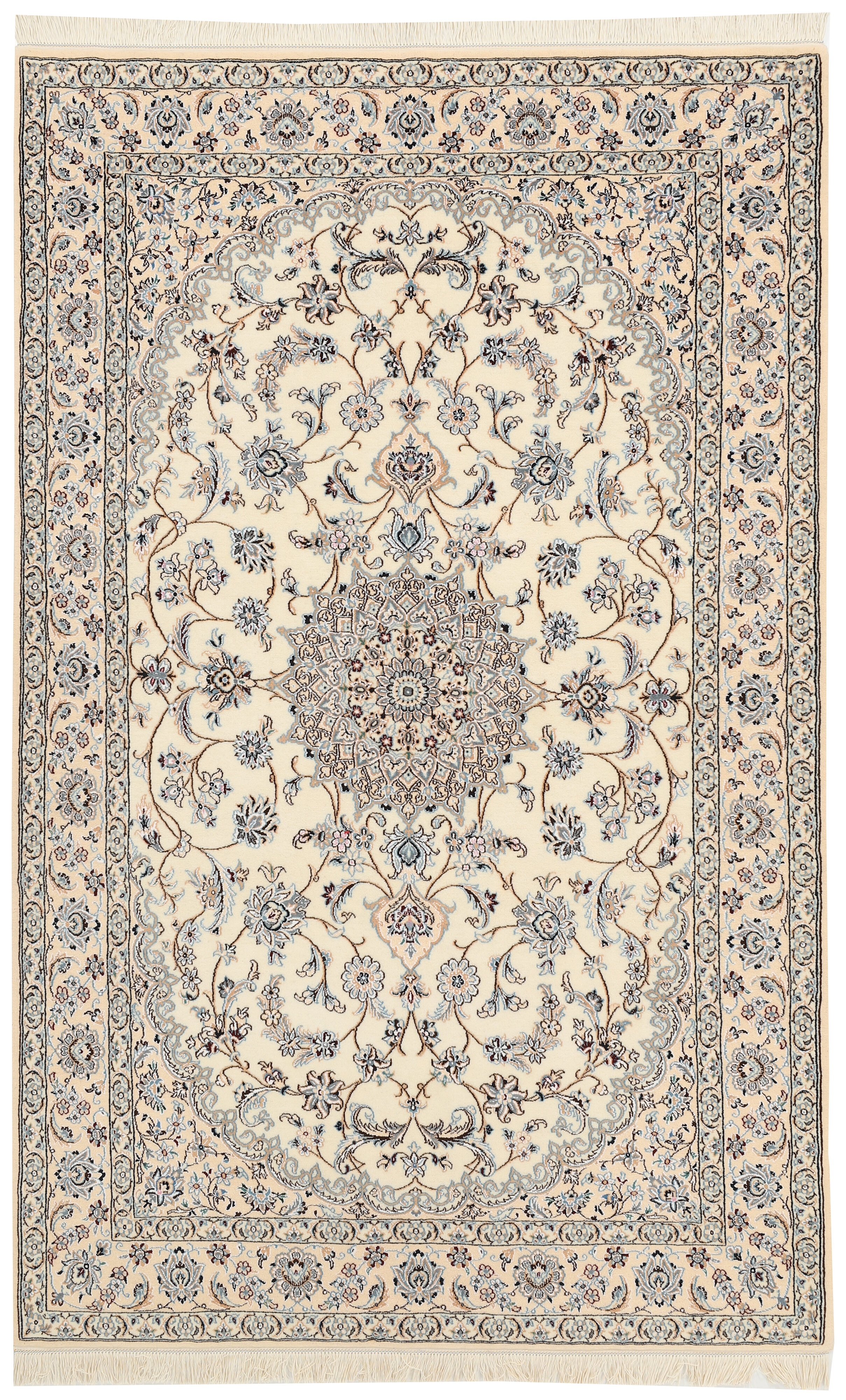 Nain 9 laItem no.: 1522453 Size: 168 cm x 262 cmNain is a city of about 50.000 people, located in the Isfahan Province. It has historic significance, since it was the last stop on caravan routes before Kavir-a-Lut, one of the deserts. The Nain Mosque is one of the oldest, and is built far better than the later and more famous mosques of Isfahan. The industry in Nain was traditionally focused on the production of wool garments, but the weavers switched to rug production when the demand fell. Their new products soon became famous, as the weavers were skilled and used good quality materials. The warp and weft are cotton, with a wool pile and contours of silk. Sometimes, silk is used more in the base. The colours are refined; nuances of ivory and cream, with small areas of red, green, and blue. As with the rugs from Isfahan, the patterns of the Nain rugs are also classical. The Nain rugs are made in all sizes, including the very large of up to 60m2, and some of these have a pure silk pile. The largest Nain rug produced was 20 by 20 metres.