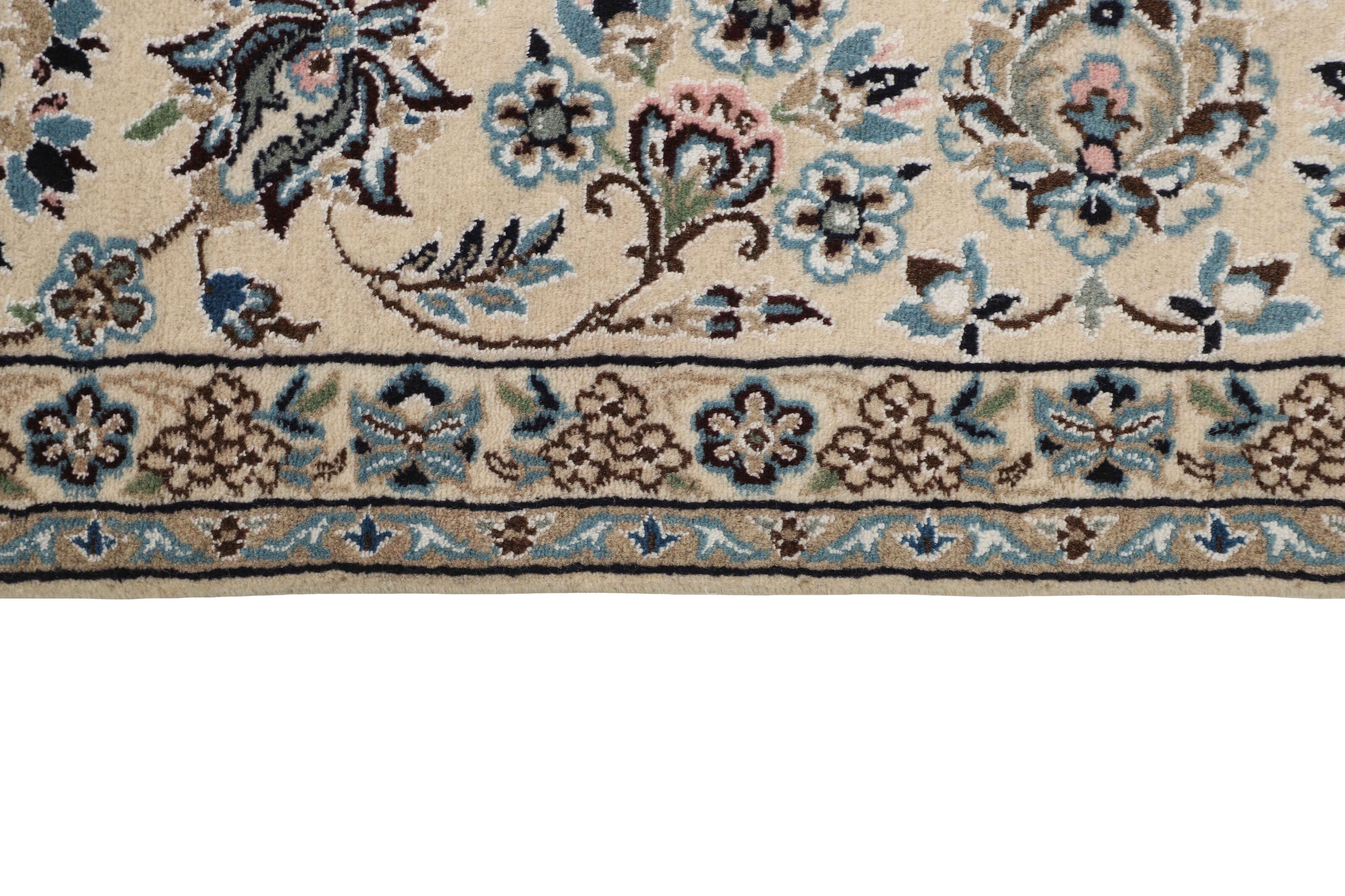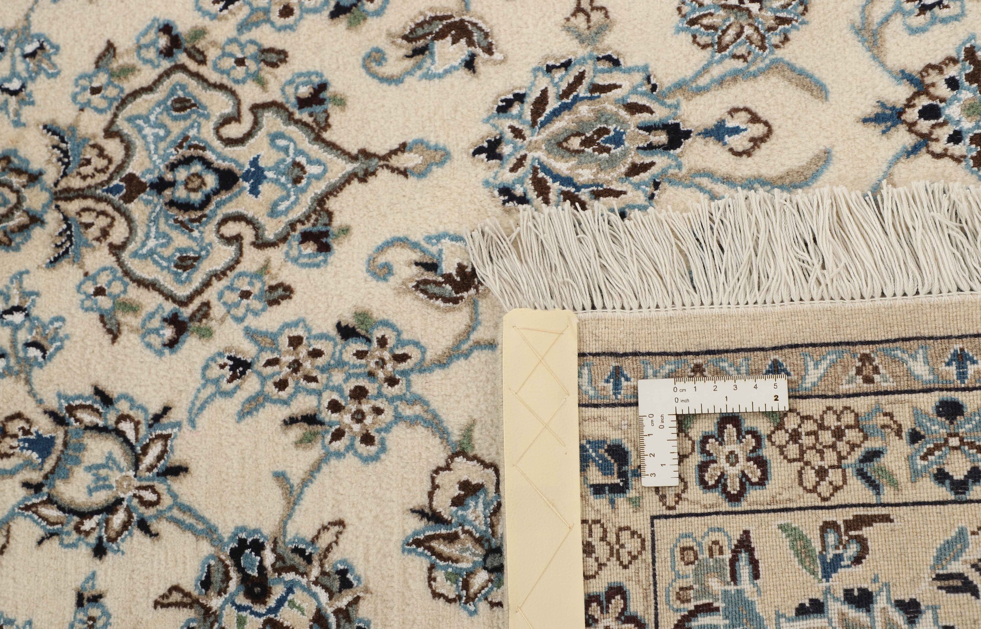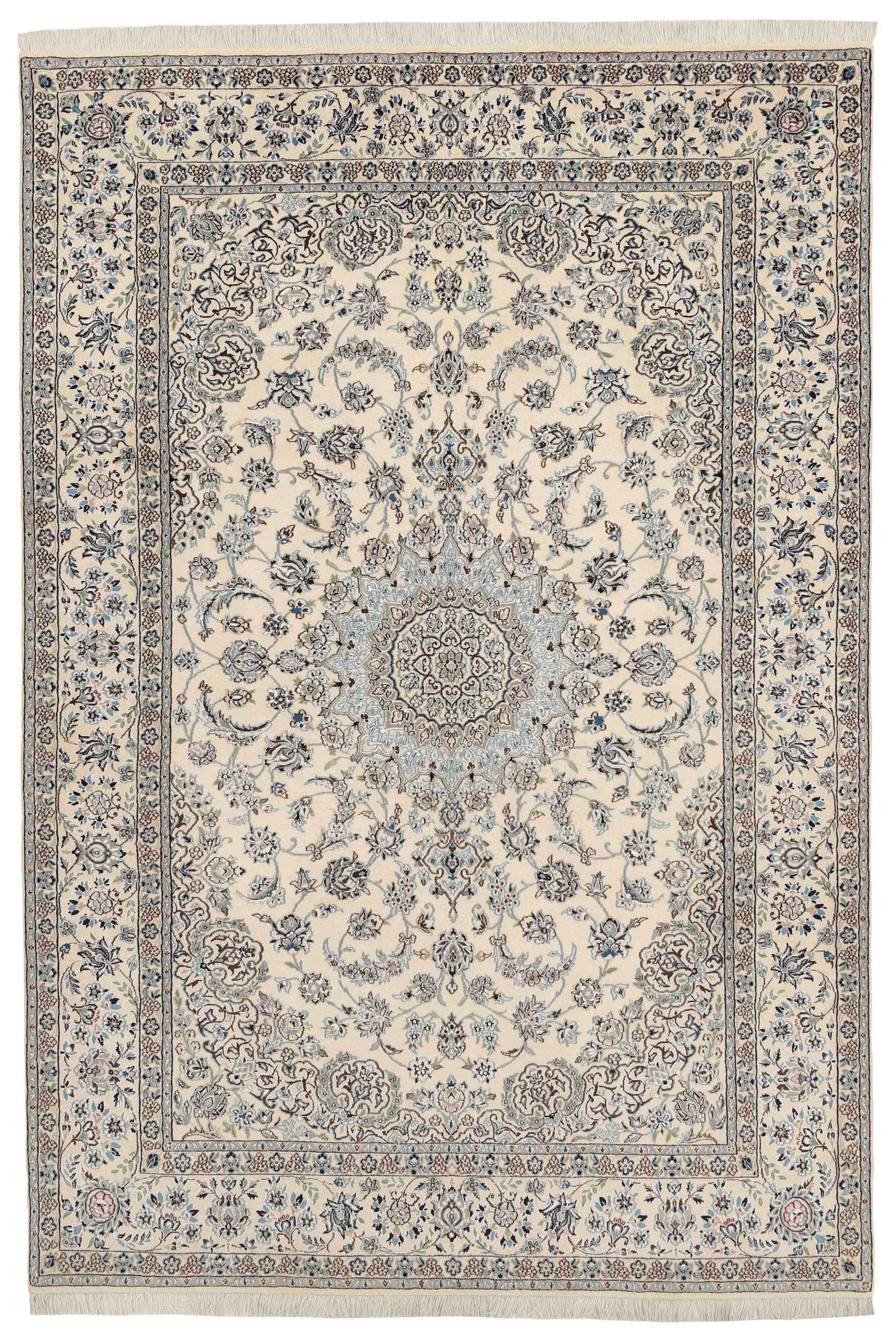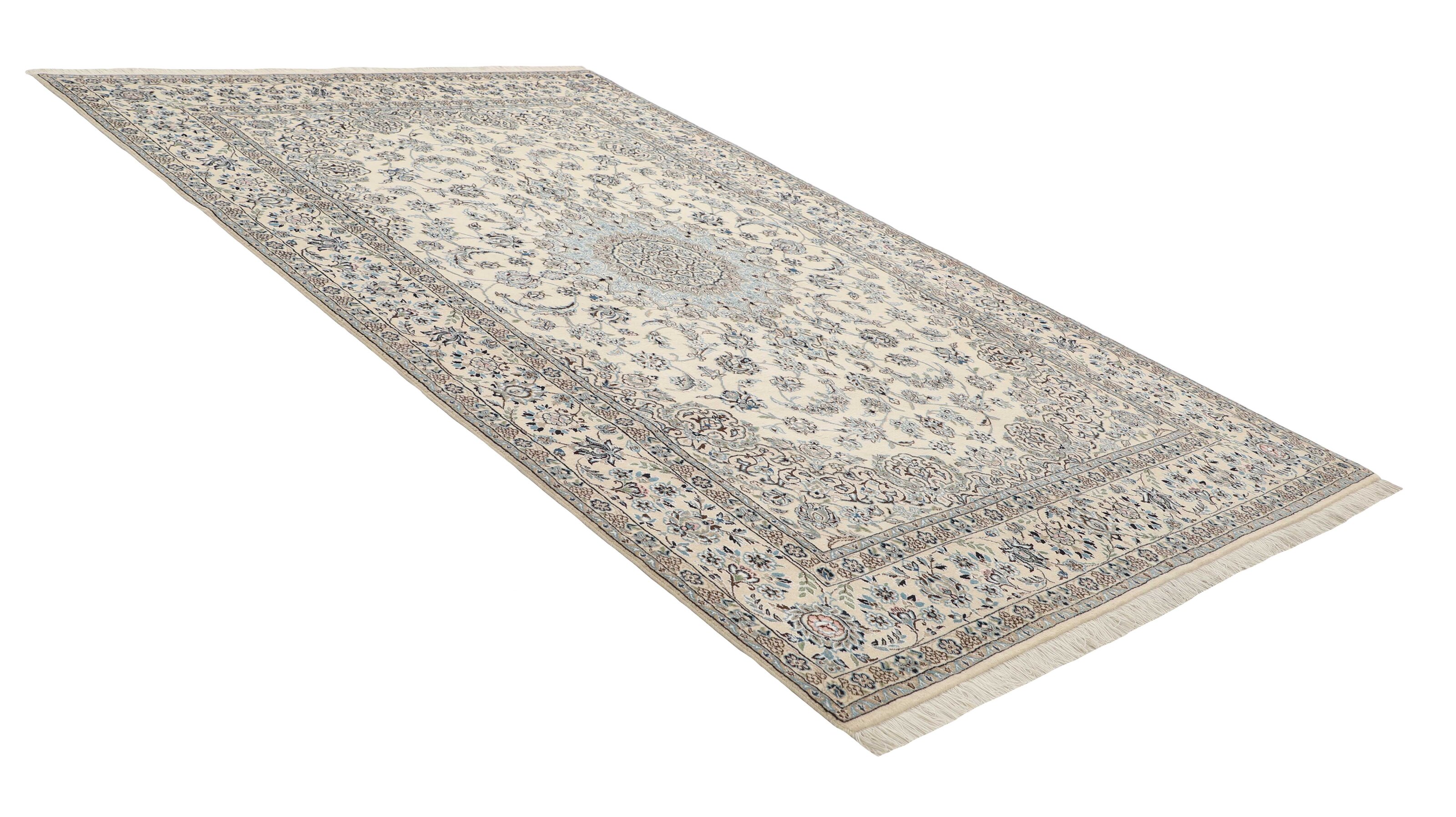 Nain 9 laItem no.: 1522464 Size: 198 cm x 302 cmNain is a city of about 50.000 people, located in the Isfahan Province. It has historic significance, since it was the last stop on caravan routes before Kavir-a-Lut, one of the deserts. The Nain Mosque is one of the oldest, and is built far better than the later and more famous mosques of Isfahan. The industry in Nain was traditionally focused on the production of wool garments, but the weavers switched to rug production when the demand fell. Their new products soon became famous, as the weavers were skilled and used good quality materials. The warp and weft are cotton, with a wool pile and contours of silk. Sometimes, silk is used more in the base. The colours are refined; nuances of ivory and cream, with small areas of red, green, and blue. As with the rugs from Isfahan, the patterns of the Nain rugs are also classical. The Nain rugs are made in all sizes, including the very large of up to 60m2, and some of these have a pure silk pile. The largest Nain rug produced was 20 by 20 metres.