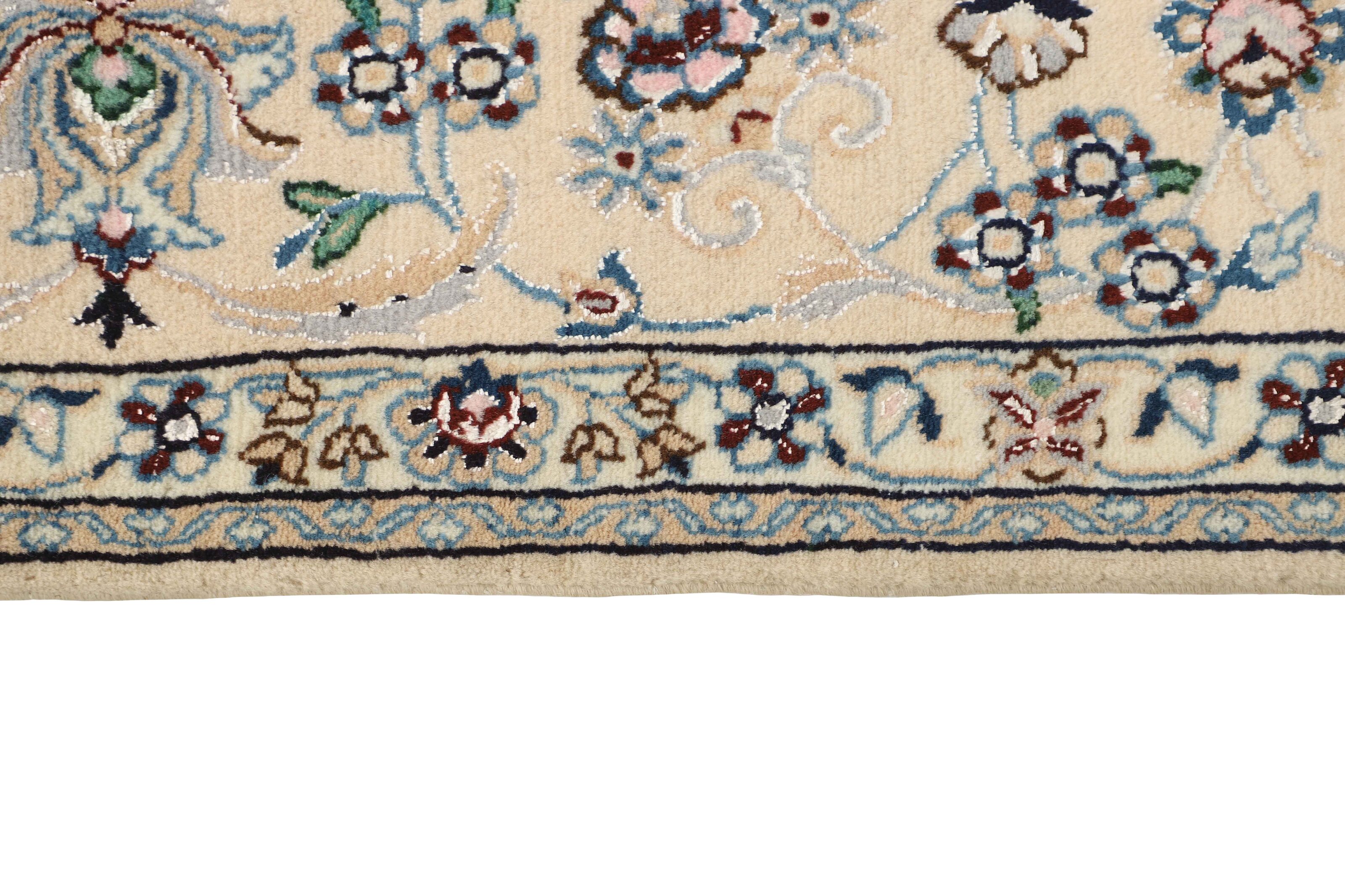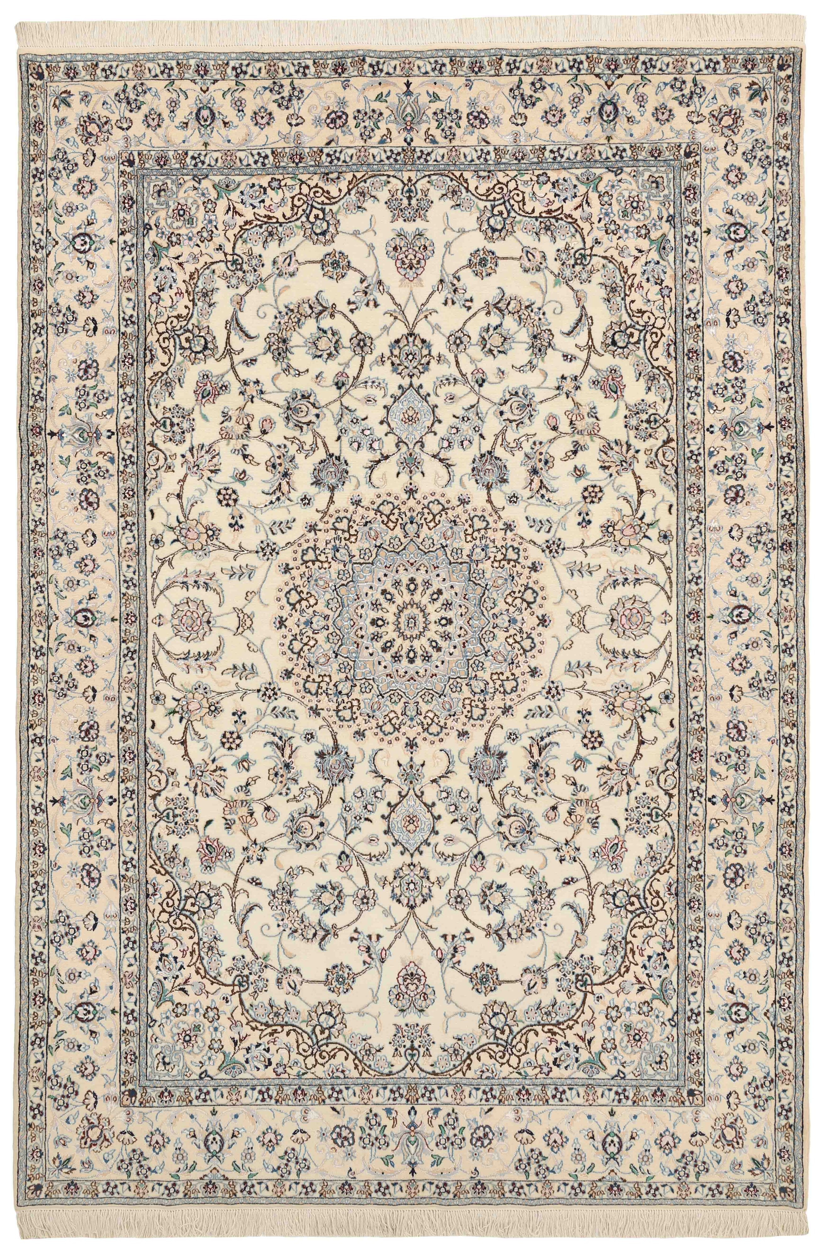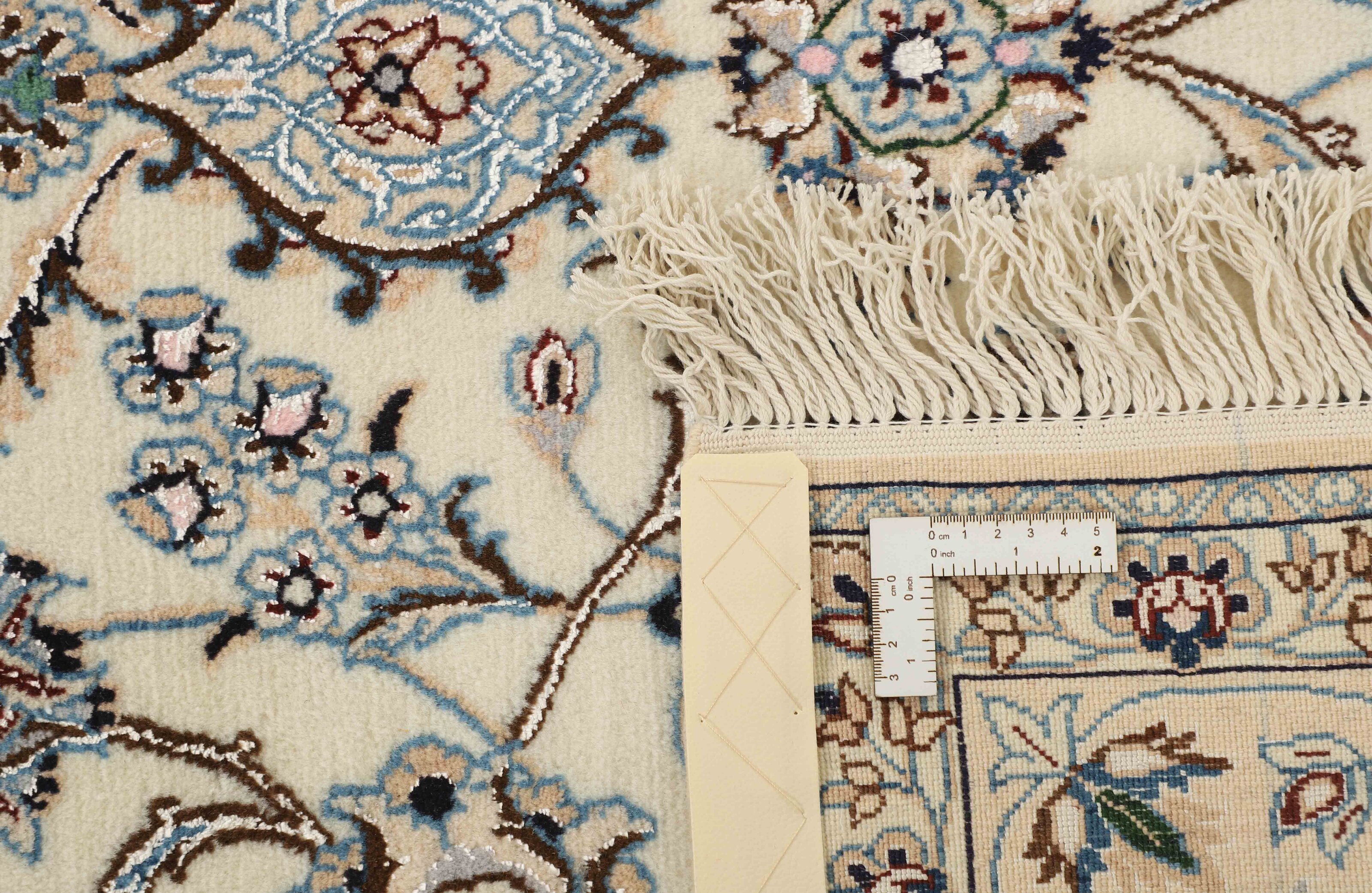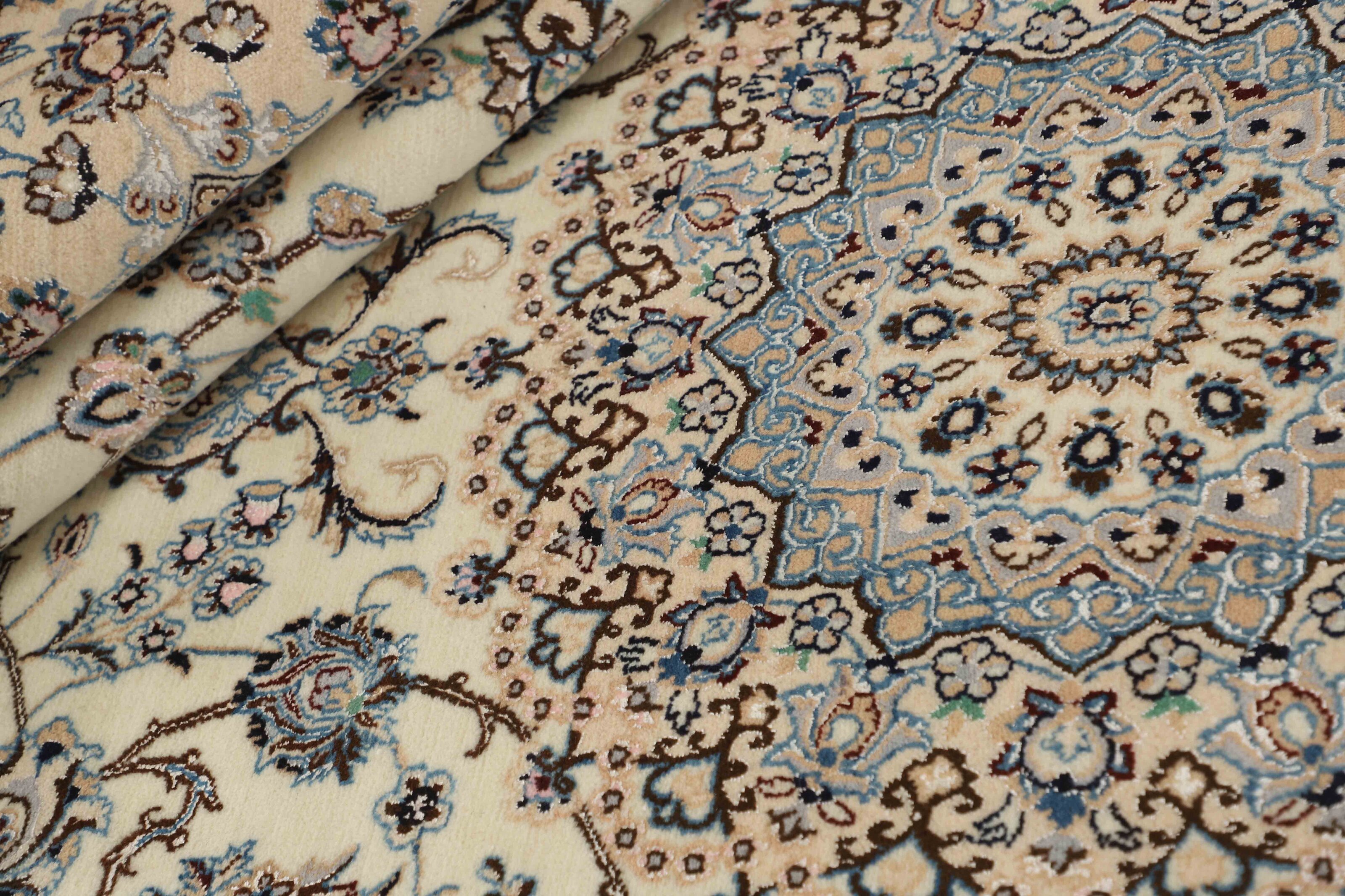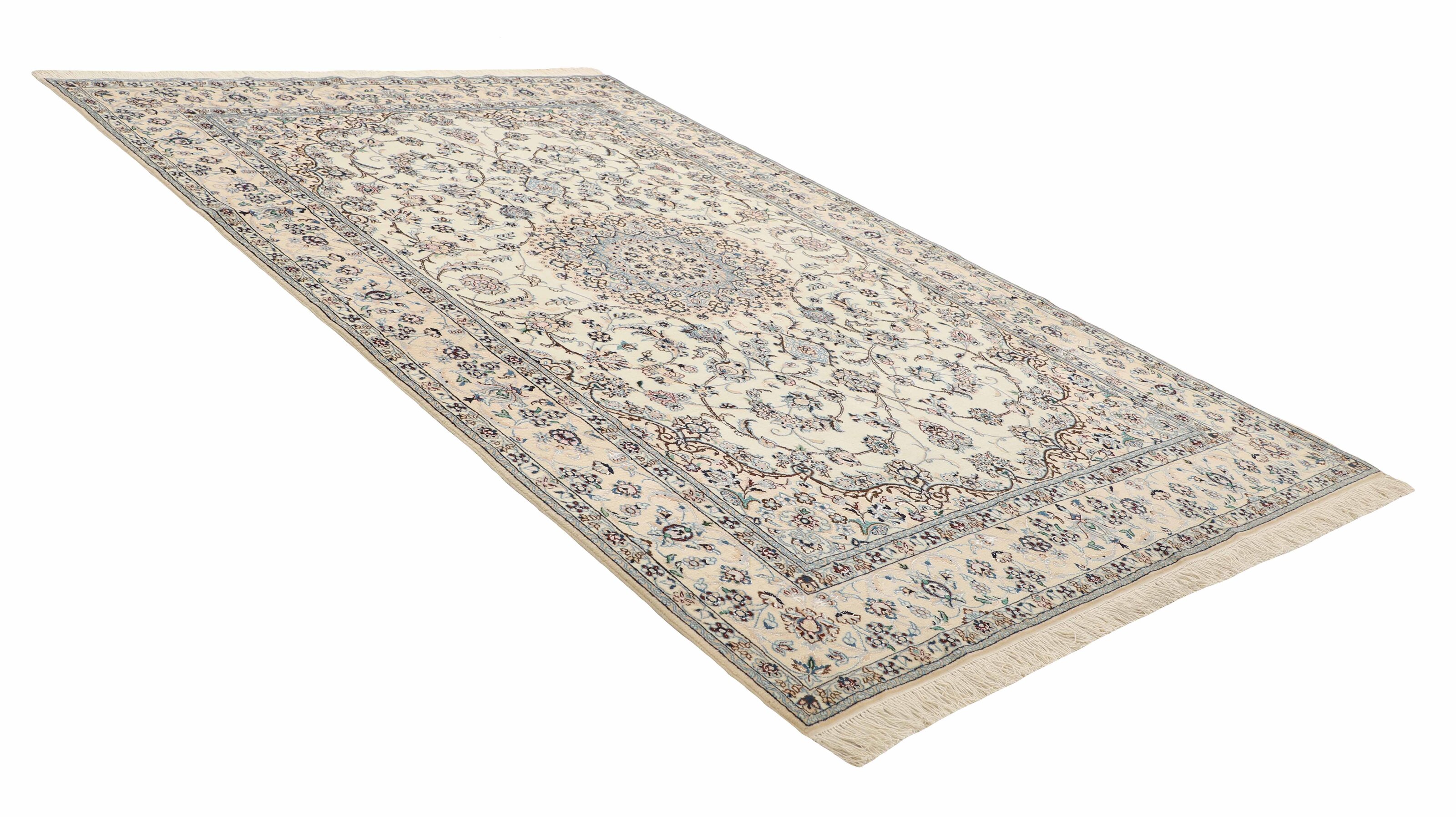 Nain 9 laItem no.: 1522466 Size: 201 cm x 298 cmNain is a city of about 50.000 people, located in the Isfahan Province. It has historic significance, since it was the last stop on caravan routes before Kavir-a-Lut, one of the deserts. The Nain Mosque is one of the oldest, and is built far better than the later and more famous mosques of Isfahan. The industry in Nain was traditionally focused on the production of wool garments, but the weavers switched to rug production when the demand fell. Their new products soon became famous, as the weavers were skilled and used good quality materials. The warp and weft are cotton, with a wool pile and contours of silk. Sometimes, silk is used more in the base. The colours are refined; nuances of ivory and cream, with small areas of red, green, and blue. As with the rugs from Isfahan, the patterns of the Nain rugs are also classical. The Nain rugs are made in all sizes, including the very large of up to 60m2, and some of these have a pure silk pile. The largest Nain rug produced was 20 by 20 metres.