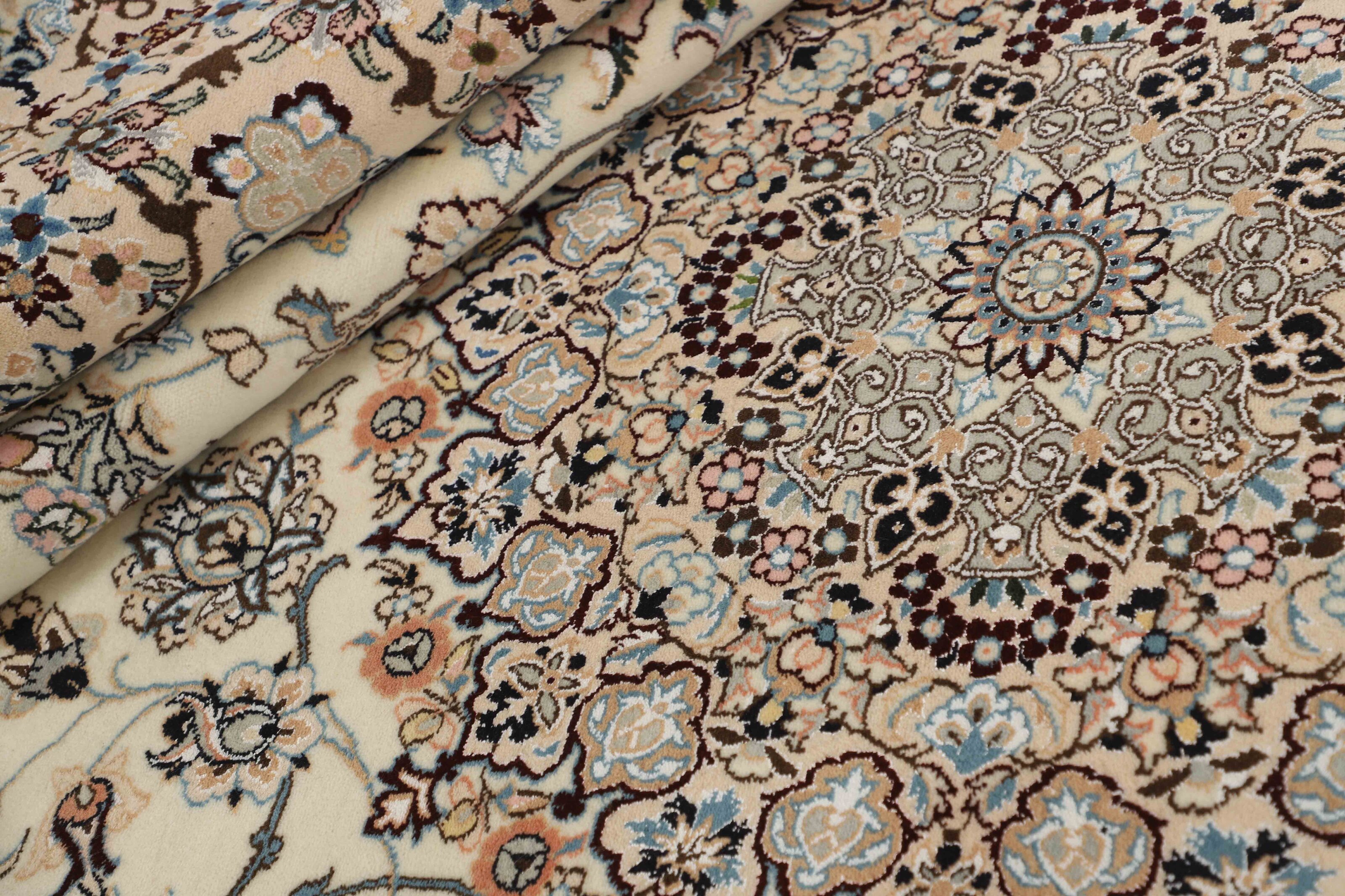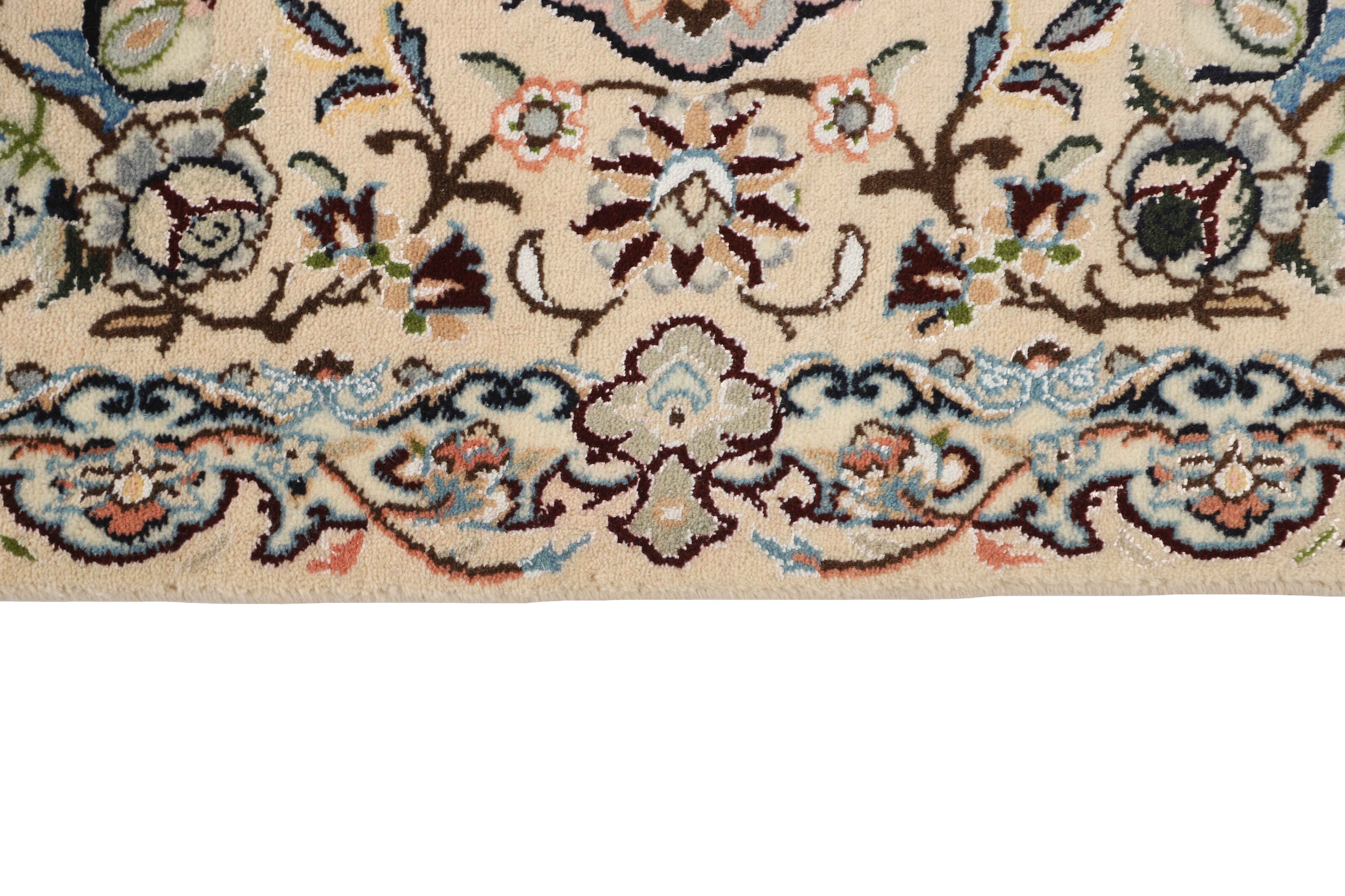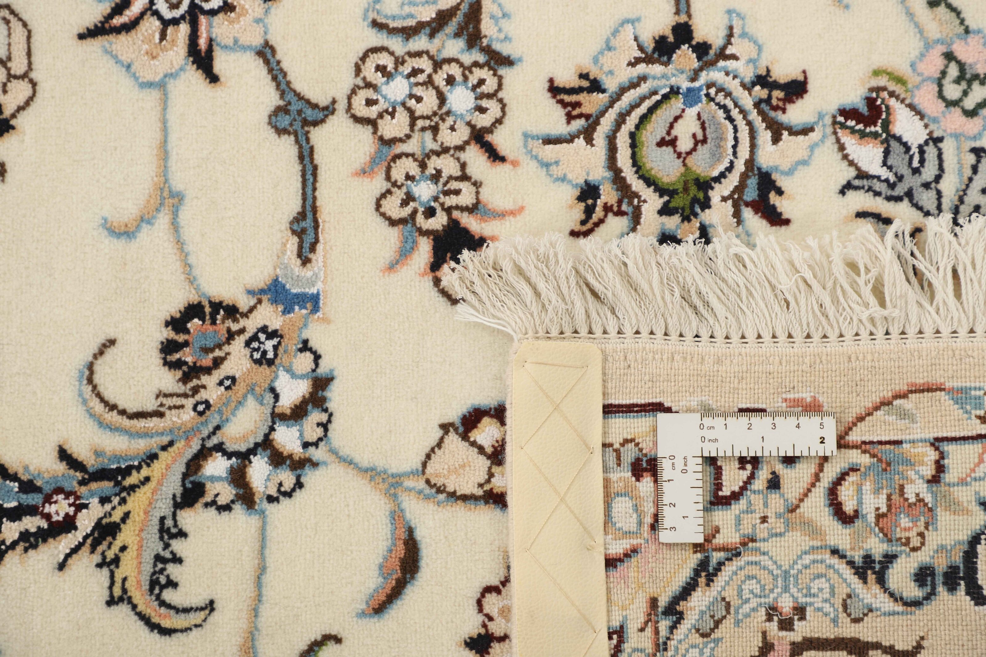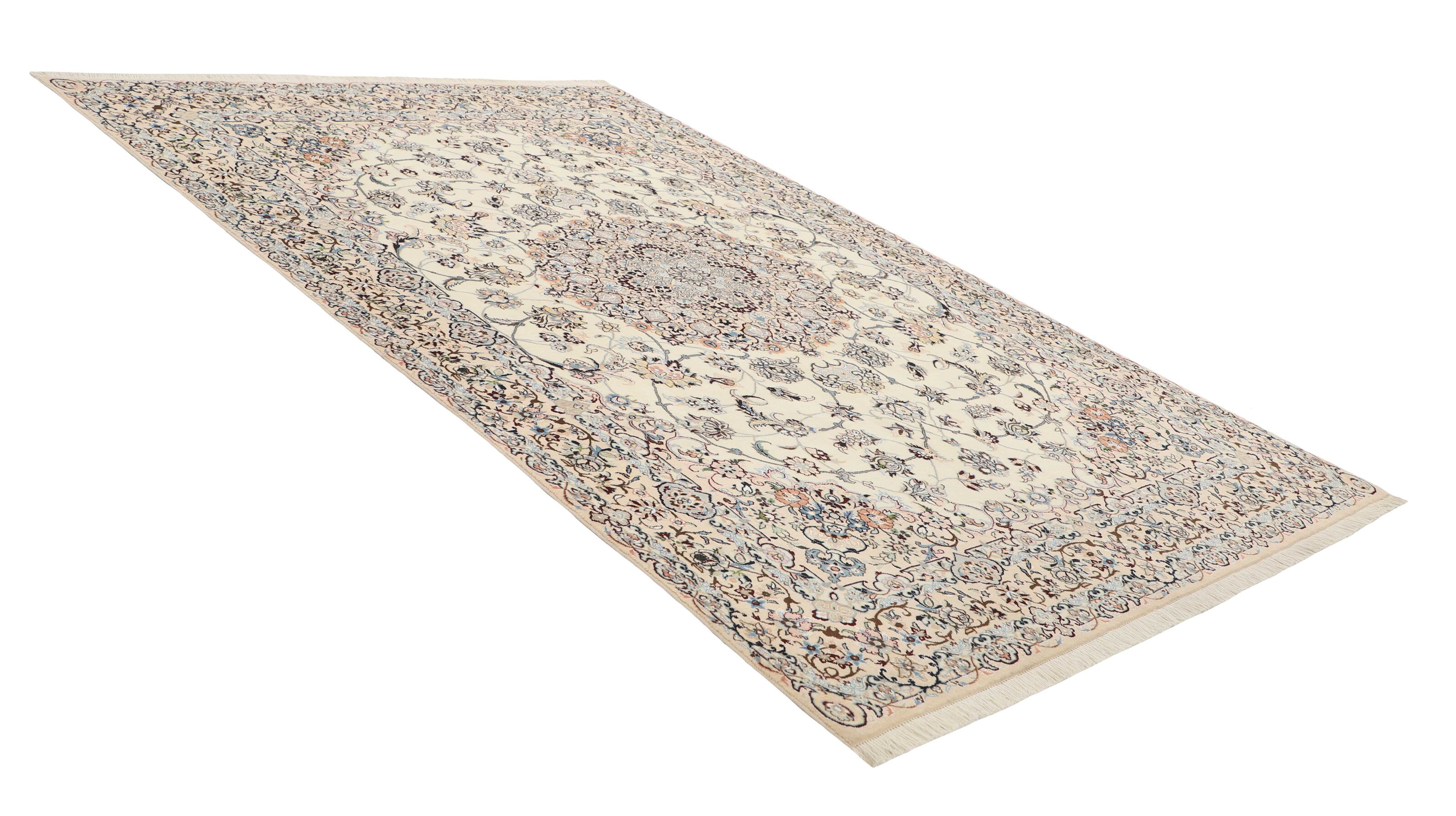 Nain 9 laItem no.: 1522468 Size: 205 cm x 308 cmNain is a city of about 50.000 people, located in the Isfahan Province. It has historic significance, since it was the last stop on caravan routes before Kavir-a-Lut, one of the deserts. The Nain Mosque is one of the oldest, and is built far better than the later and more famous mosques of Isfahan. The industry in Nain was traditionally focused on the production of wool garments, but the weavers switched to rug production when the demand fell. Their new products soon became famous, as the weavers were skilled and used good quality materials. The warp and weft are cotton, with a wool pile and contours of silk. Sometimes, silk is used more in the base. The colours are refined; nuances of ivory and cream, with small areas of red, green, and blue. As with the rugs from Isfahan, the patterns of the Nain rugs are also classical. The Nain rugs are made in all sizes, including the very large of up to 60m2, and some of these have a pure silk pile. The largest Nain rug produced was 20 by 20 metres.