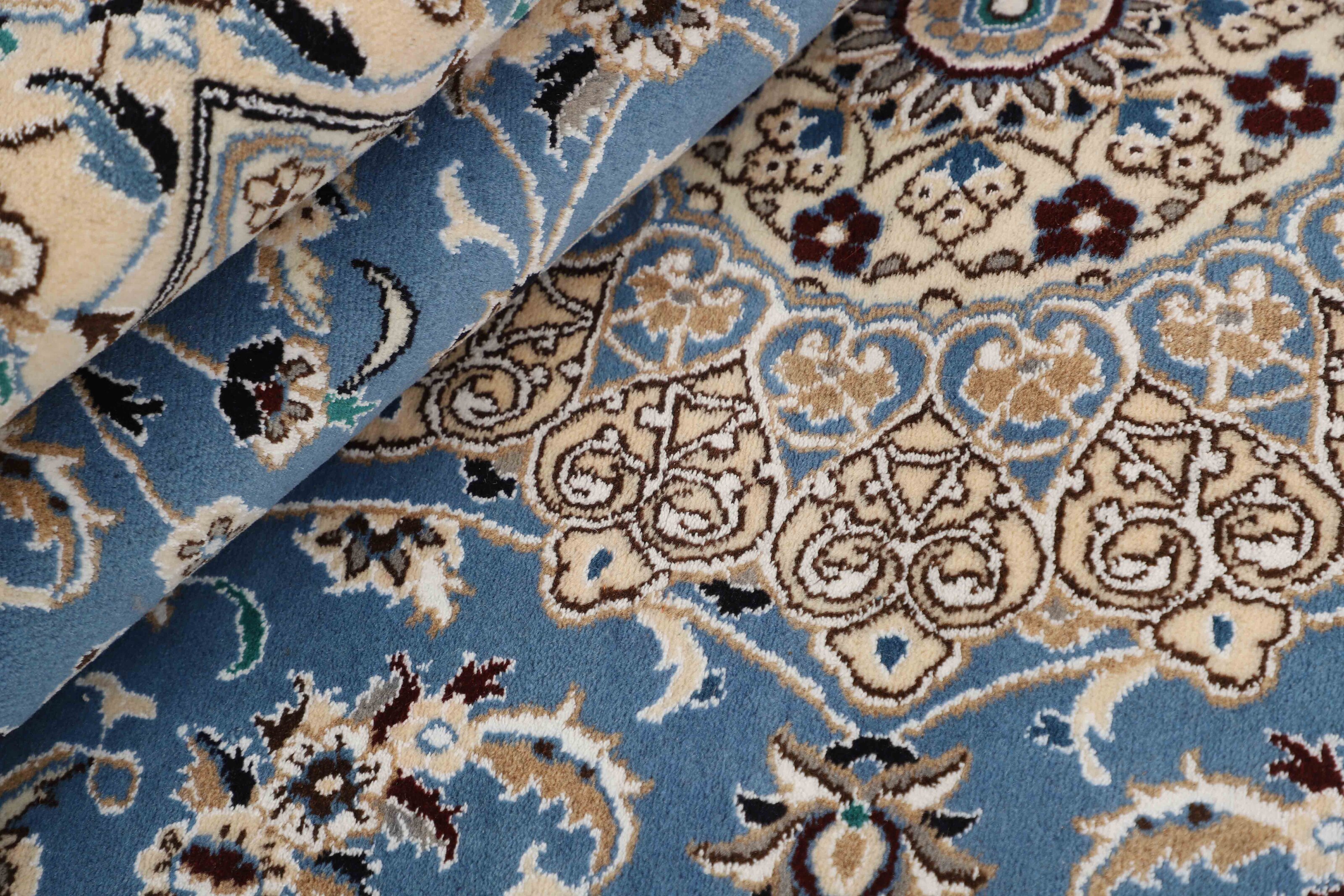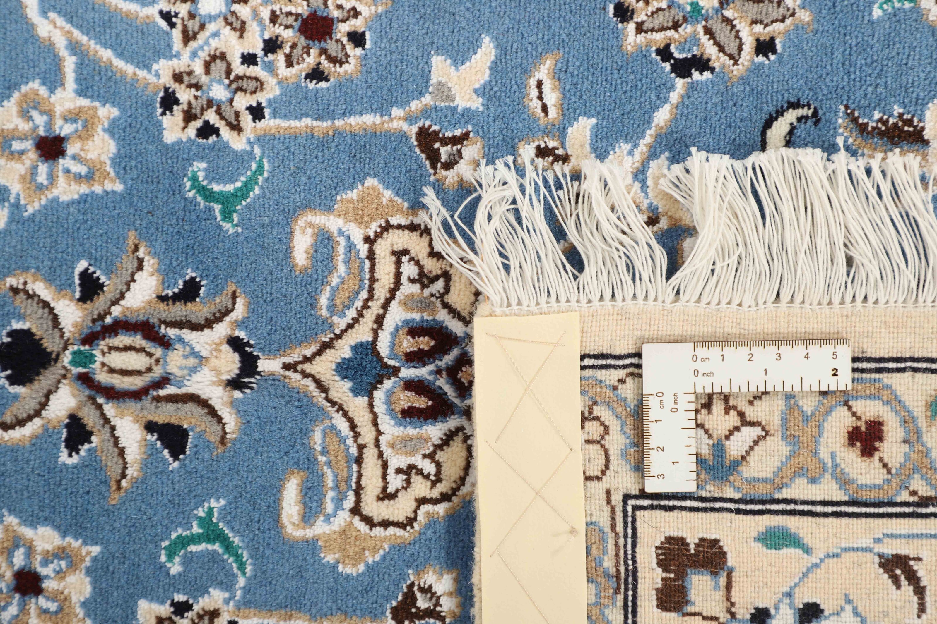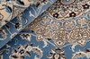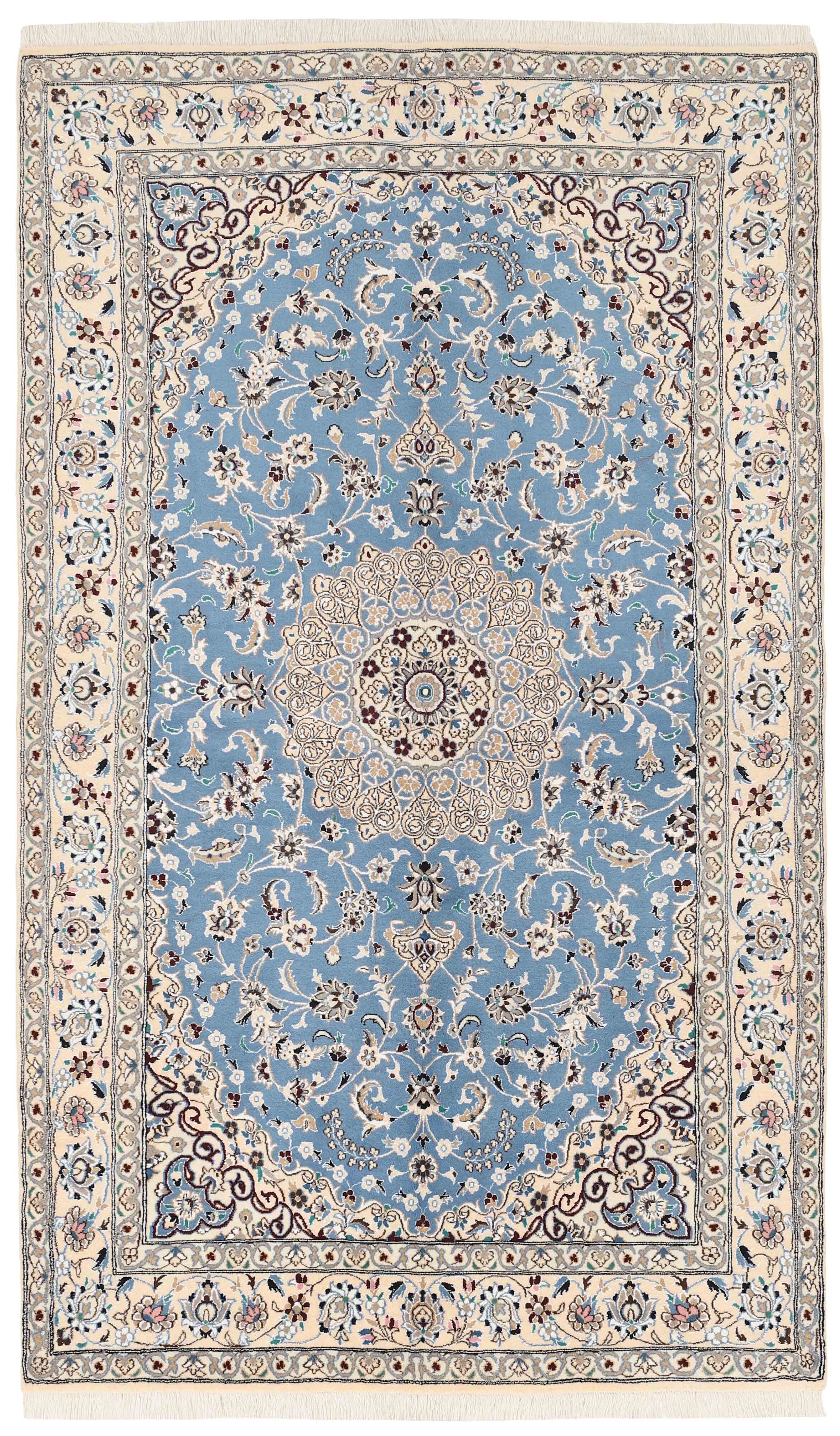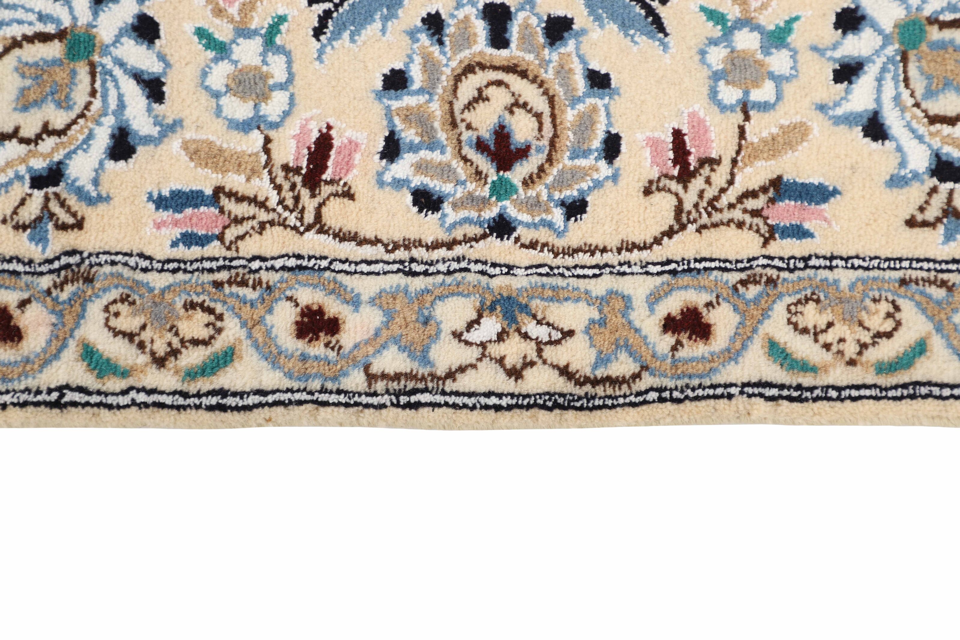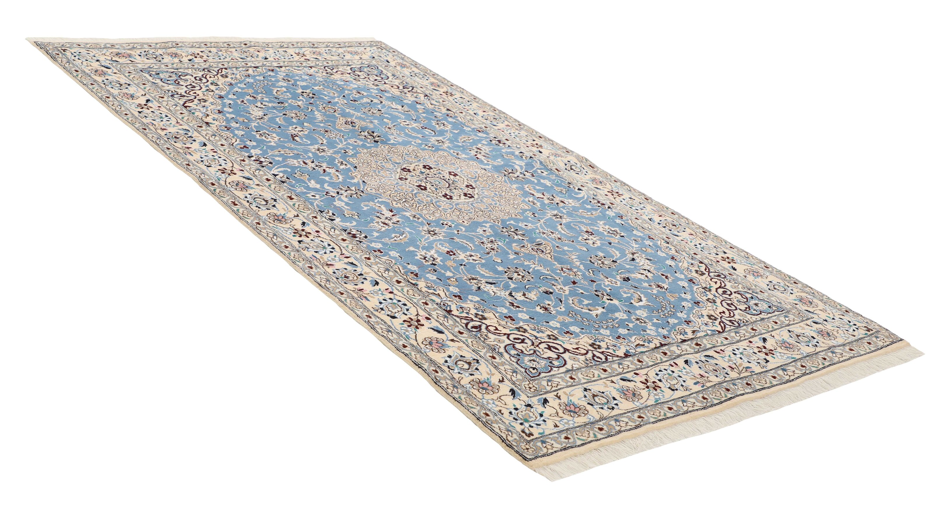 Nain 9 laItem no.: 1522469 Size: 150 cm x 250 cmNain is a city of about 50.000 people, located in the Isfahan Province. It has historic significance, since it was the last stop on caravan routes before Kavir-a-Lut, one of the deserts. The Nain Mosque is one of the oldest, and is built far better than the later and more famous mosques of Isfahan. The industry in Nain was traditionally focused on the production of wool garments, but the weavers switched to rug production when the demand fell. Their new products soon became famous, as the weavers were skilled and used good quality materials. The warp and weft are cotton, with a wool pile and contours of silk. Sometimes, silk is used more in the base. The colours are refined; nuances of ivory and cream, with small areas of red, green, and blue. As with the rugs from Isfahan, the patterns of the Nain rugs are also classical. The Nain rugs are made in all sizes, including the very large of up to 60m2, and some of these have a pure silk pile. The largest Nain rug produced was 20 by 20 metres.