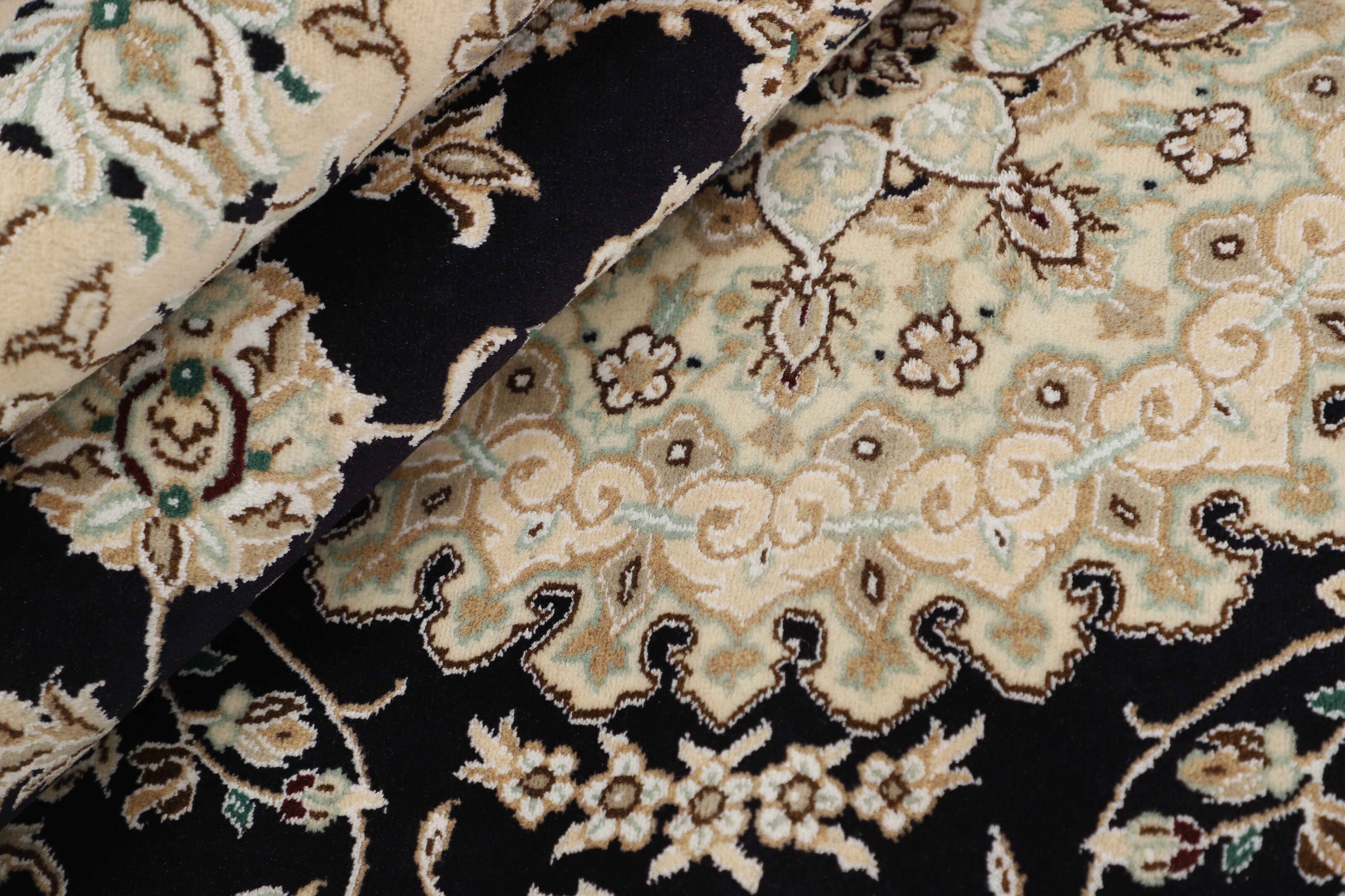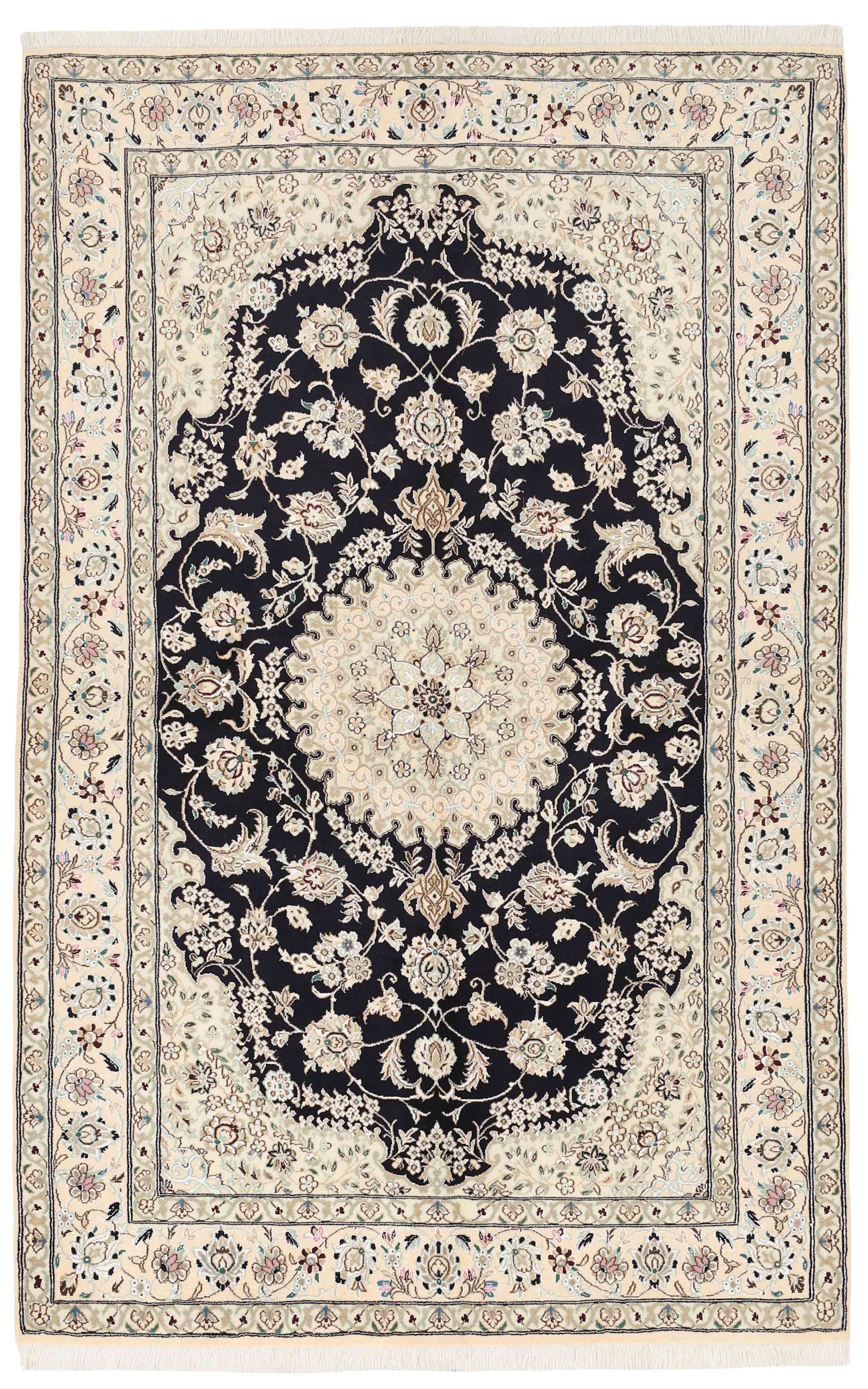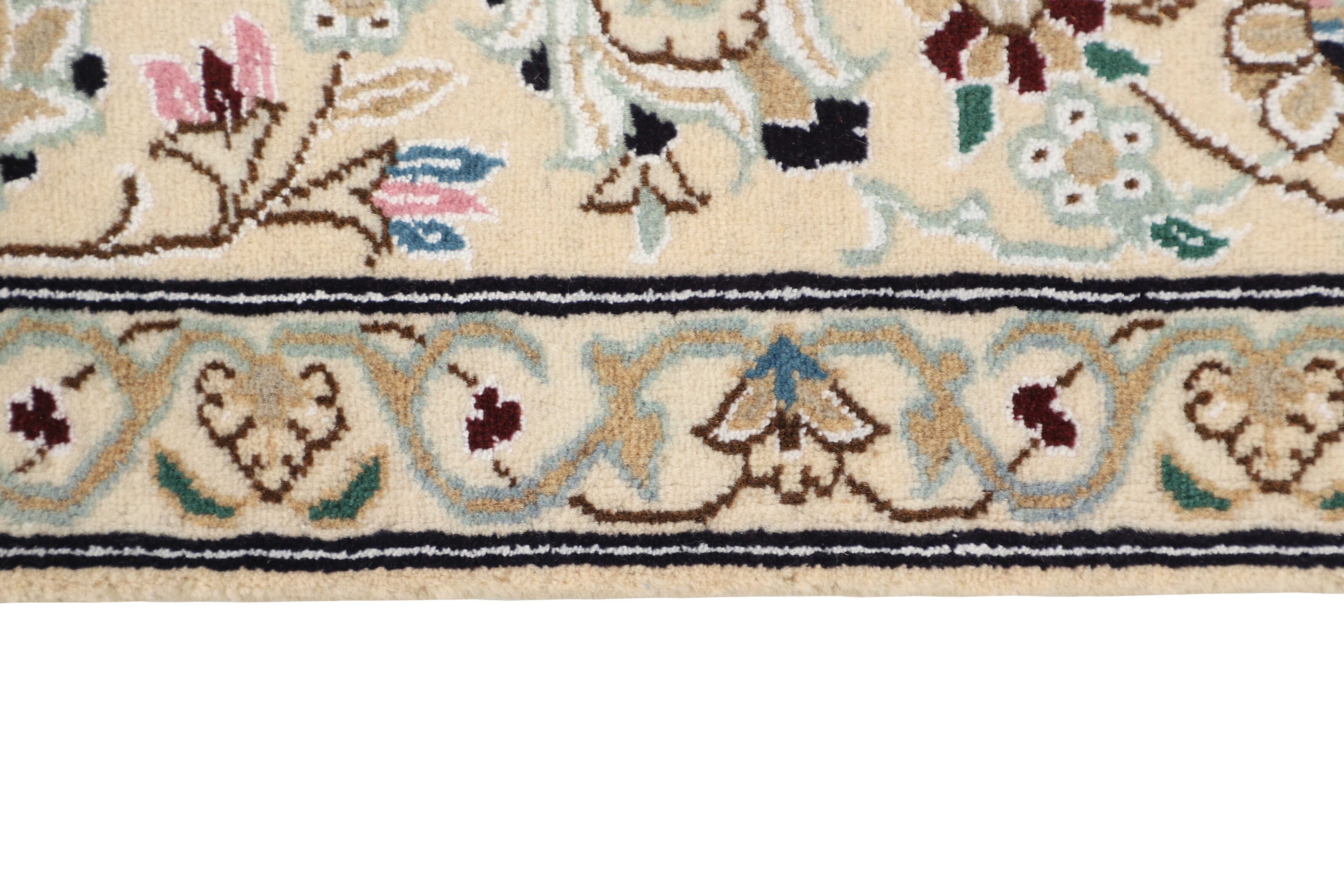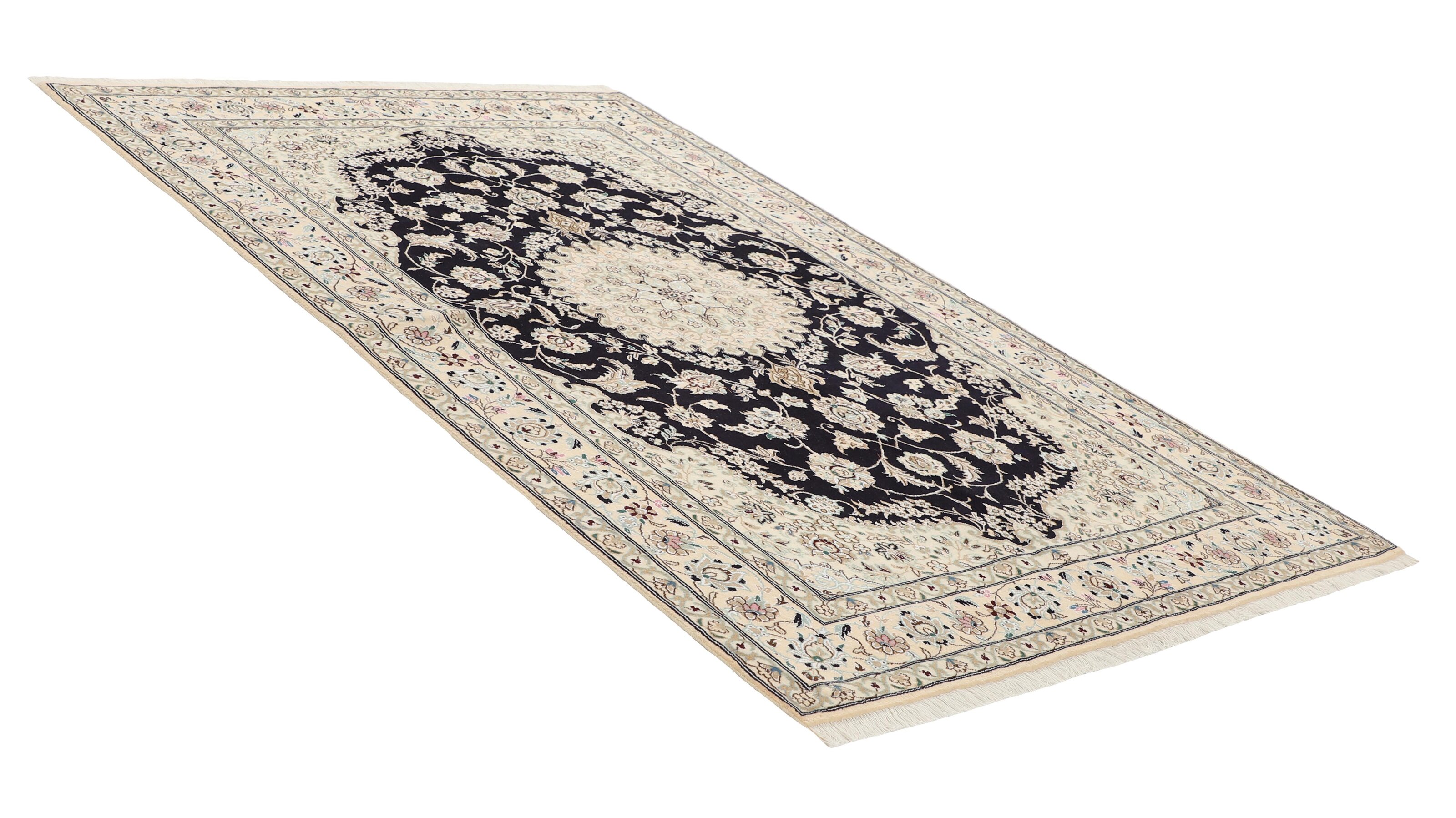 Nain 9 laItem no.: 1522473 Size: 158 cm x 247 cmNain is a city of about 50.000 people, located in the Isfahan Province. It has historic significance, since it was the last stop on caravan routes before Kavir-a-Lut, one of the deserts. The Nain Mosque is one of the oldest, and is built far better than the later and more famous mosques of Isfahan. The industry in Nain was traditionally focused on the production of wool garments, but the weavers switched to rug production when the demand fell. Their new products soon became famous, as the weavers were skilled and used good quality materials. The warp and weft are cotton, with a wool pile and contours of silk. Sometimes, silk is used more in the base. The colours are refined; nuances of ivory and cream, with small areas of red, green, and blue. As with the rugs from Isfahan, the patterns of the Nain rugs are also classical. The Nain rugs are made in all sizes, including the very large of up to 60m2, and some of these have a pure silk pile. The largest Nain rug produced was 20 by 20 metres.