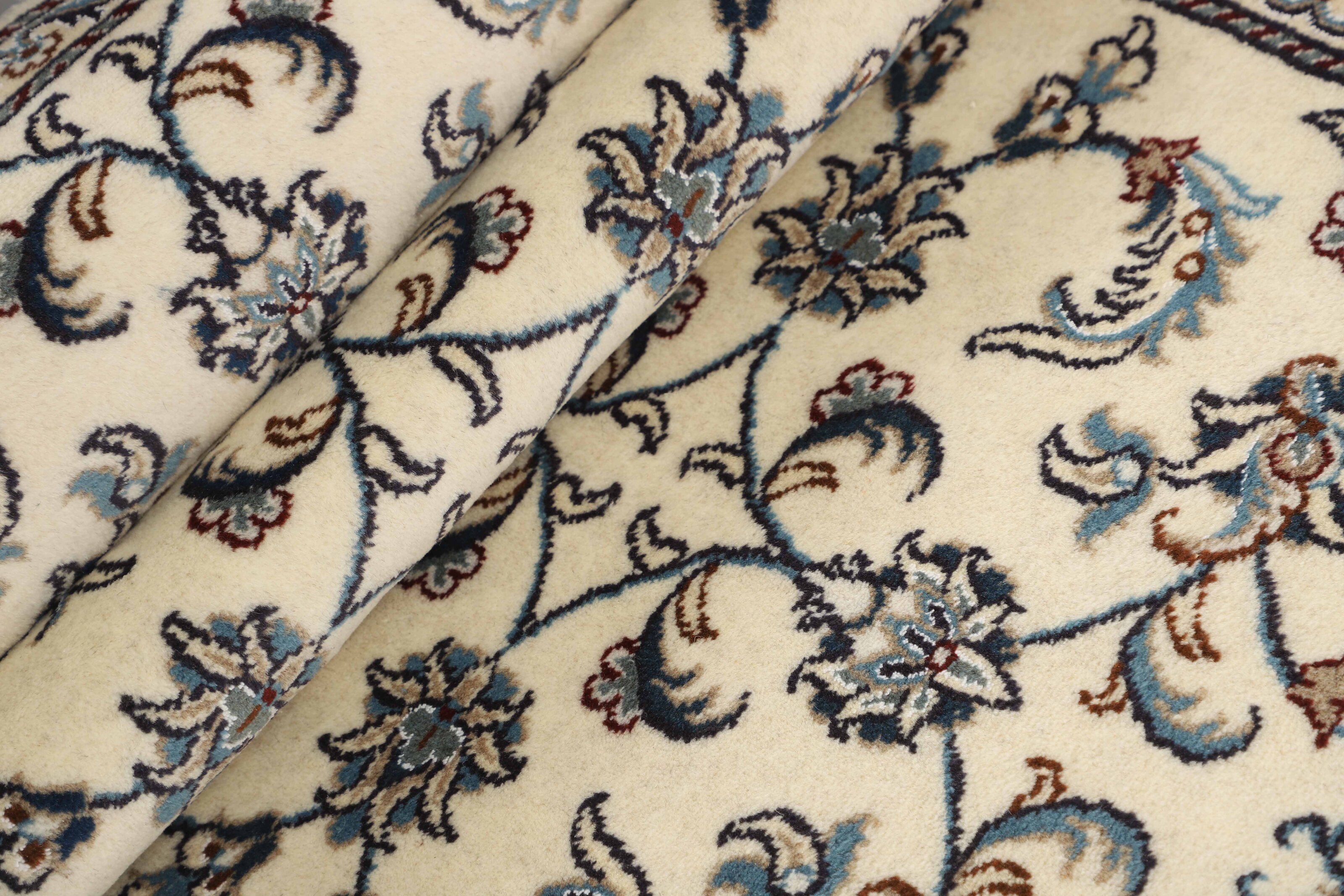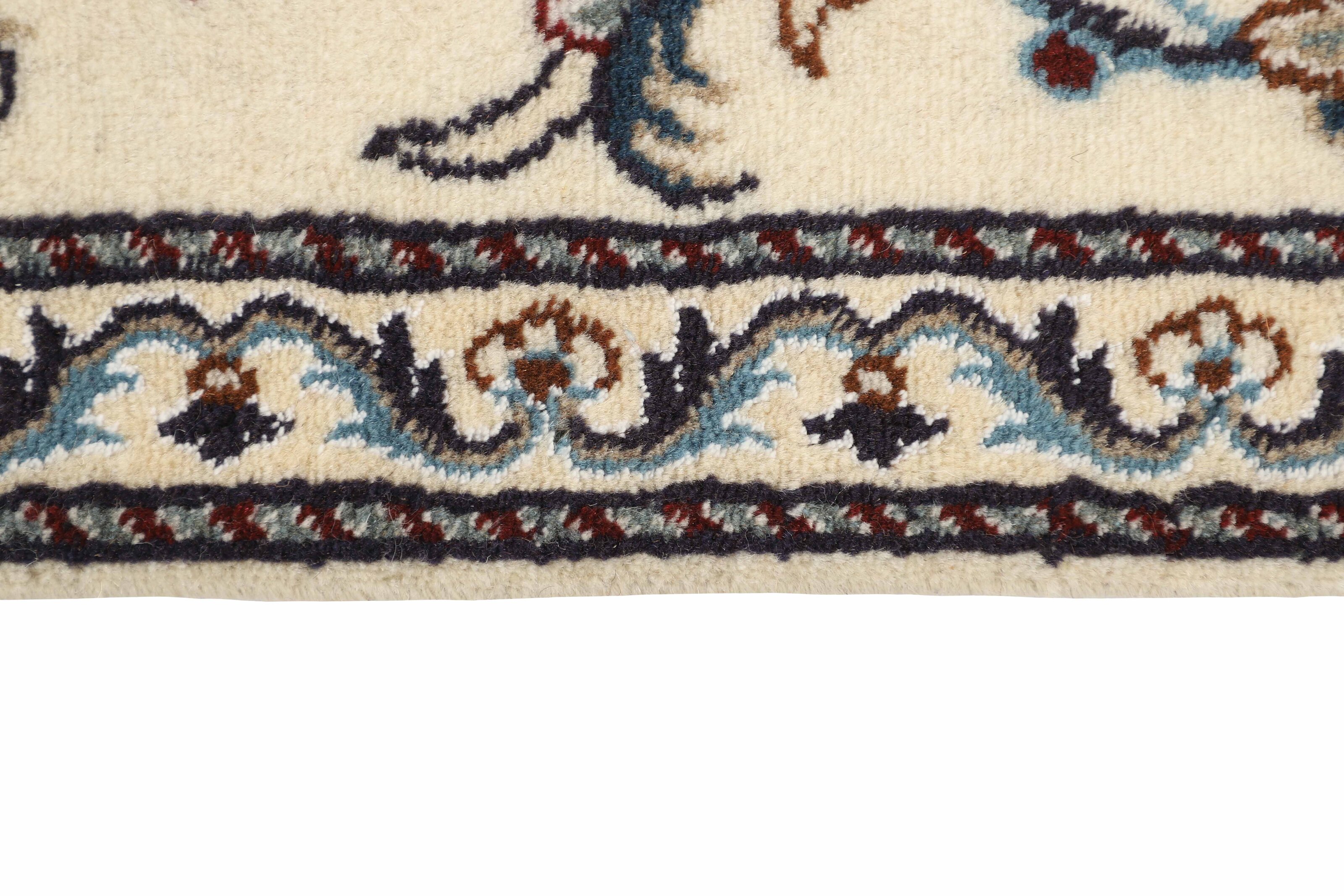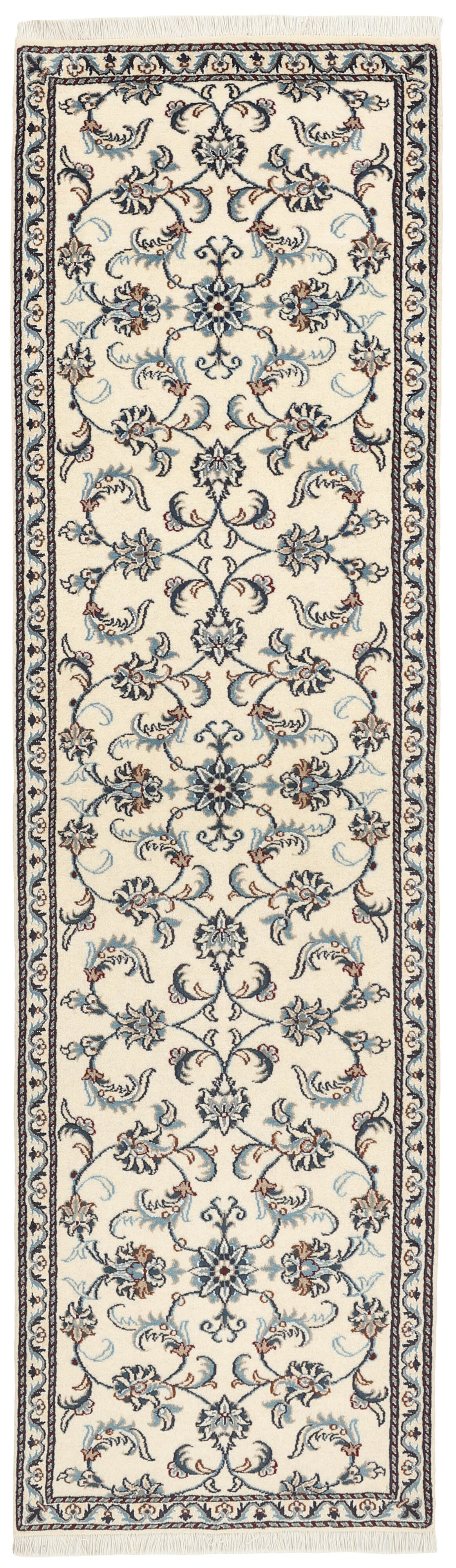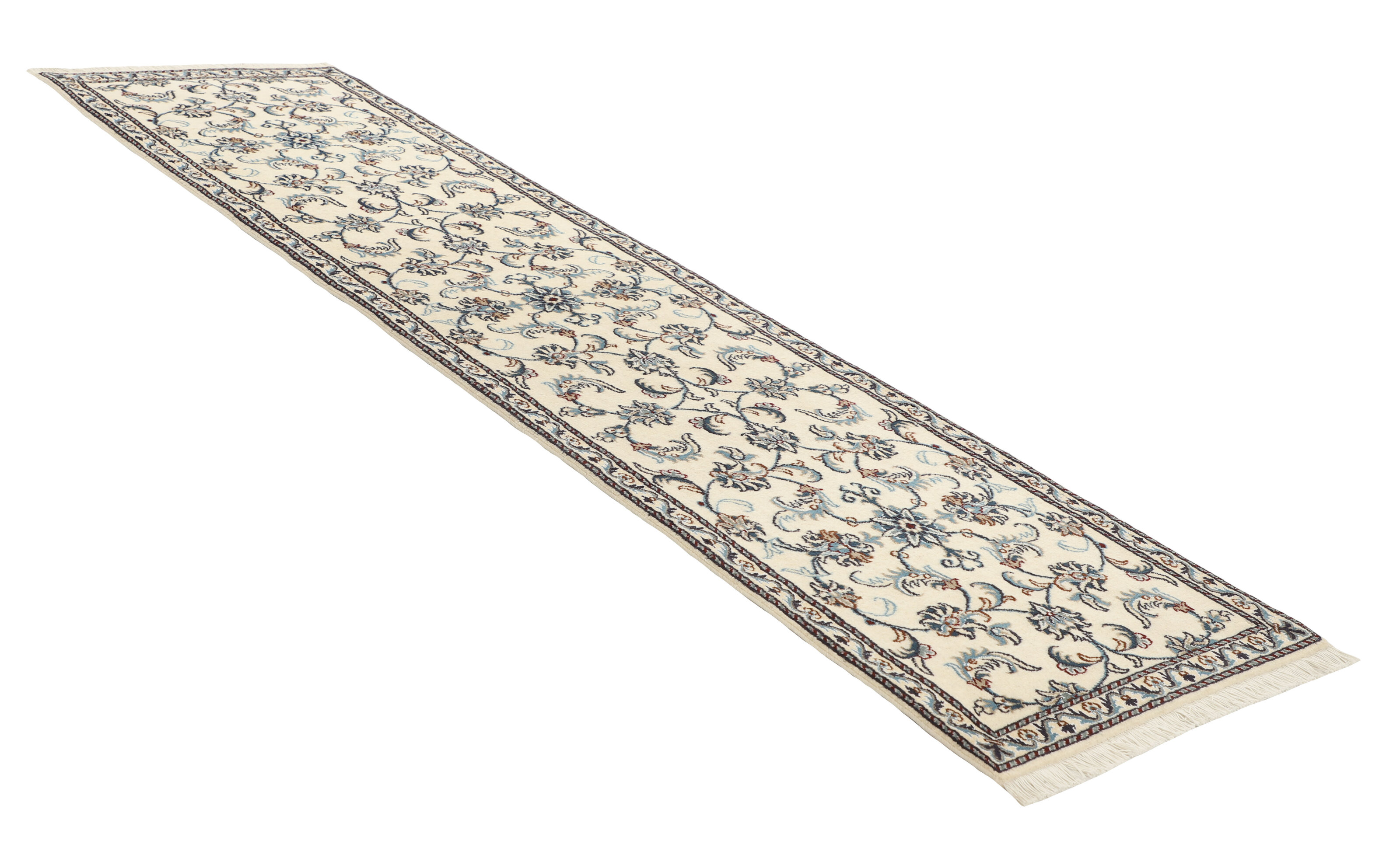 Nain KashmarItem no.: 1519741 Size: 80 cm x 293 cmNain is a city of about 50.000 people, located in the Isfahan Province. It has historic significance, since it was the last stop on caravan routes before Kavir-a-Lut, one of the deserts that stretch through the centre of Iran. The Nain Mosque is one of Iran’s oldest, and is built far better than the later and more famous mosques of Isfahan. The industry in Nain was traditionally focused on the production of wool garments, but the weavers switched to rug production when the demand fell. Their new products soon became famous, as the weavers were skilled and used good quality materials. The warp and weft are cotton, with a wool pile and contours of silk. Sometimes, silk is used more in the base. The colours are refined; nuances of ivory and cream, with small areas of red, green, and blue. As with the rugs from Isfahan, the patterns of the Nain rugs are also classical. The Nain rugs are made in all sizes, including the very large of up to 60m2, and some of these have a pure silk pile. The largest Nain rug produced was 20 by 20 metres.