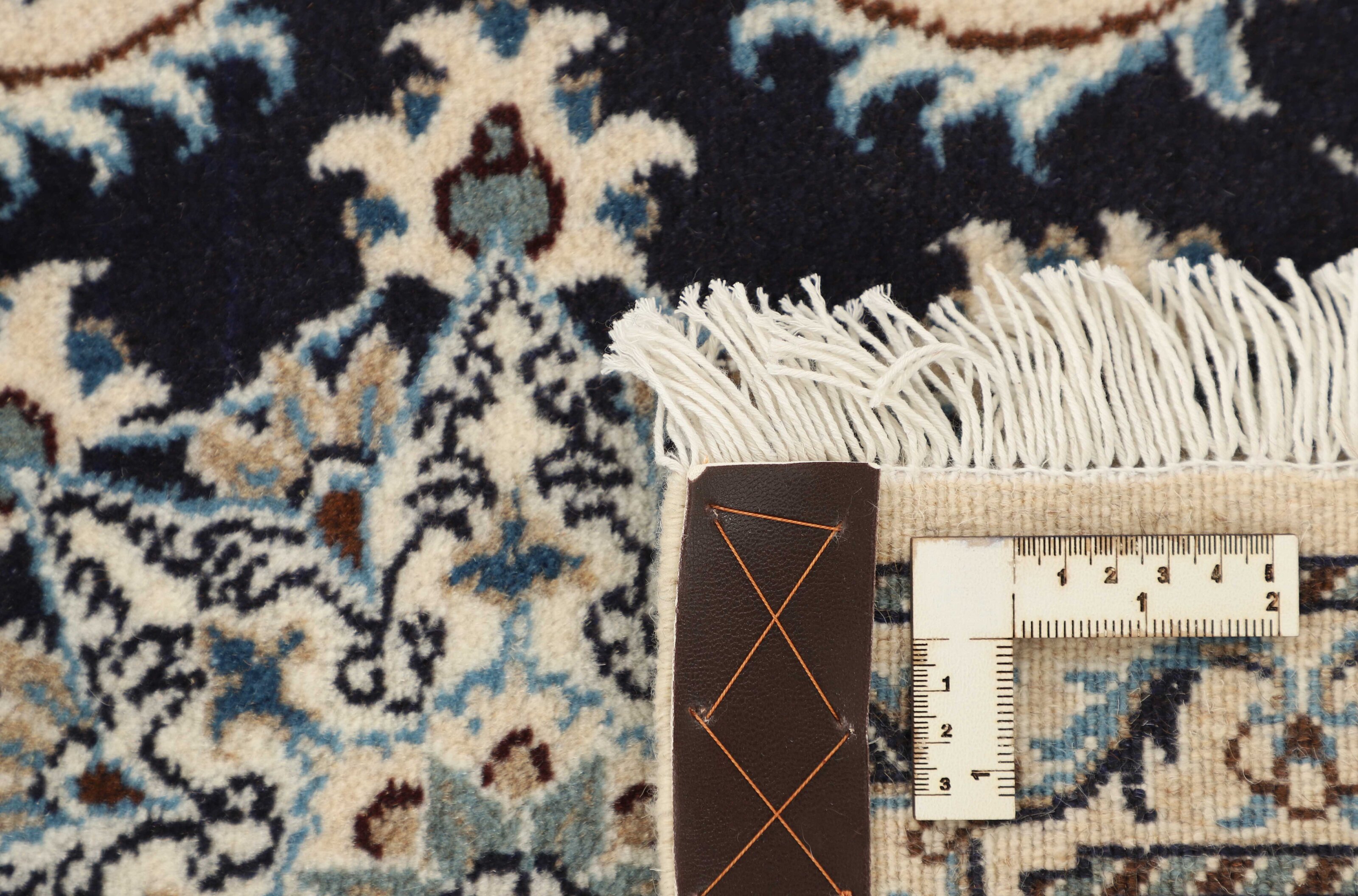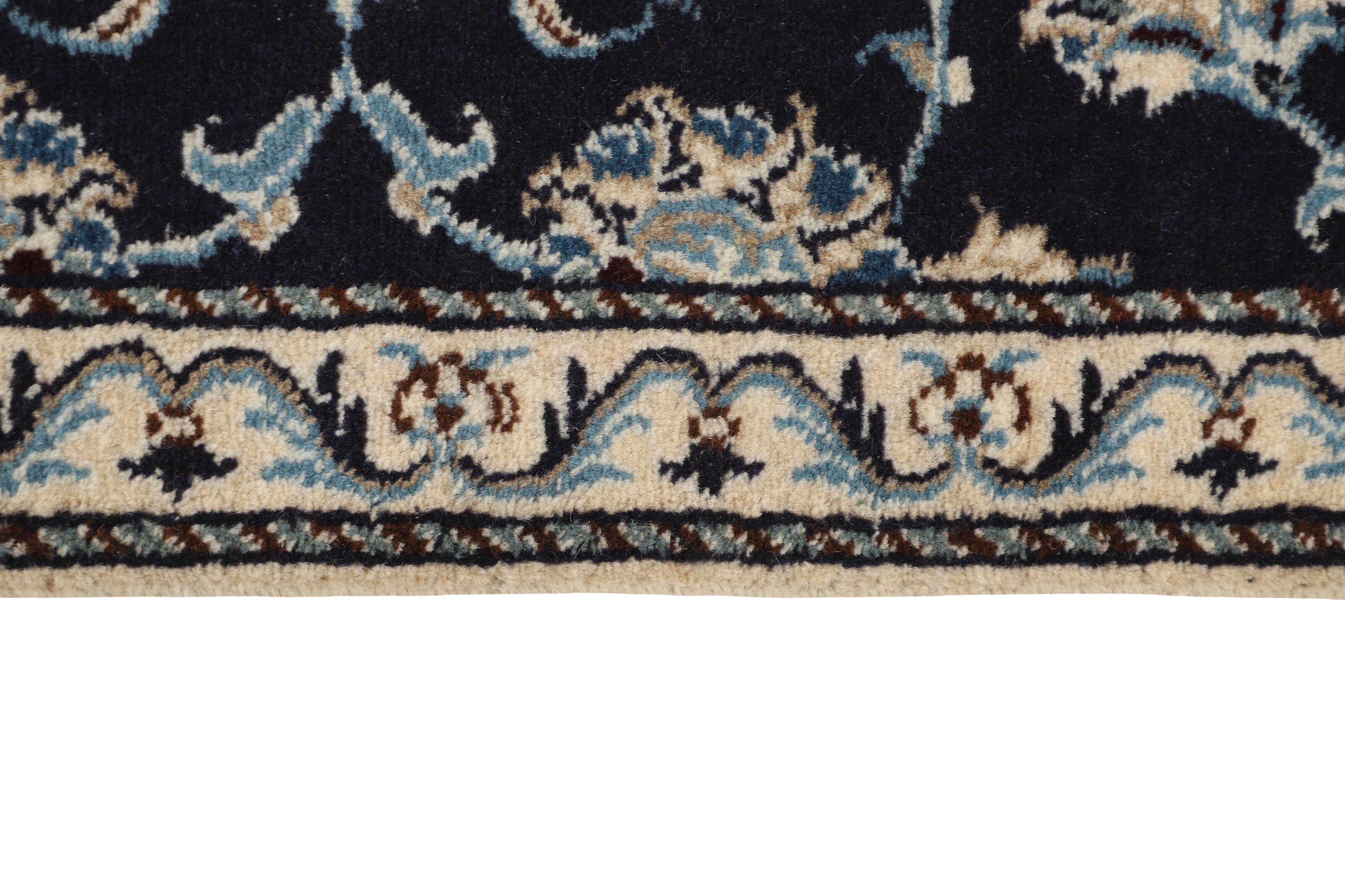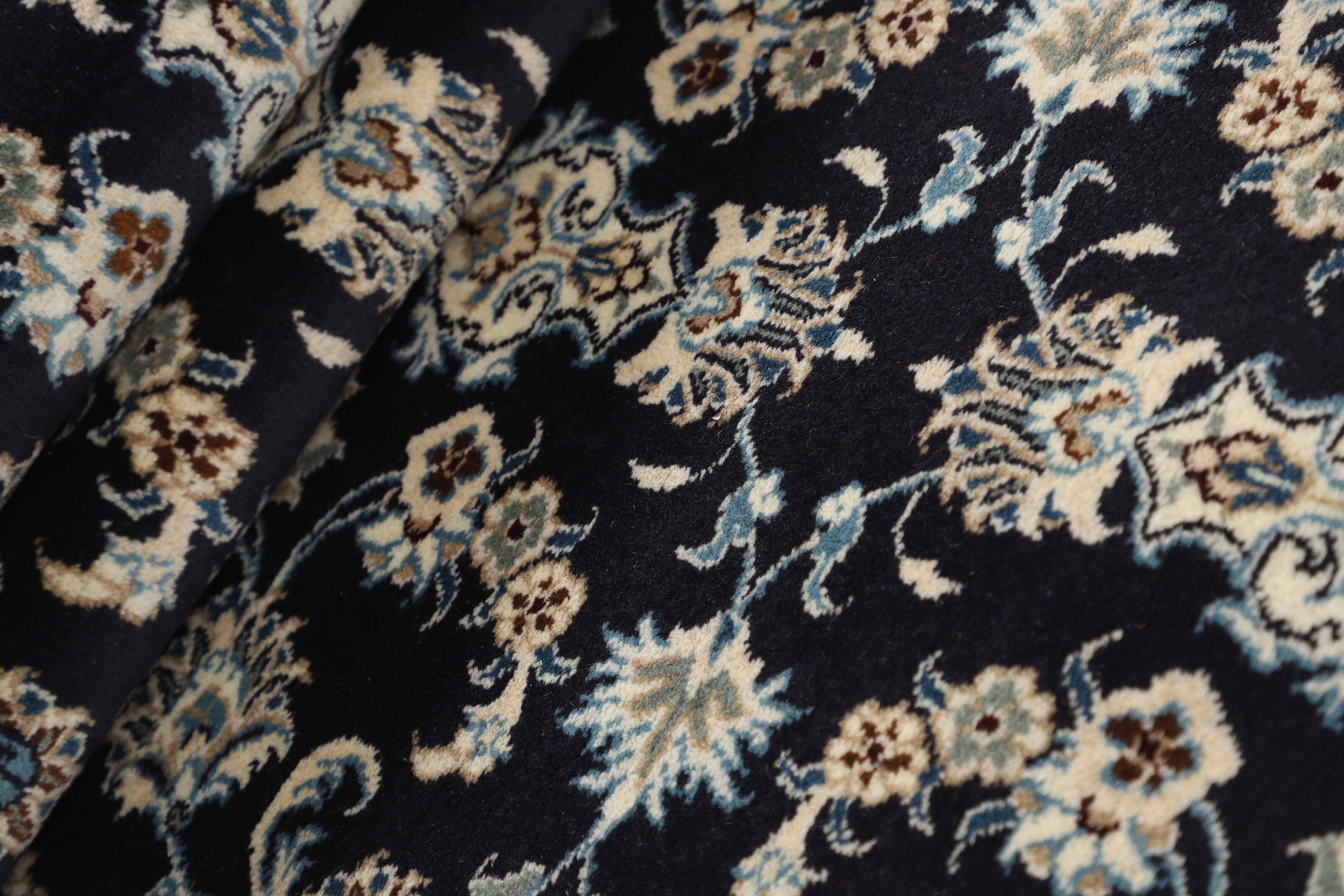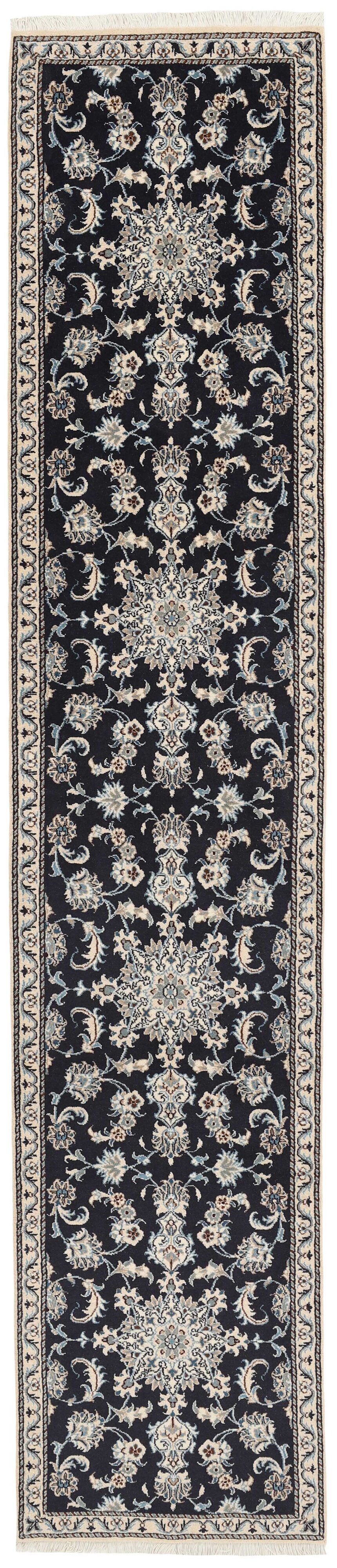 Nain KashmarItem no.: 1519745 Size: 78 cm x 385 cmNain is a city of about 50.000 people, located in the Isfahan Province. It has historic significance, since it was the last stop on caravan routes before Kavir-a-Lut, one of the deserts that stretch through the centre of Iran. The Nain Mosque is one of Iran’s oldest, and is built far better than the later and more famous mosques of Isfahan. The industry in Nain was traditionally focused on the production of wool garments, but the weavers switched to rug production when the demand fell. Their new products soon became famous, as the weavers were skilled and used good quality materials. The warp and weft are cotton, with a wool pile and contours of silk. Sometimes, silk is used more in the base. The colours are refined; nuances of ivory and cream, with small areas of red, green, and blue. As with the rugs from Isfahan, the patterns of the Nain rugs are also classical. The Nain rugs are made in all sizes, including the very large of up to 60m2, and some of these have a pure silk pile. The largest Nain rug produced was 20 by 20 metres.
