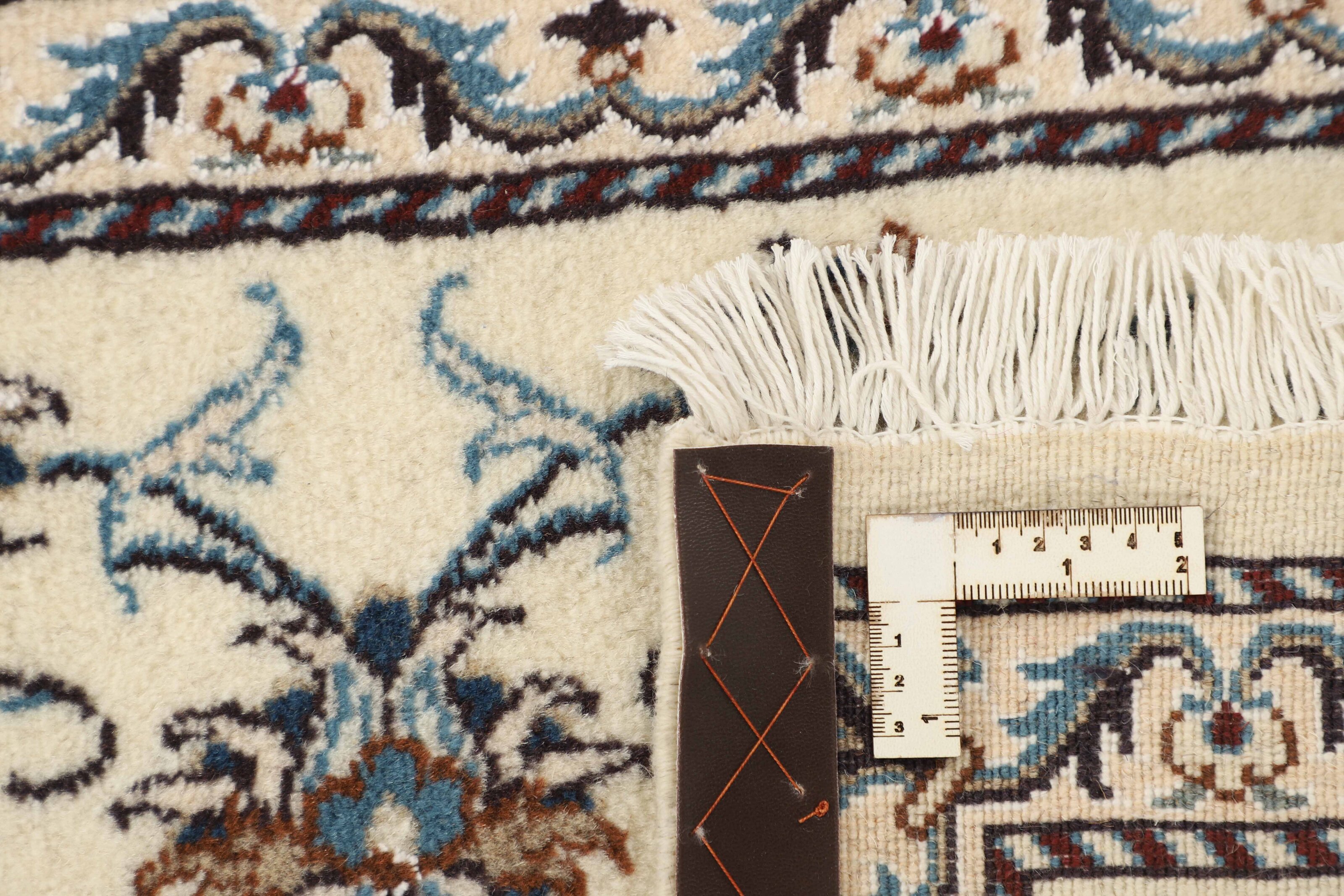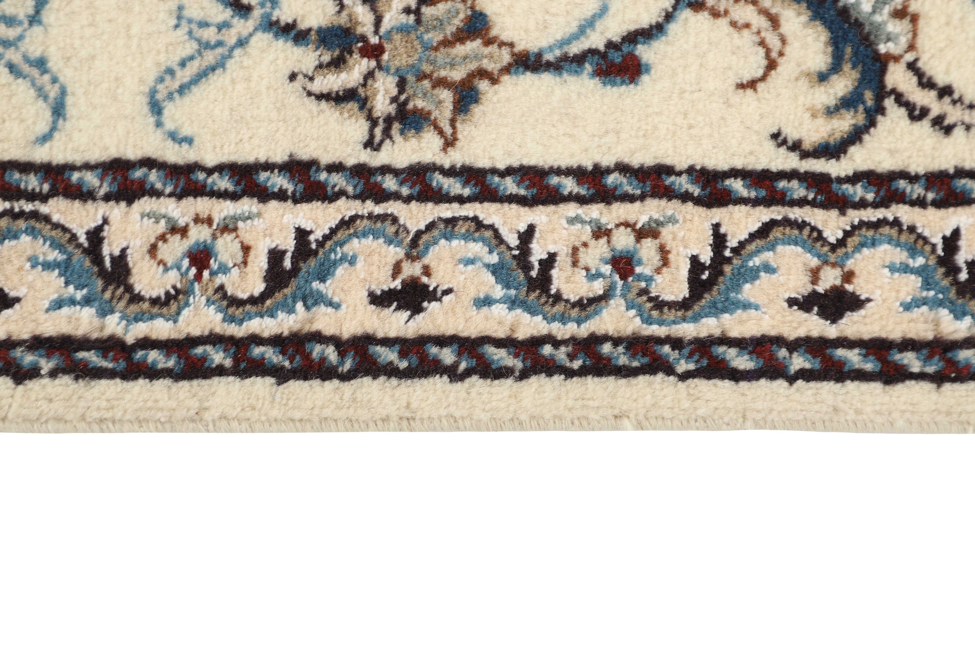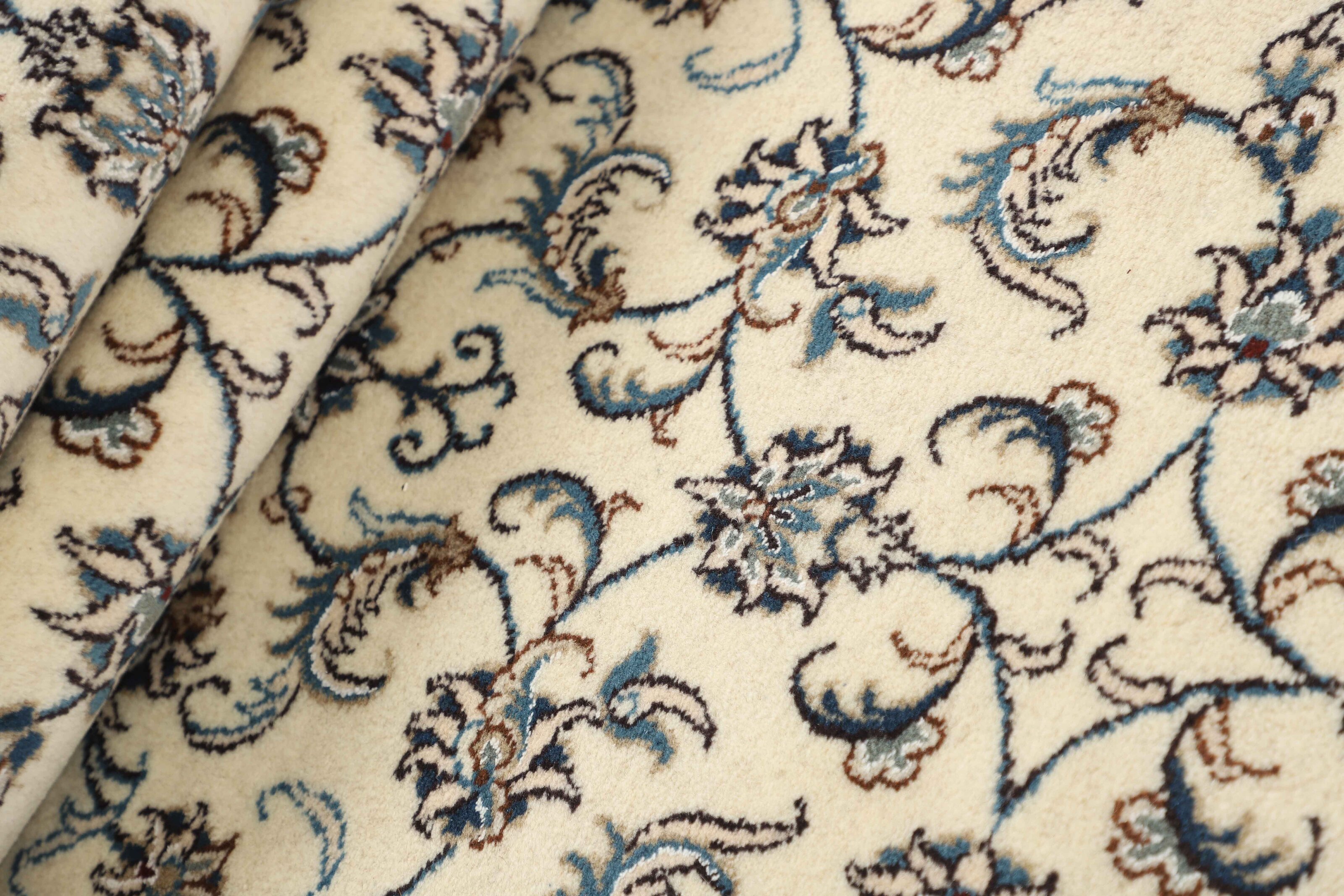 Nain KashmarItem no.: 1519746 Size: 71 cm x 391 cmNain is a city of about 50.000 people, located in the Isfahan Province. It has historic significance, since it was the last stop on caravan routes before Kavir-a-Lut, one of the deserts that stretch through the centre of Iran. The Nain Mosque is one of Iran’s oldest, and is built far better than the later and more famous mosques of Isfahan. The industry in Nain was traditionally focused on the production of wool garments, but the weavers switched to rug production when the demand fell. Their new products soon became famous, as the weavers were skilled and used good quality materials. The warp and weft are cotton, with a wool pile and contours of silk. Sometimes, silk is used more in the base. The colours are refined; nuances of ivory and cream, with small areas of red, green, and blue. As with the rugs from Isfahan, the patterns of the Nain rugs are also classical. The Nain rugs are made in all sizes, including the very large of up to 60m2, and some of these have a pure silk pile. The largest Nain rug produced was 20 by 20 metres.