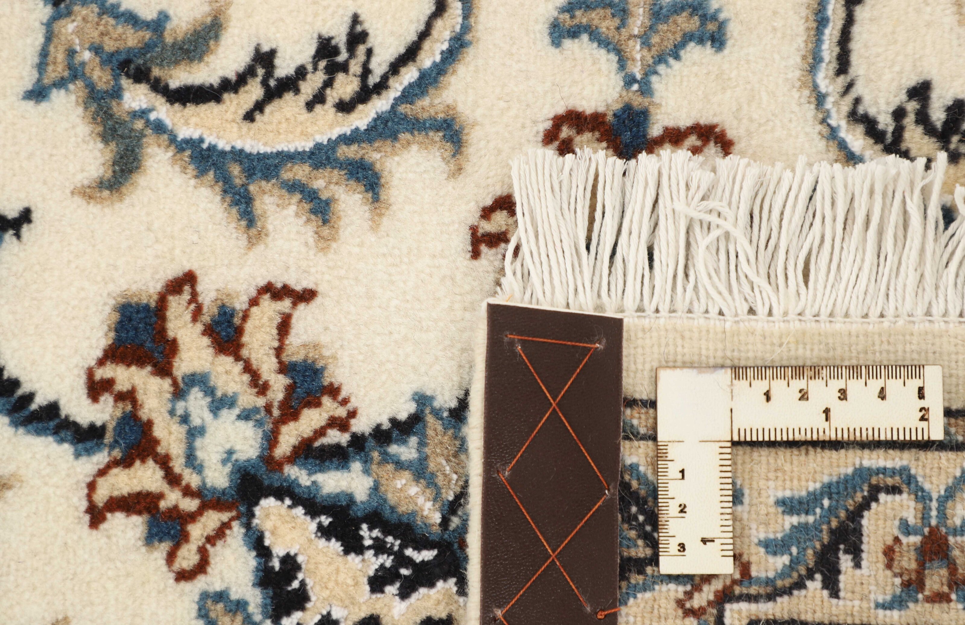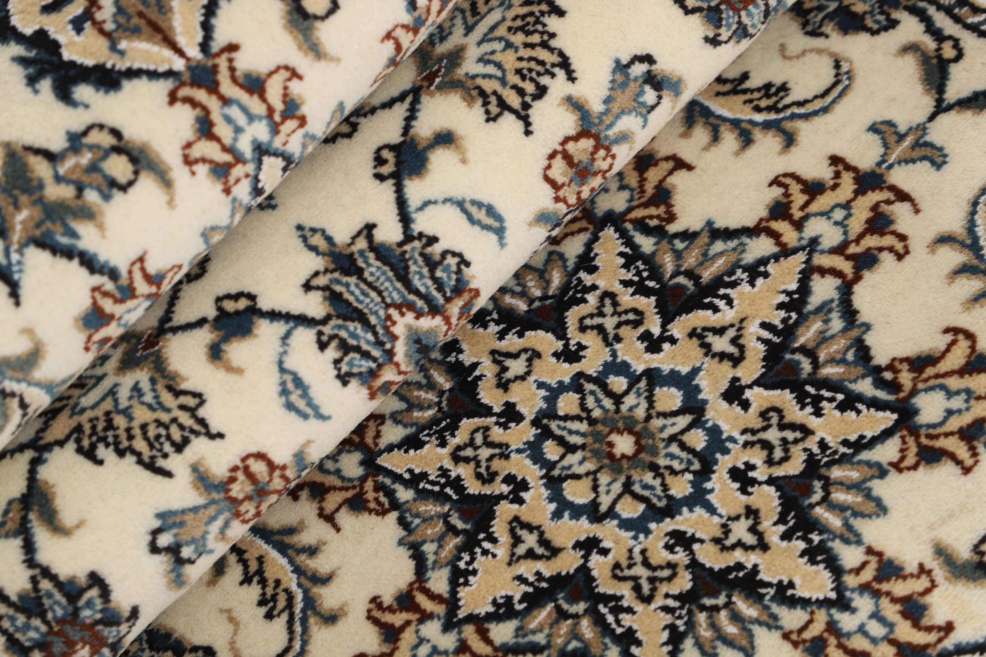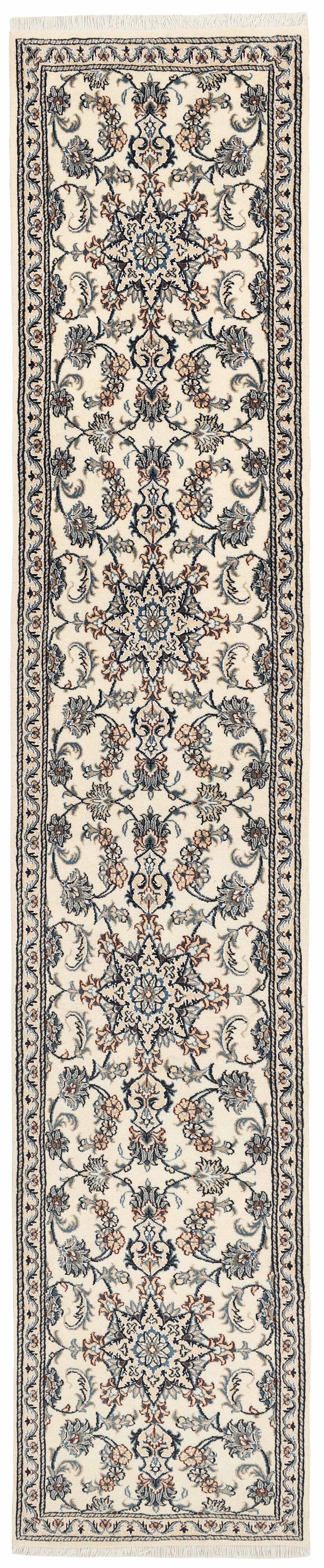 Nain KashmarItem no.: 1519750 Size: 75 cm x 382 cmNain is a city of about 50.000 people, located in the Isfahan Province. It has historic significance, since it was the last stop on caravan routes before Kavir-a-Lut, one of the deserts that stretch through the centre of Iran. The Nain Mosque is one of Iran’s oldest, and is built far better than the later and more famous mosques of Isfahan. The industry in Nain was traditionally focused on the production of wool garments, but the weavers switched to rug production when the demand fell. Their new products soon became famous, as the weavers were skilled and used good quality materials. The warp and weft are cotton, with a wool pile and contours of silk. Sometimes, silk is used more in the base. The colours are refined; nuances of ivory and cream, with small areas of red, green, and blue. As with the rugs from Isfahan, the patterns of the Nain rugs are also classical. The Nain rugs are made in all sizes, including the very large of up to 60m2, and some of these have a pure silk pile. The largest Nain rug produced was 20 by 20 metres.