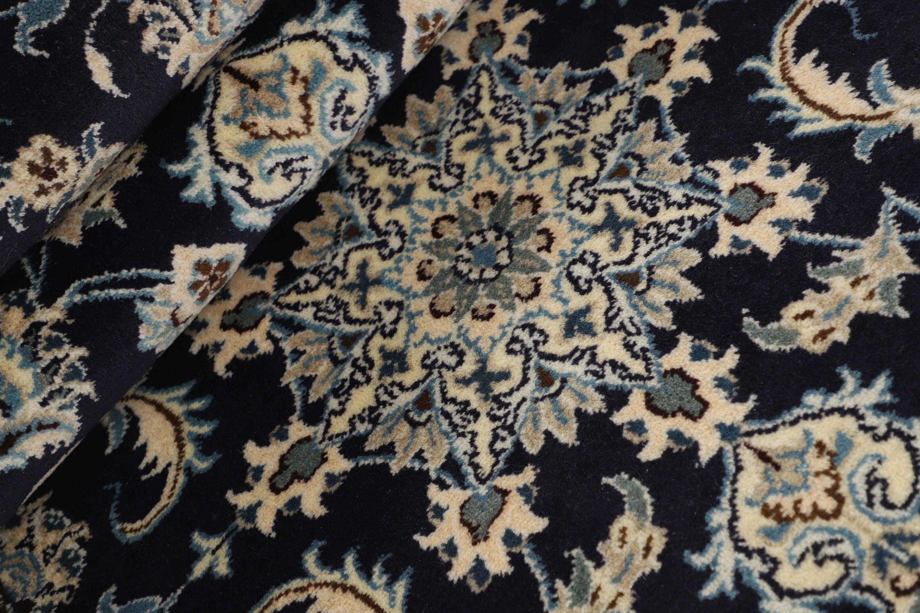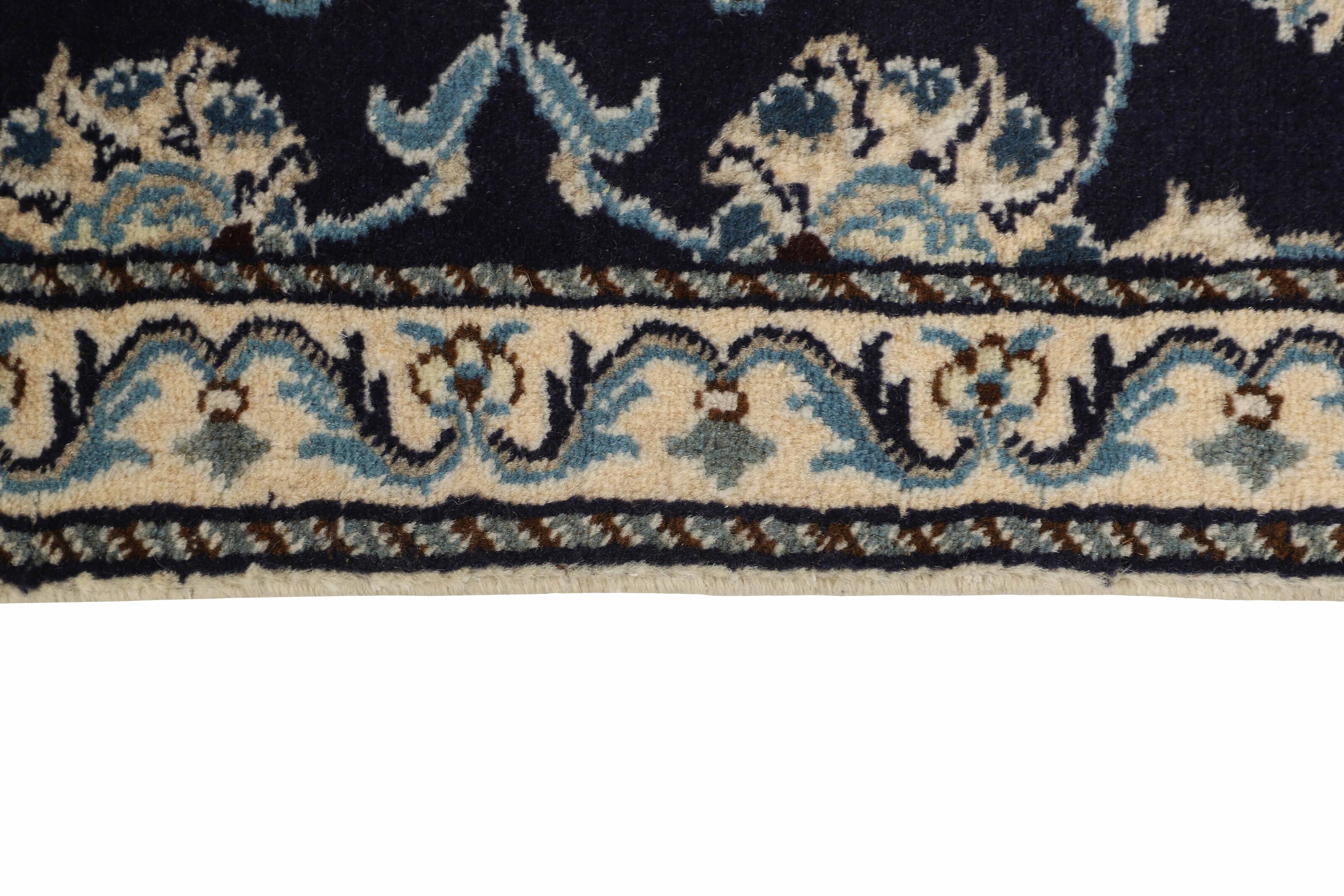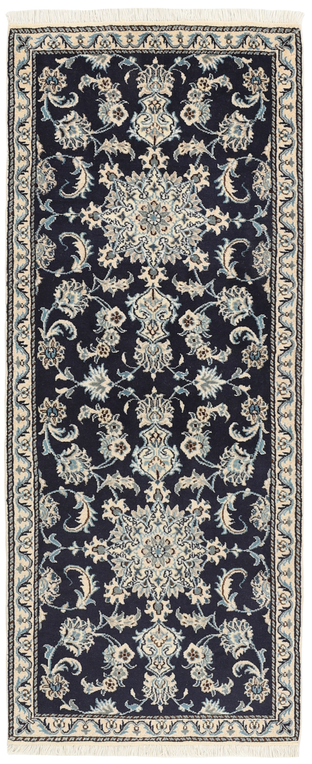 Nain KashmarItem no.: 1519751 Size: 80 cm x 192 cmNain is a city of about 50.000 people, located in the Isfahan Province. It has historic significance, since it was the last stop on caravan routes before Kavir-a-Lut, one of the deserts that stretch through the centre of Iran. The Nain Mosque is one of Iran’s oldest, and is built far better than the later and more famous mosques of Isfahan. The industry in Nain was traditionally focused on the production of wool garments, but the weavers switched to rug production when the demand fell. Their new products soon became famous, as the weavers were skilled and used good quality materials. The warp and weft are cotton, with a wool pile and contours of silk. Sometimes, silk is used more in the base. The colours are refined; nuances of ivory and cream, with small areas of red, green, and blue. As with the rugs from Isfahan, the patterns of the Nain rugs are also classical. The Nain rugs are made in all sizes, including the very large of up to 60m2, and some of these have a pure silk pile. The largest Nain rug produced was 20 by 20 metres.