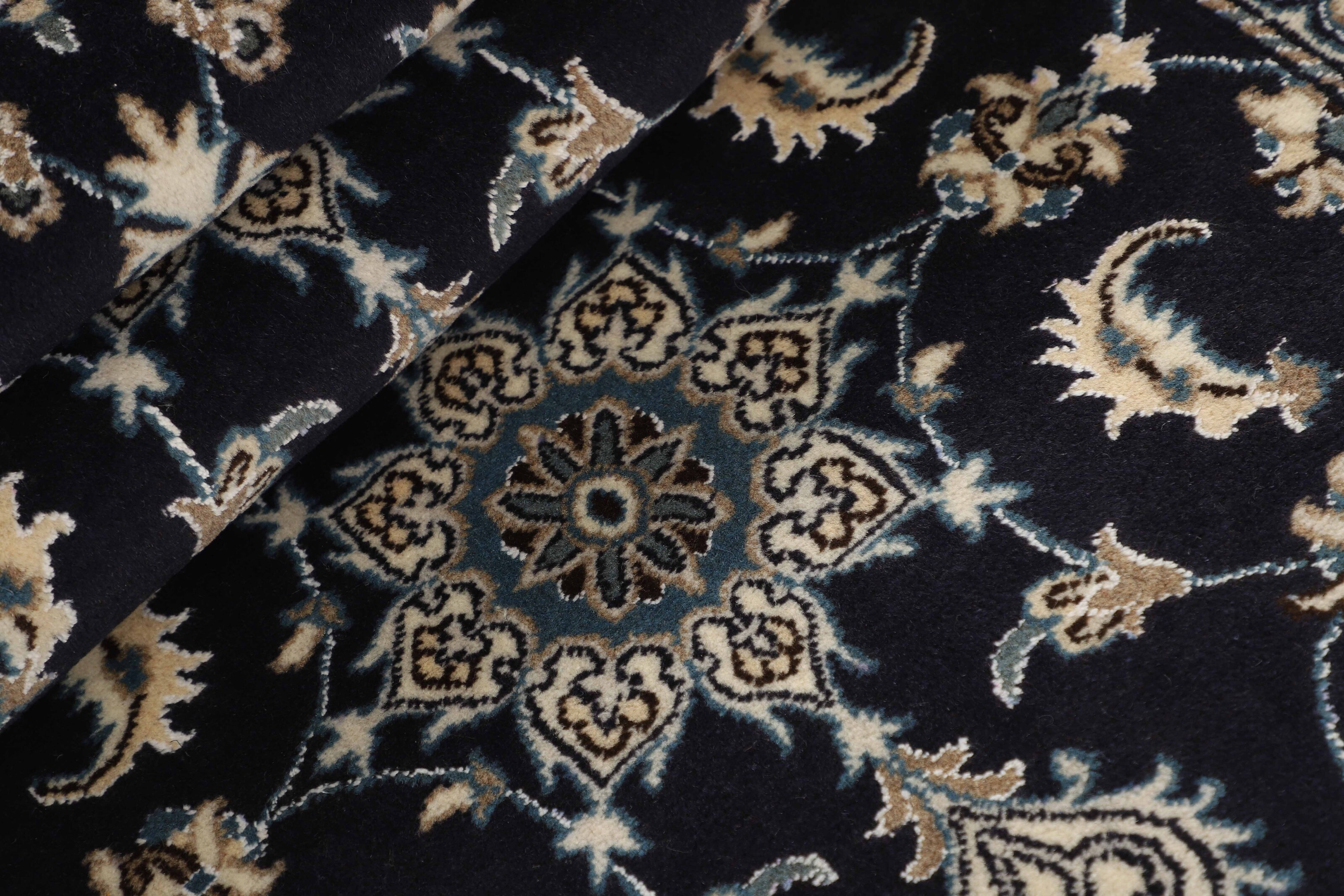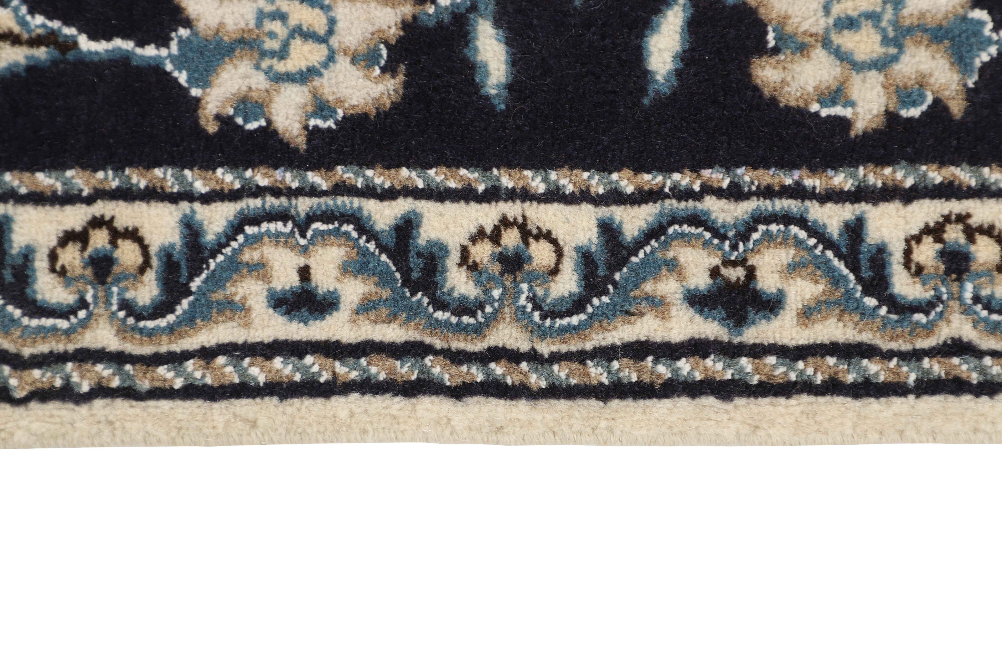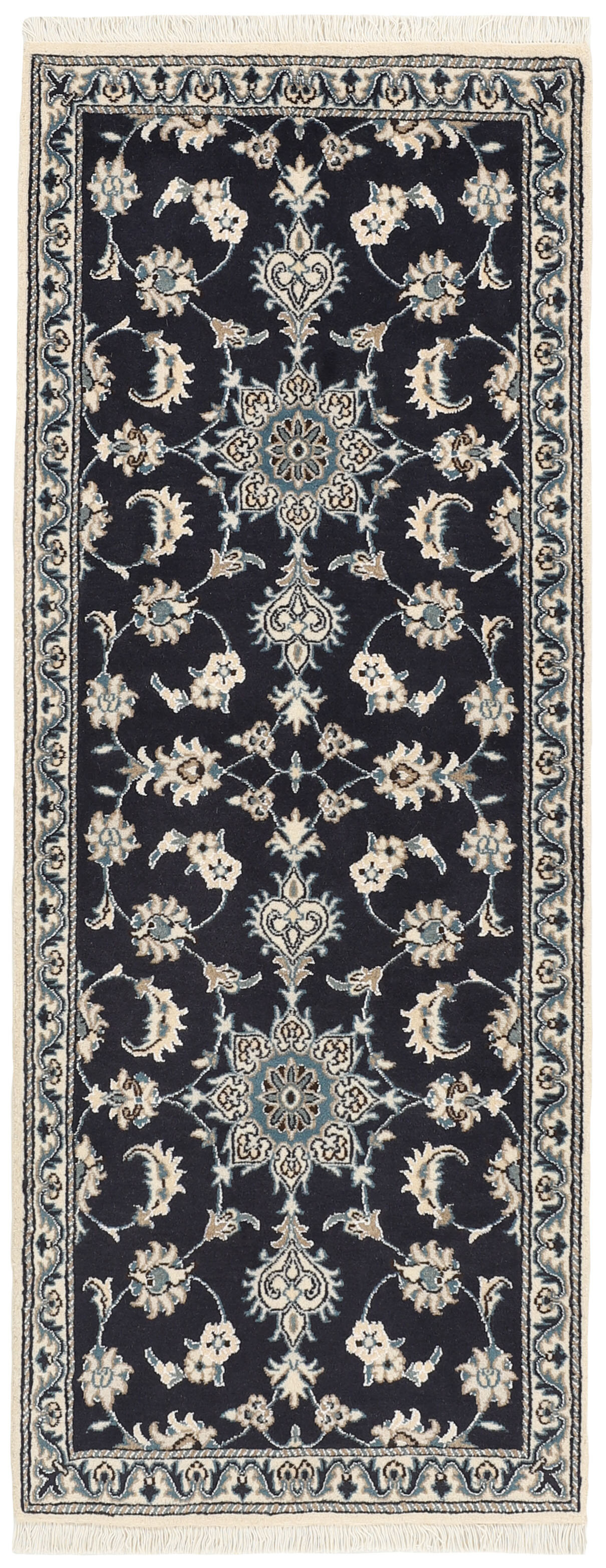 Nain KashmarItem no.: 1519752 Size: 75 cm x 196 cmNain is a city of about 50.000 people, located in the Isfahan Province. It has historic significance, since it was the last stop on caravan routes before Kavir-a-Lut, one of the deserts that stretch through the centre of Iran. The Nain Mosque is one of Iran’s oldest, and is built far better than the later and more famous mosques of Isfahan. The industry in Nain was traditionally focused on the production of wool garments, but the weavers switched to rug production when the demand fell. Their new products soon became famous, as the weavers were skilled and used good quality materials. The warp and weft are cotton, with a wool pile and contours of silk. Sometimes, silk is used more in the base. The colours are refined; nuances of ivory and cream, with small areas of red, green, and blue. As with the rugs from Isfahan, the patterns of the Nain rugs are also classical. The Nain rugs are made in all sizes, including the very large of up to 60m2, and some of these have a pure silk pile. The largest Nain rug produced was 20 by 20 metres.