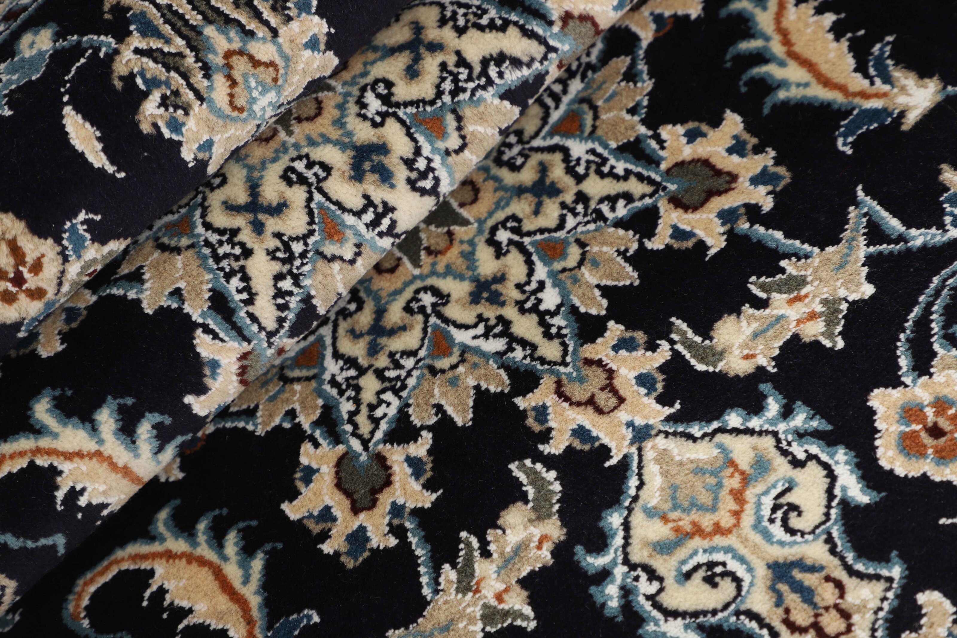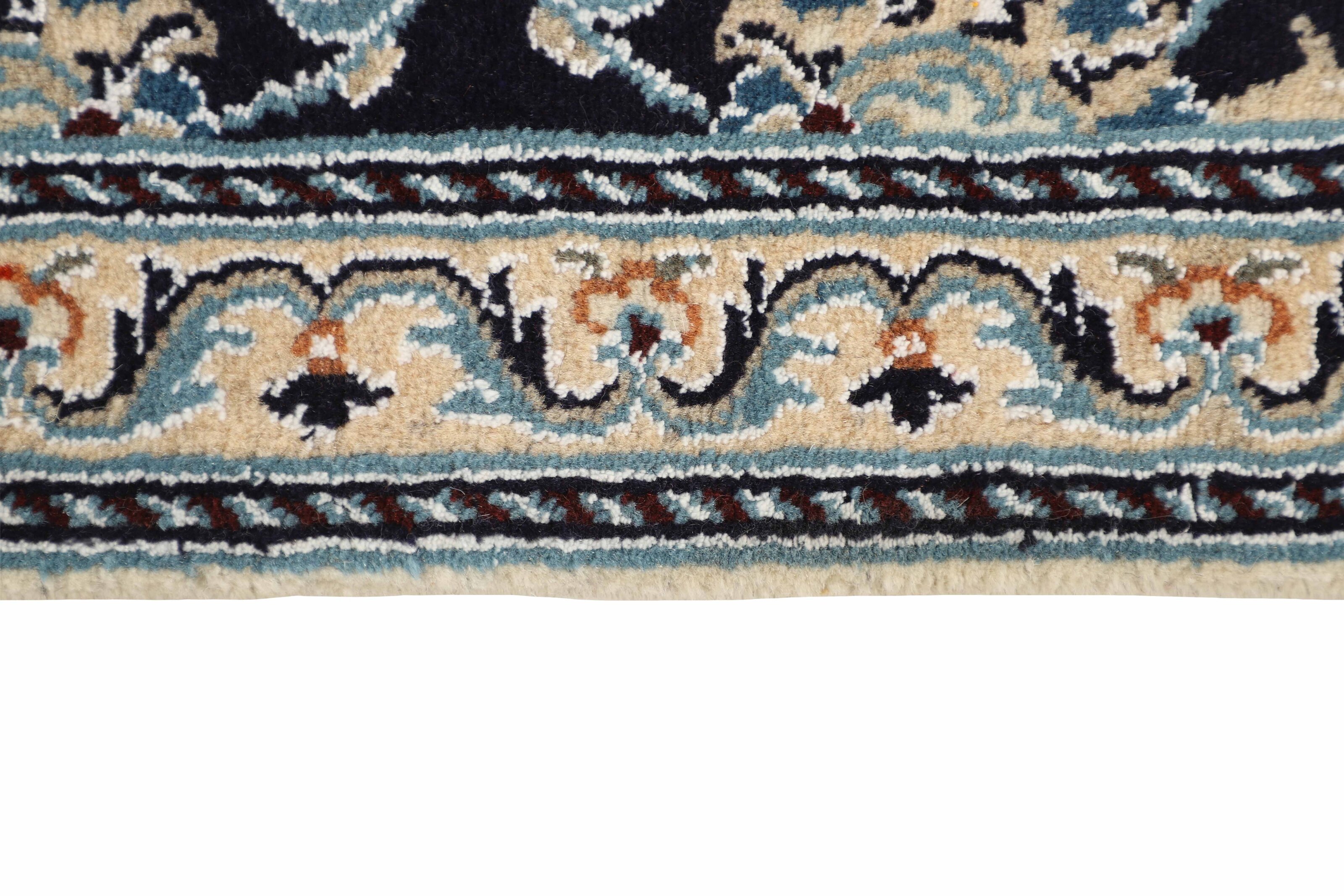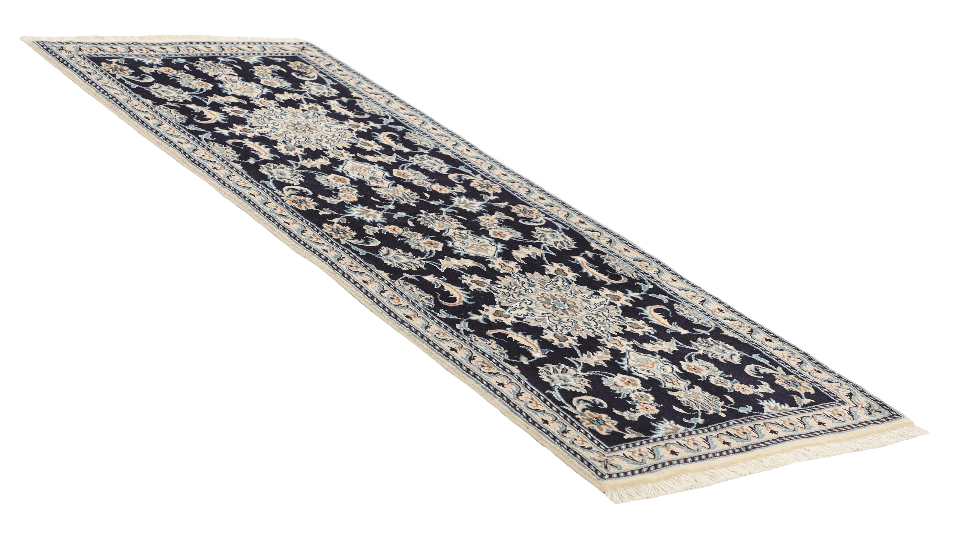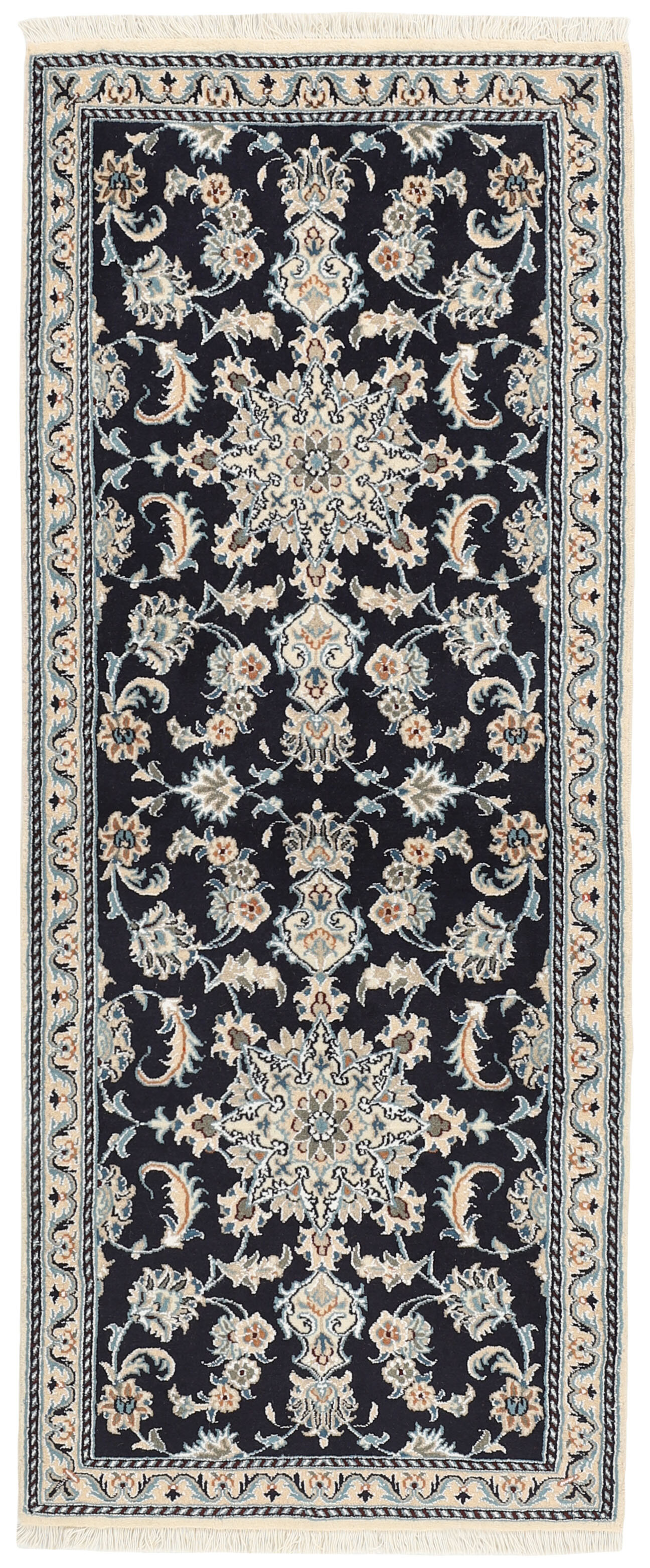 Nain KashmarItem no.: 1519754 Size: 80 cm x 198 cmNain is a city of about 50.000 people, located in the Isfahan Province. It has historic significance, since it was the last stop on caravan routes before Kavir-a-Lut, one of the deserts that stretch through the centre of Iran. The Nain Mosque is one of Iran’s oldest, and is built far better than the later and more famous mosques of Isfahan. The industry in Nain was traditionally focused on the production of wool garments, but the weavers switched to rug production when the demand fell. Their new products soon became famous, as the weavers were skilled and used good quality materials. The warp and weft are cotton, with a wool pile and contours of silk. Sometimes, silk is used more in the base. The colours are refined; nuances of ivory and cream, with small areas of red, green, and blue. As with the rugs from Isfahan, the patterns of the Nain rugs are also classical. The Nain rugs are made in all sizes, including the very large of up to 60m2, and some of these have a pure silk pile. The largest Nain rug produced was 20 by 20 metres.