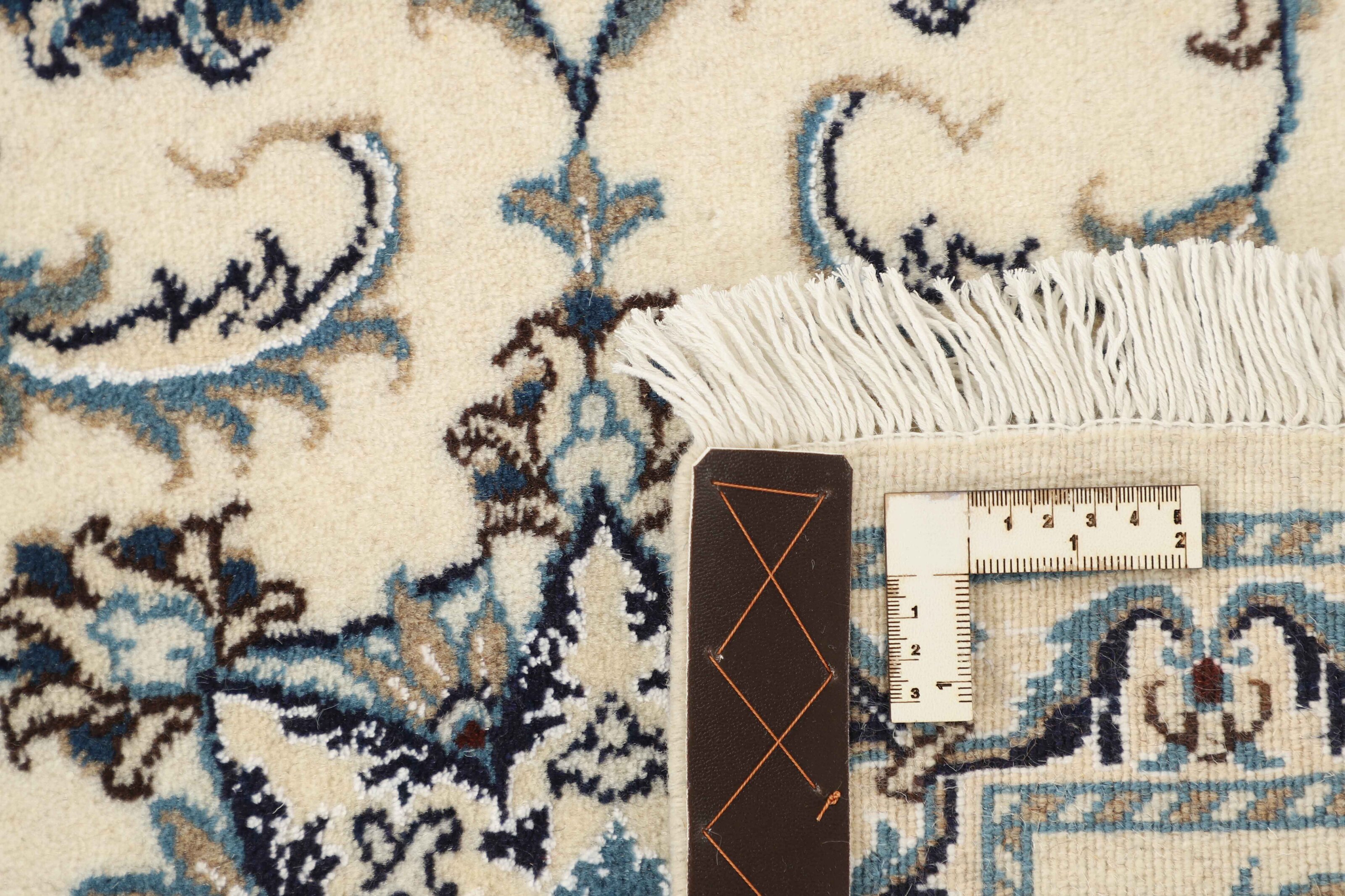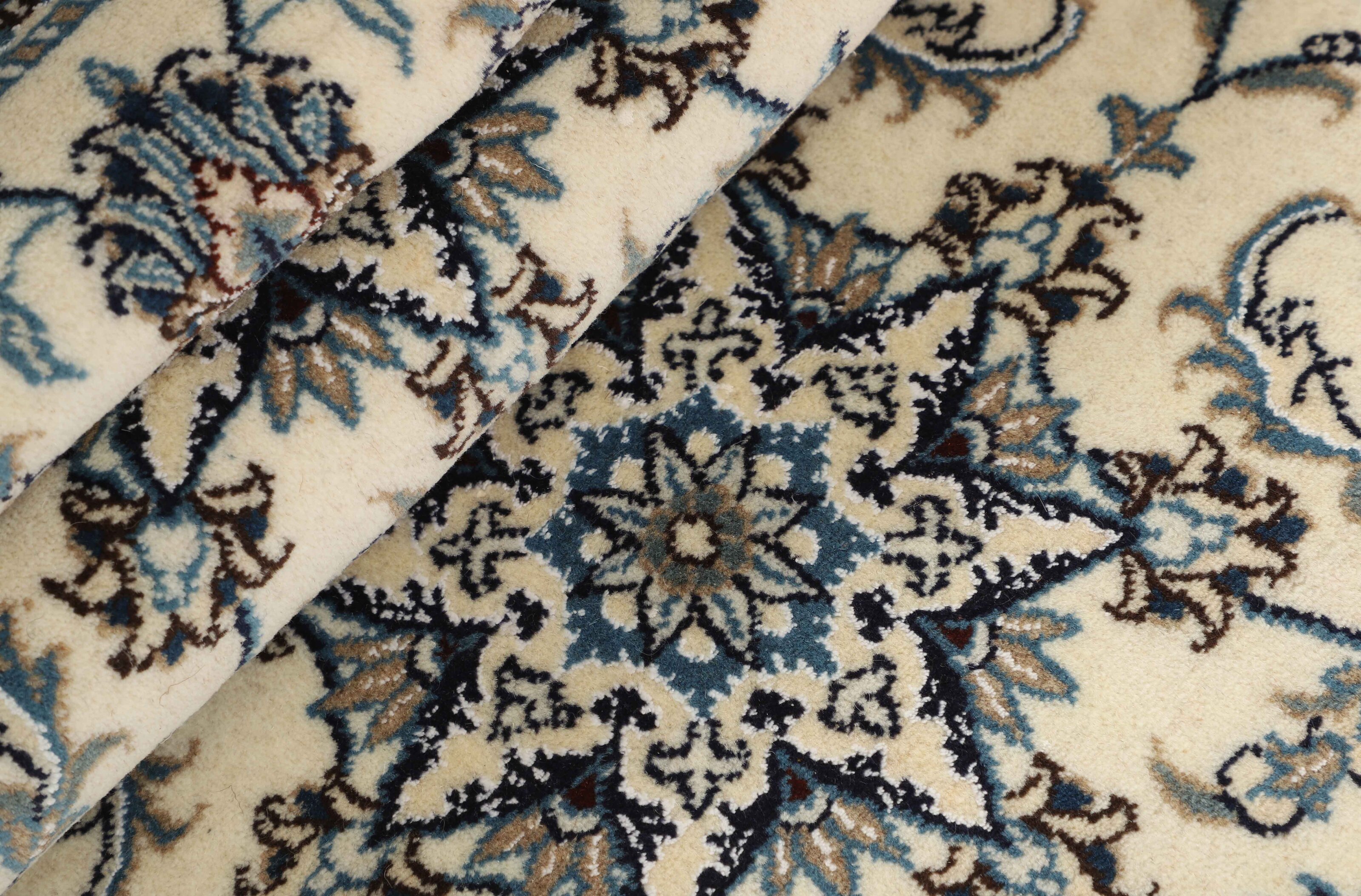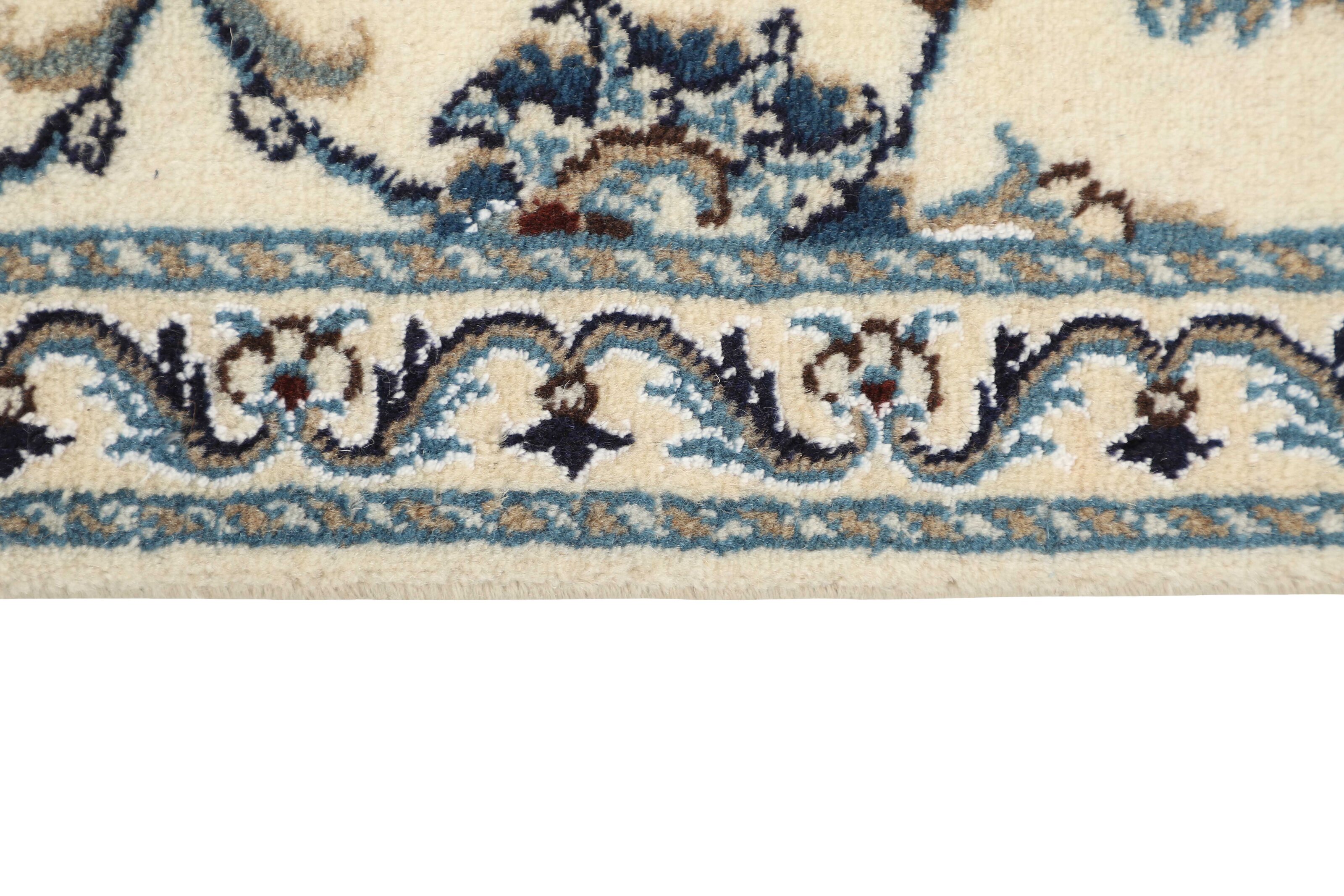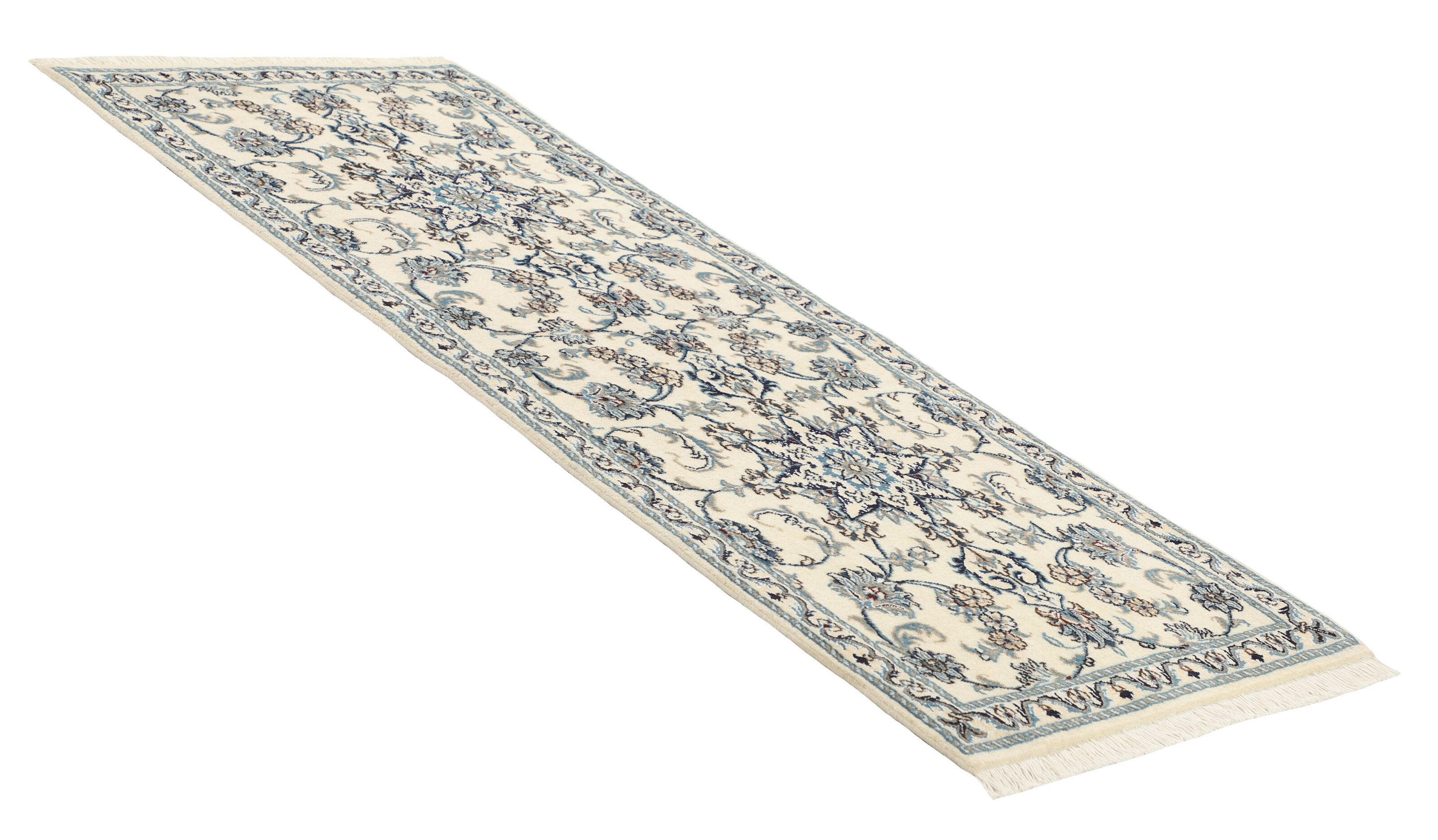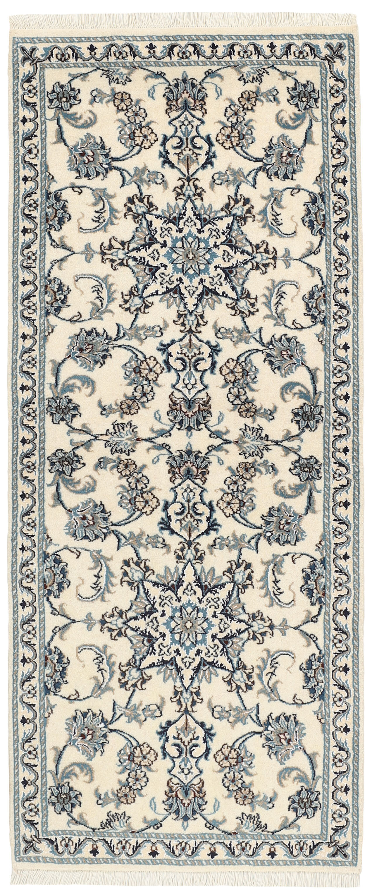 Nain KashmarItem no.: 1519761 Size: 80 cm x 193 cmNain is a city of about 50.000 people, located in the Isfahan Province. It has historic significance, since it was the last stop on caravan routes before Kavir-a-Lut, one of the deserts that stretch through the centre of Iran. The Nain Mosque is one of Iran’s oldest, and is built far better than the later and more famous mosques of Isfahan. The industry in Nain was traditionally focused on the production of wool garments, but the weavers switched to rug production when the demand fell. Their new products soon became famous, as the weavers were skilled and used good quality materials. The warp and weft are cotton, with a wool pile and contours of silk. Sometimes, silk is used more in the base. The colours are refined; nuances of ivory and cream, with small areas of red, green, and blue. As with the rugs from Isfahan, the patterns of the Nain rugs are also classical. The Nain rugs are made in all sizes, including the very large of up to 60m2, and some of these have a pure silk pile. The largest Nain rug produced was 20 by 20 metres.