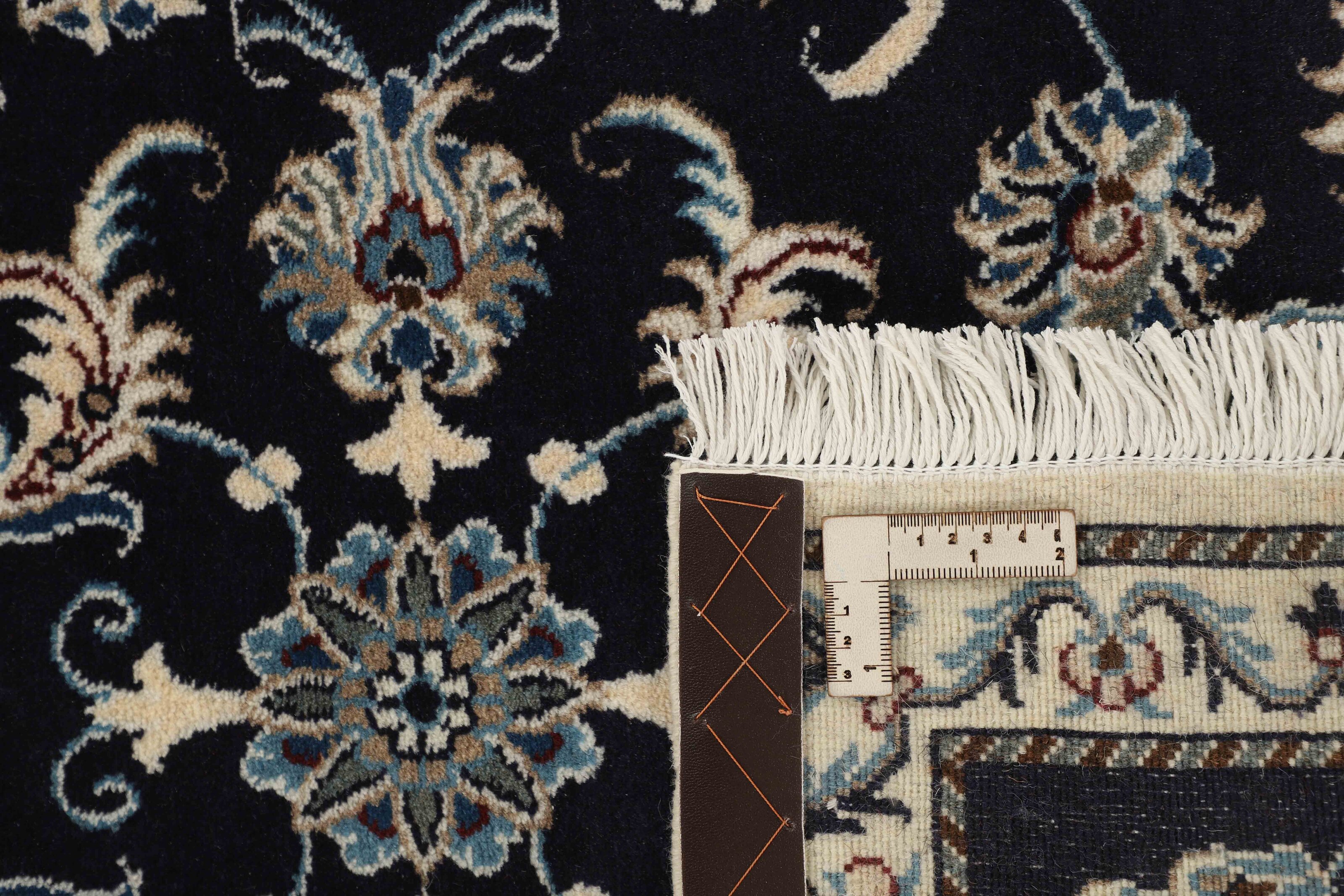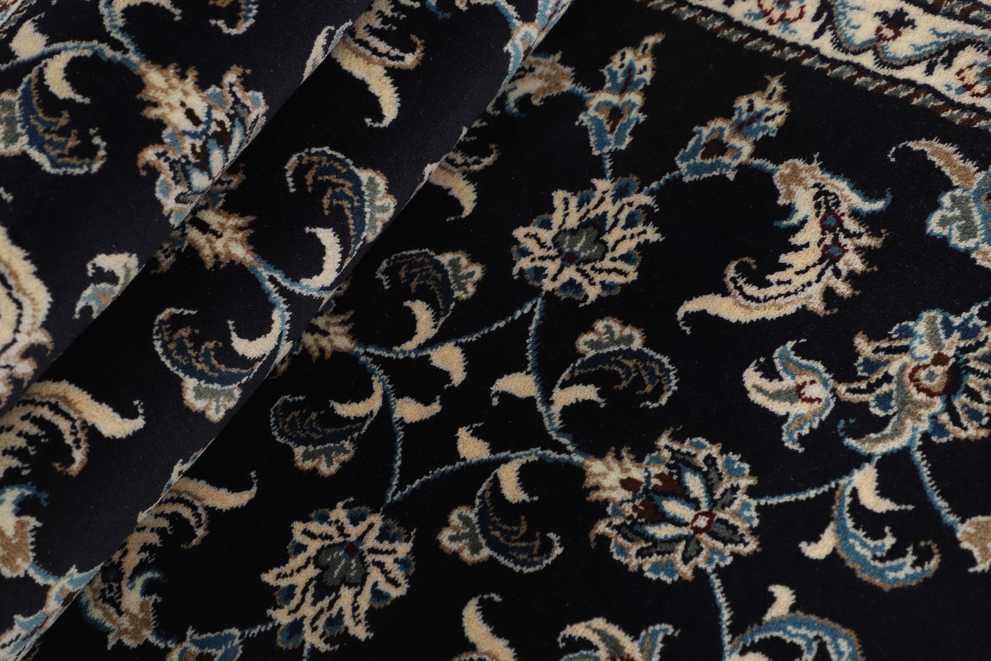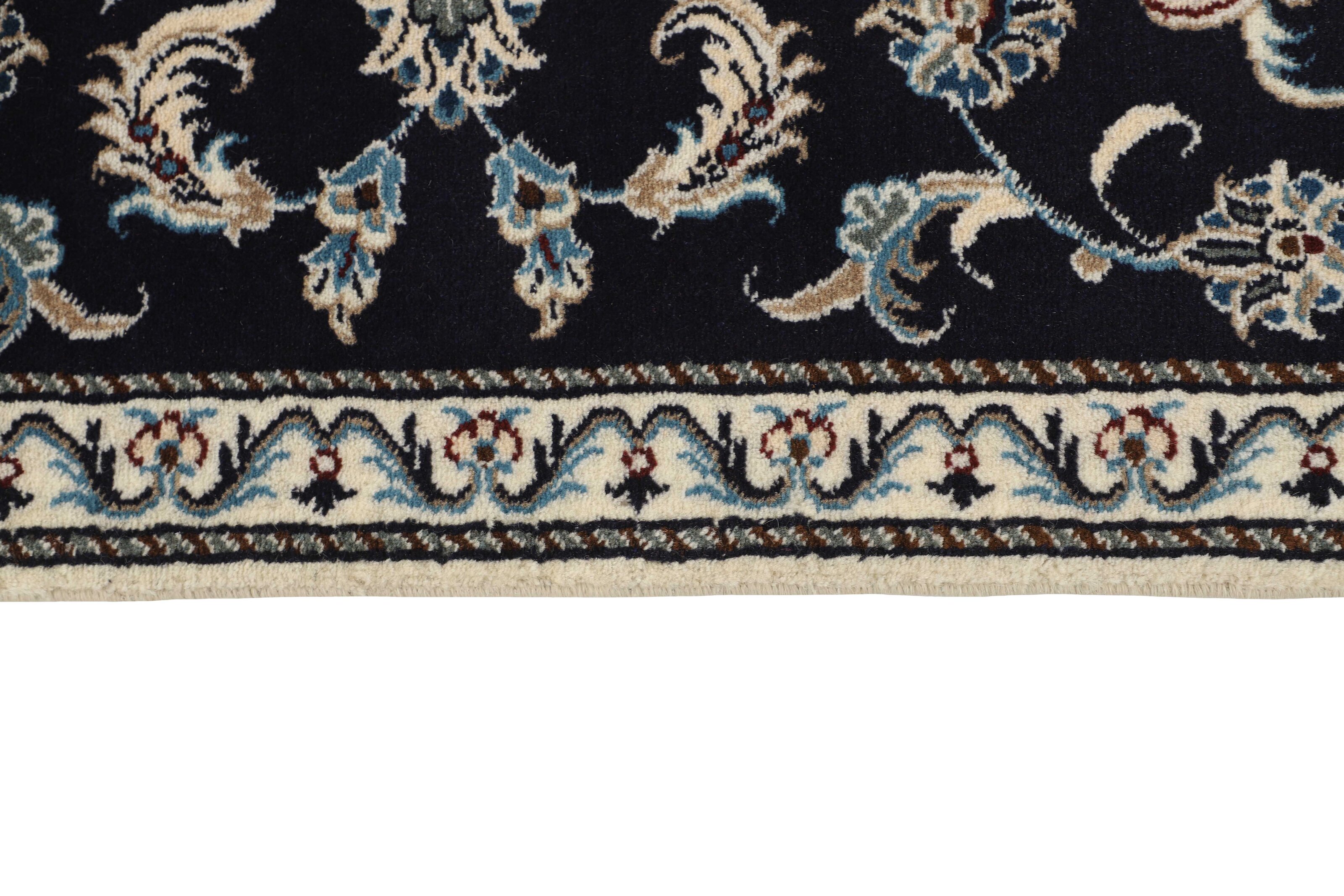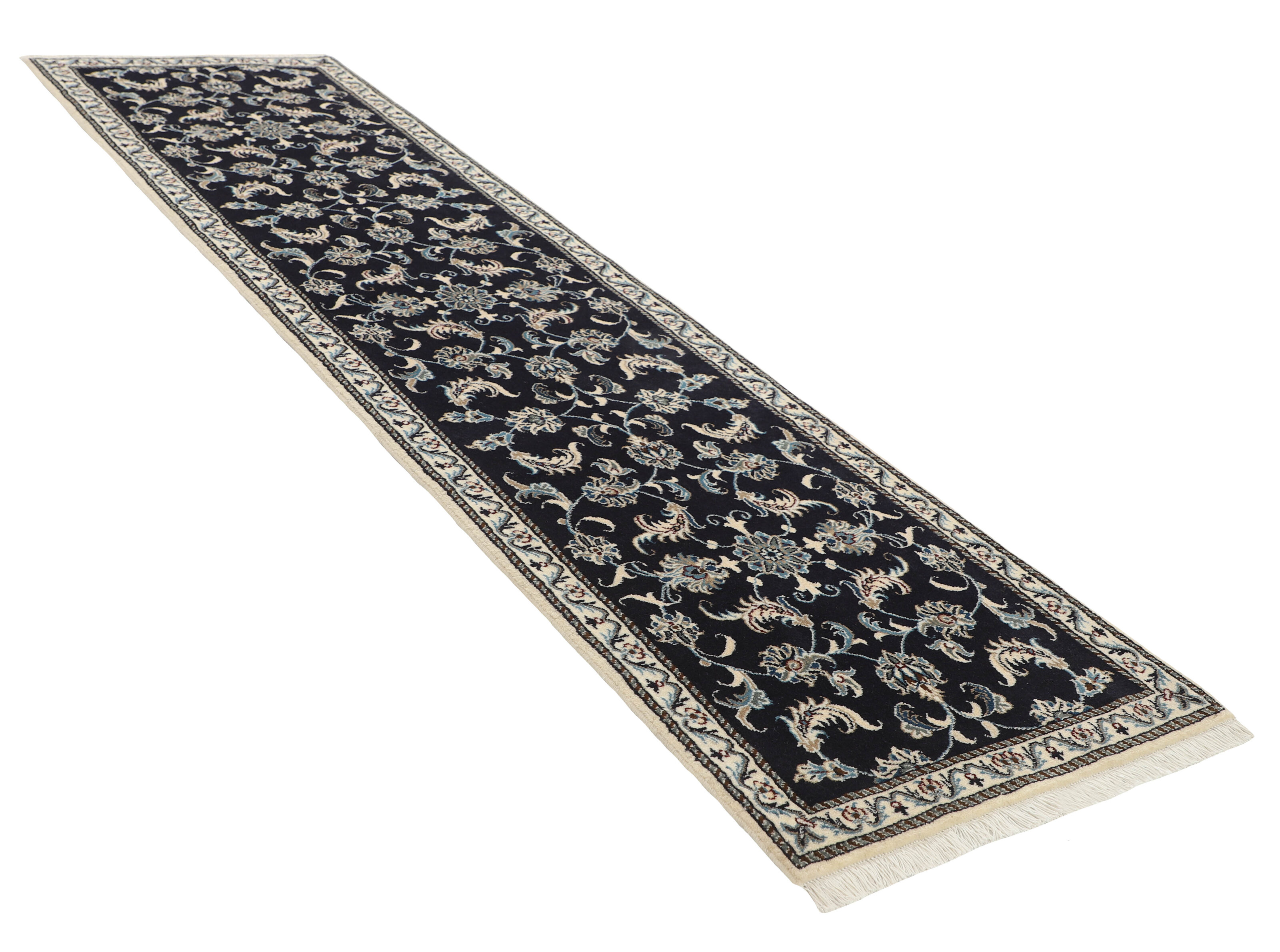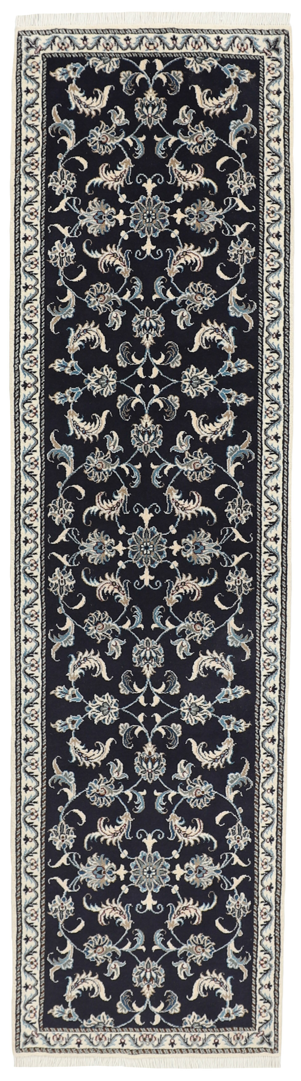 Nain KashmarItem no.: 1519766 Size: 77 cm x 290 cmNain is a city of about 50.000 people, located in the Isfahan Province. It has historic significance, since it was the last stop on caravan routes before Kavir-a-Lut, one of the deserts that stretch through the centre of Iran. The Nain Mosque is one of Iran’s oldest, and is built far better than the later and more famous mosques of Isfahan. The industry in Nain was traditionally focused on the production of wool garments, but the weavers switched to rug production when the demand fell. Their new products soon became famous, as the weavers were skilled and used good quality materials. The warp and weft are cotton, with a wool pile and contours of silk. Sometimes, silk is used more in the base. The colours are refined; nuances of ivory and cream, with small areas of red, green, and blue. As with the rugs from Isfahan, the patterns of the Nain rugs are also classical. The Nain rugs are made in all sizes, including the very large of up to 60m2, and some of these have a pure silk pile. The largest Nain rug produced was 20 by 20 metres.