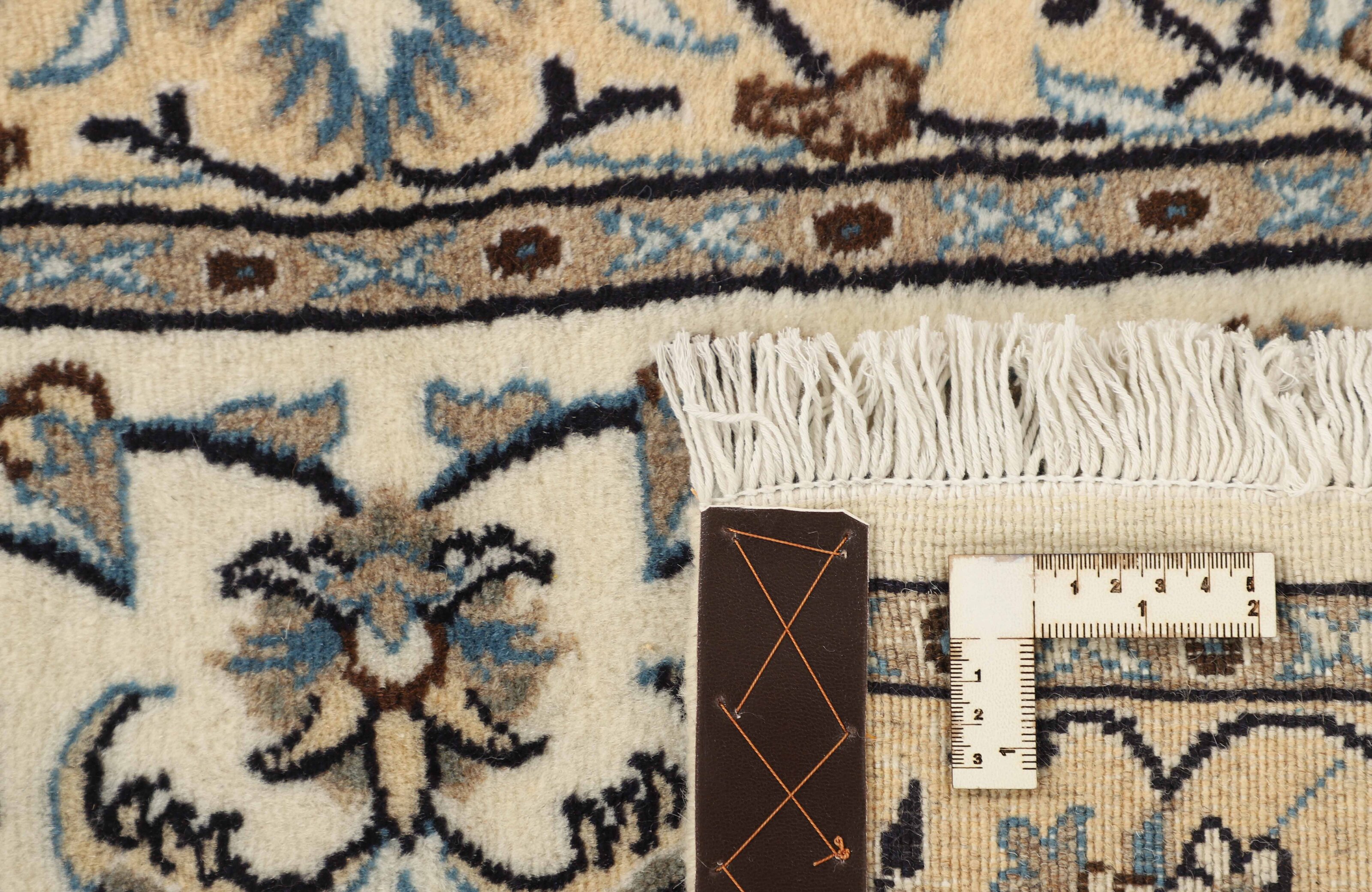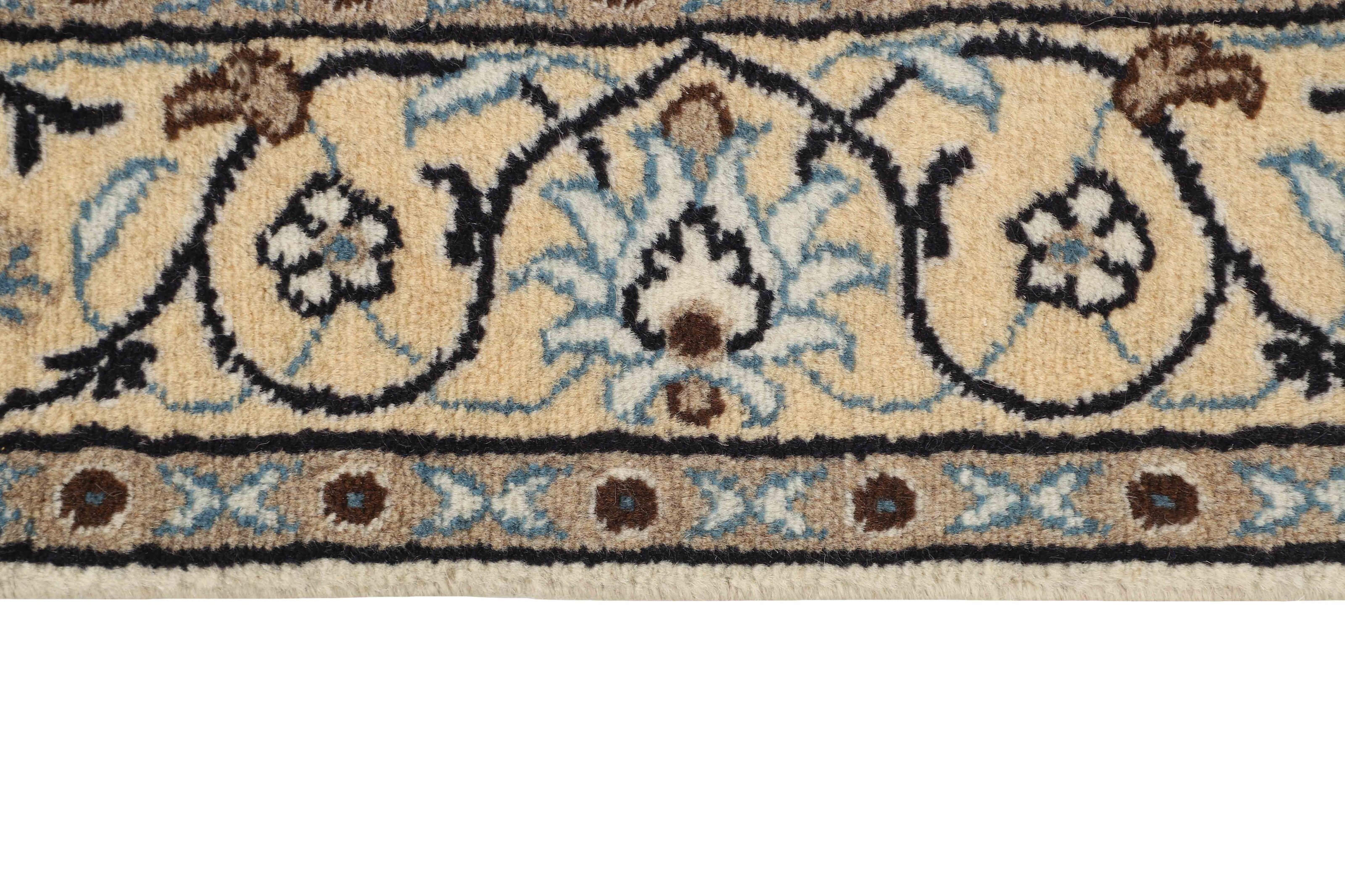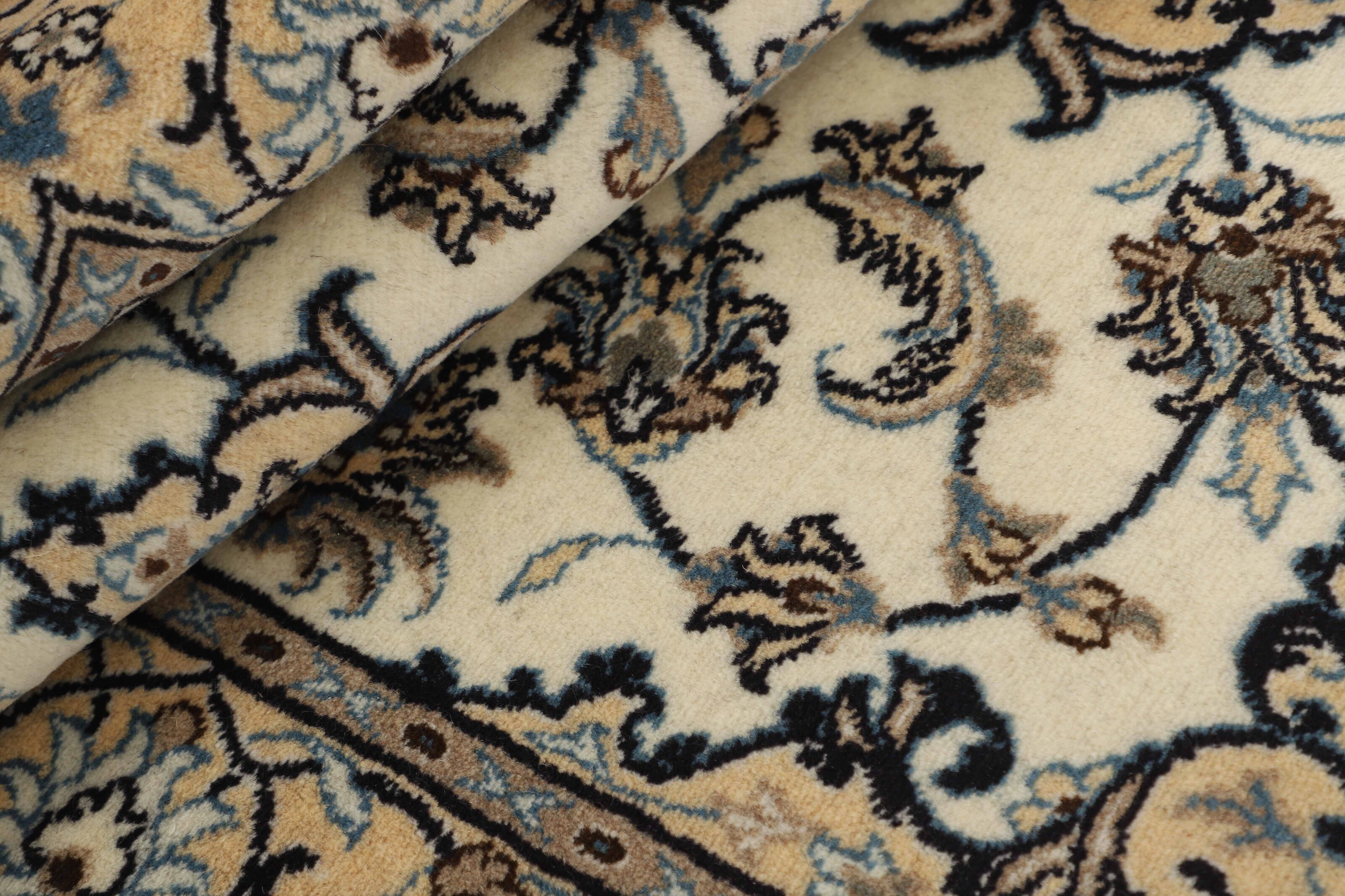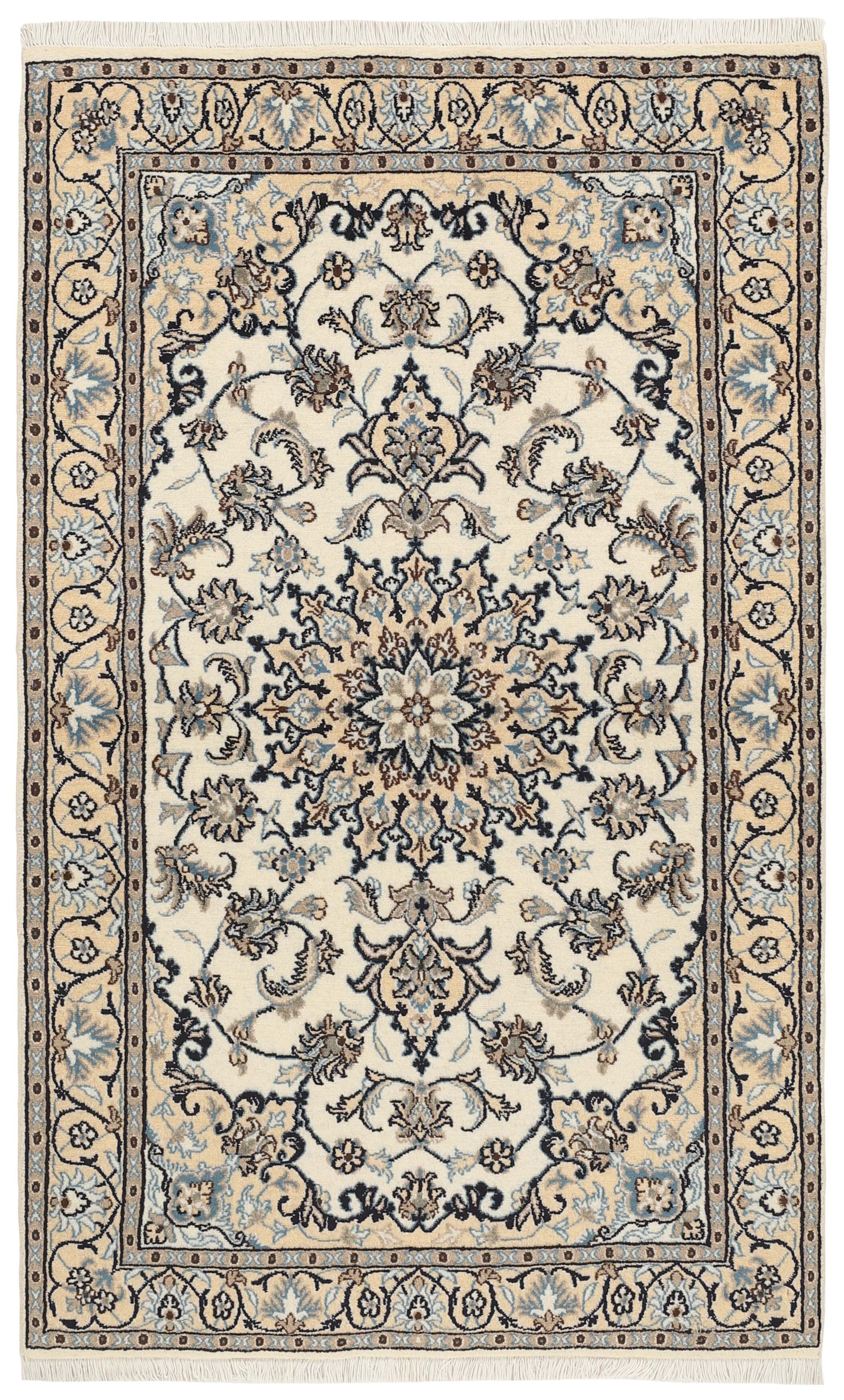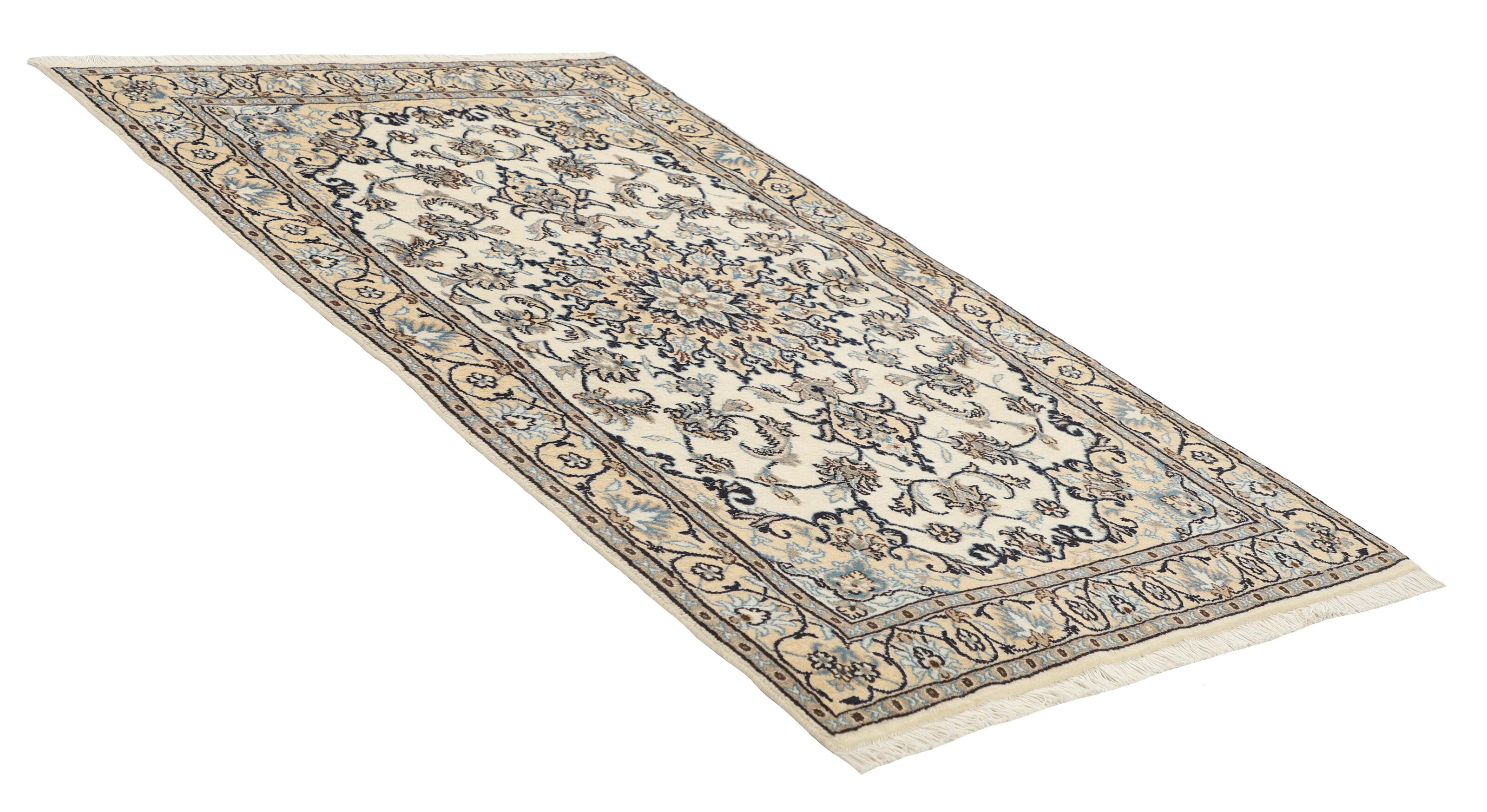 Nain KashmarItem no.: 1519774 Size: 116 cm x 193 cmNain is a city of about 50.000 people, located in the Isfahan Province. It has historic significance, since it was the last stop on caravan routes before Kavir-a-Lut, one of the deserts that stretch through the centre of Iran. The Nain Mosque is one of Iran’s oldest, and is built far better than the later and more famous mosques of Isfahan. The industry in Nain was traditionally focused on the production of wool garments, but the weavers switched to rug production when the demand fell. Their new products soon became famous, as the weavers were skilled and used good quality materials. The warp and weft are cotton, with a wool pile and contours of silk. Sometimes, silk is used more in the base. The colours are refined; nuances of ivory and cream, with small areas of red, green, and blue. As with the rugs from Isfahan, the patterns of the Nain rugs are also classical. The Nain rugs are made in all sizes, including the very large of up to 60m2, and some of these have a pure silk pile. The largest Nain rug produced was 20 by 20 metres.