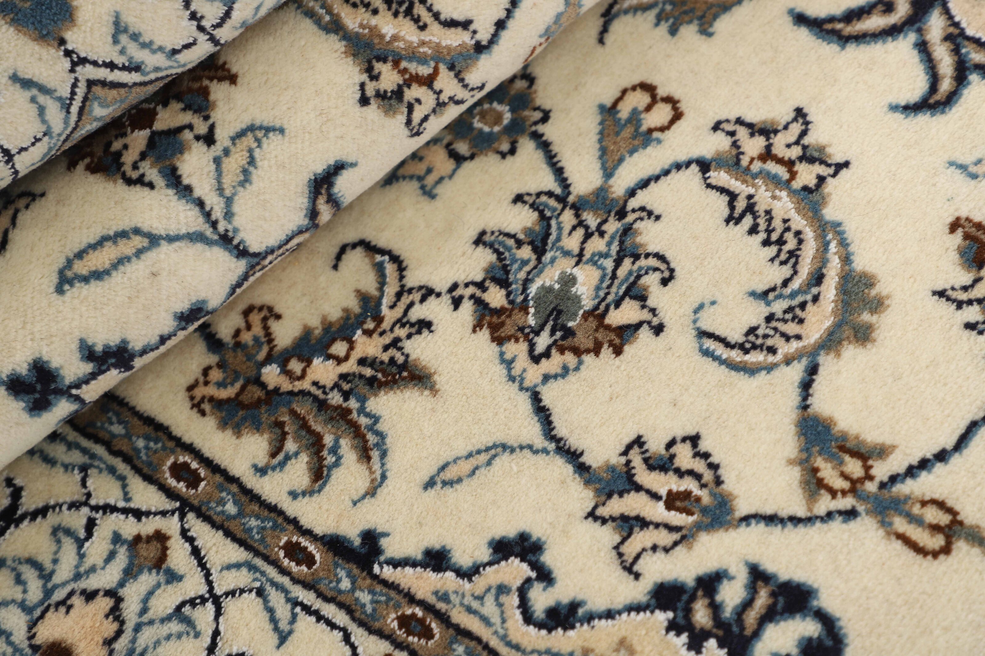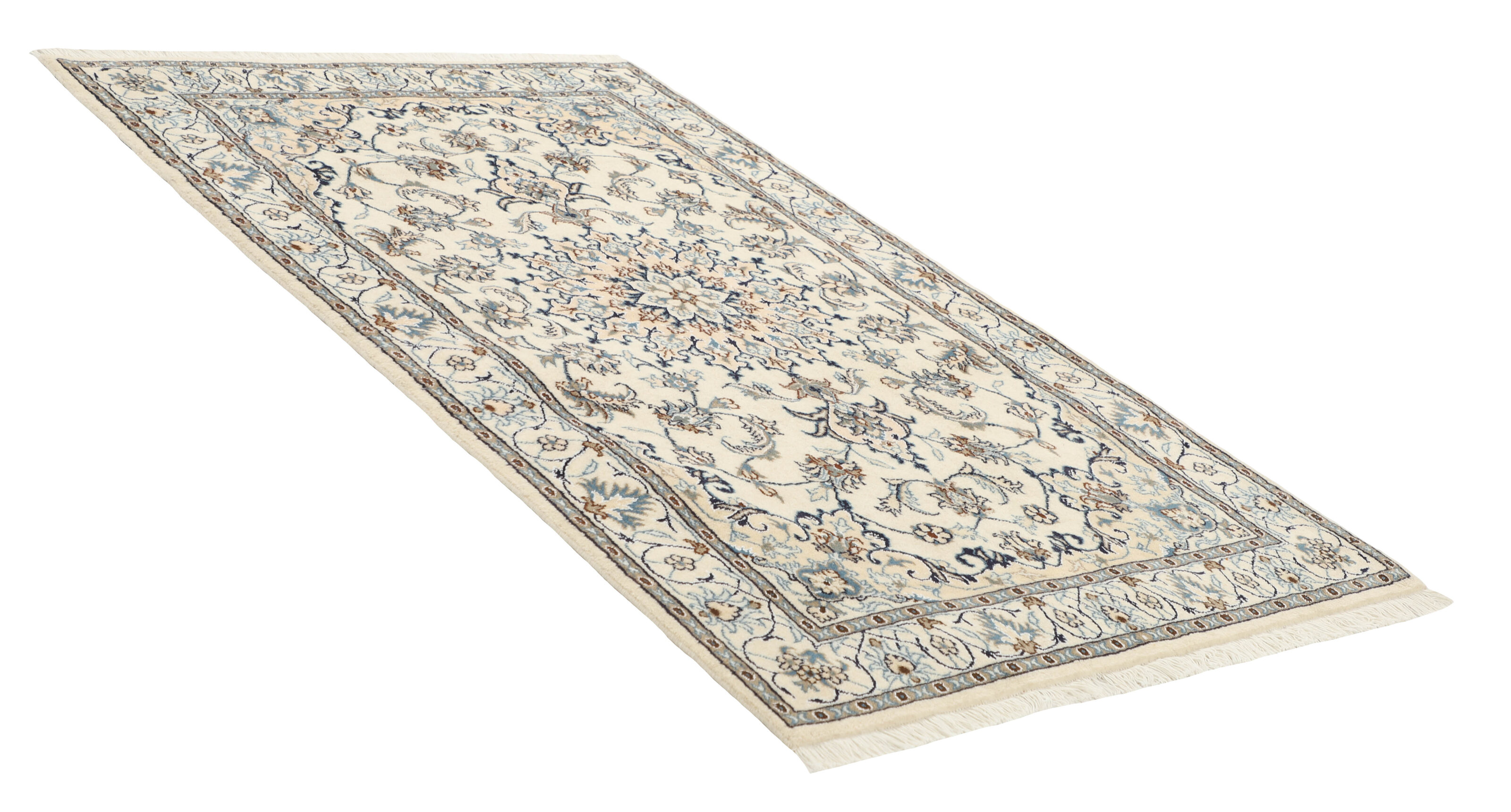 Nain KashmarItem no.: 1519777 Size: 116 cm x 195 cmNain is a city of about 50.000 people, located in the Isfahan Province. It has historic significance, since it was the last stop on caravan routes before Kavir-a-Lut, one of the deserts that stretch through the centre of Iran. The Nain Mosque is one of Iran’s oldest, and is built far better than the later and more famous mosques of Isfahan. The industry in Nain was traditionally focused on the production of wool garments, but the weavers switched to rug production when the demand fell. Their new products soon became famous, as the weavers were skilled and used good quality materials. The warp and weft are cotton, with a wool pile and contours of silk. Sometimes, silk is used more in the base. The colours are refined; nuances of ivory and cream, with small areas of red, green, and blue. As with the rugs from Isfahan, the patterns of the Nain rugs are also classical. The Nain rugs are made in all sizes, including the very large of up to 60m2, and some of these have a pure silk pile. The largest Nain rug produced was 20 by 20 metres.
